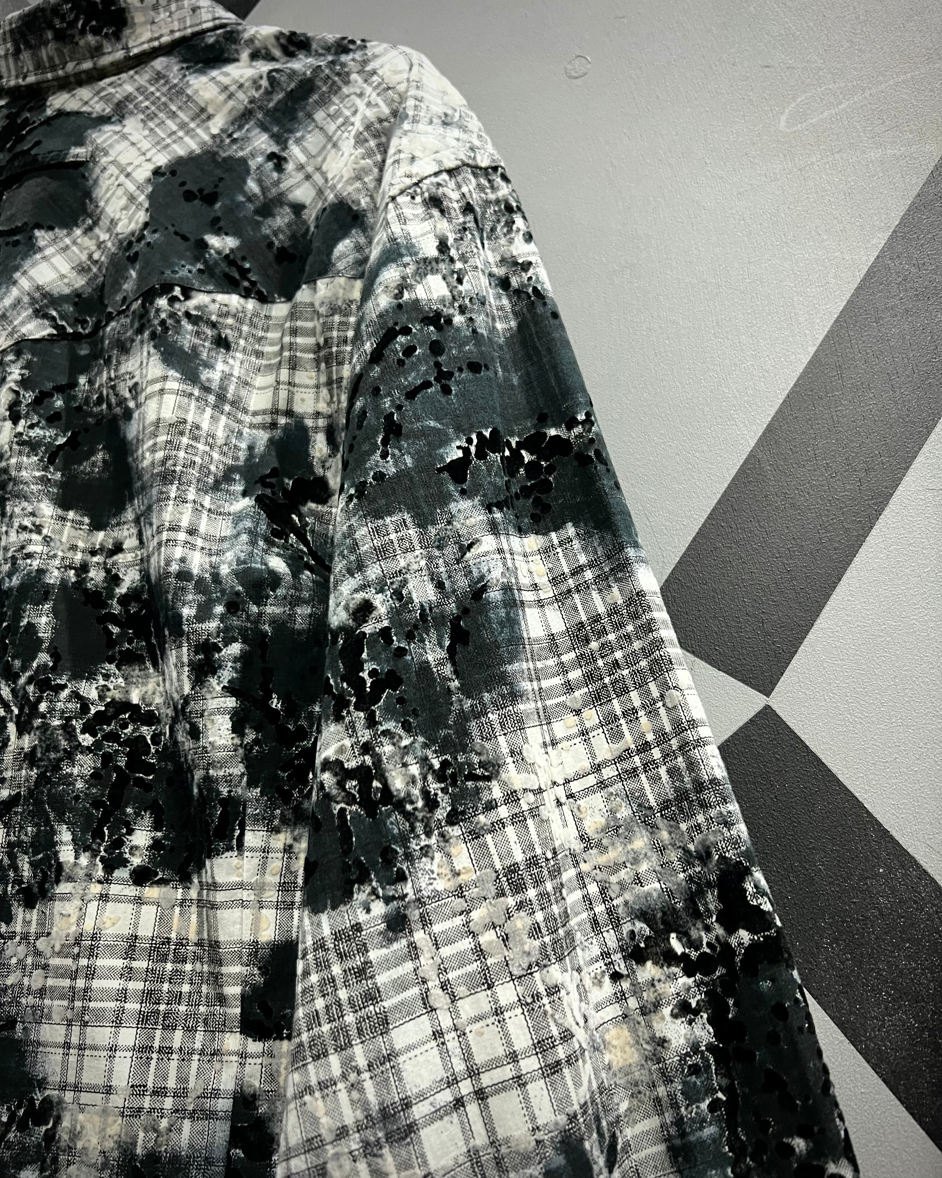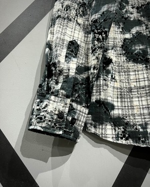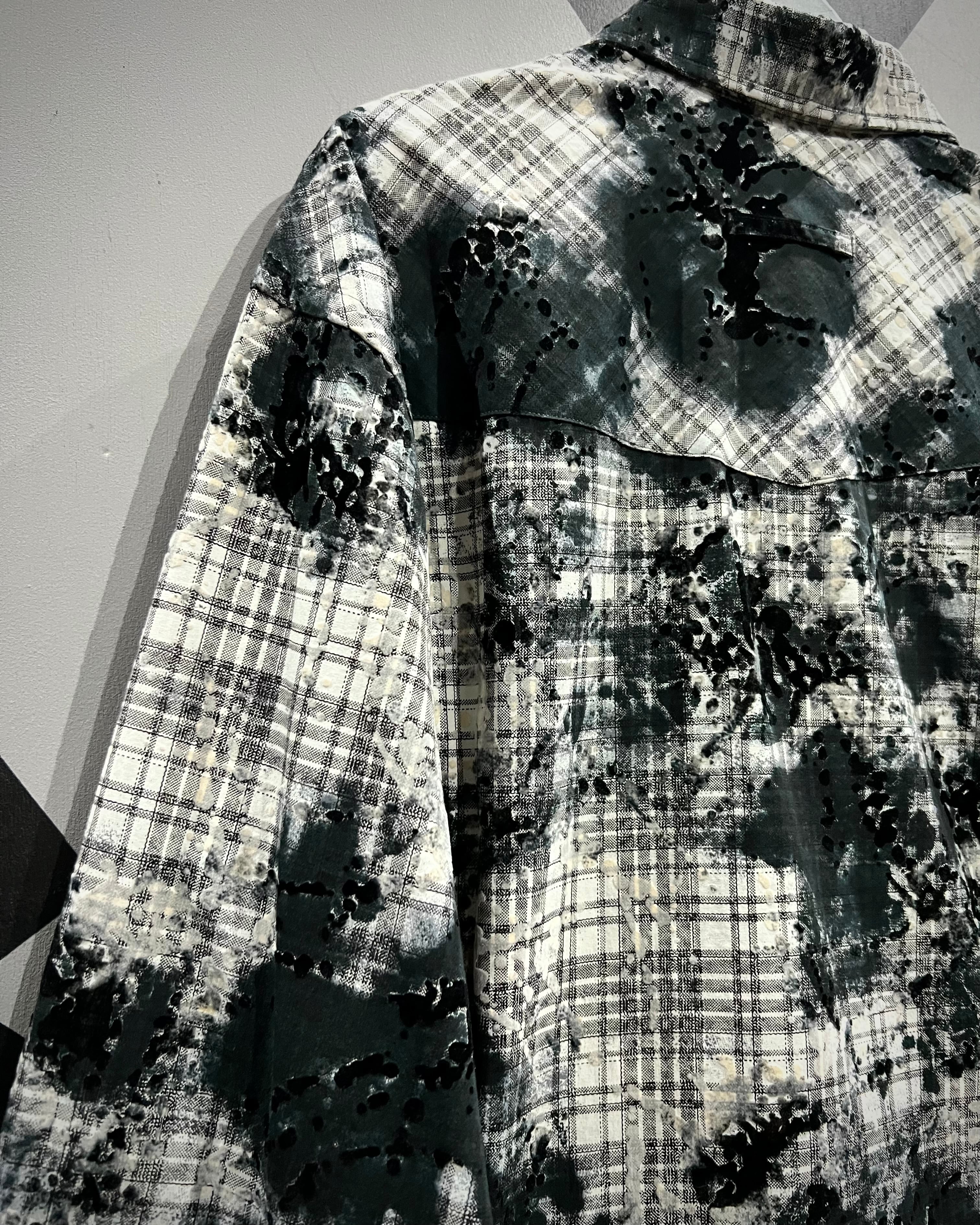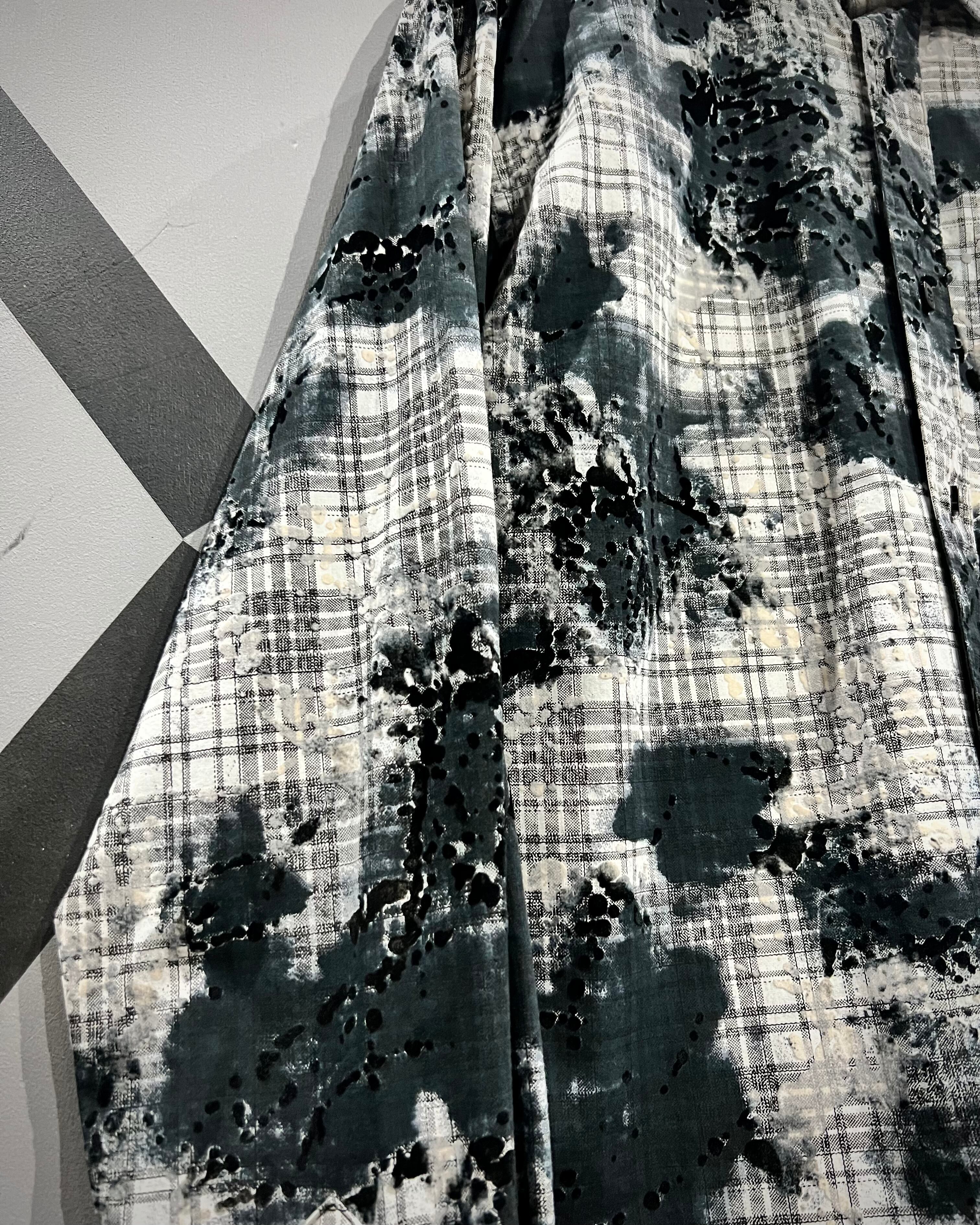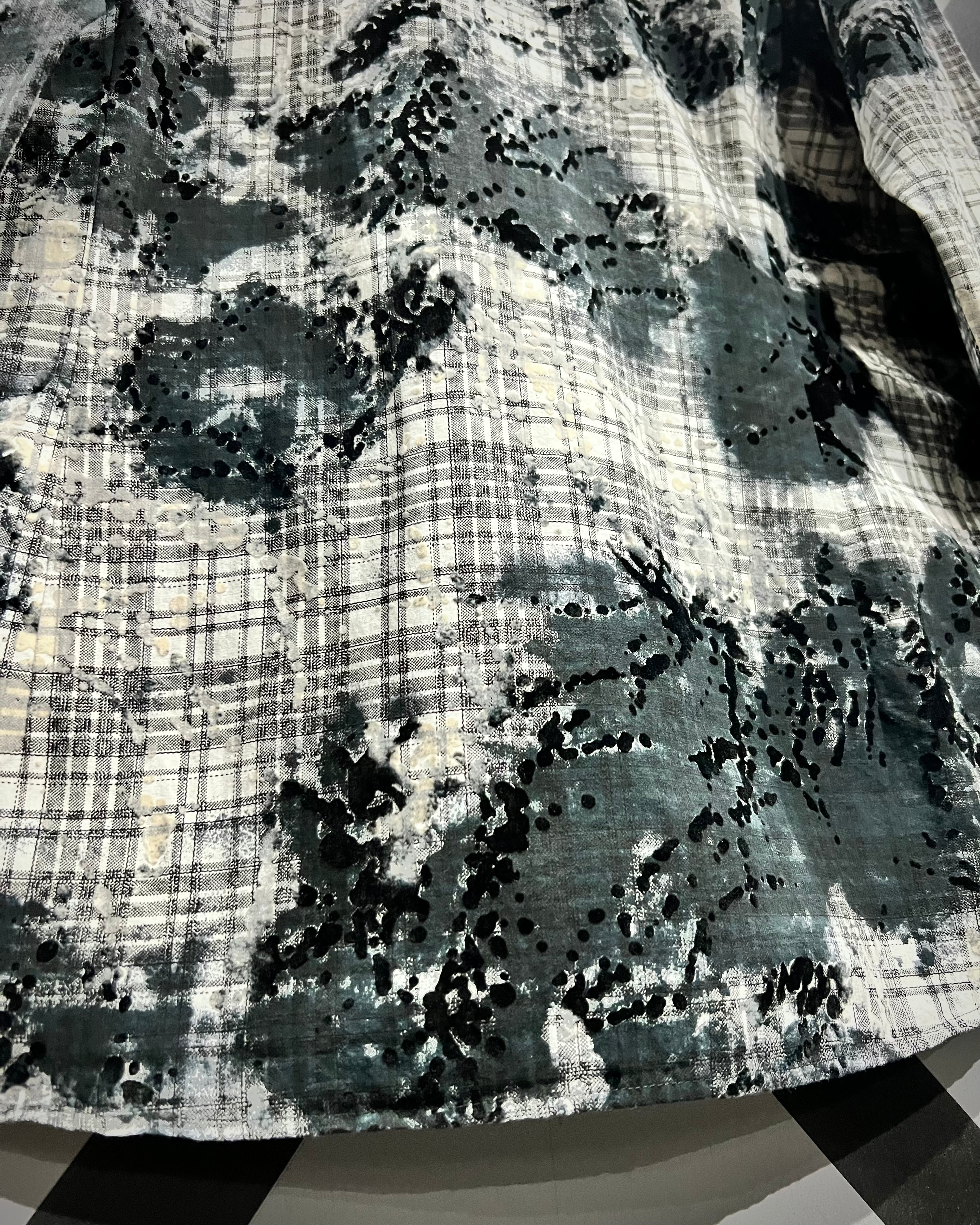 ベースは落ち着いたモノトーンチェック柄でありながら、その上からまるでアーティストの手によって大胆にペイントを施したかのようなブラックのプリントが重ねられており、唯一無二の雰囲気を演出しています。