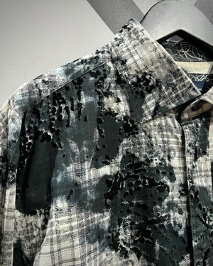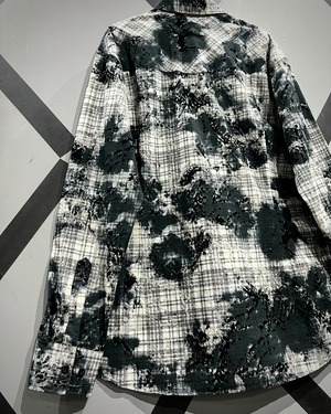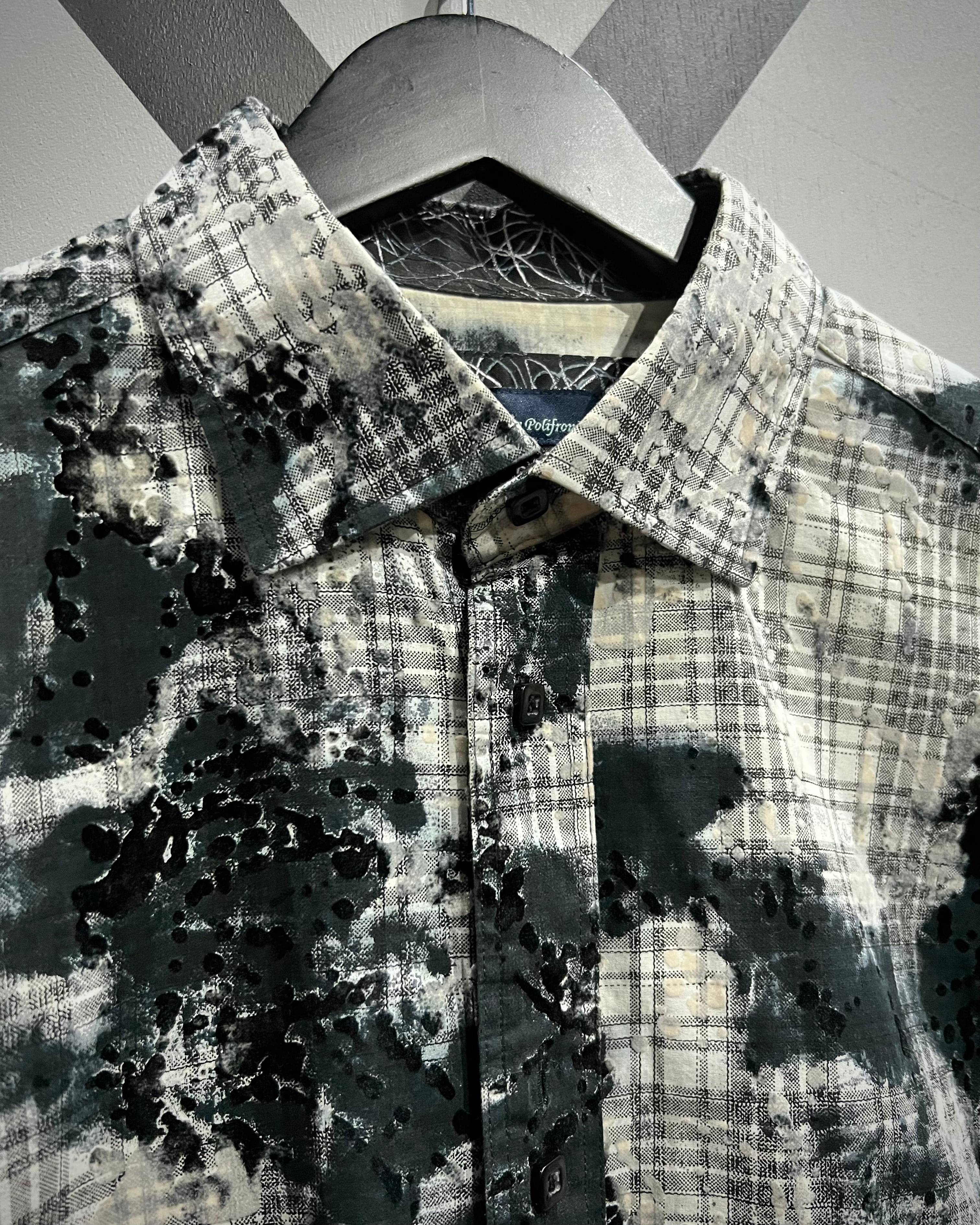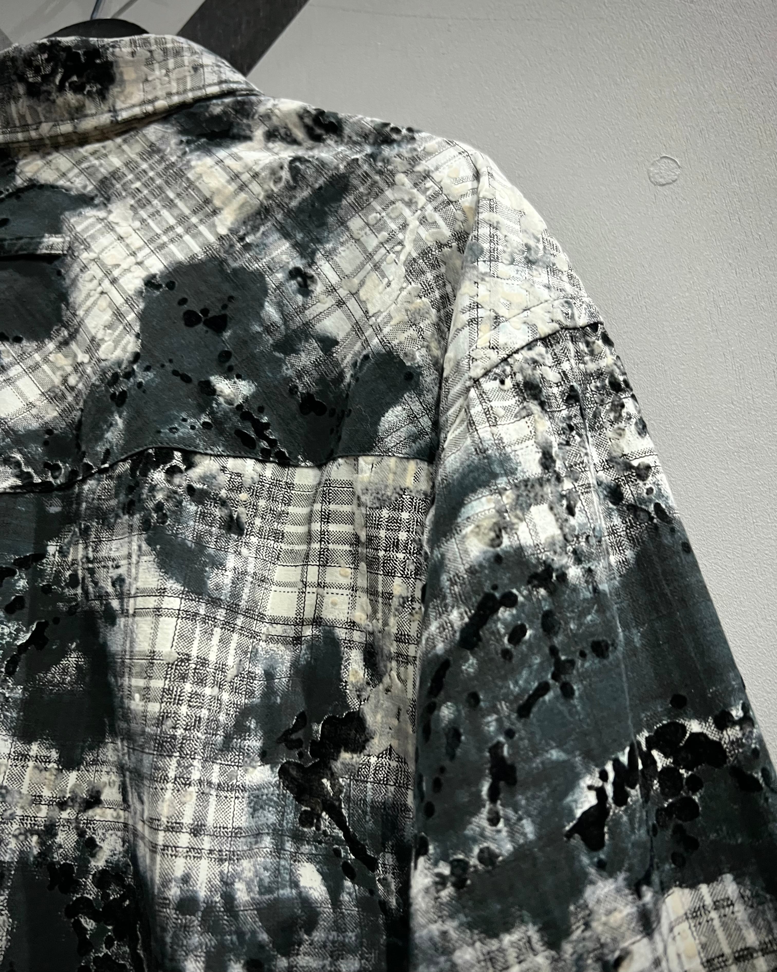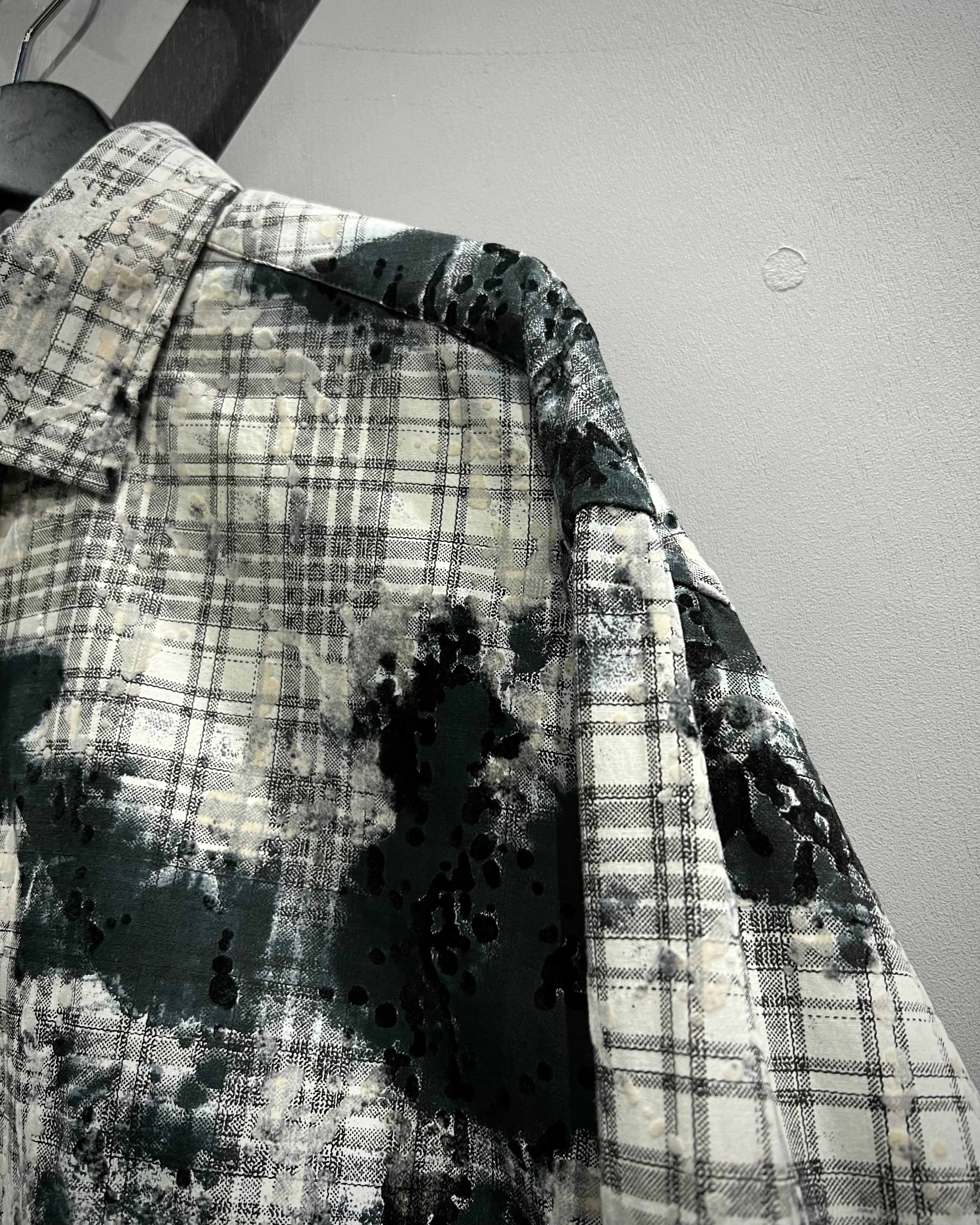 ベースは落ち着いたモノトーンチェック柄でありながら、その上からまるでアーティストの手によって大胆にペイントを施したかのようなブラックのプリントが重ねられており、唯一無二の雰囲気を演出しています。
