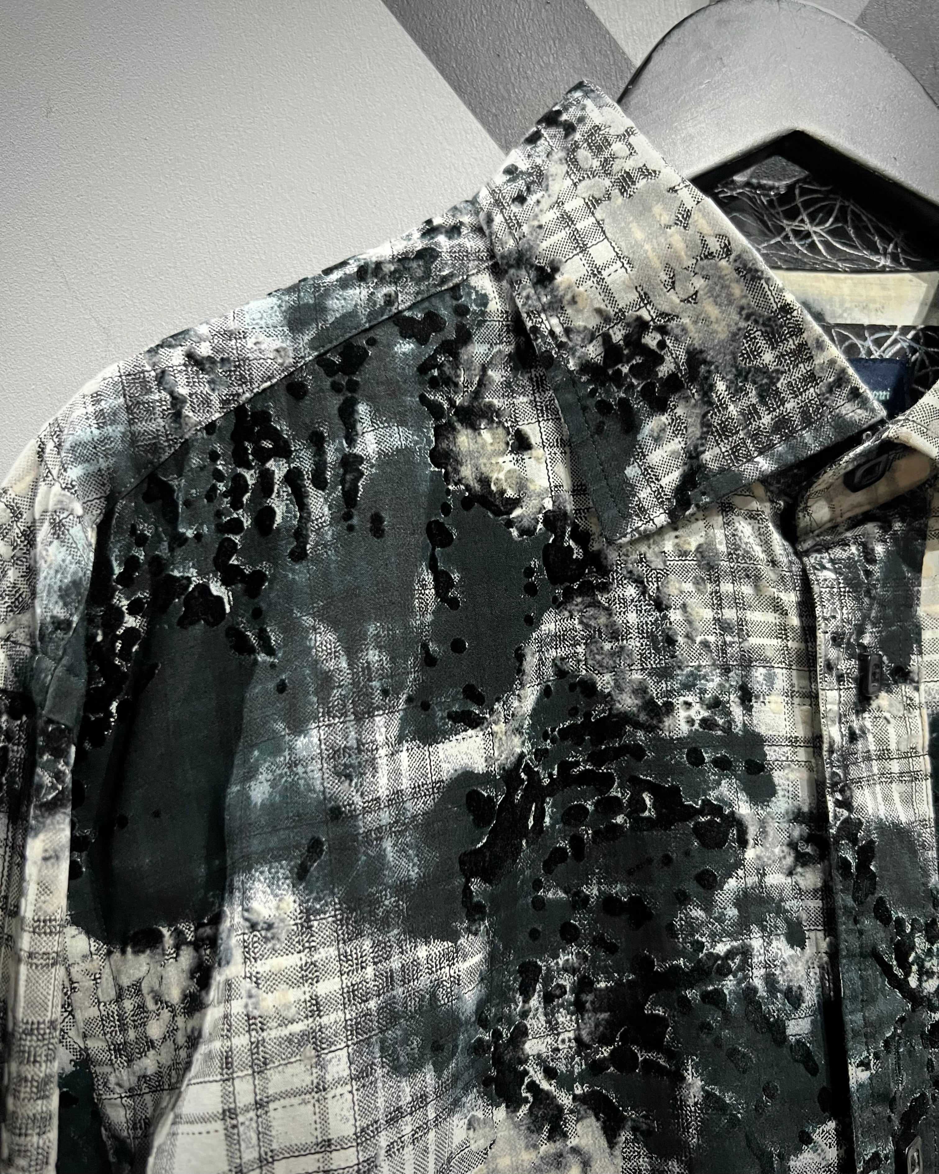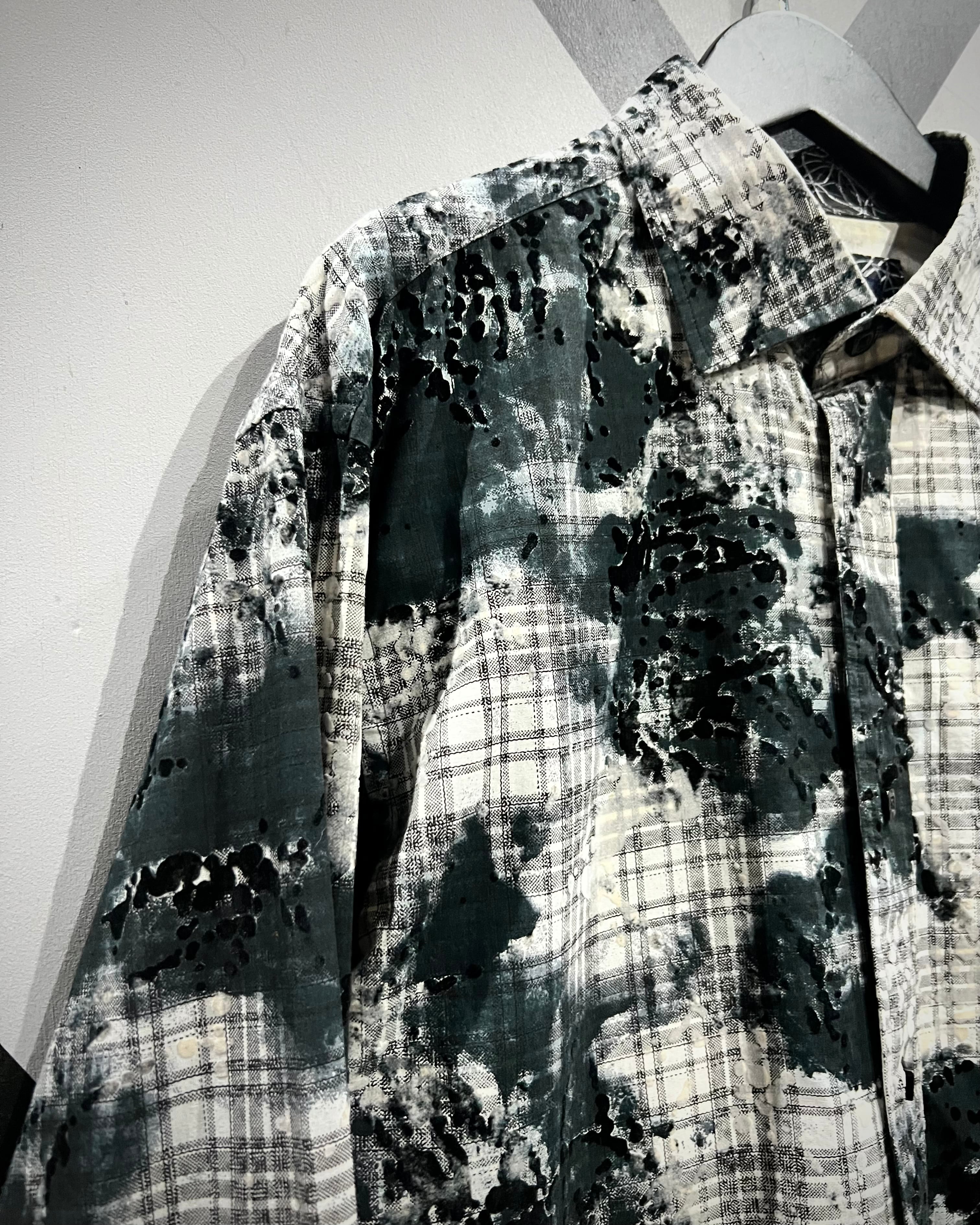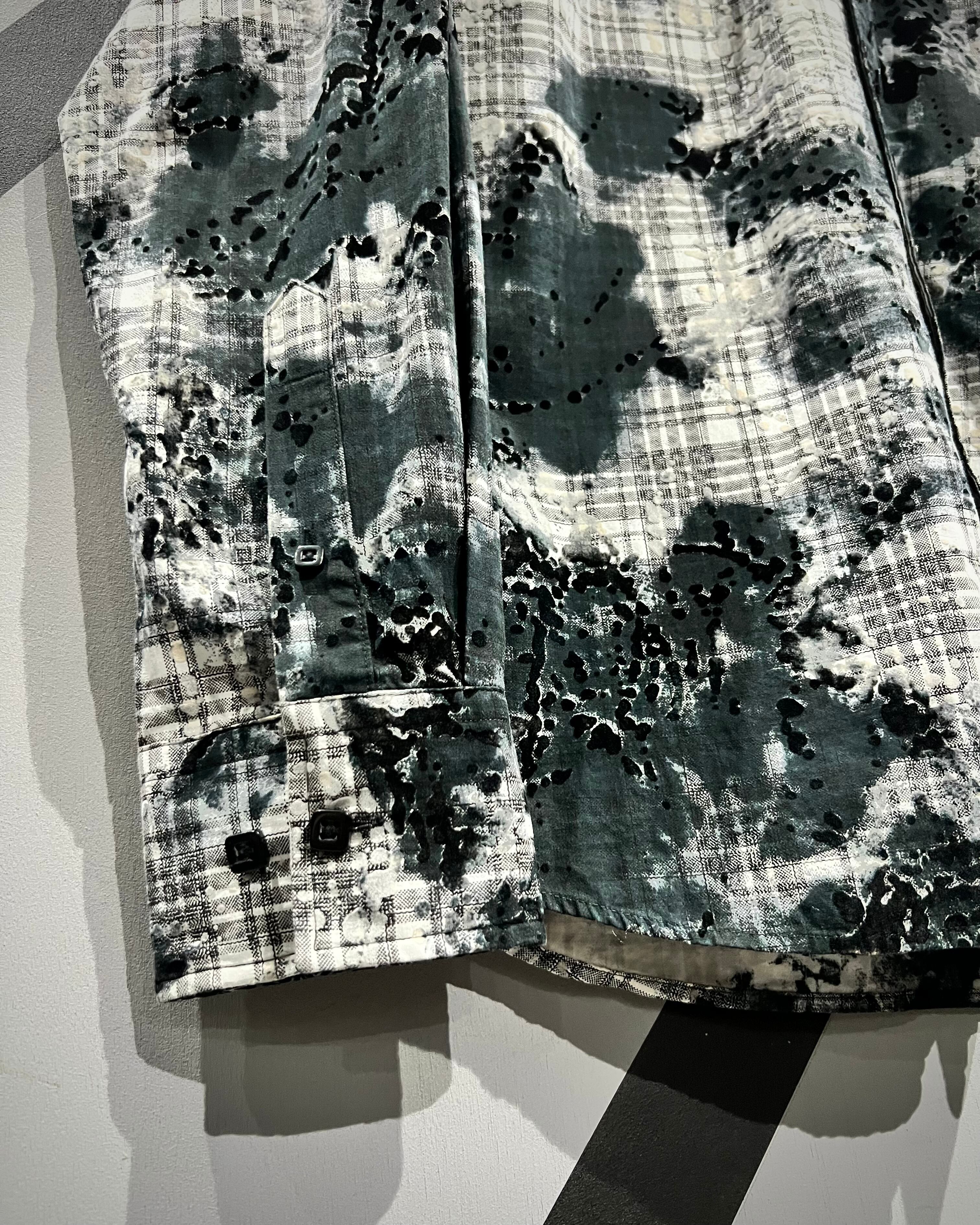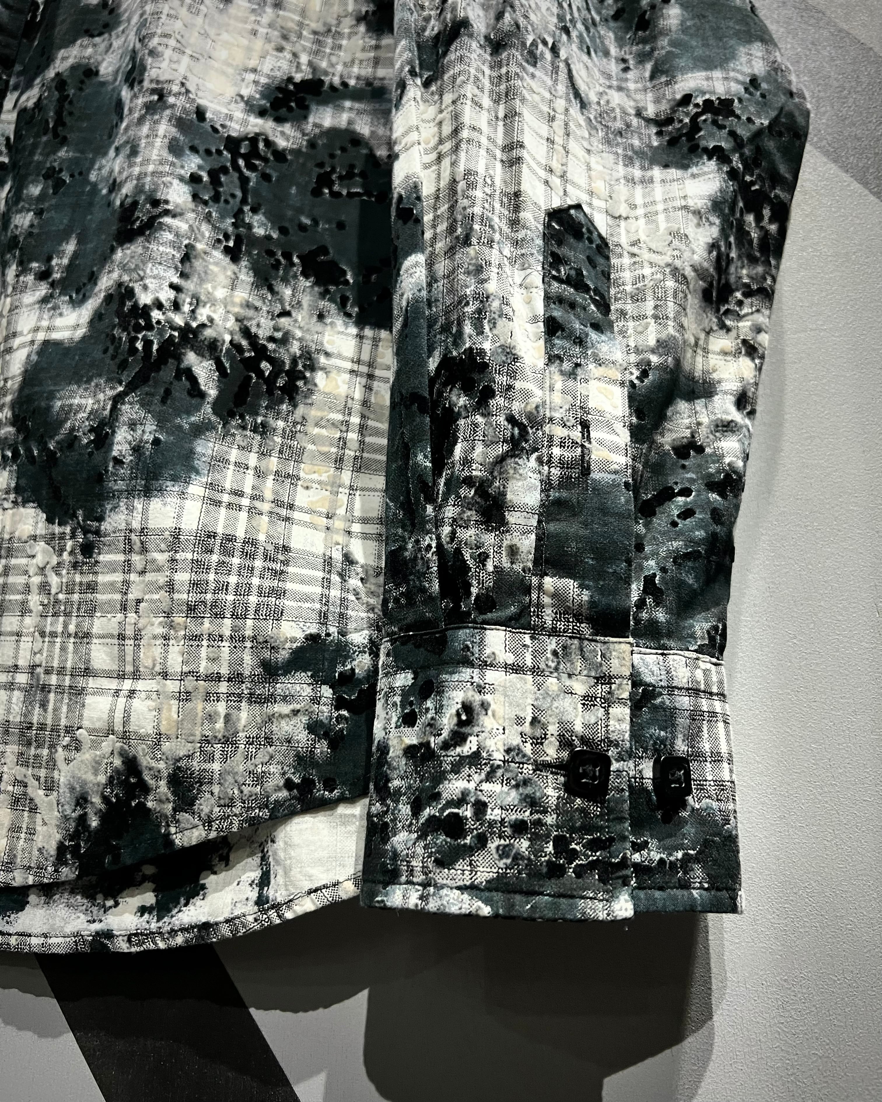さらに、袖裏にはグラフィカルな生地があしらわれており、袖をまくった際にチラリと見えるギミックも◎見えない部分にまで拘り抜かれたデザインは、単なるチェックシャツの枠を超えたアートピース的な仕上がりです。