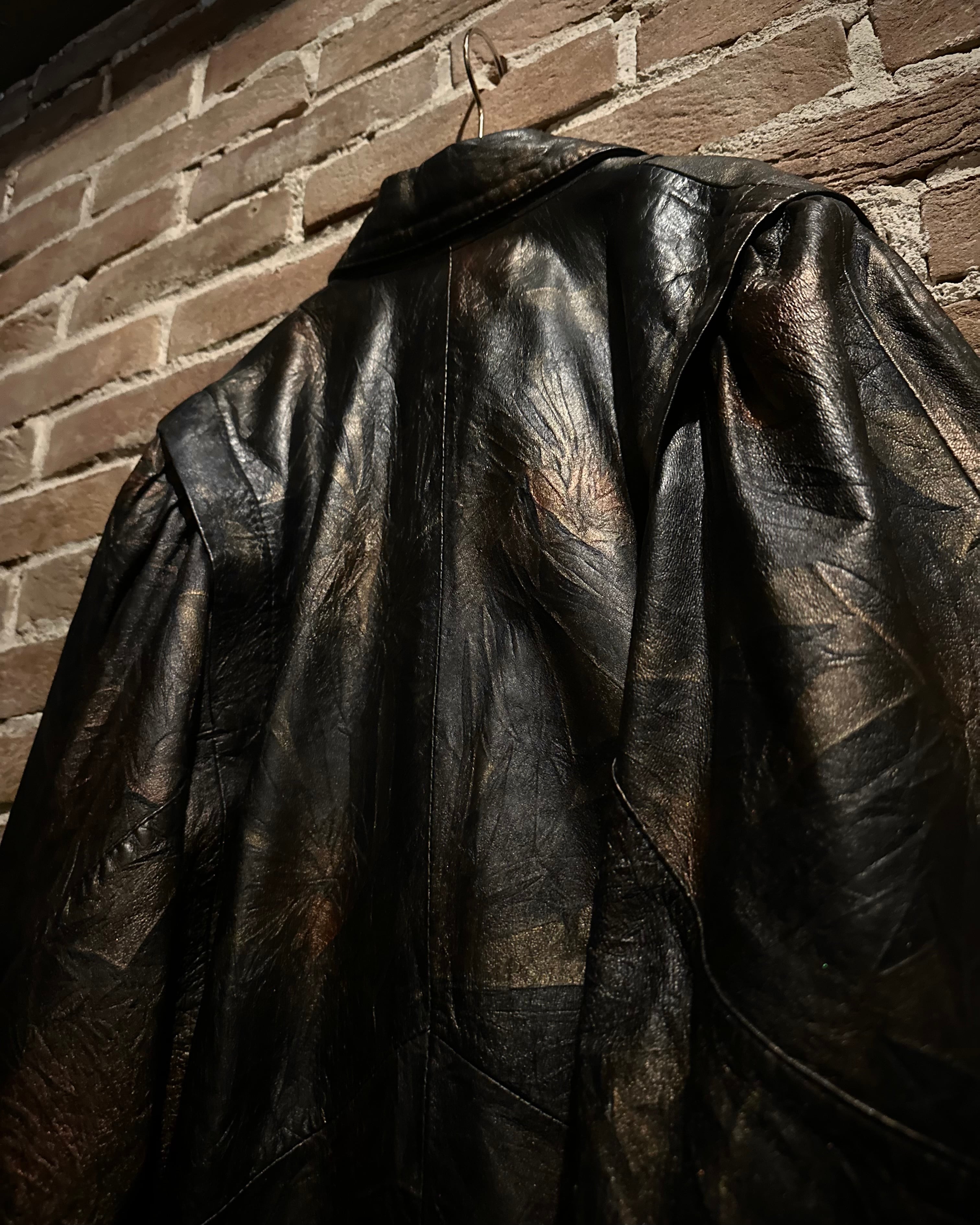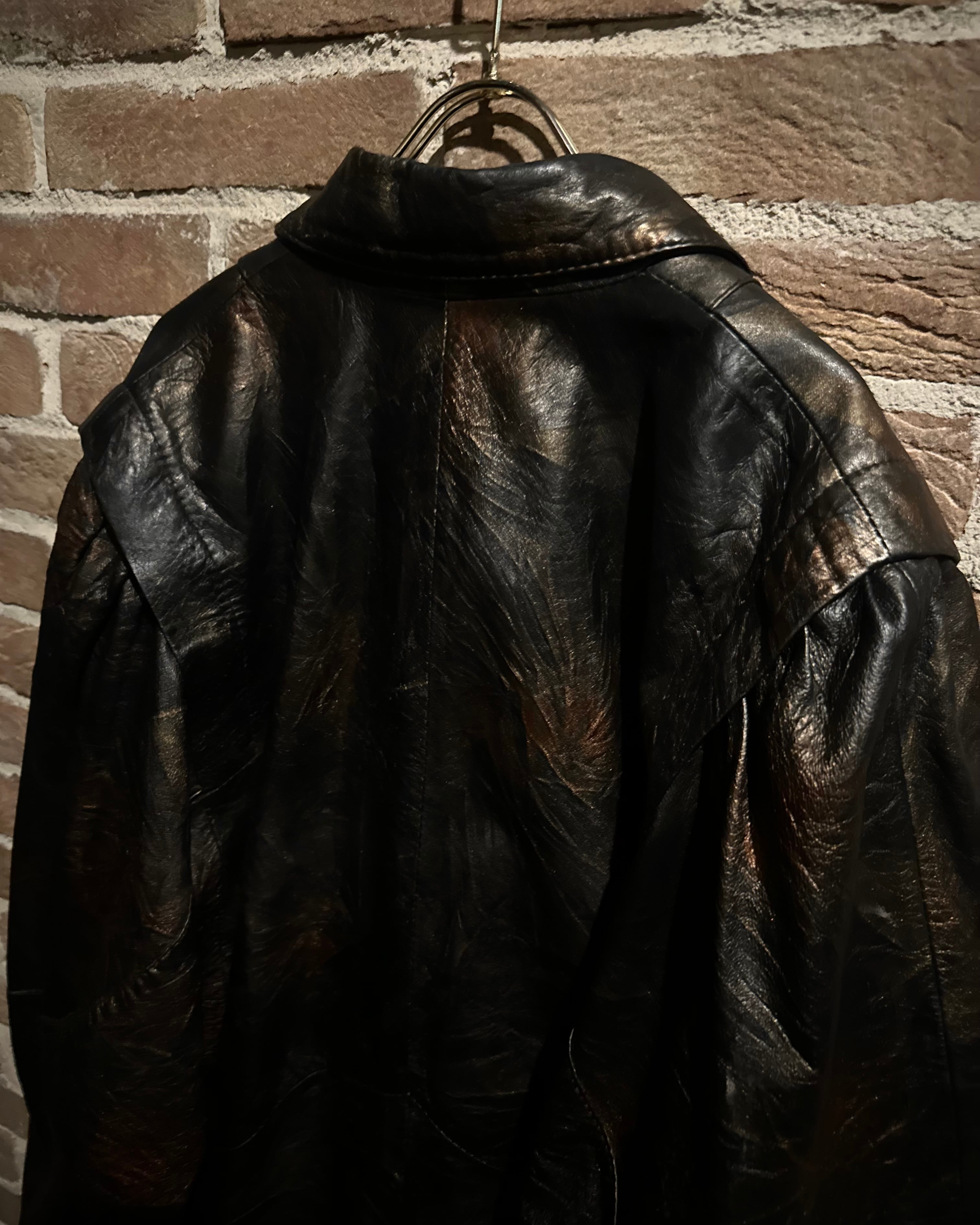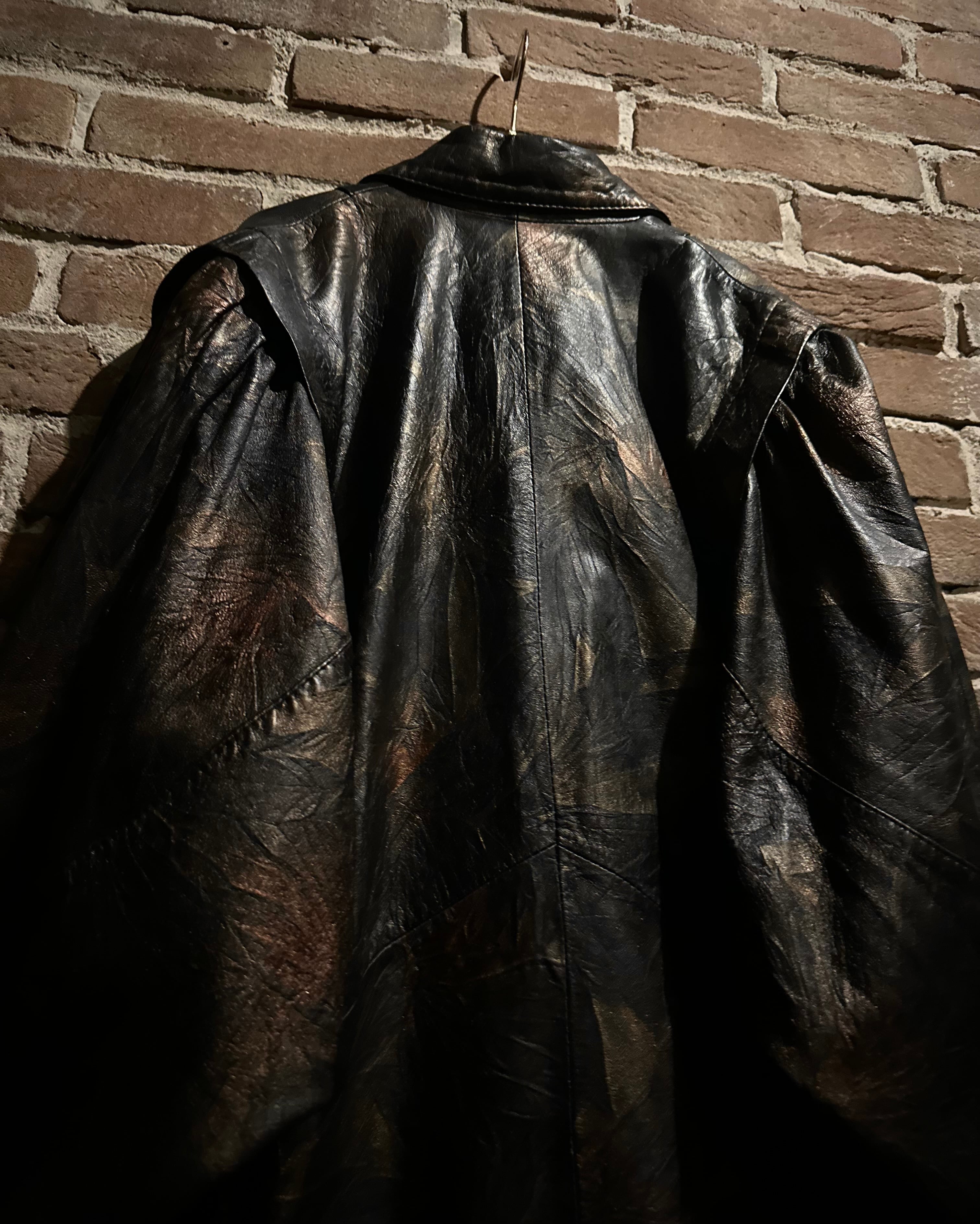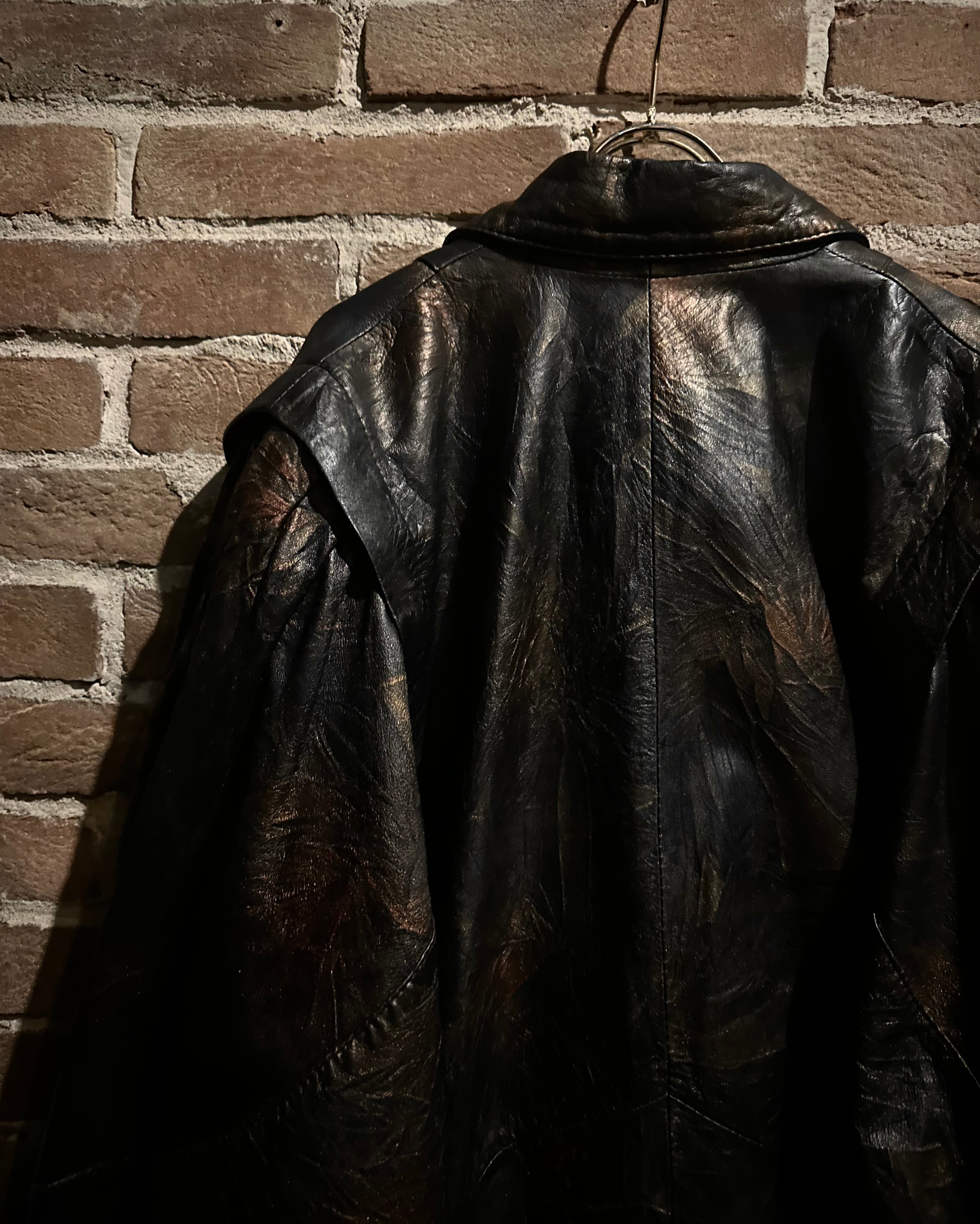 ブラックをベースにしながらも、光の当たり方によって浮かび上がるブロンズ〜ブラウンのマーブル調の色味に仕上げられたレザーテーラードジャケット。