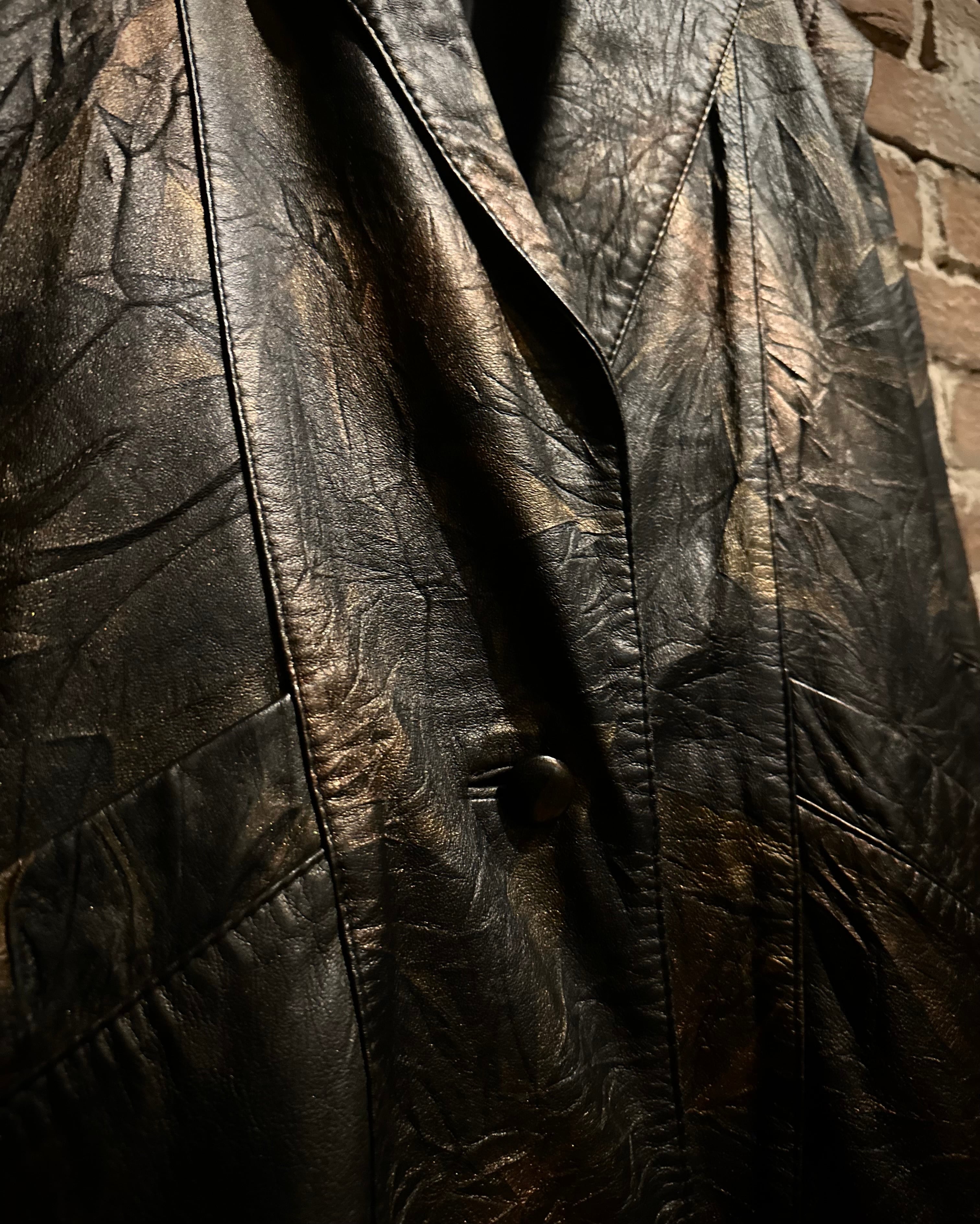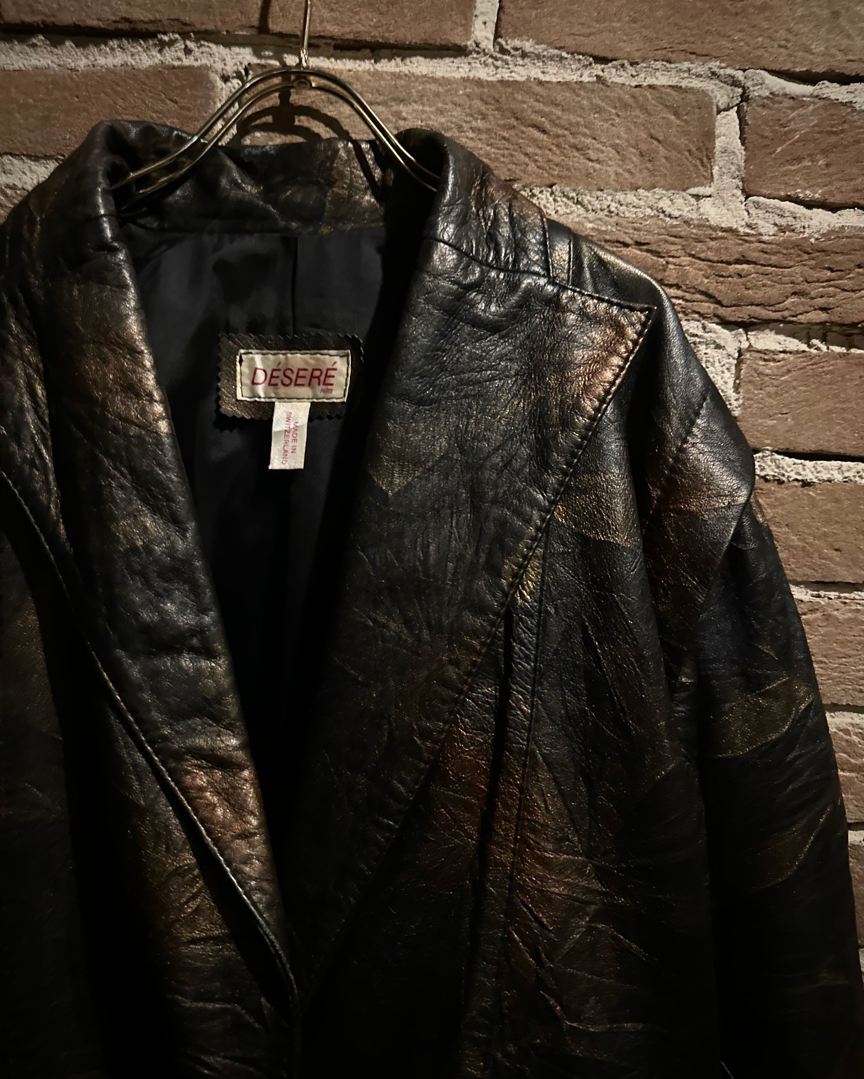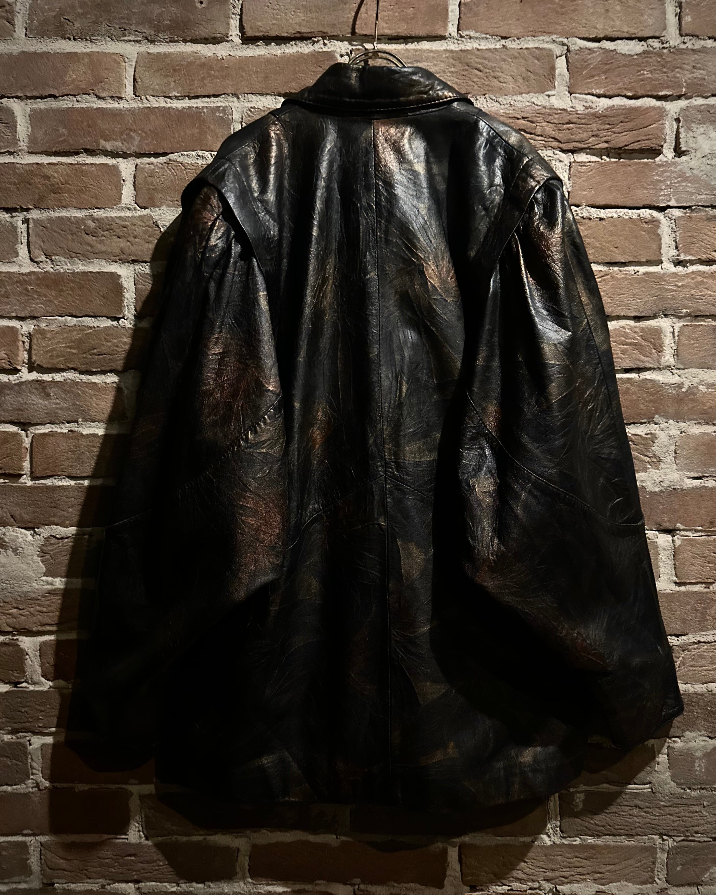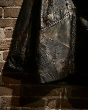 ブラックをベースにしながらも、光の当たり方によって浮かび上がるブロンズ〜ブラウンのマーブル調の色味に仕上げられたレザーテーラードジャケット。