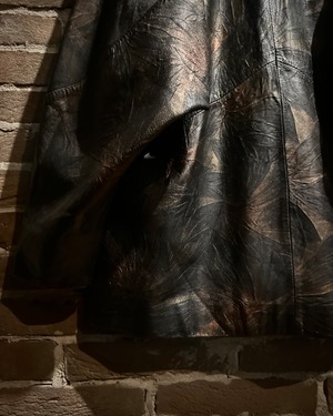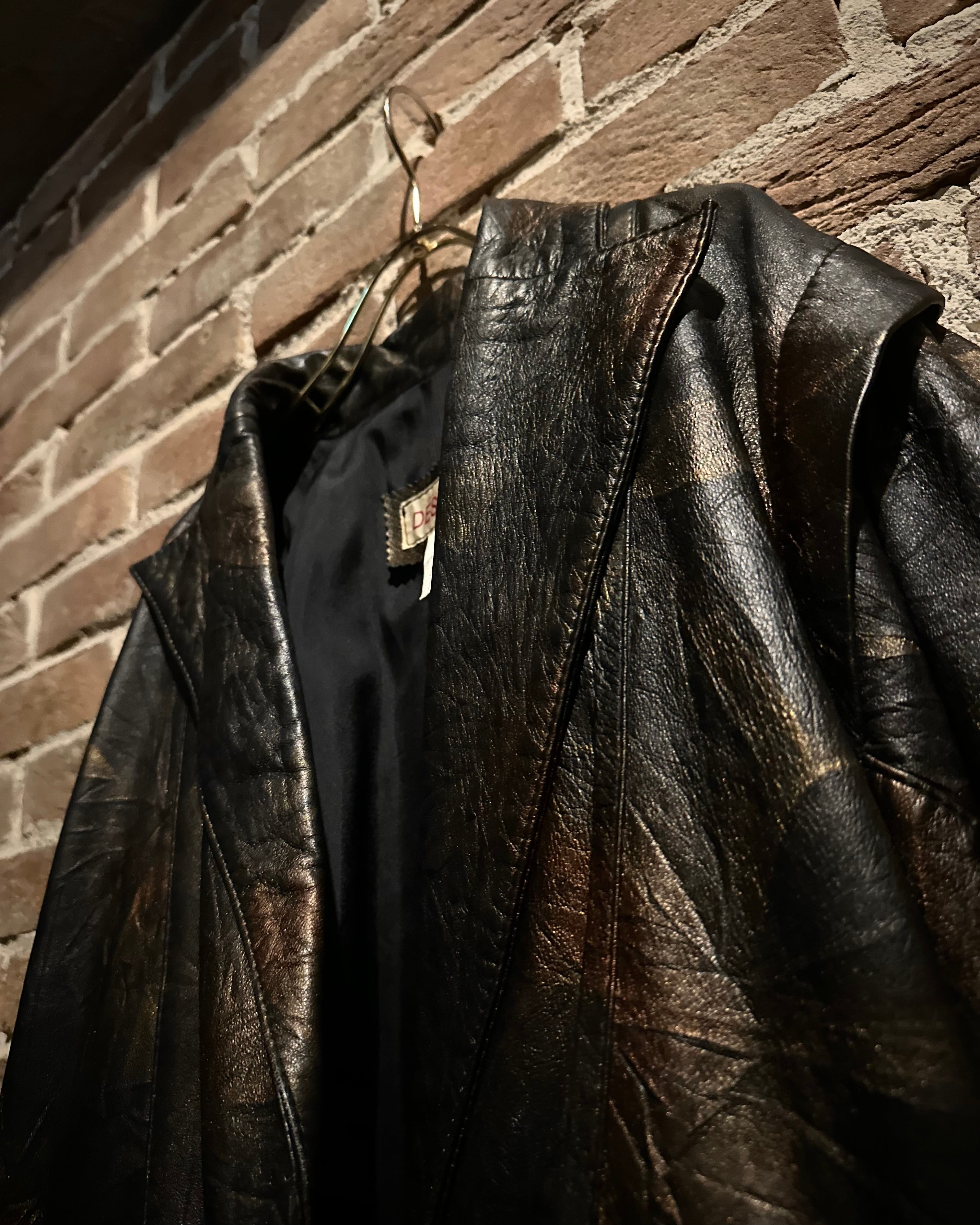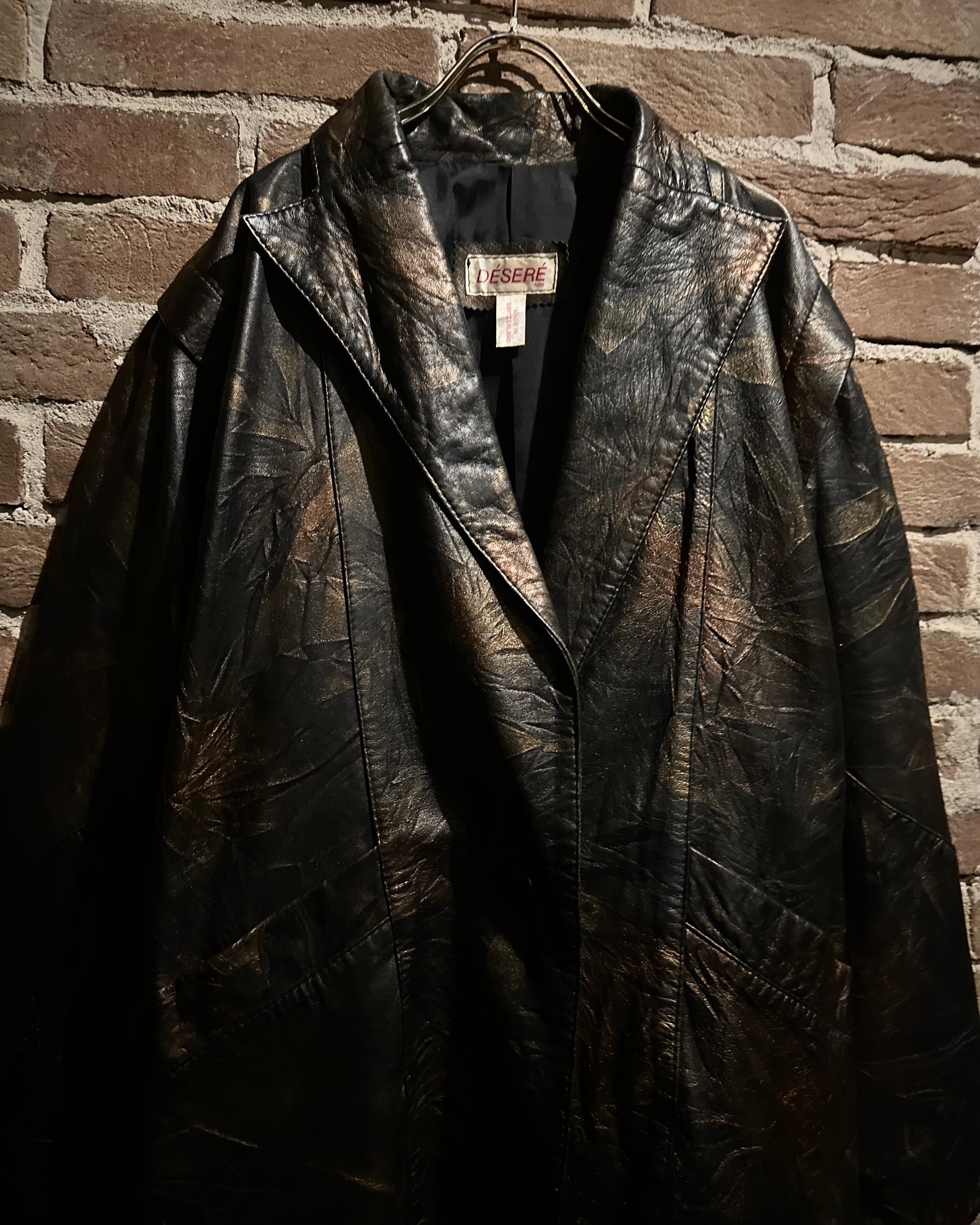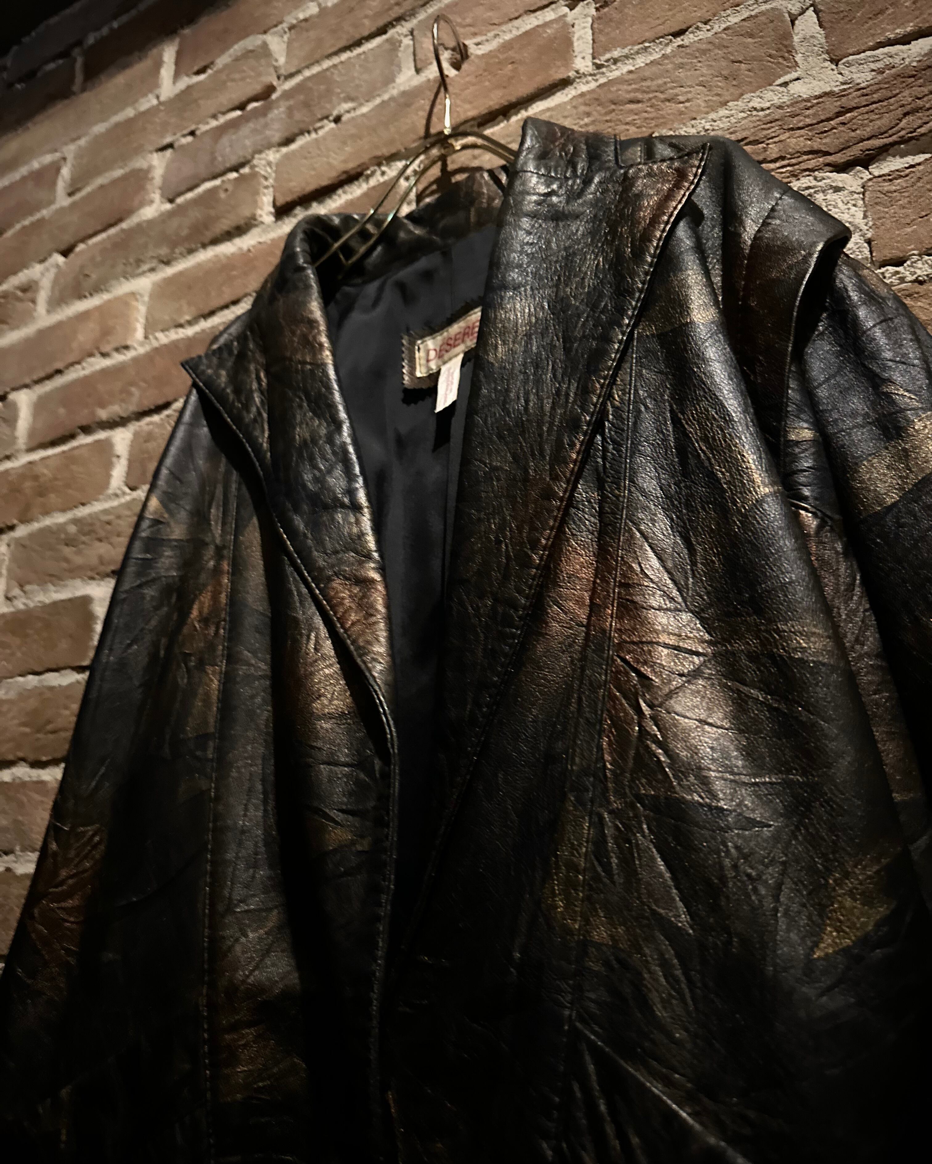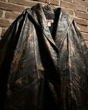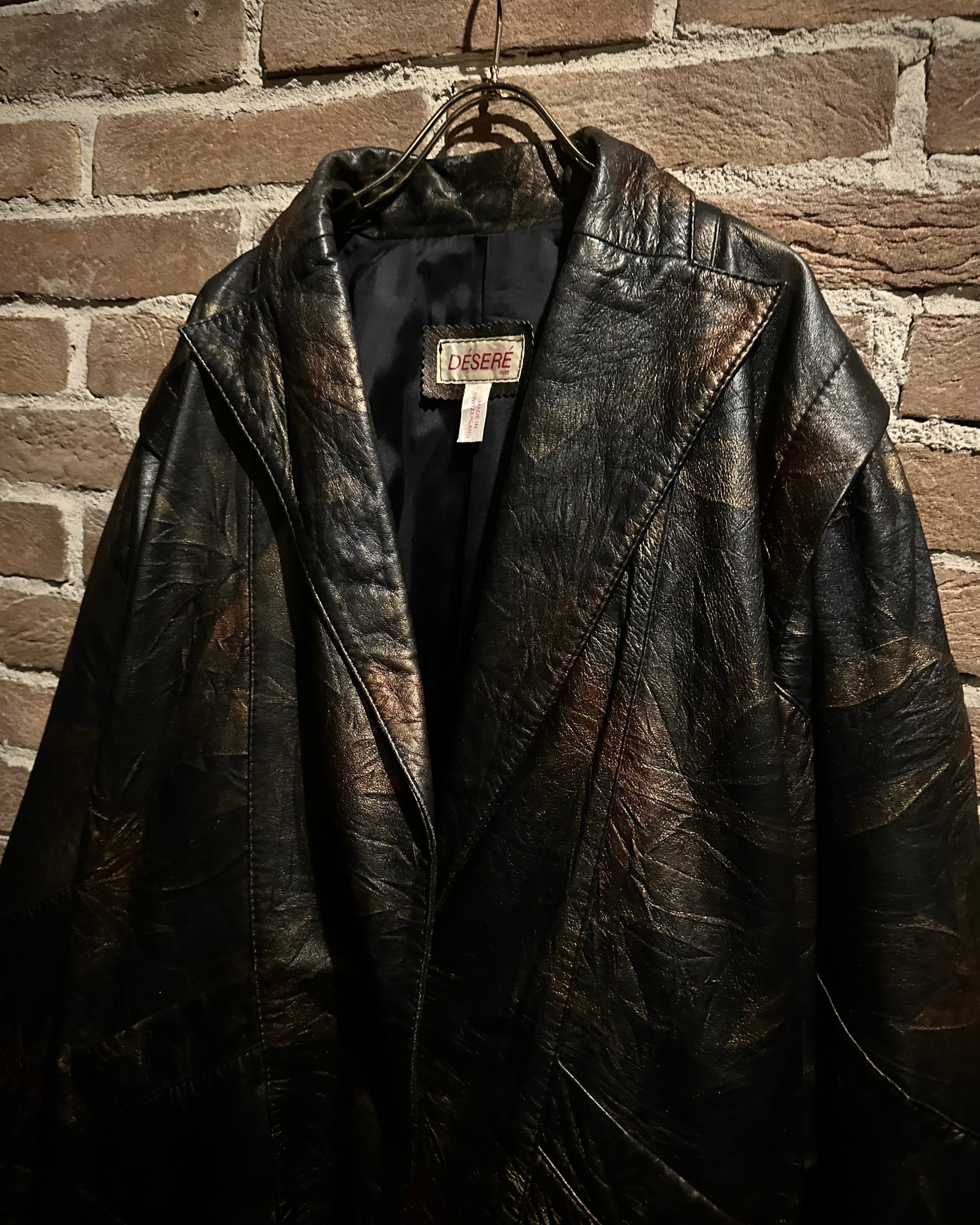 ブラックをベースにしながらも、光の当たり方によって浮かび上がるブロンズ〜ブラウンのマーブル調の色味に仕上げられたレザーテーラードジャケット。