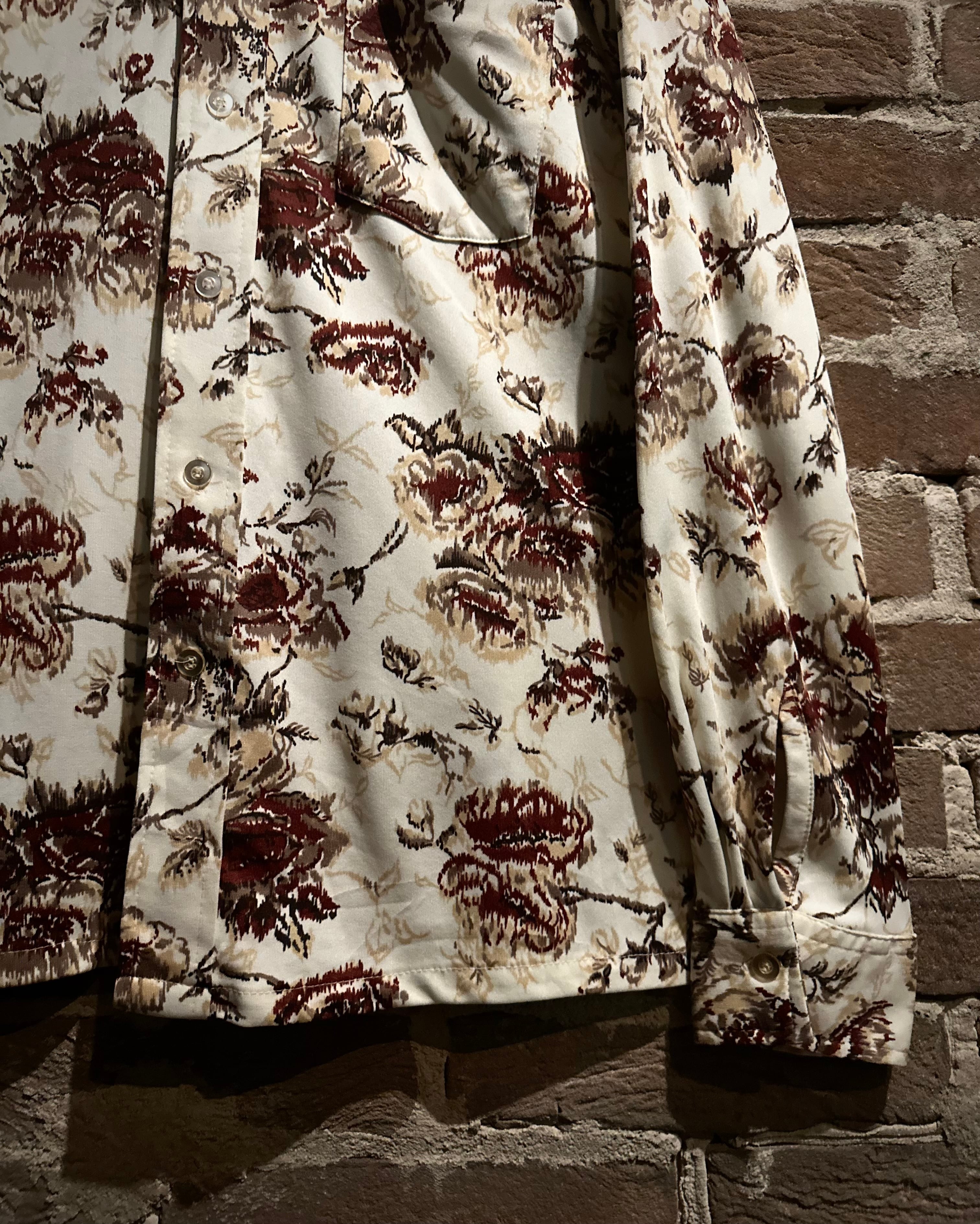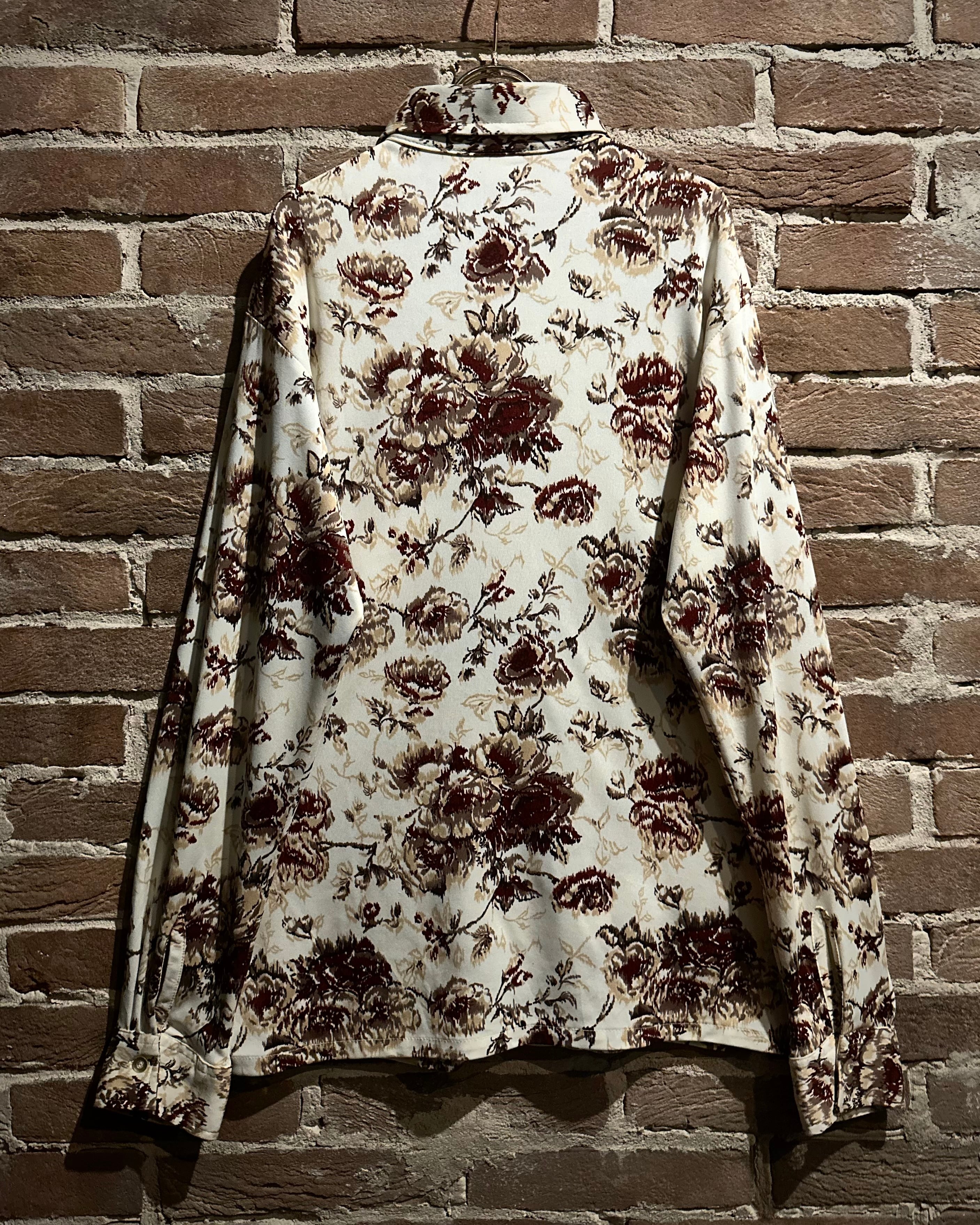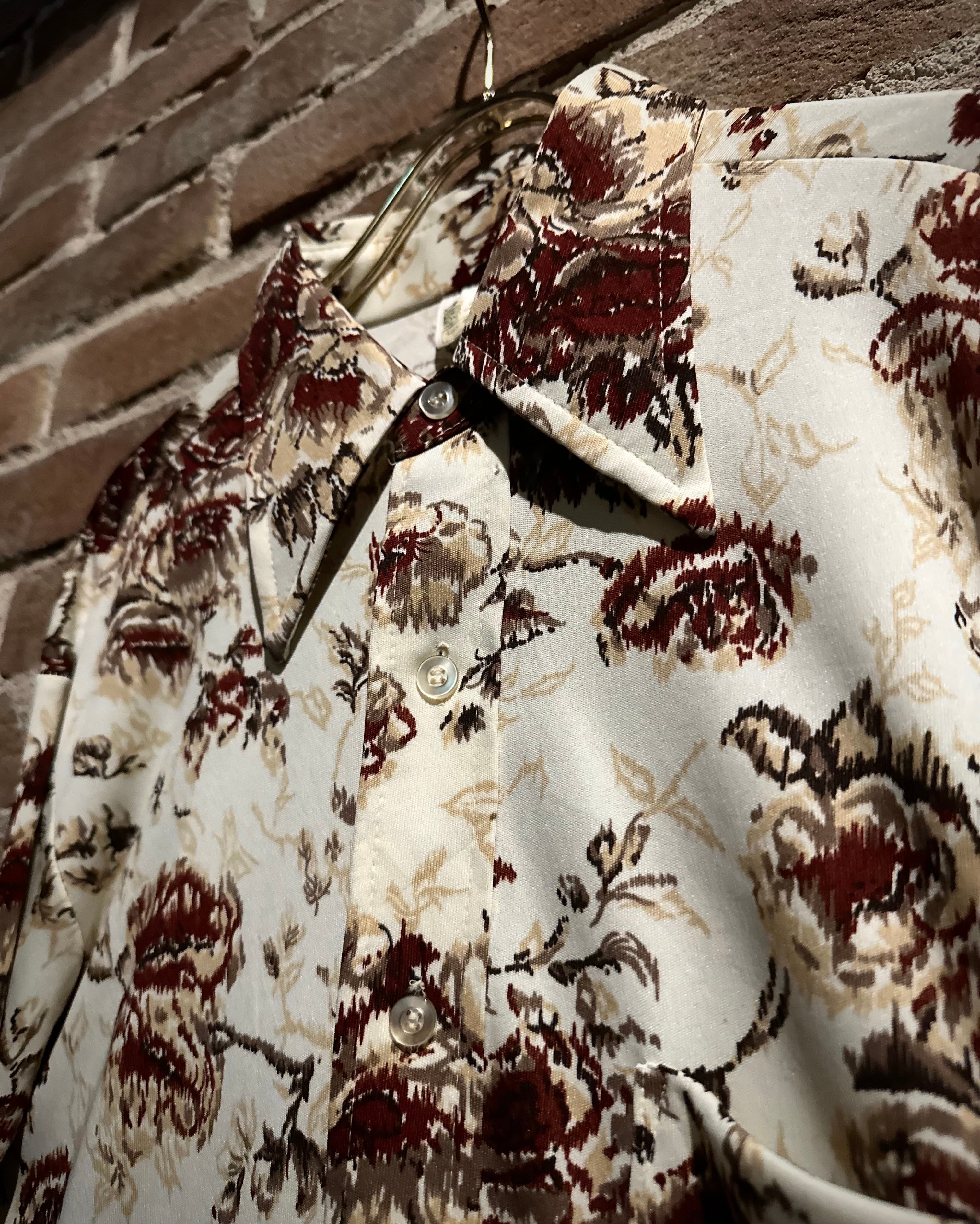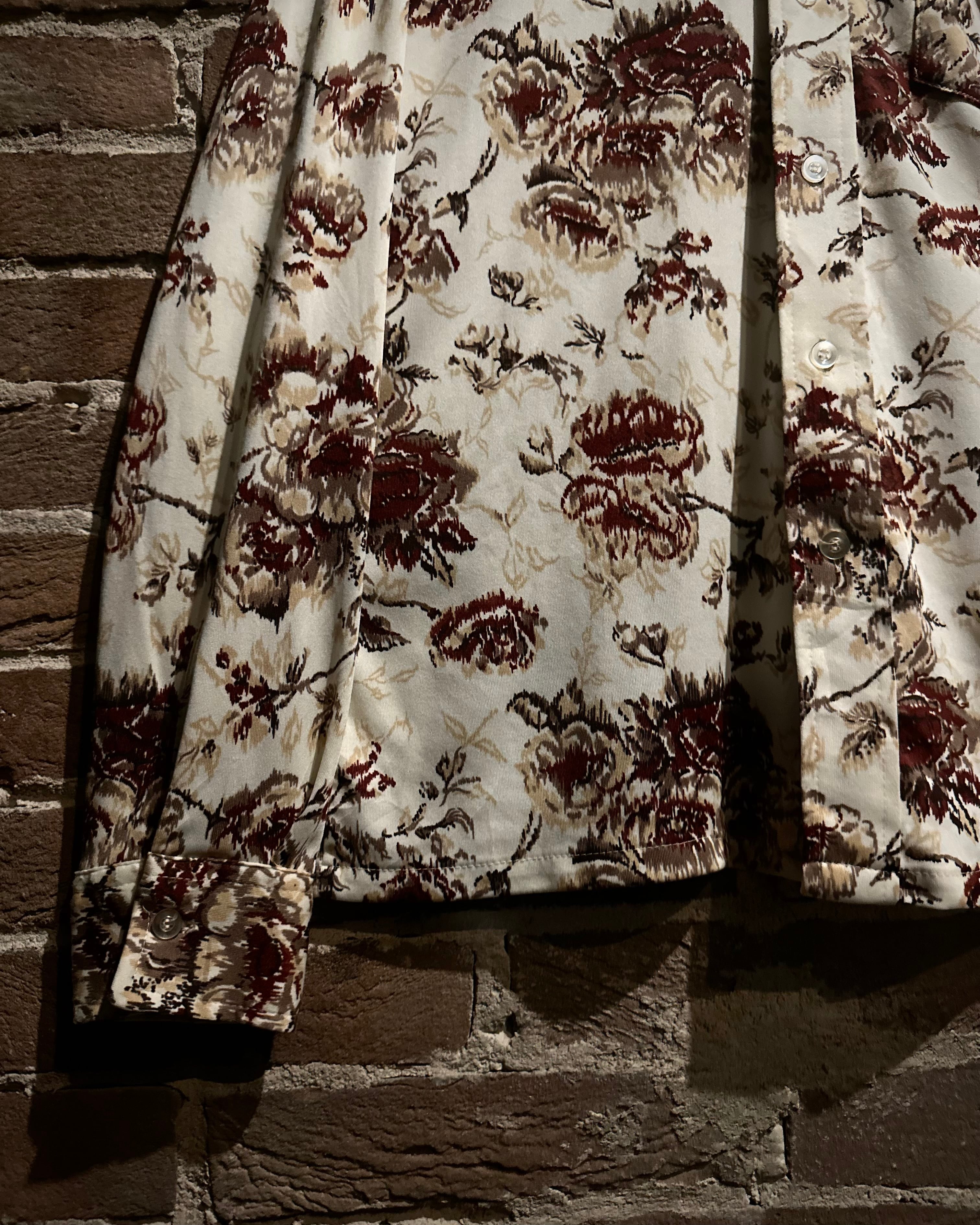 ベースには柔らかなベージュトーンを採用し、そこに深みのあるバーガンディとブラウンで描かれたフラワーモチーフが全面にあしらわれた70'sの長袖シャツ。