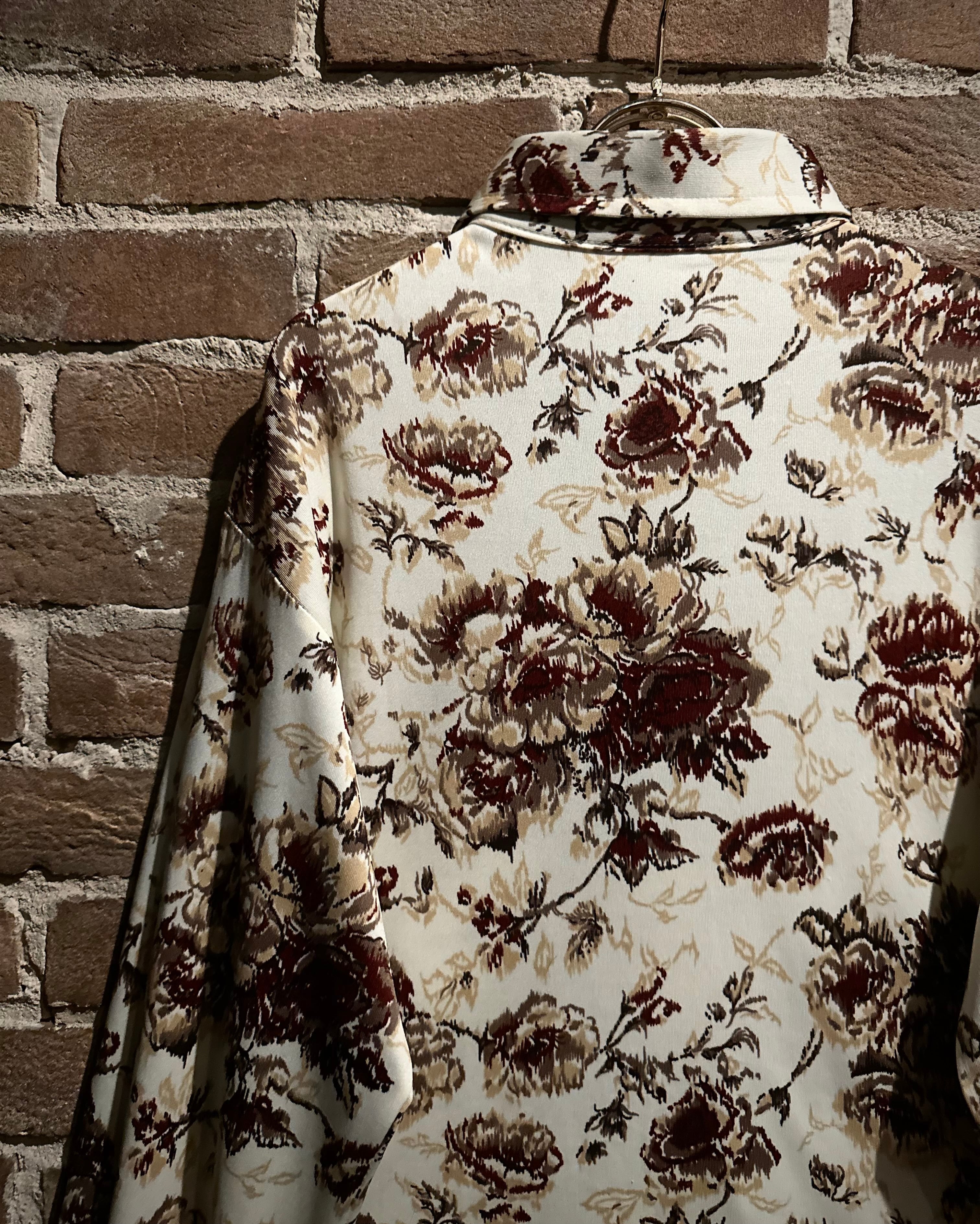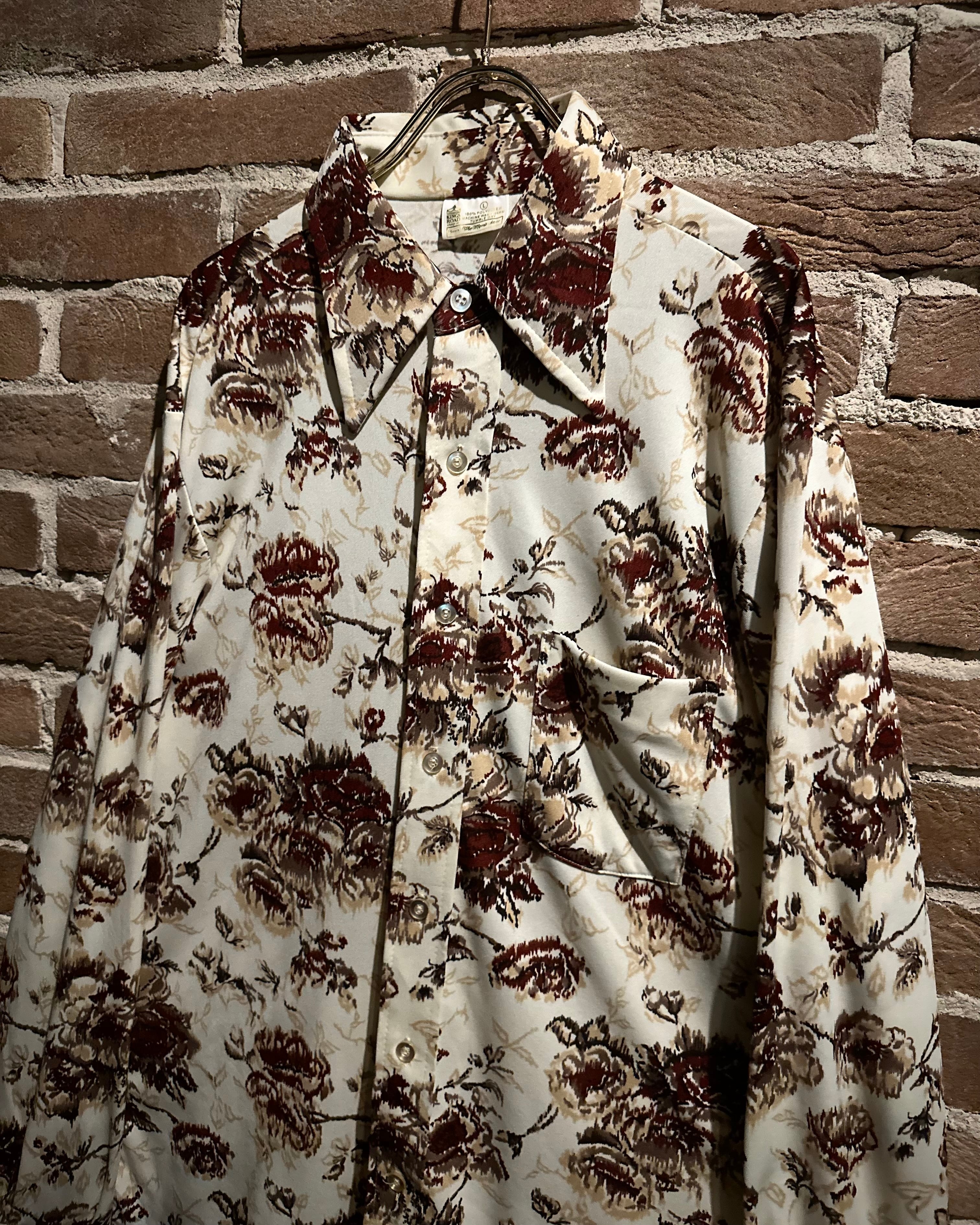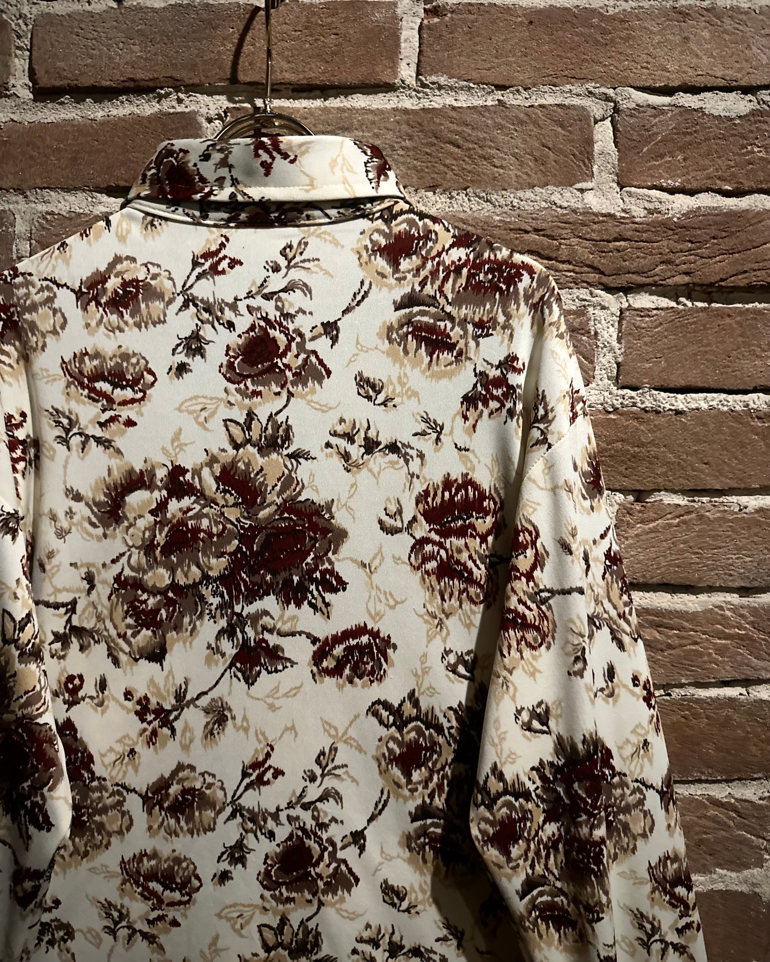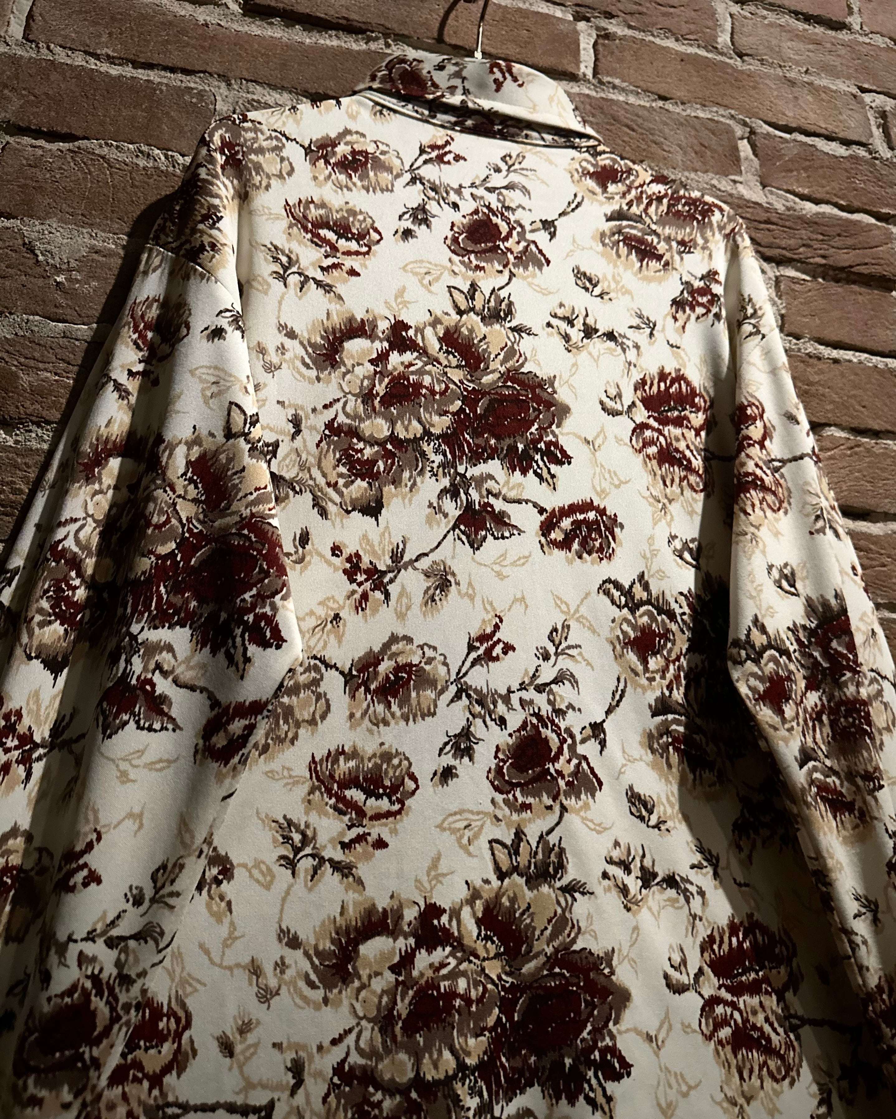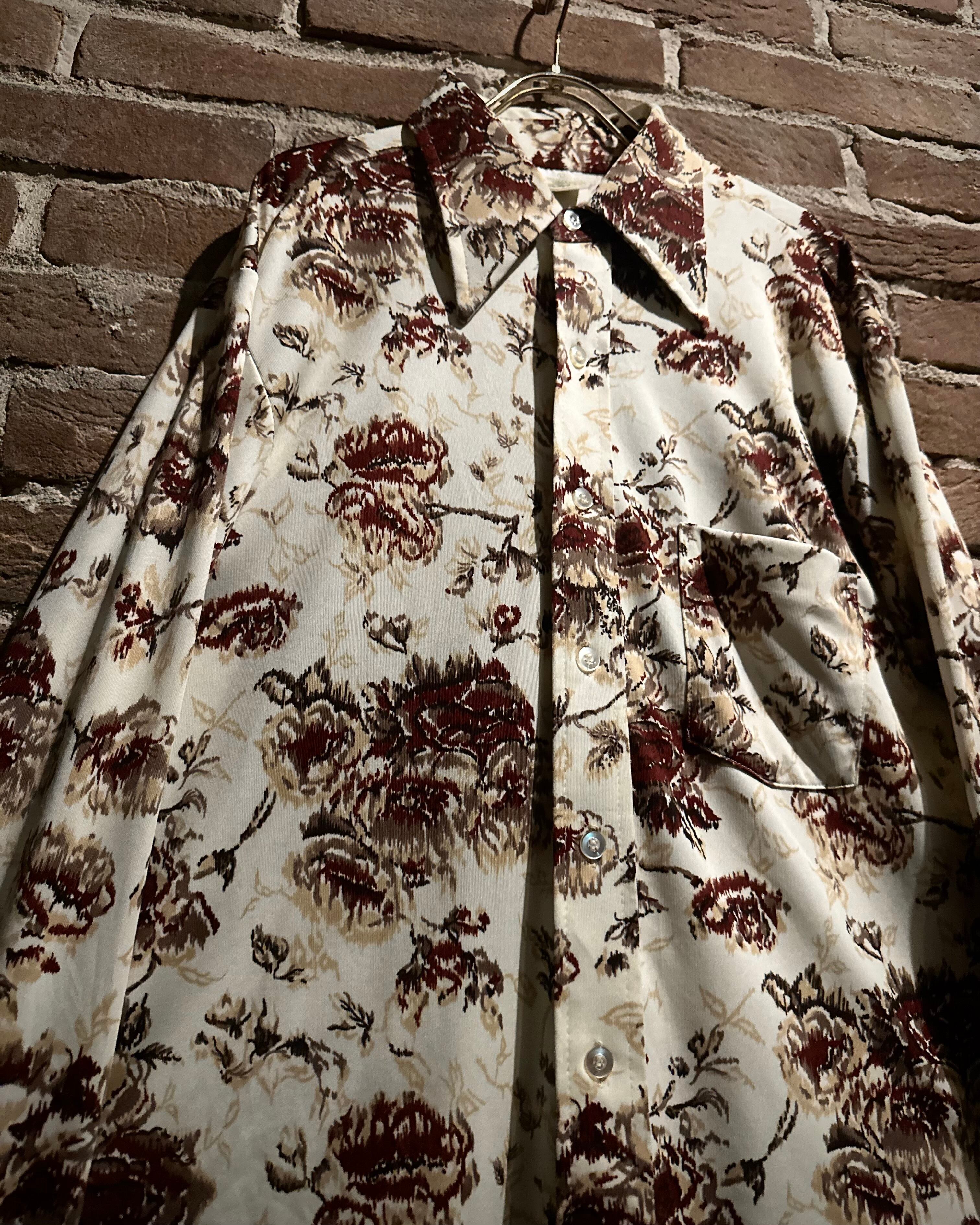 ベースには柔らかなベージュトーンを採用し、そこに深みのあるバーガンディとブラウンで描かれたフラワーモチーフが全面にあしらわれた70'sの長袖シャツ。