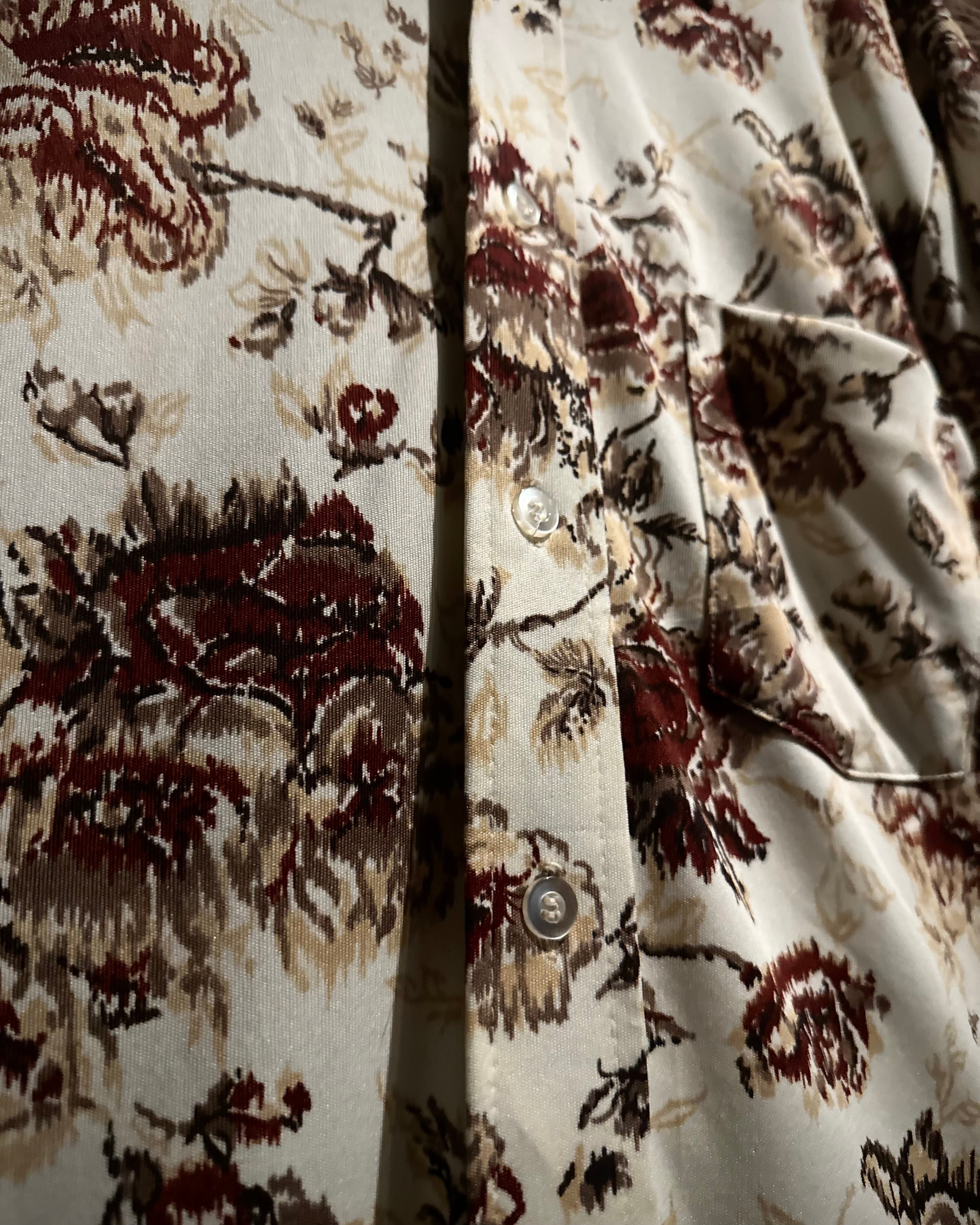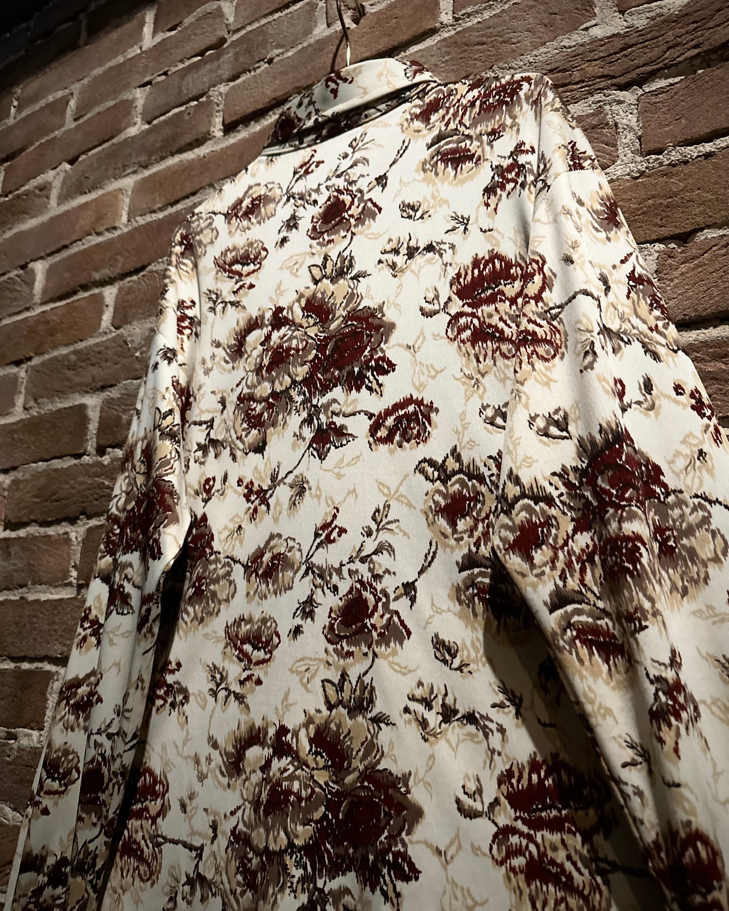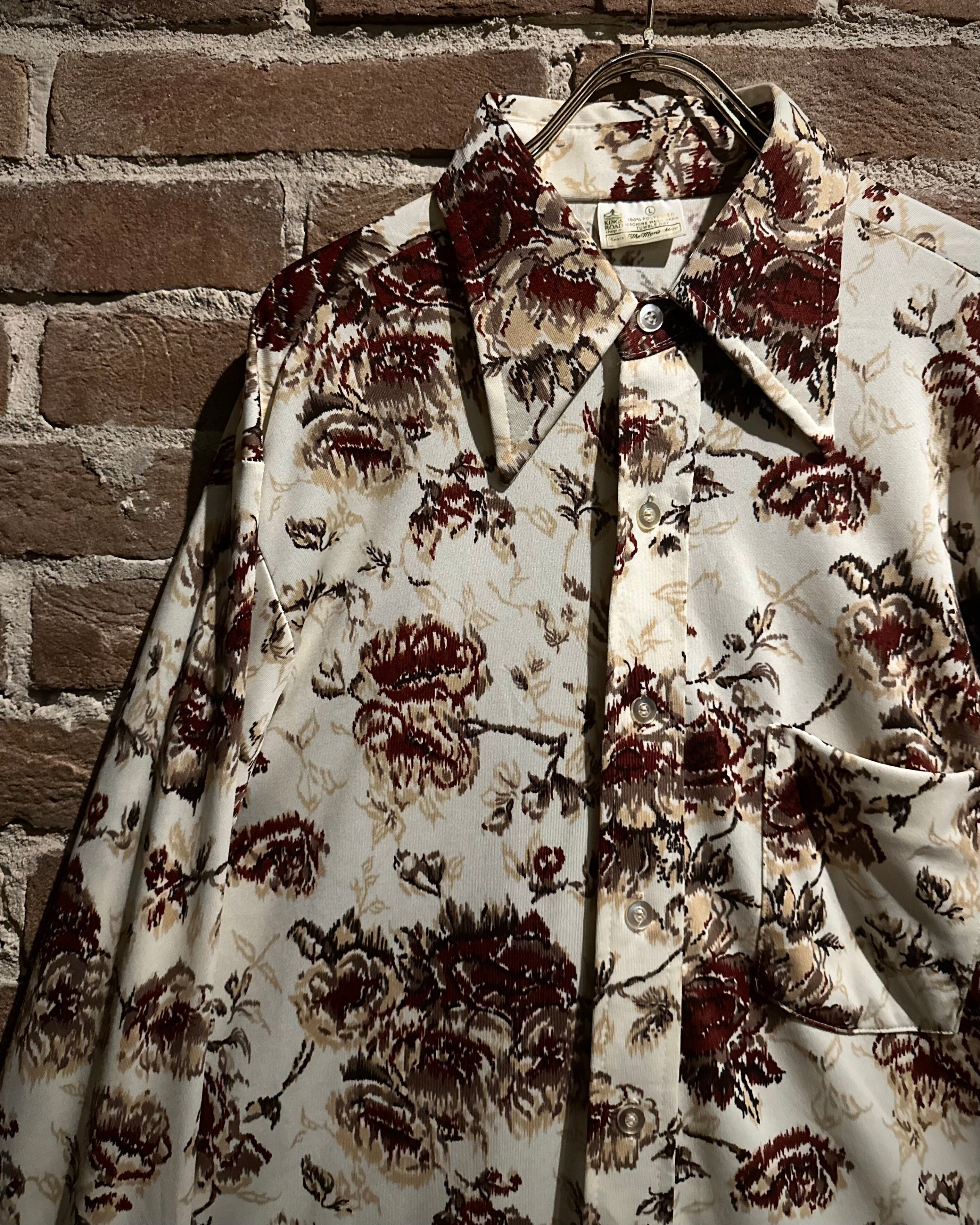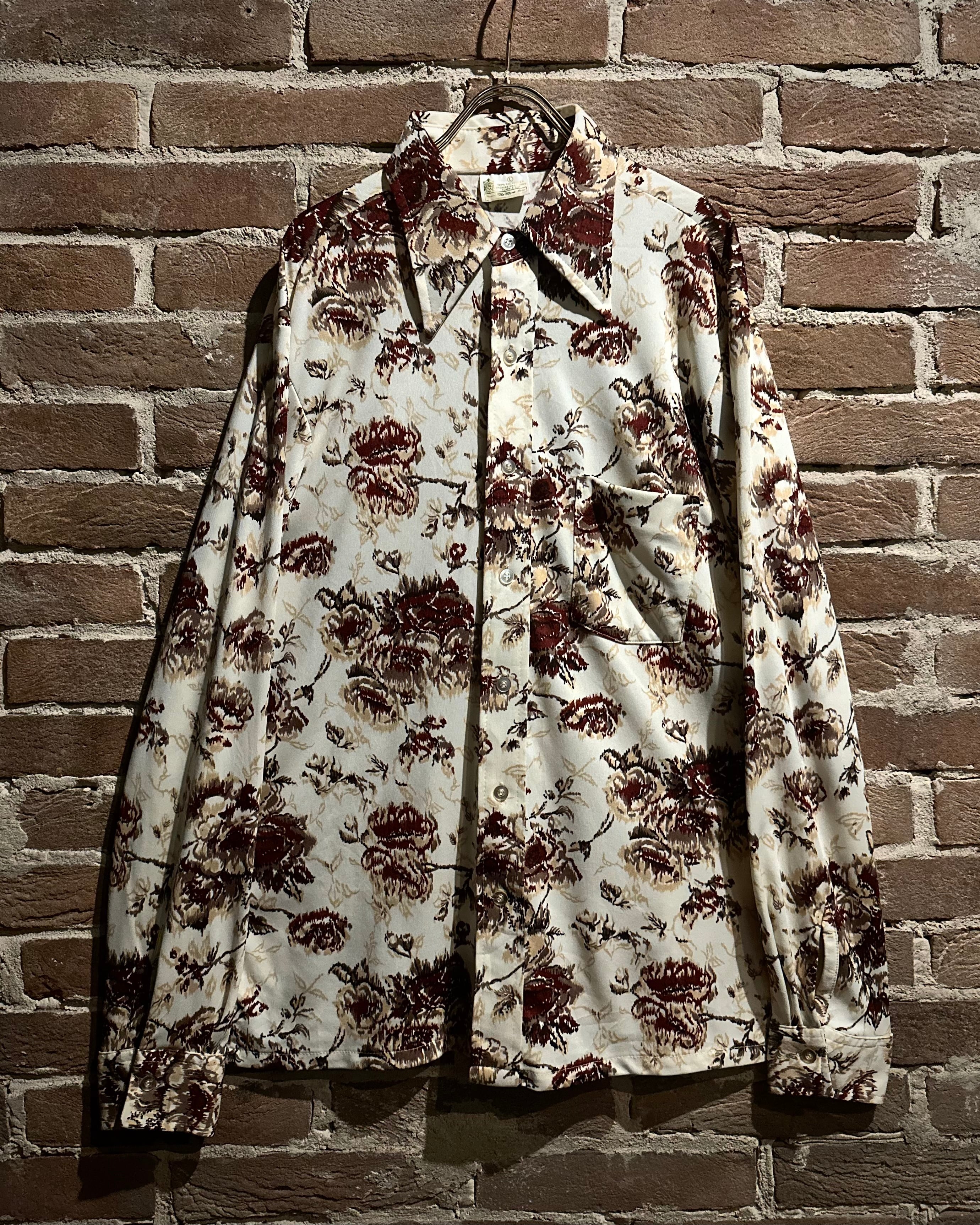 ベースには柔らかなベージュトーンを採用し、そこに深みのあるバーガンディとブラウンで描かれたフラワーモチーフが全面にあしらわれた70'sの長袖シャツ。
