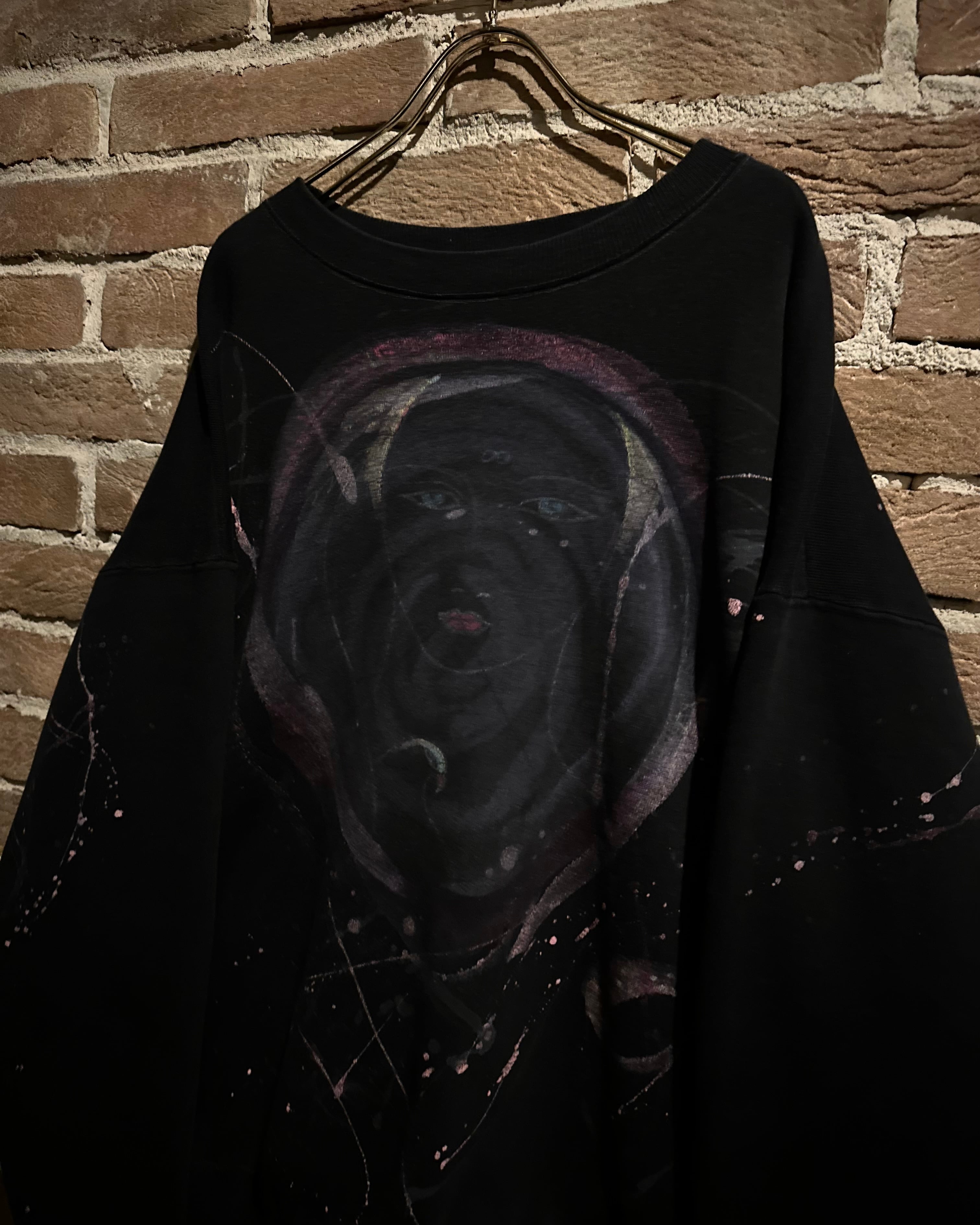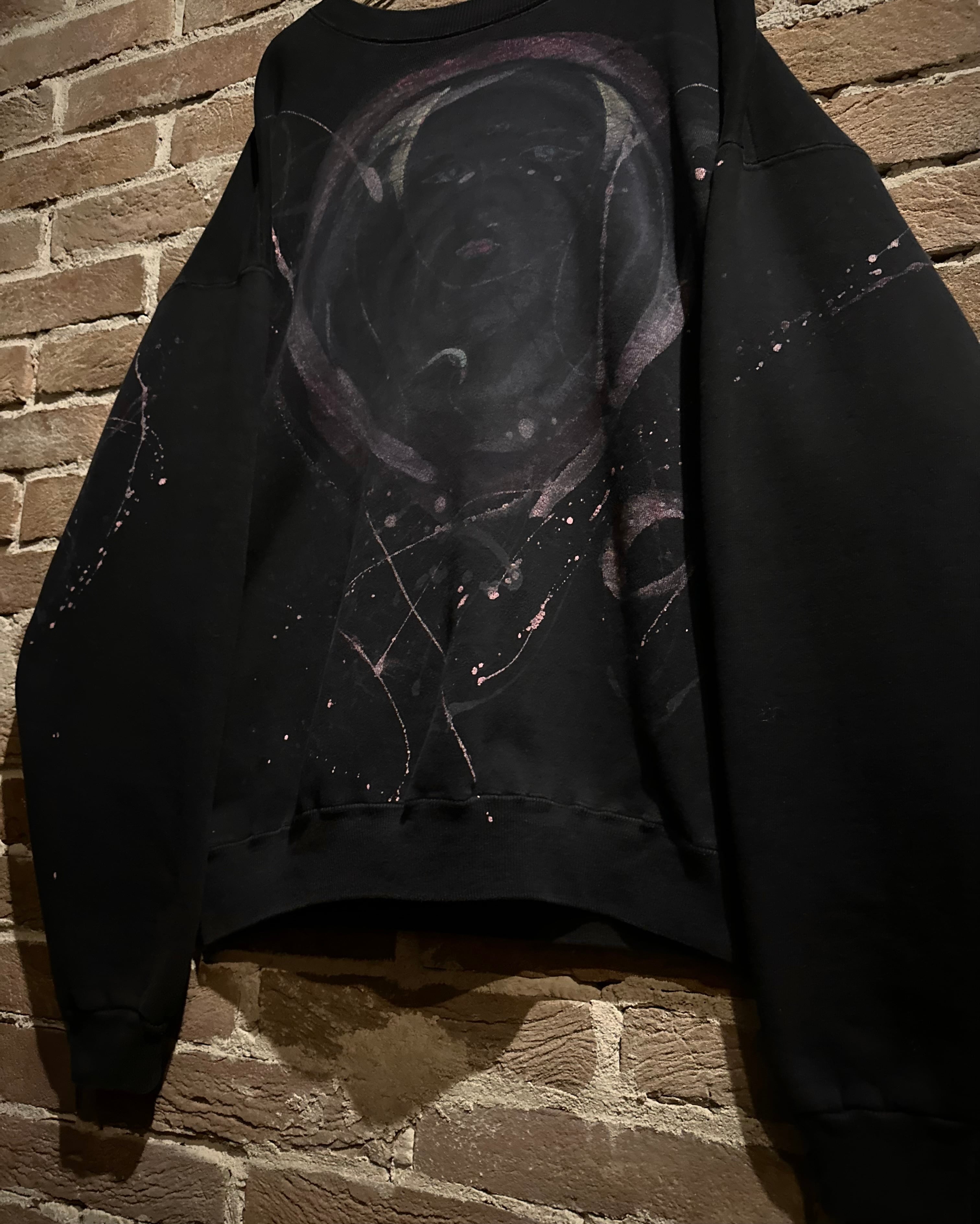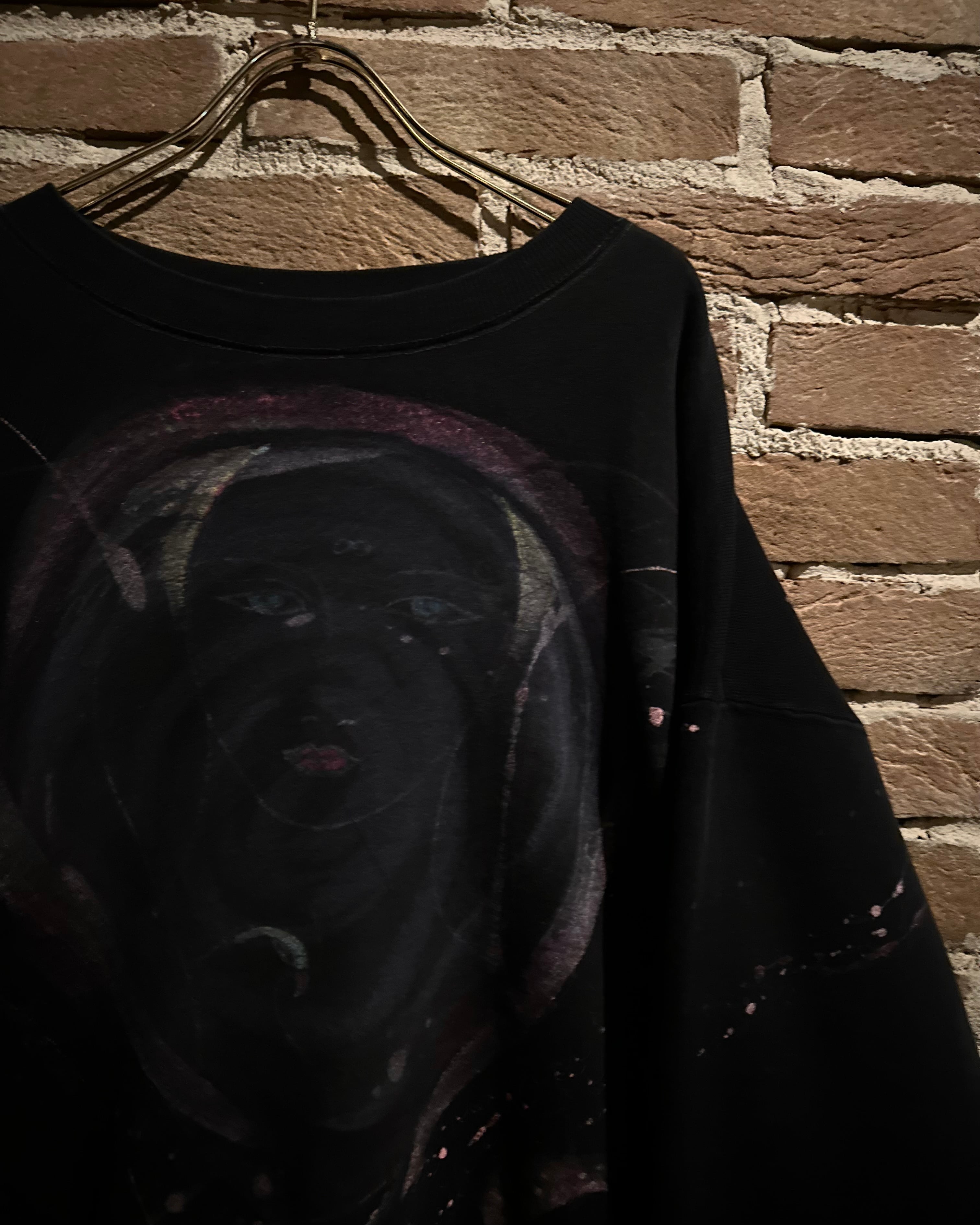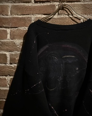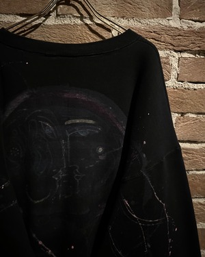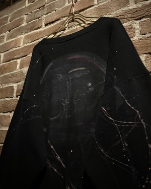 ブラックボディをベースに、フロントには抽象的かつ幻想的なフェイスモチーフをハンドペイントで載せたスペシャルなスウェット。