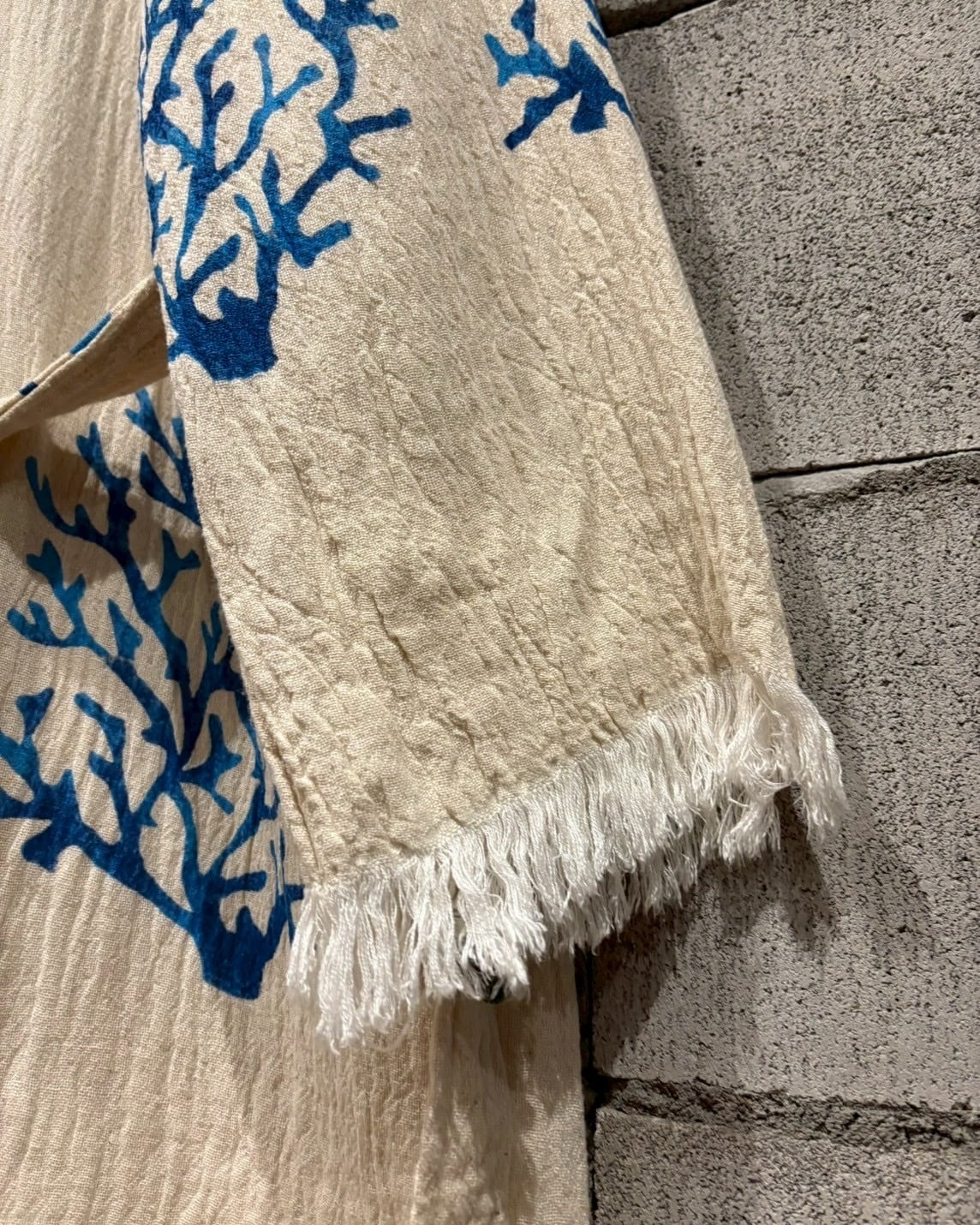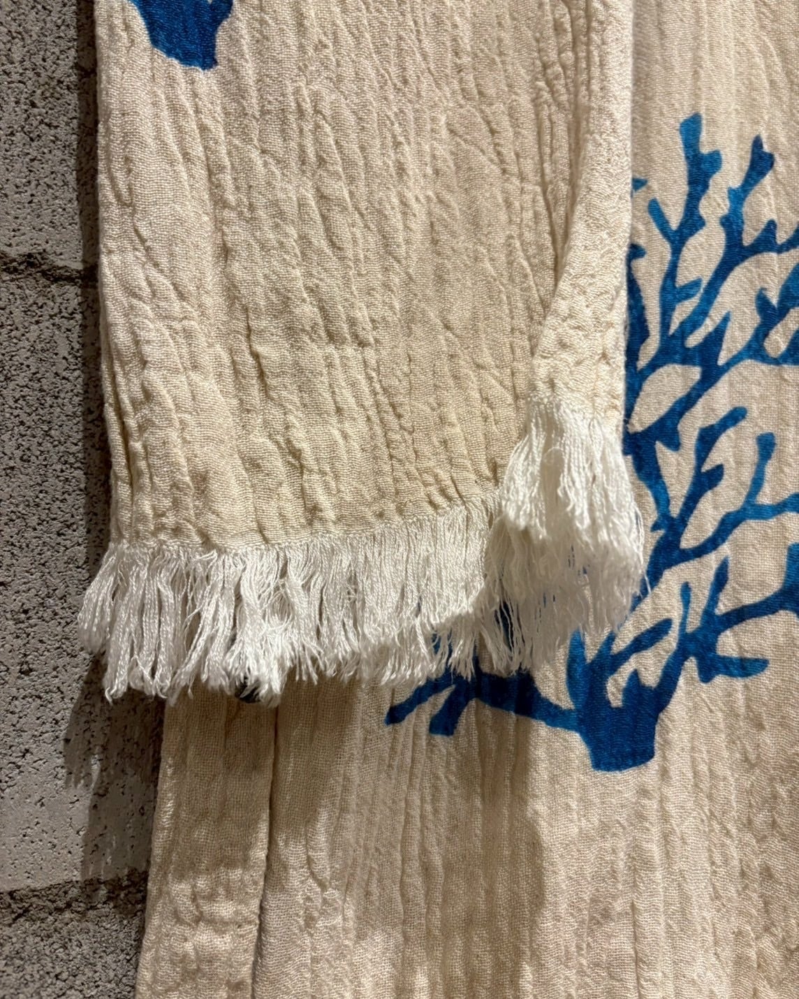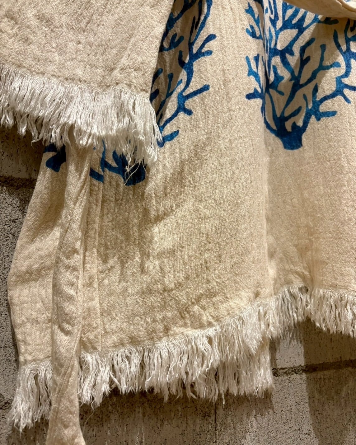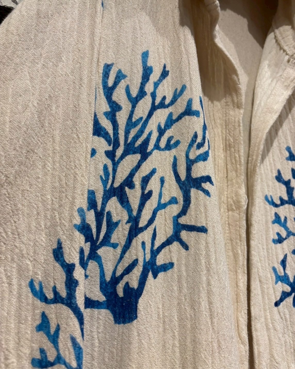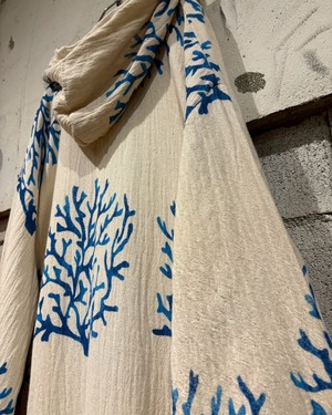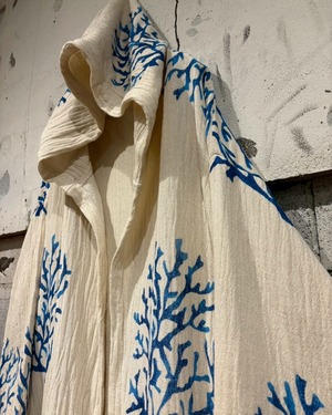 オフホワイトベースの薄手の生地に、鮮やかなブルーで描かれたツリー模様が全体に広がり、リラックス感とアートピースのようなムードを演出しています。