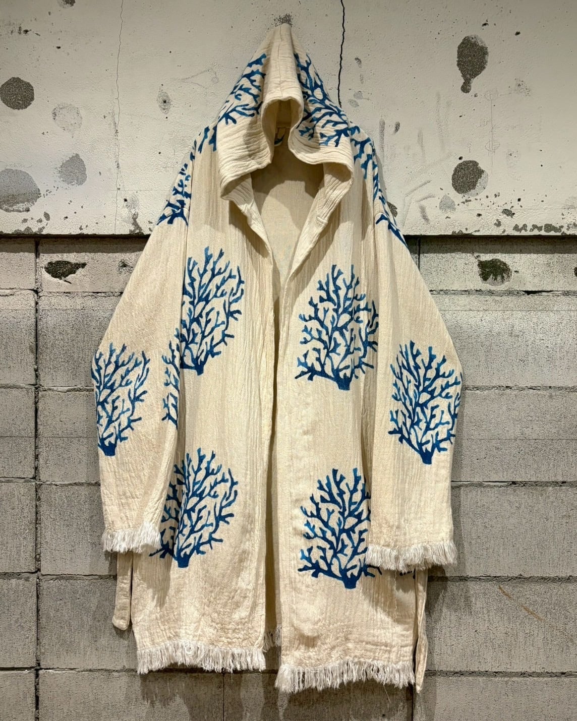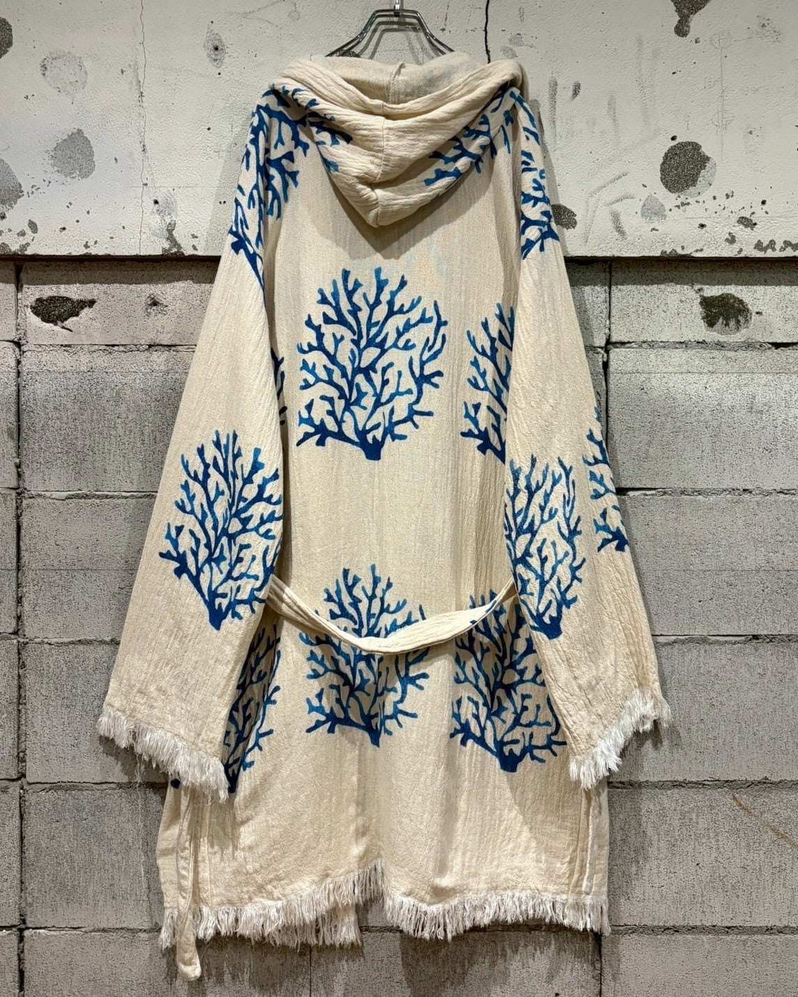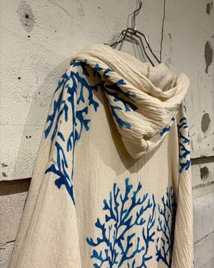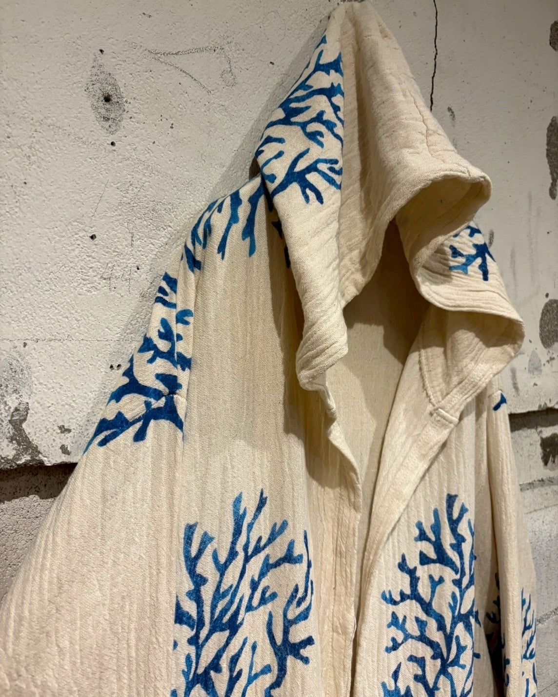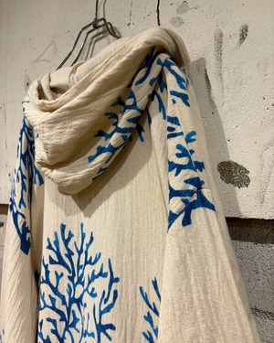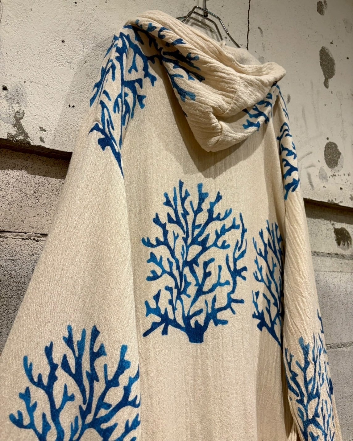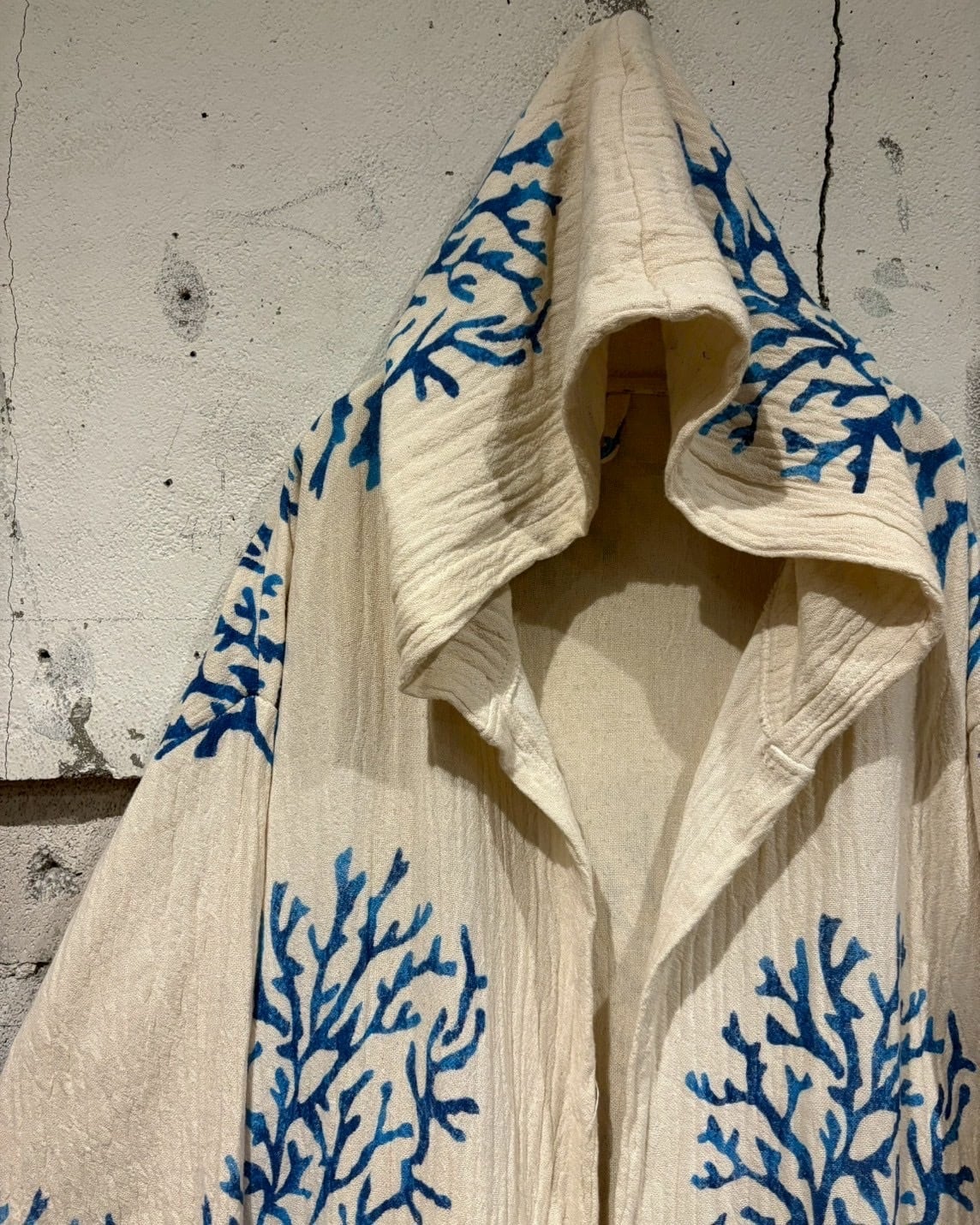 オフホワイトベースの薄手の生地に、鮮やかなブルーで描かれたツリー模様が全体に広がり、リラックス感とアートピースのようなムードを演出しています。