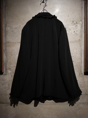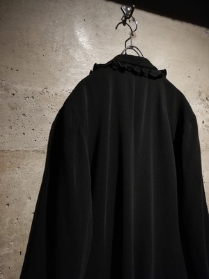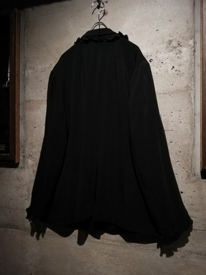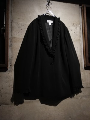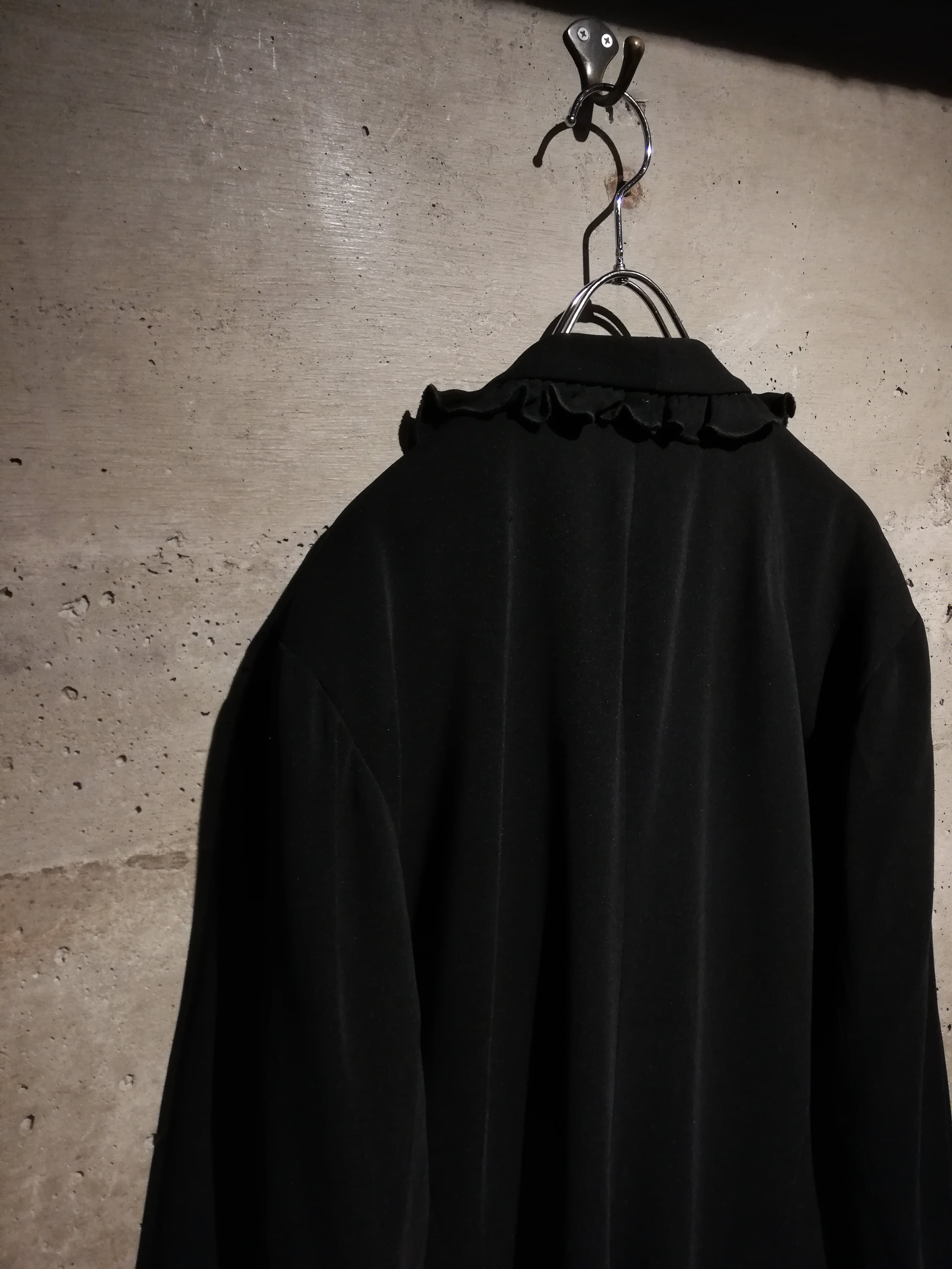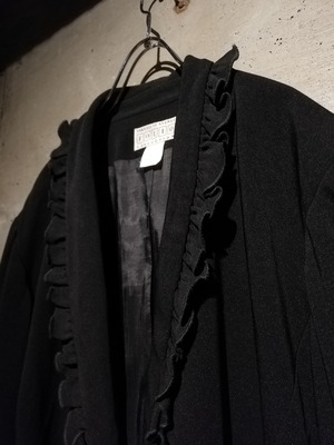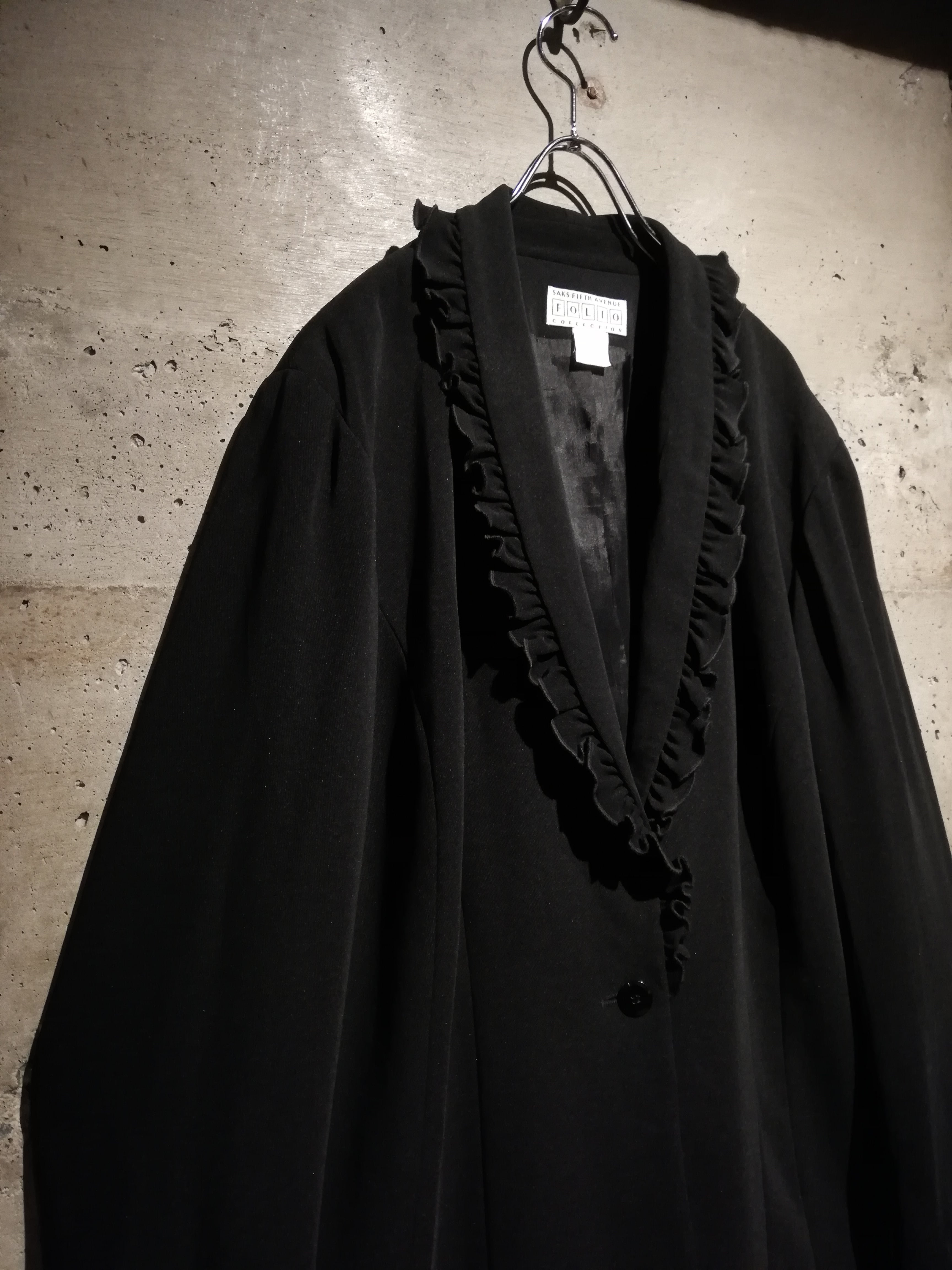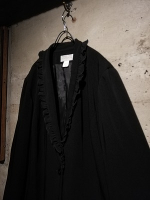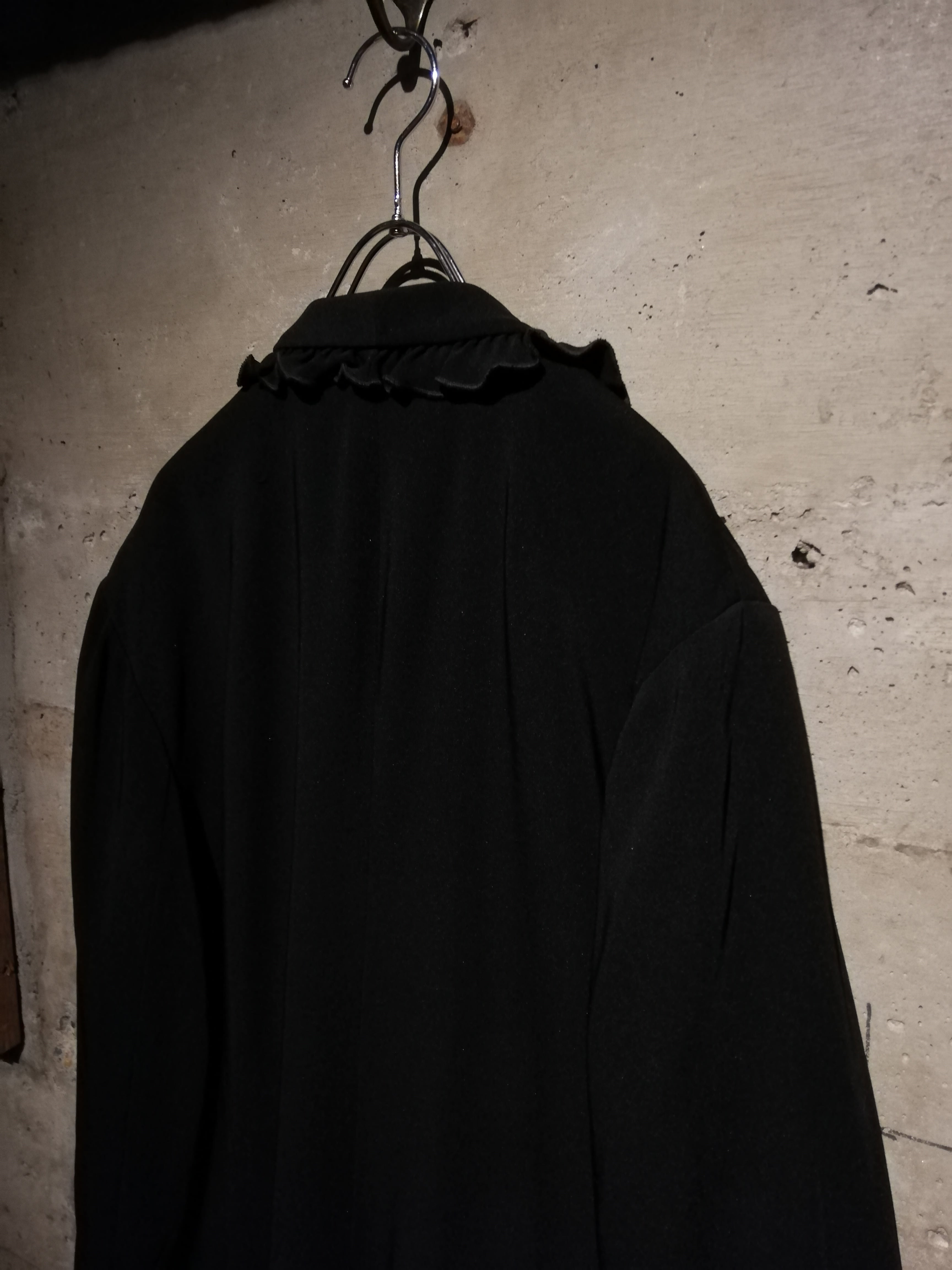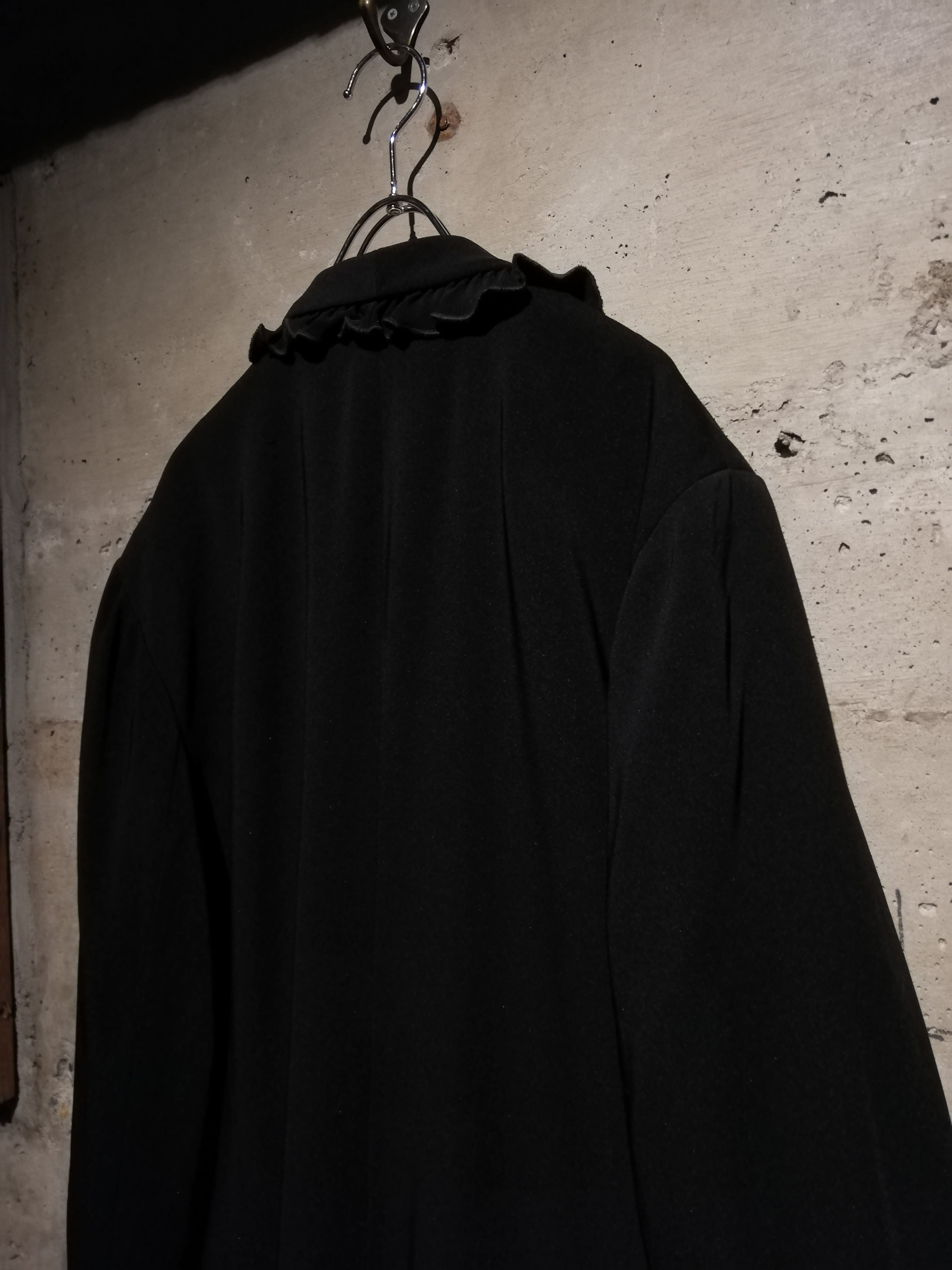 マットで落ち着いたブラックのボディに、ショールカラーの襟に施されたラッフルフリルが最大の特徴。フリルは襟元だけでなく袖口にまであしらわれ、動きに合わせて軽やかに揺れることで、クラシックなジャケットに独自のエレガントな存在感を与えています。