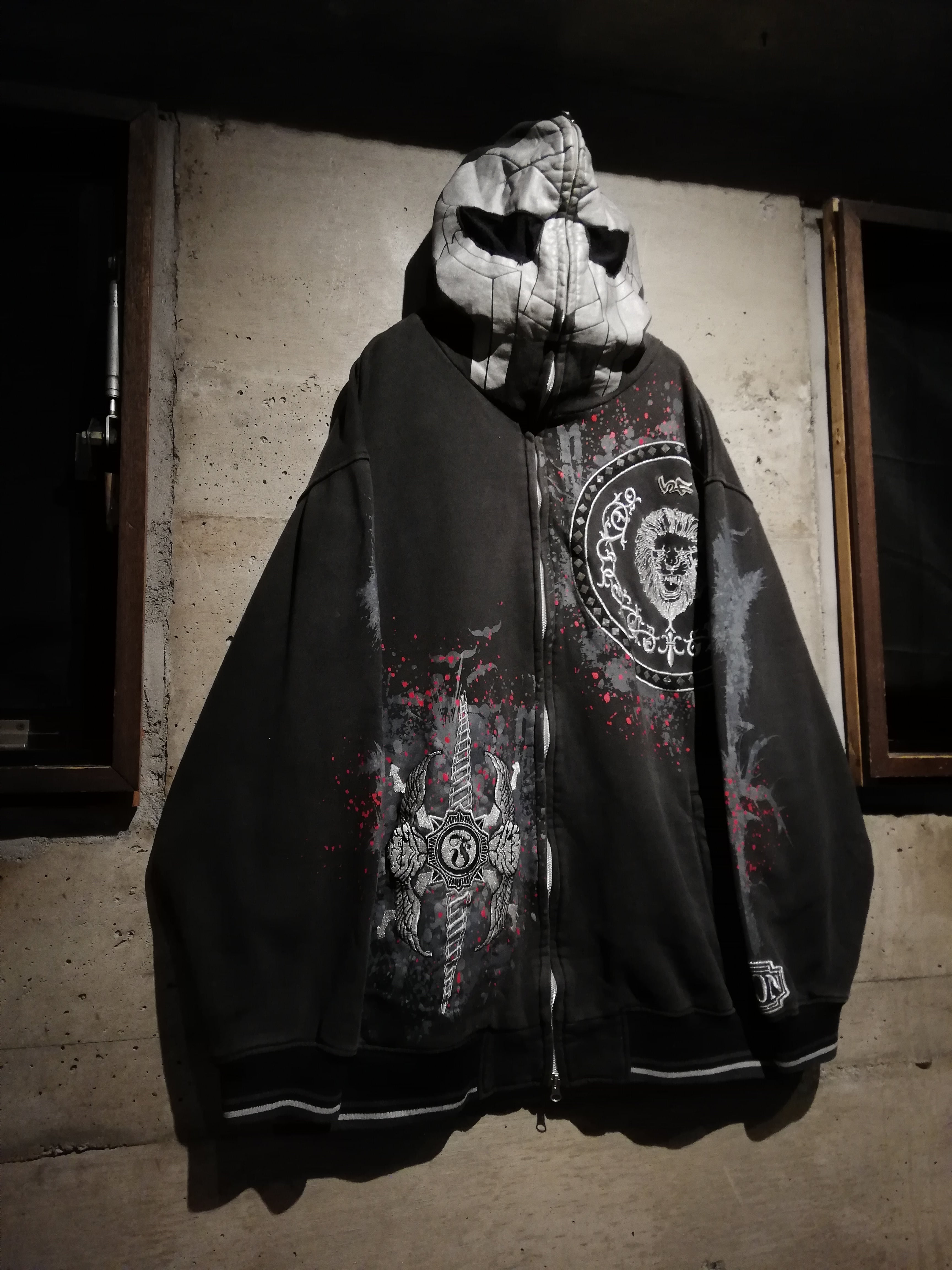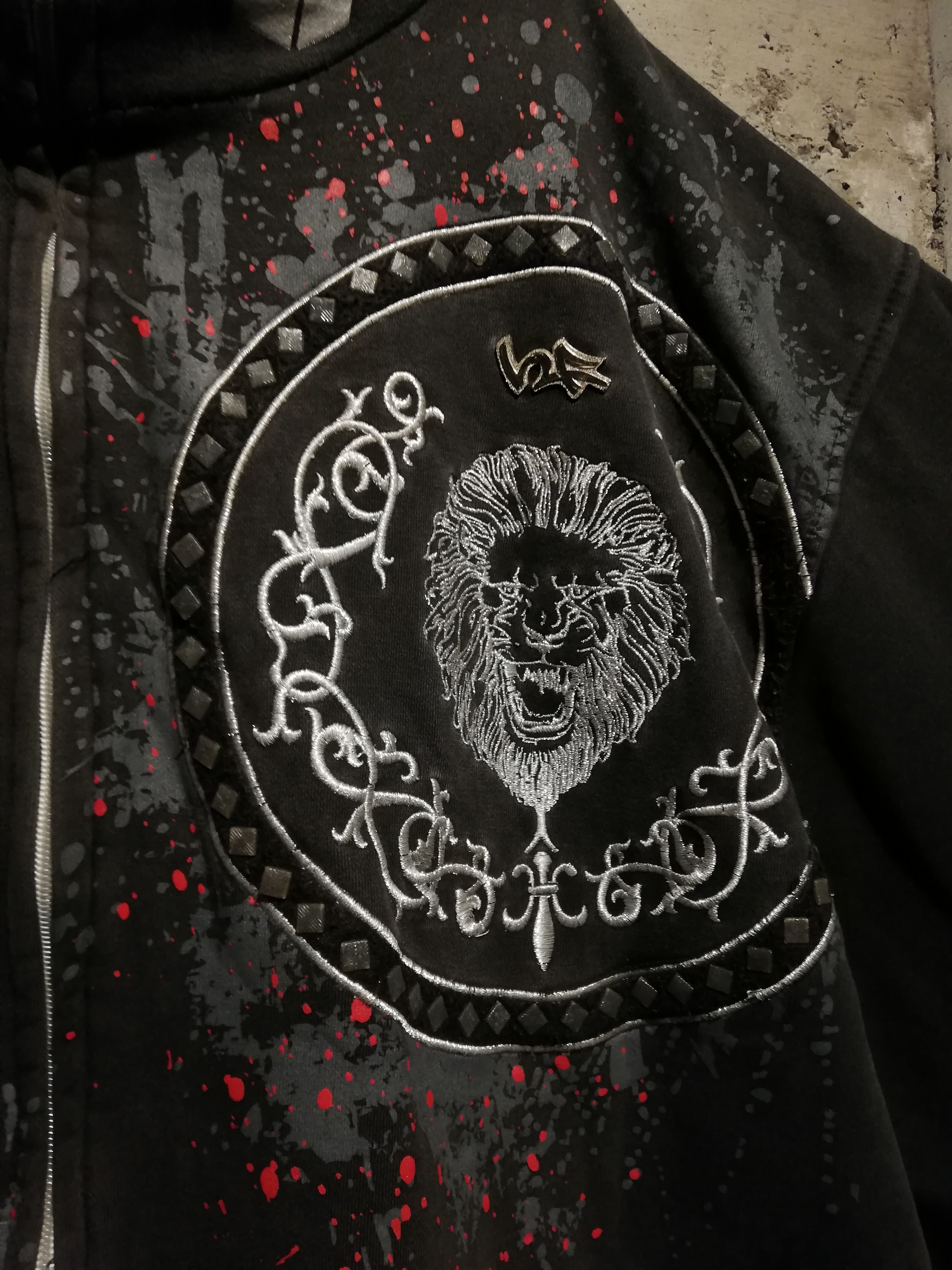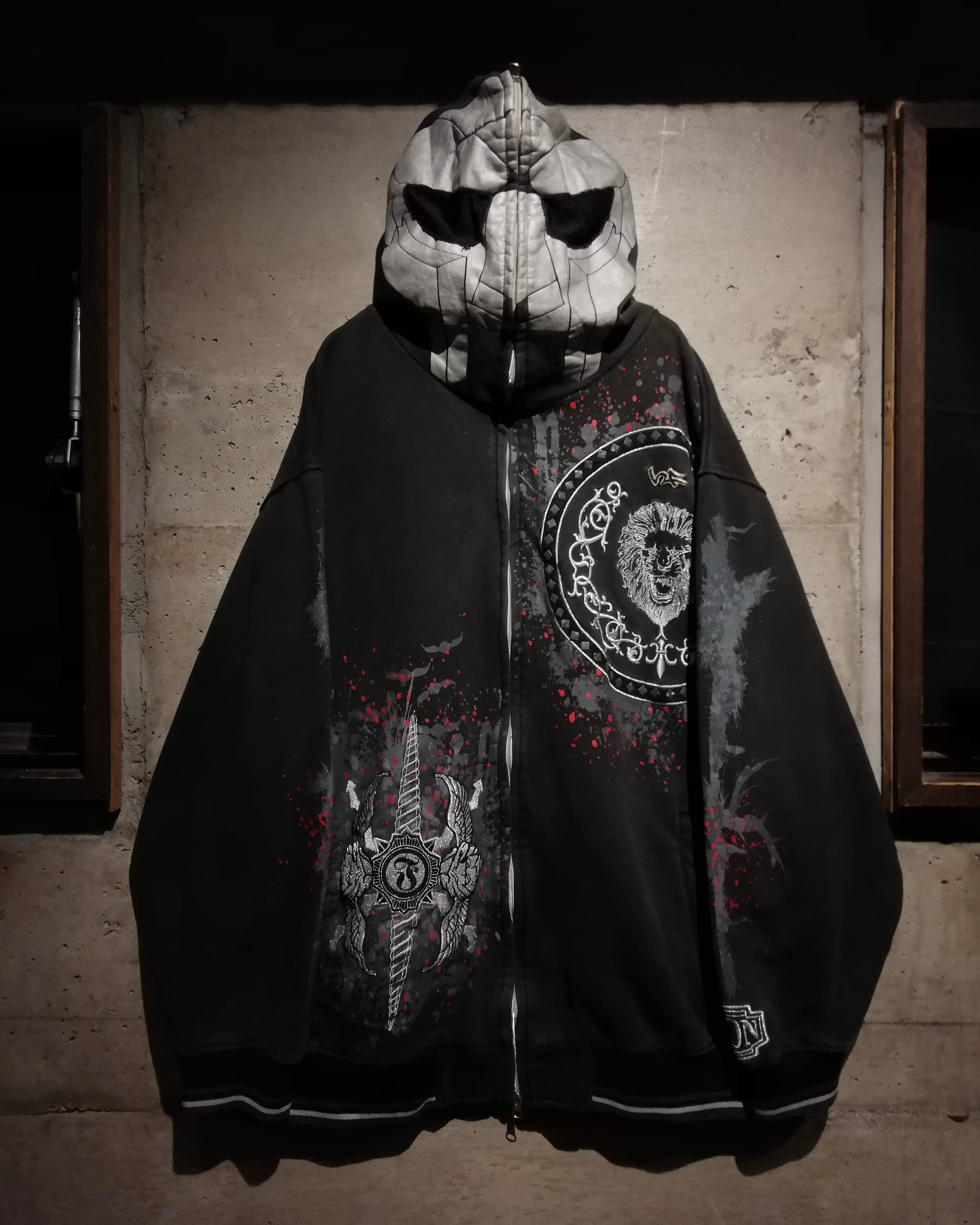 フロントには獅子をモチーフにしたサークルロゴやクロスソードのグラフィックを、刺繍やラメ入りのプリントで配置し、赤のスプラッターデザインを重ねることで、ダークで攻撃的な世界観を表現した1着。