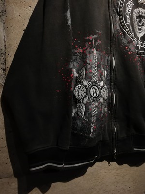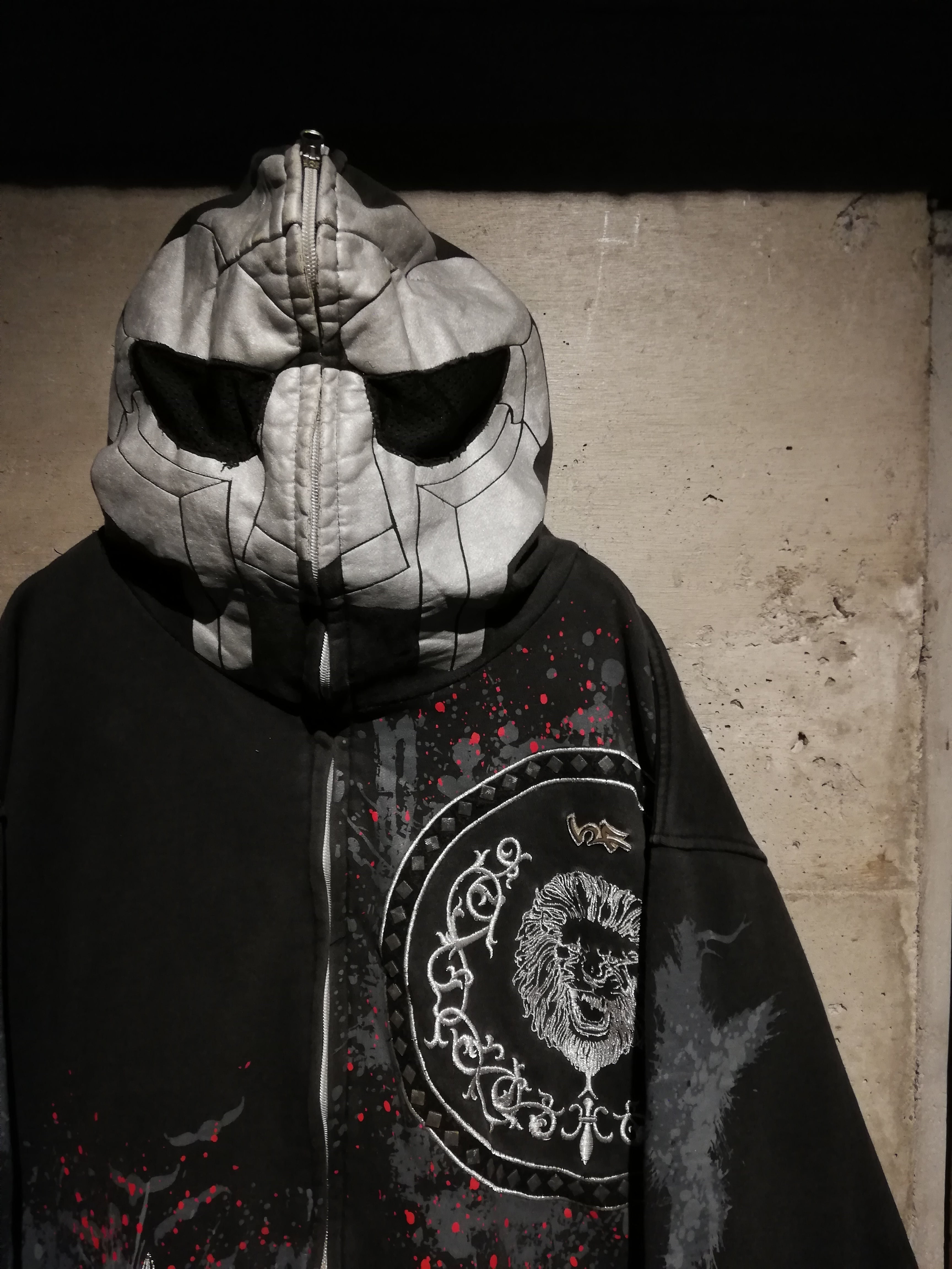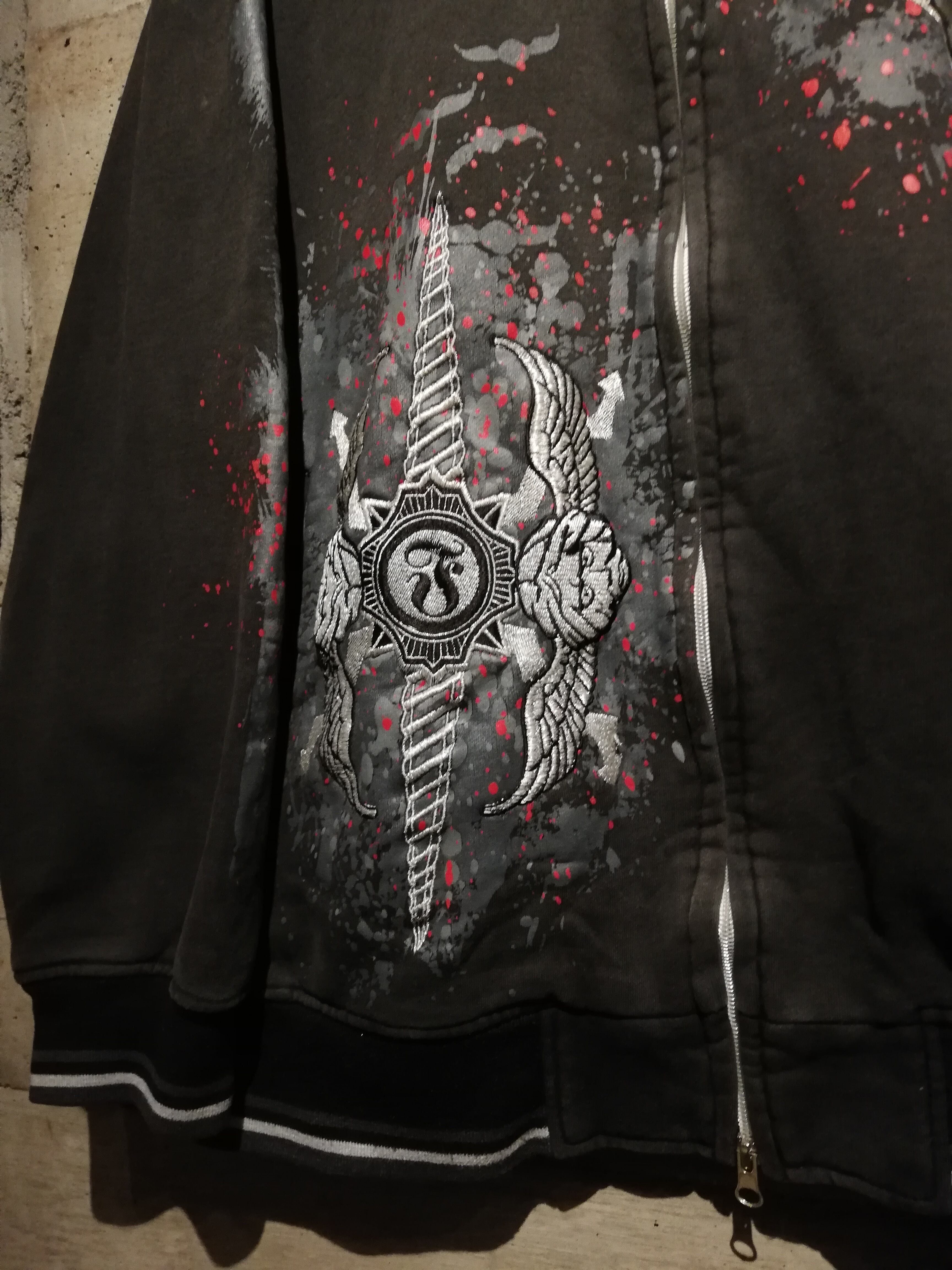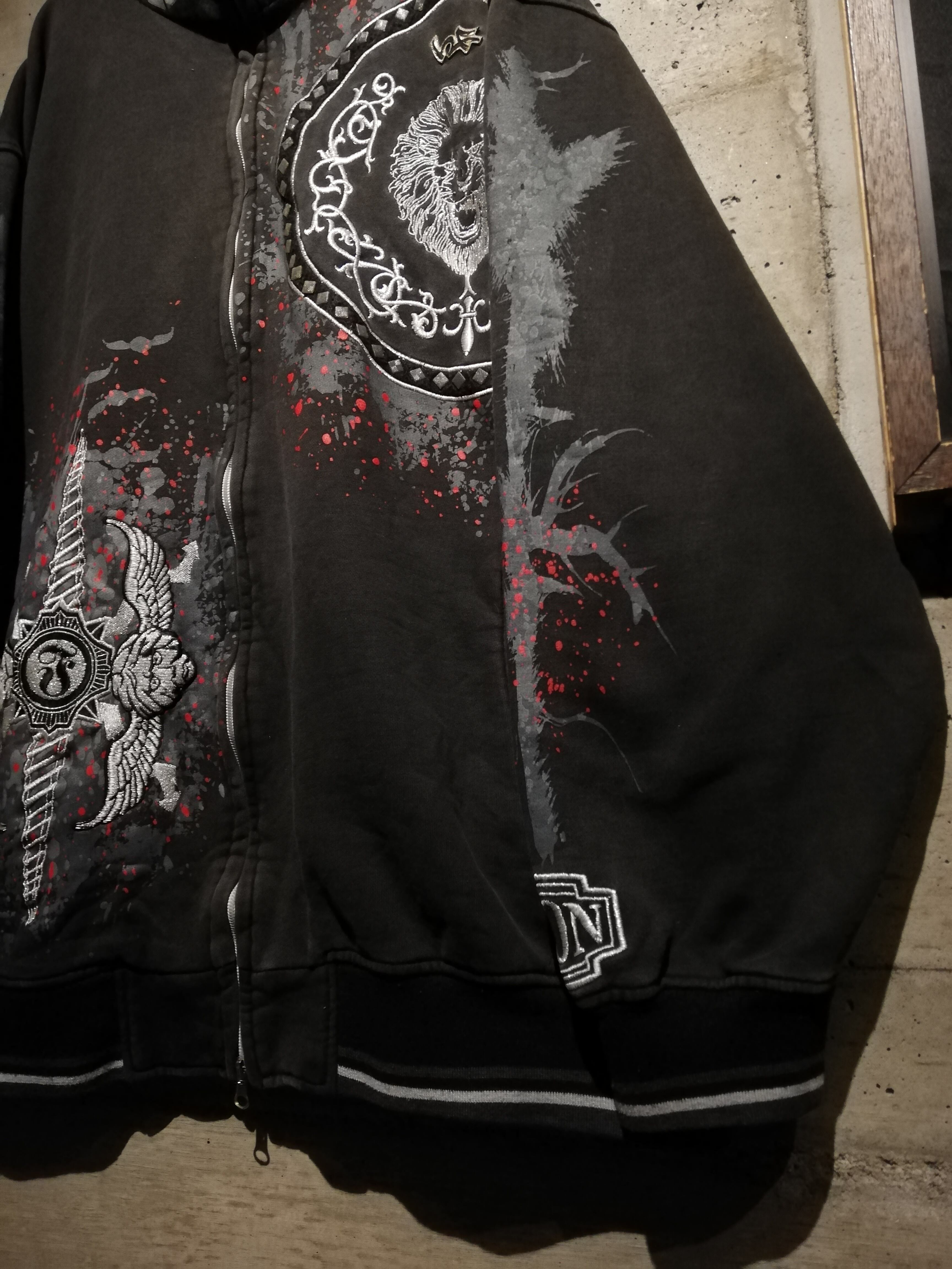 フロントには獅子をモチーフにしたサークルロゴやクロスソードのグラフィックを、刺繍やラメ入りのプリントで配置し、赤のスプラッターデザインを重ねることで、ダークで攻撃的な世界観を表現した1着。