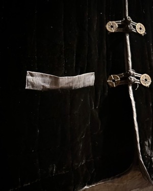 深みのあるブラックベロアをキルティングに仕立てることで、柔らかさと艶感に加え、立体的で奥行きのある表情を実現。光の加減で浮かぶ陰影がラグジュアリーな雰囲気を高めています。フロントには古銭風のボタンを配し、装飾性をさらに強調。