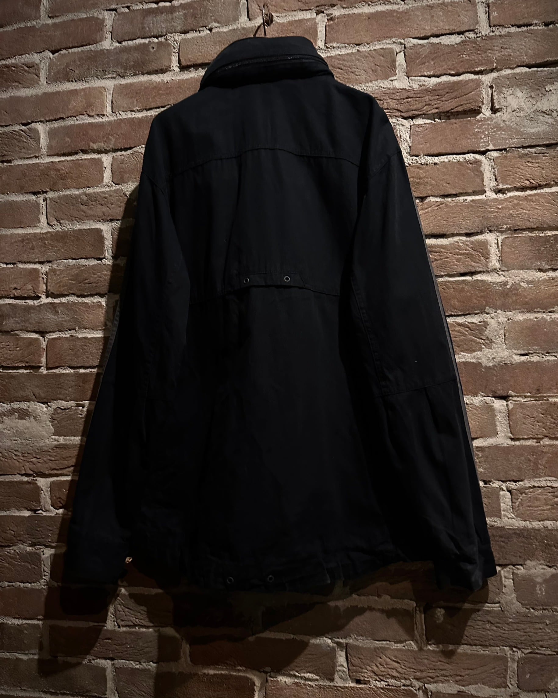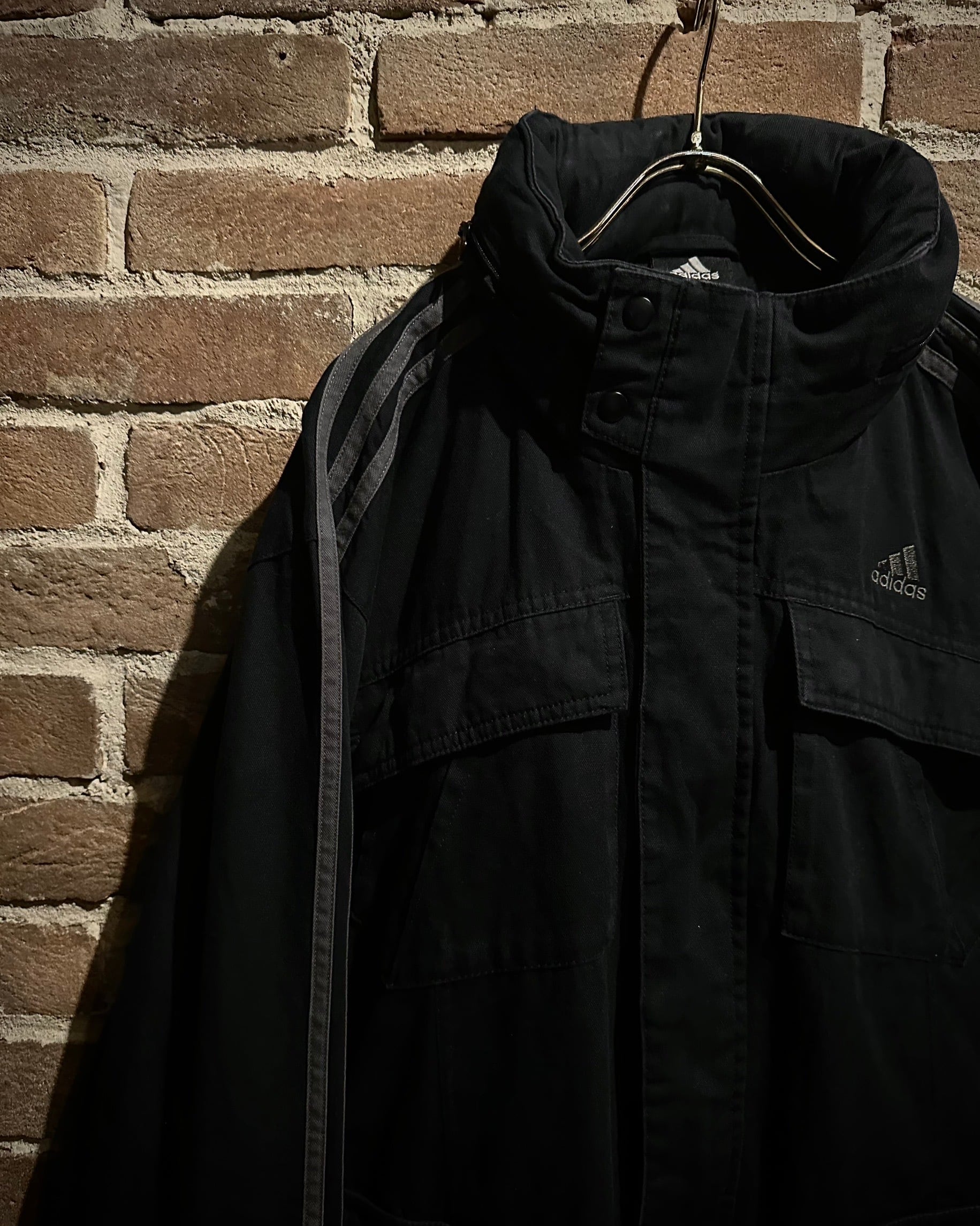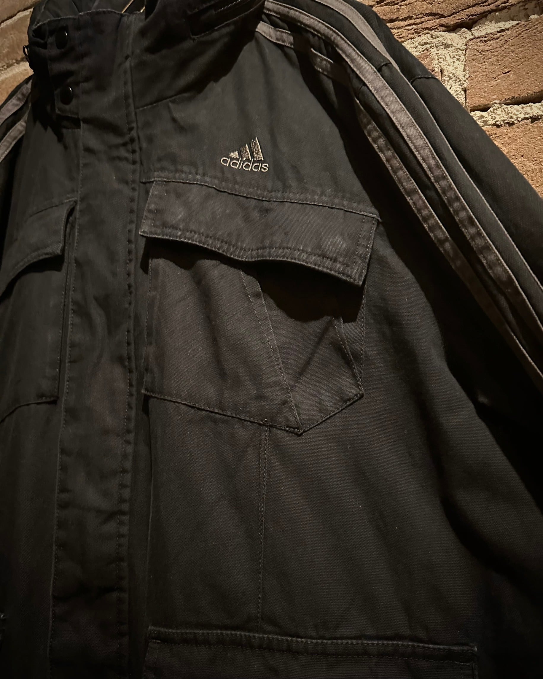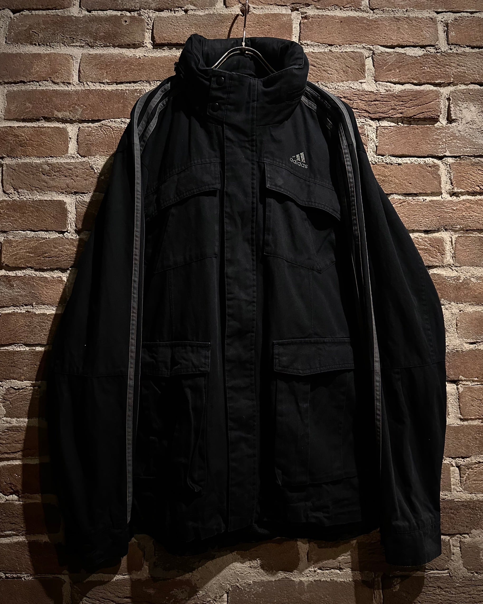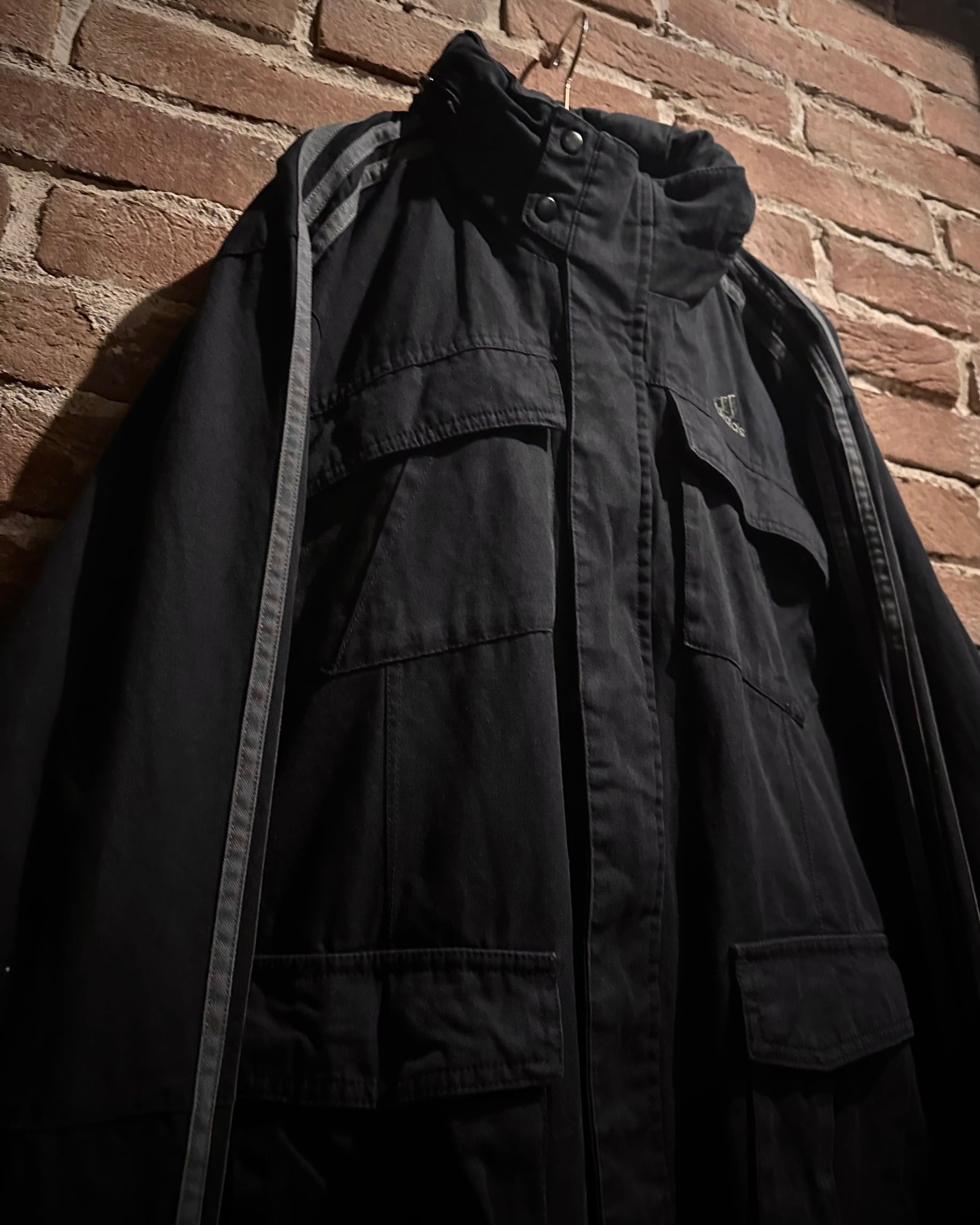 フロントにはミリタリー由来の大ぶりなフラップポケットを4つ搭載。視覚的にも機能的にもアクセントとなり、収納力とデザイン性を兼備しています。両アームにはブランドの象徴である3ストライプスを配し、アクションプリーツを組み合わせることで、ルーズなサイジングながらも機動性を確保。