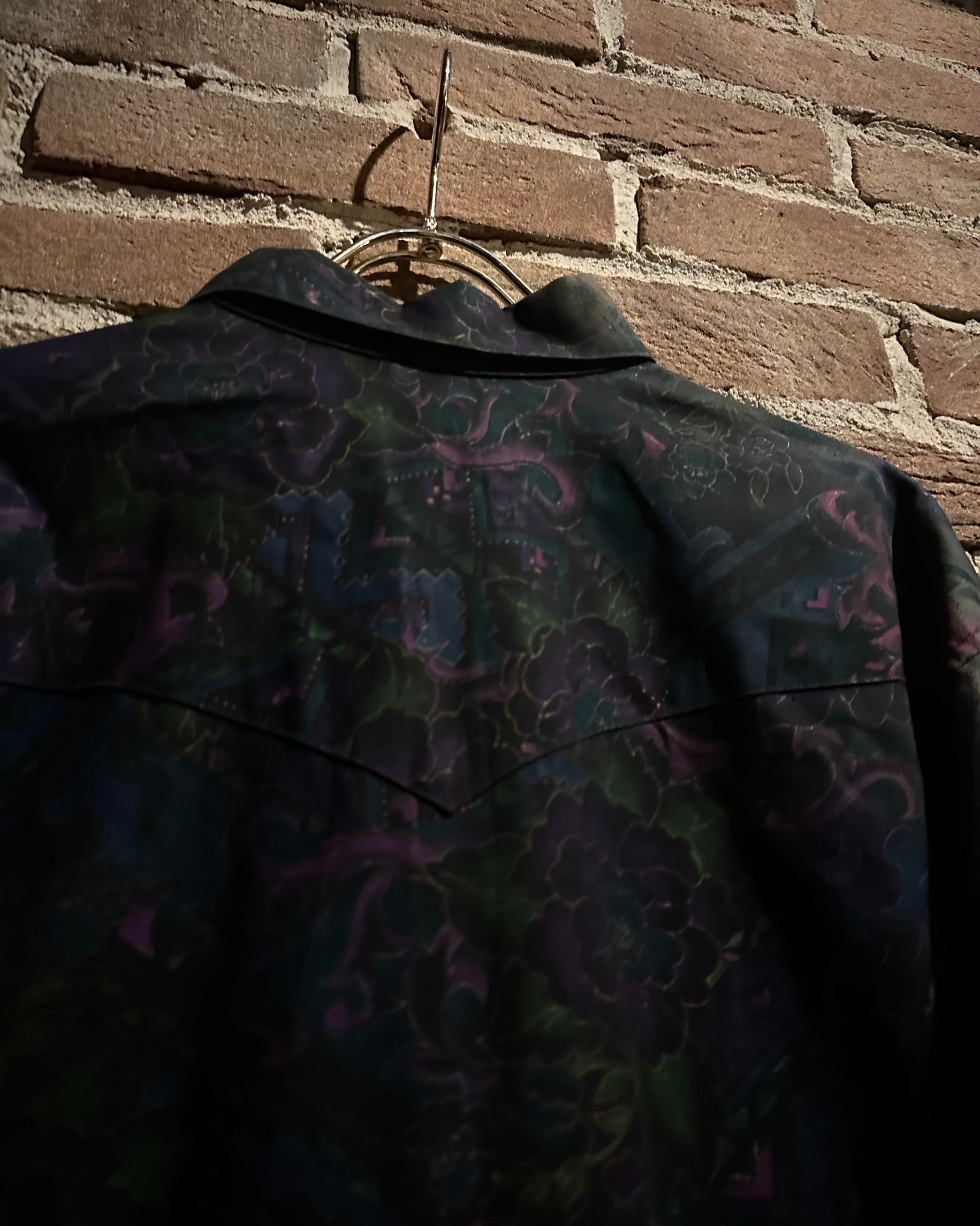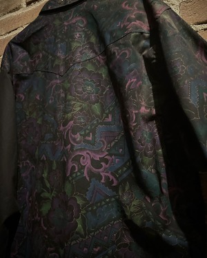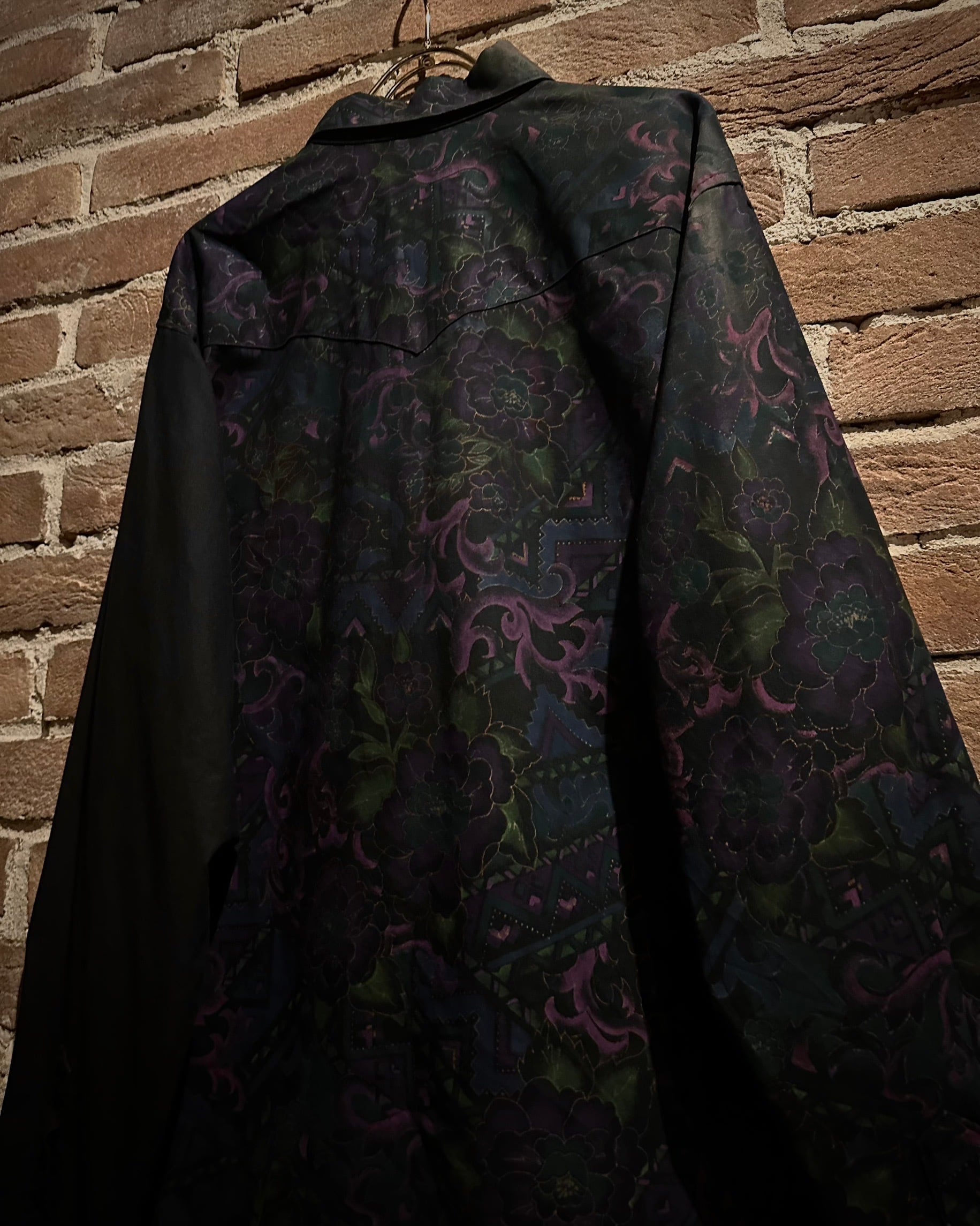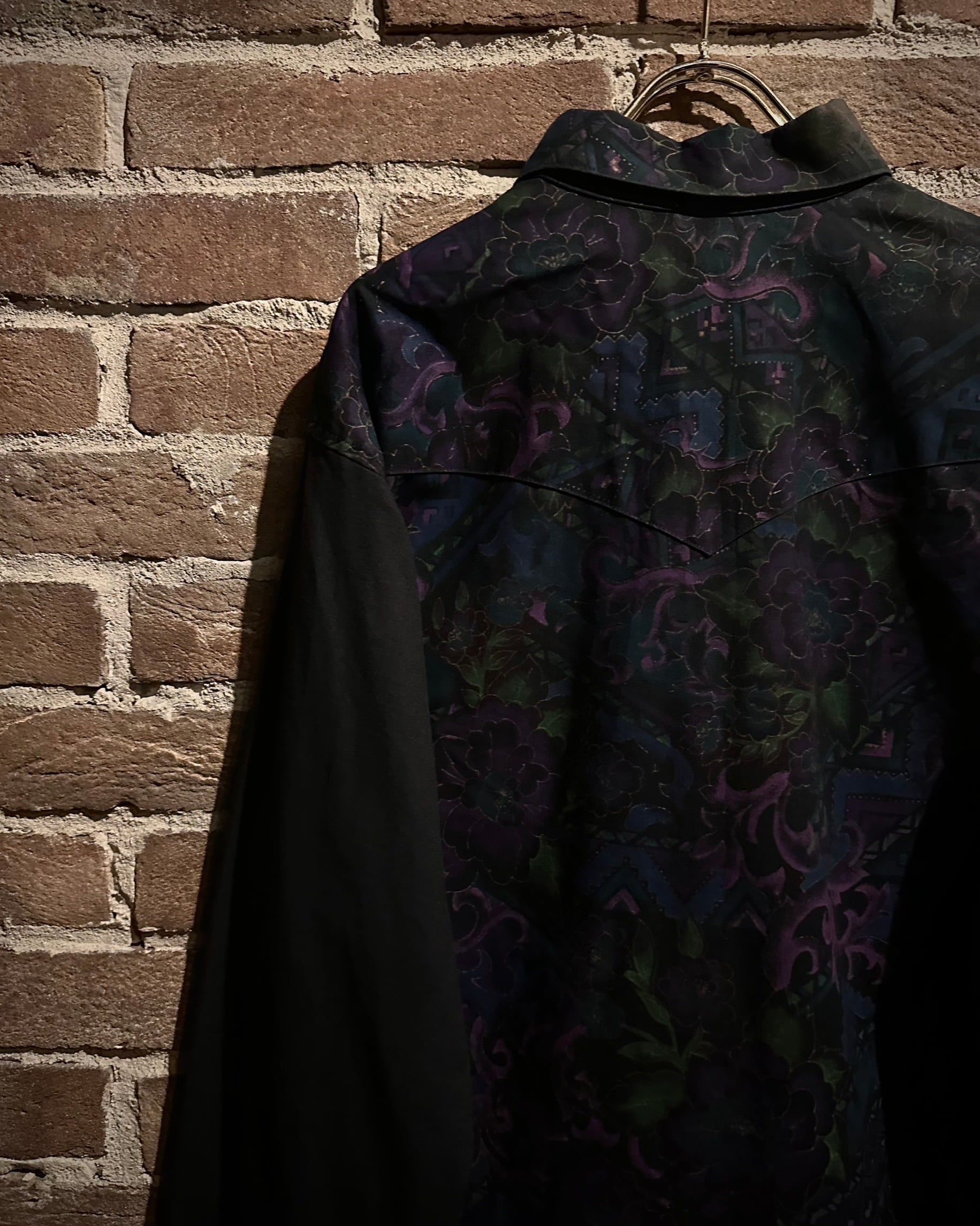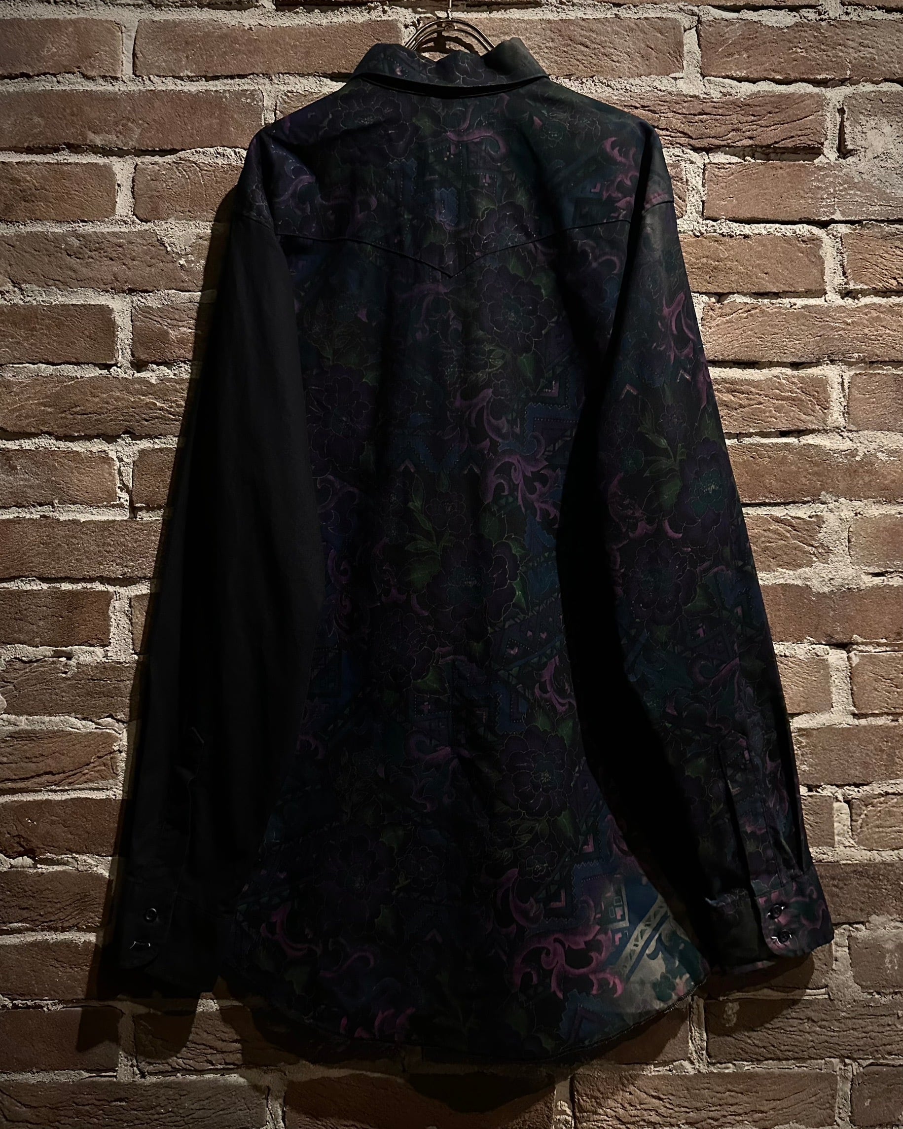 フロントにはフラップ付きのダブルポケット、バックはヨーク切り替えを境に全面に柄を施し、前後で印象が大きく変わる大胆な構成。ウエスタンのDNAが巧みに息づいています。
