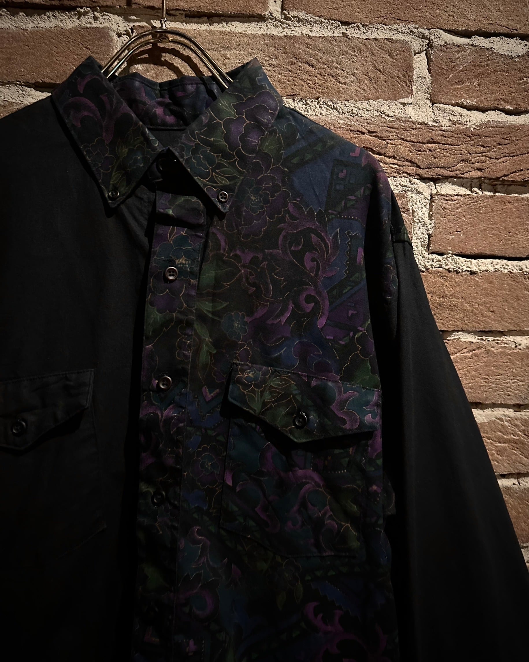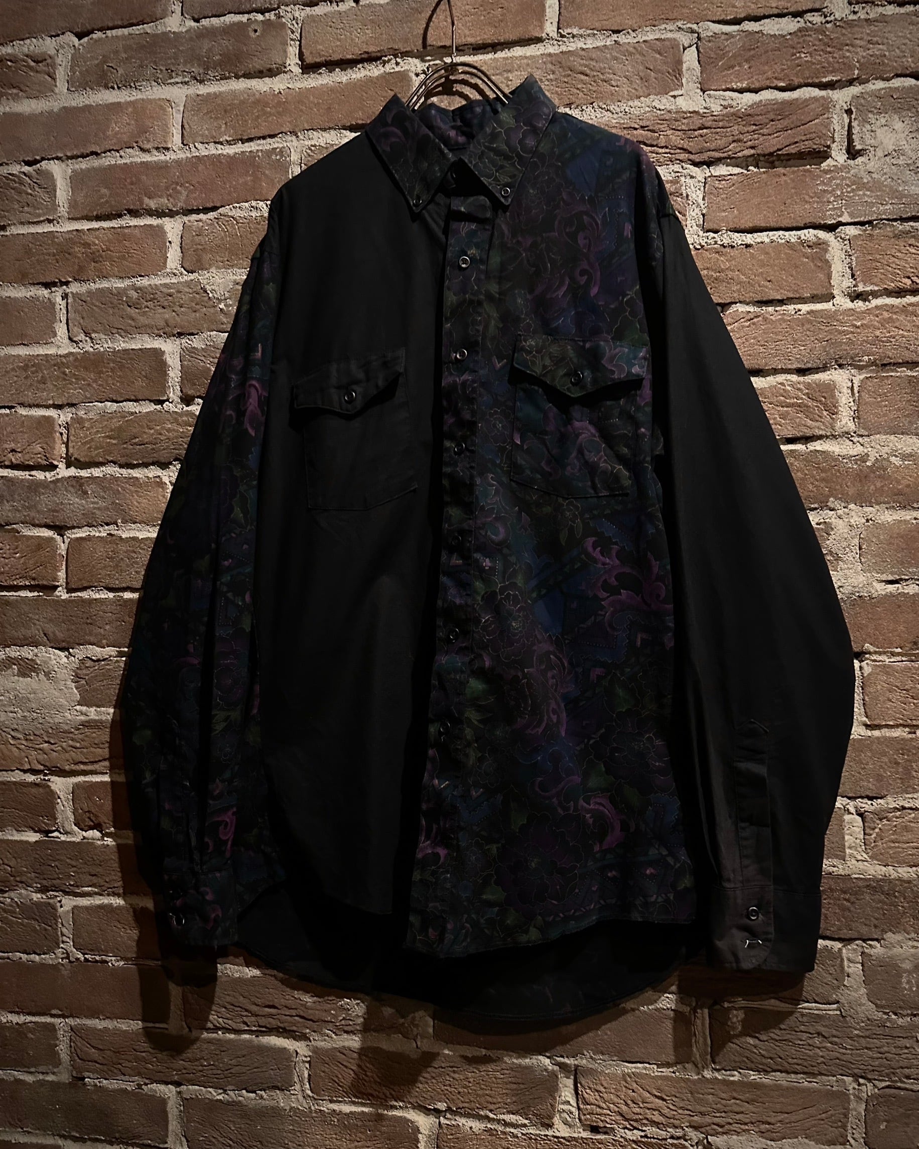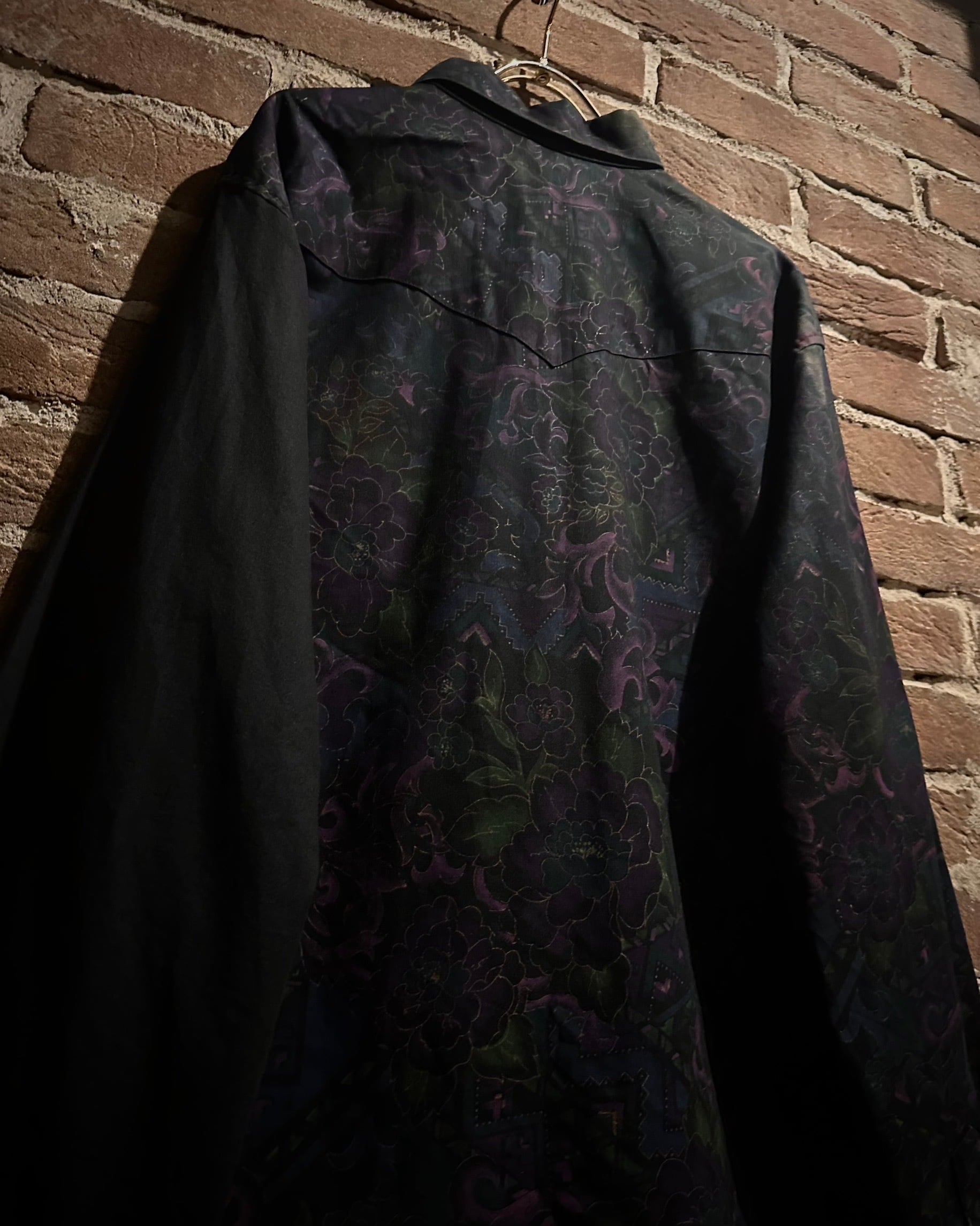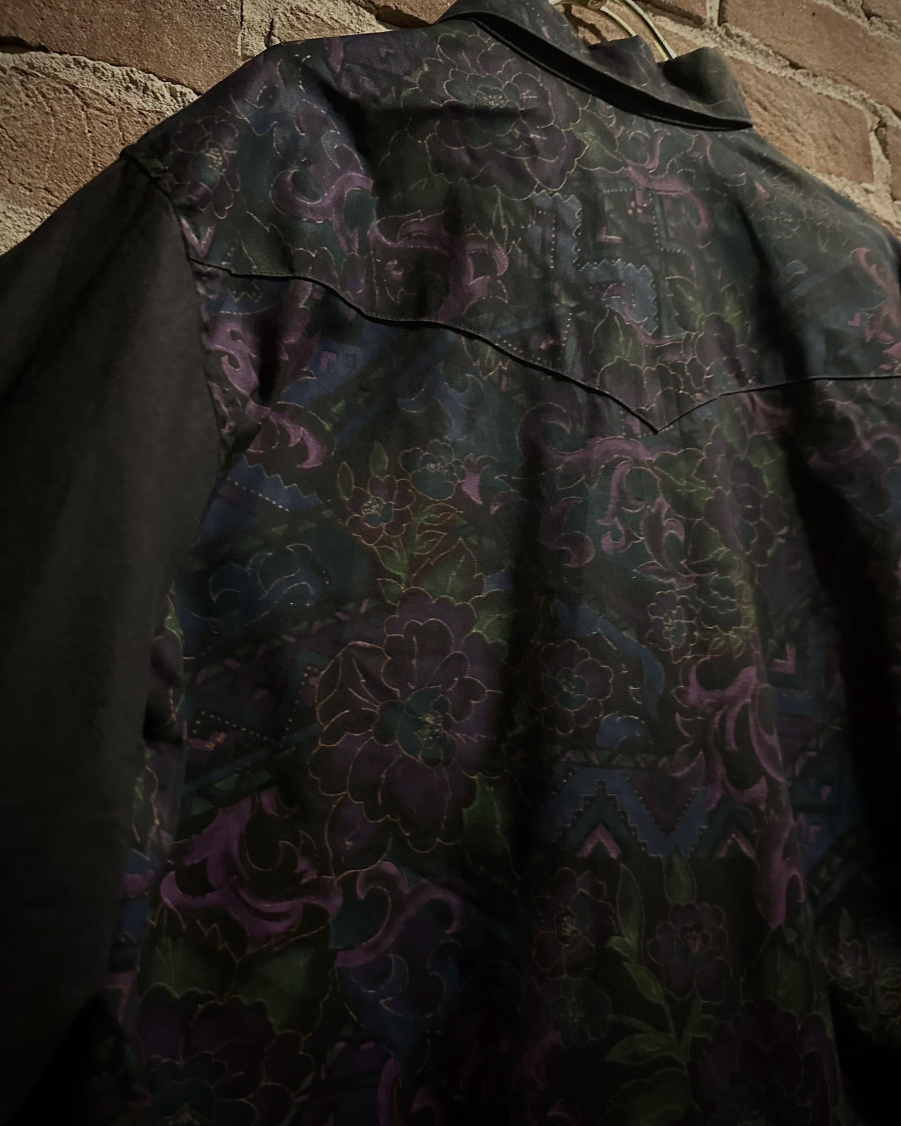 フロントにはフラップ付きのダブルポケット、バックはヨーク切り替えを境に全面に柄を施し、前後で印象が大きく変わる大胆な構成。ウエスタンのDNAが巧みに息づいています。