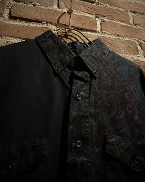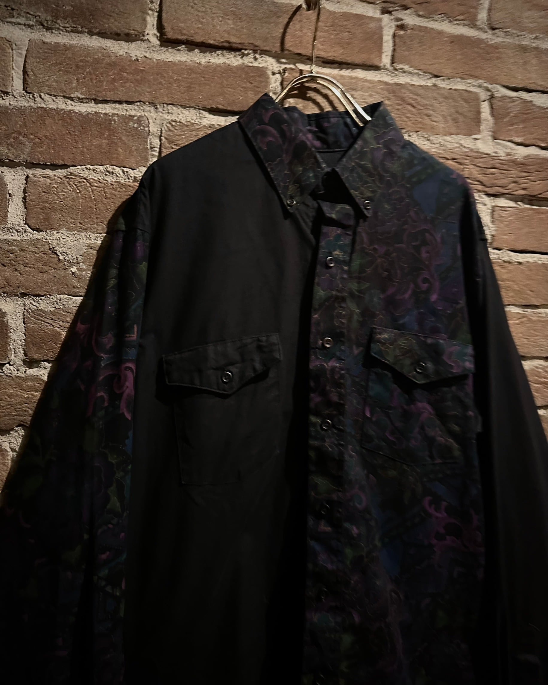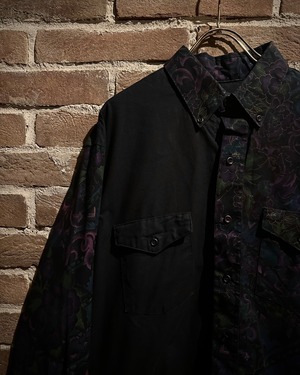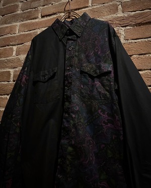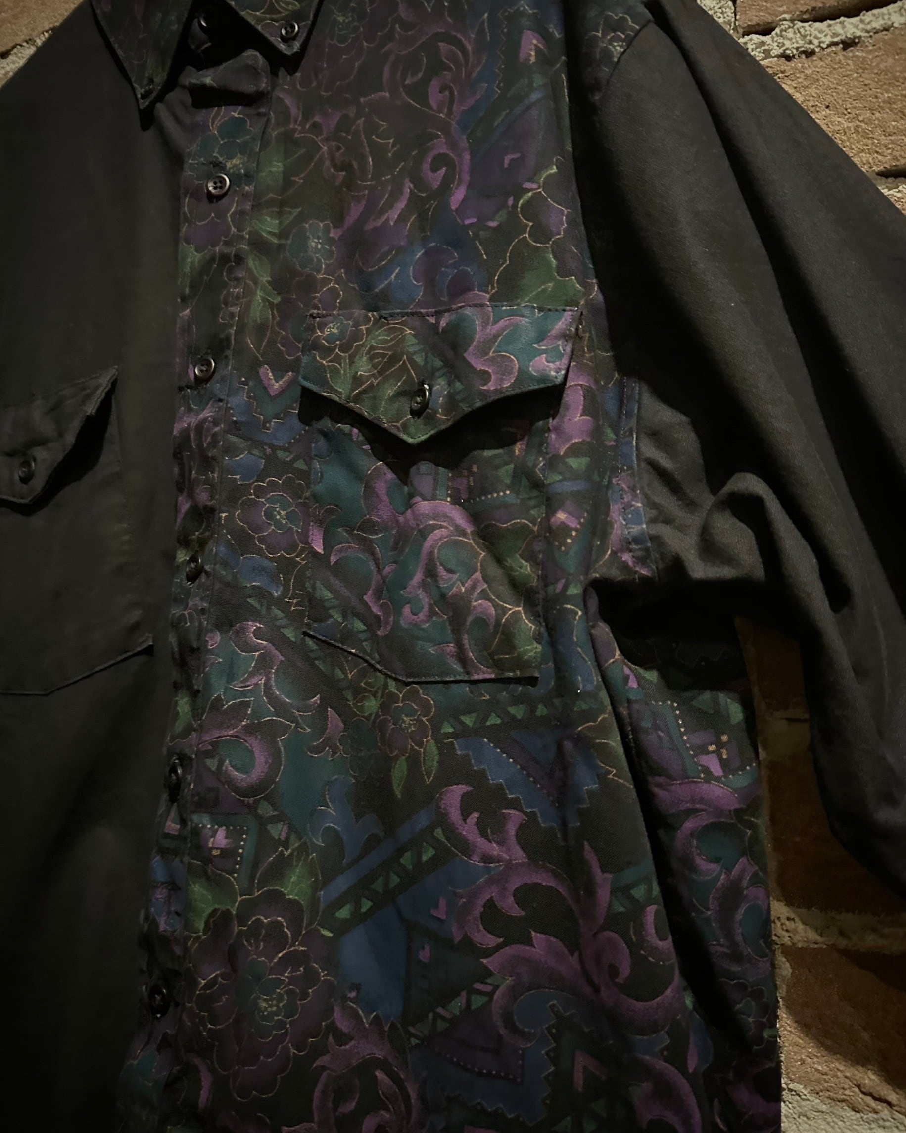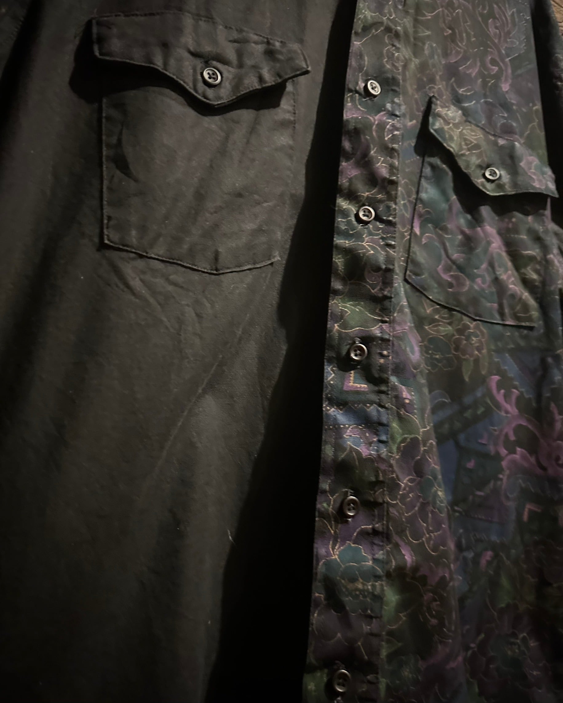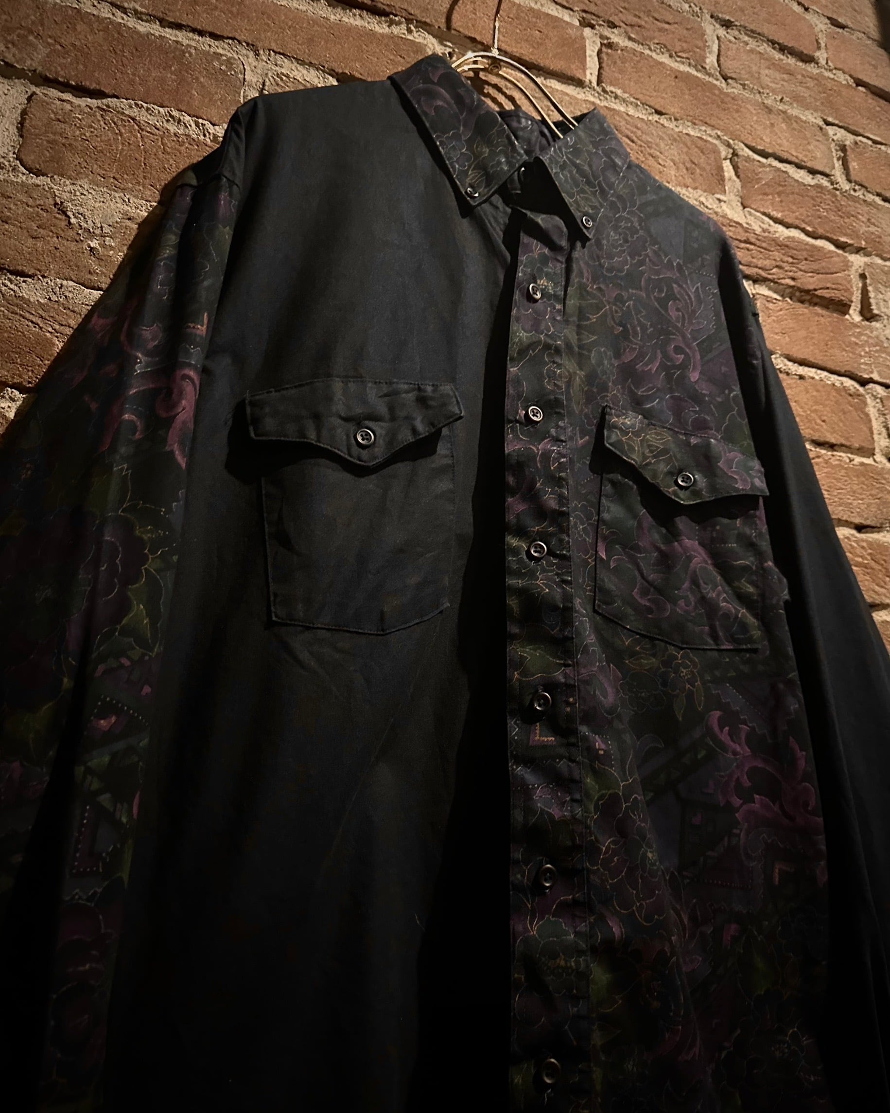 フロントにはフラップ付きのダブルポケット、バックはヨーク切り替えを境に全面に柄を施し、前後で印象が大きく変わる大胆な構成。ウエスタンのDNAが巧みに息づいています。
