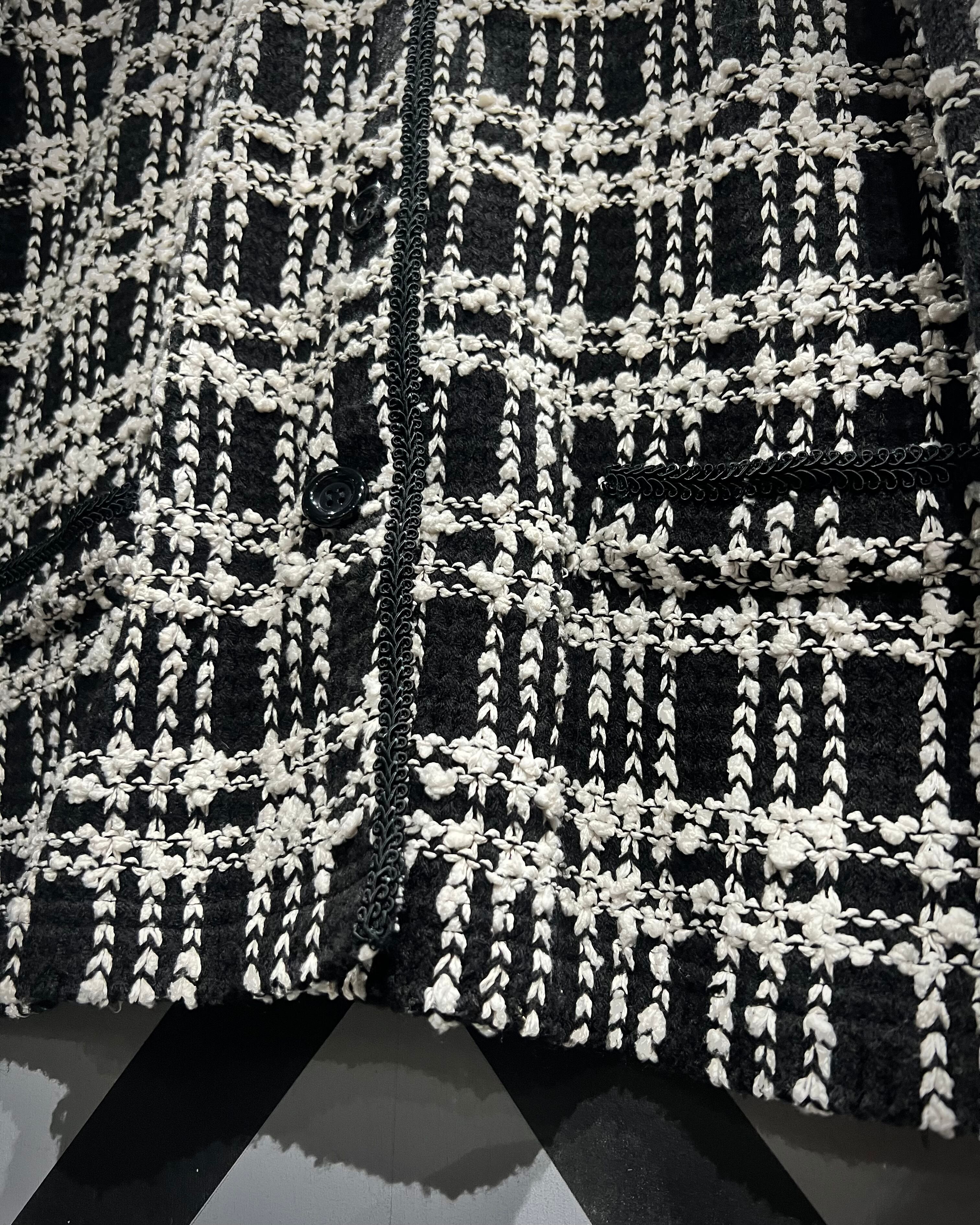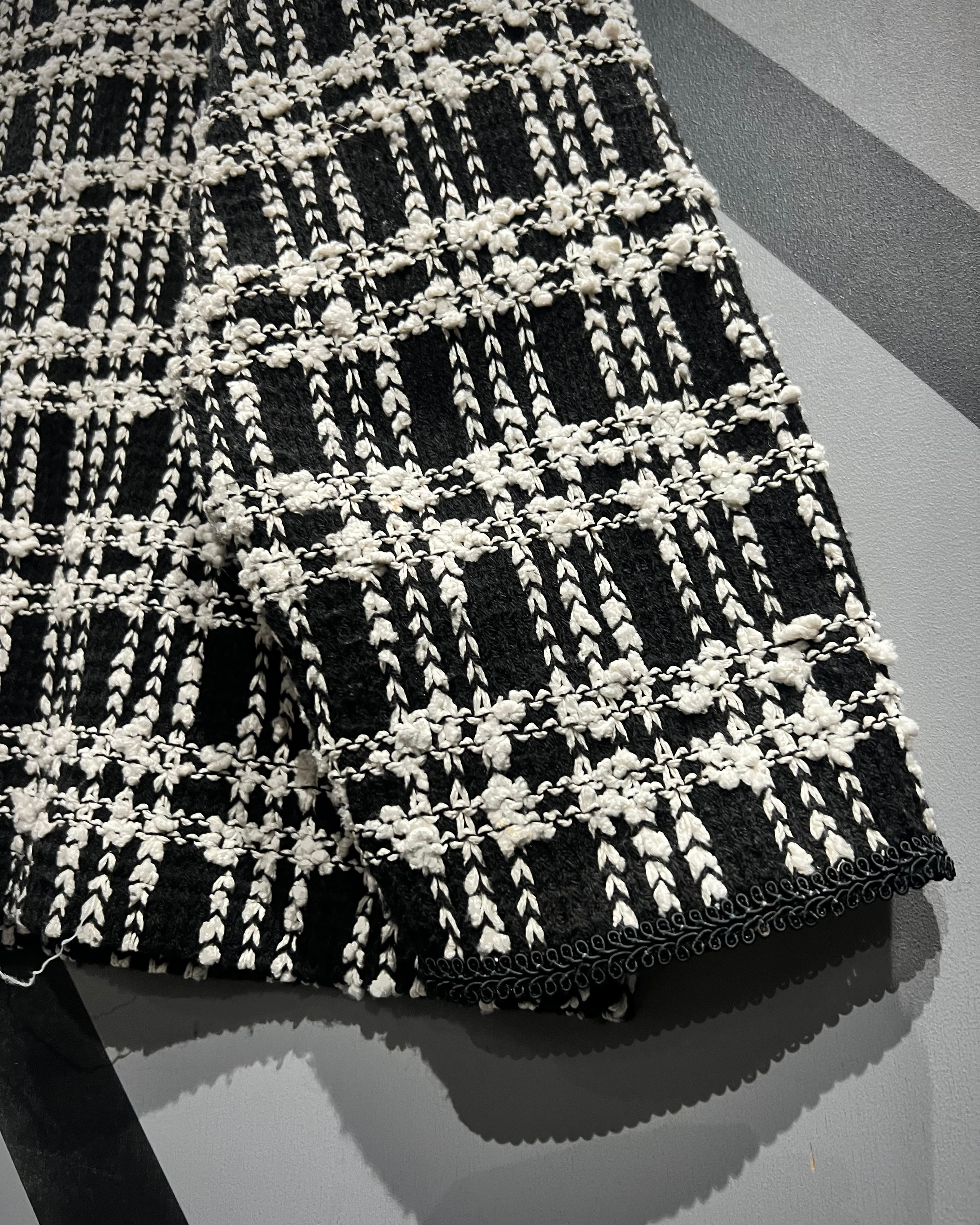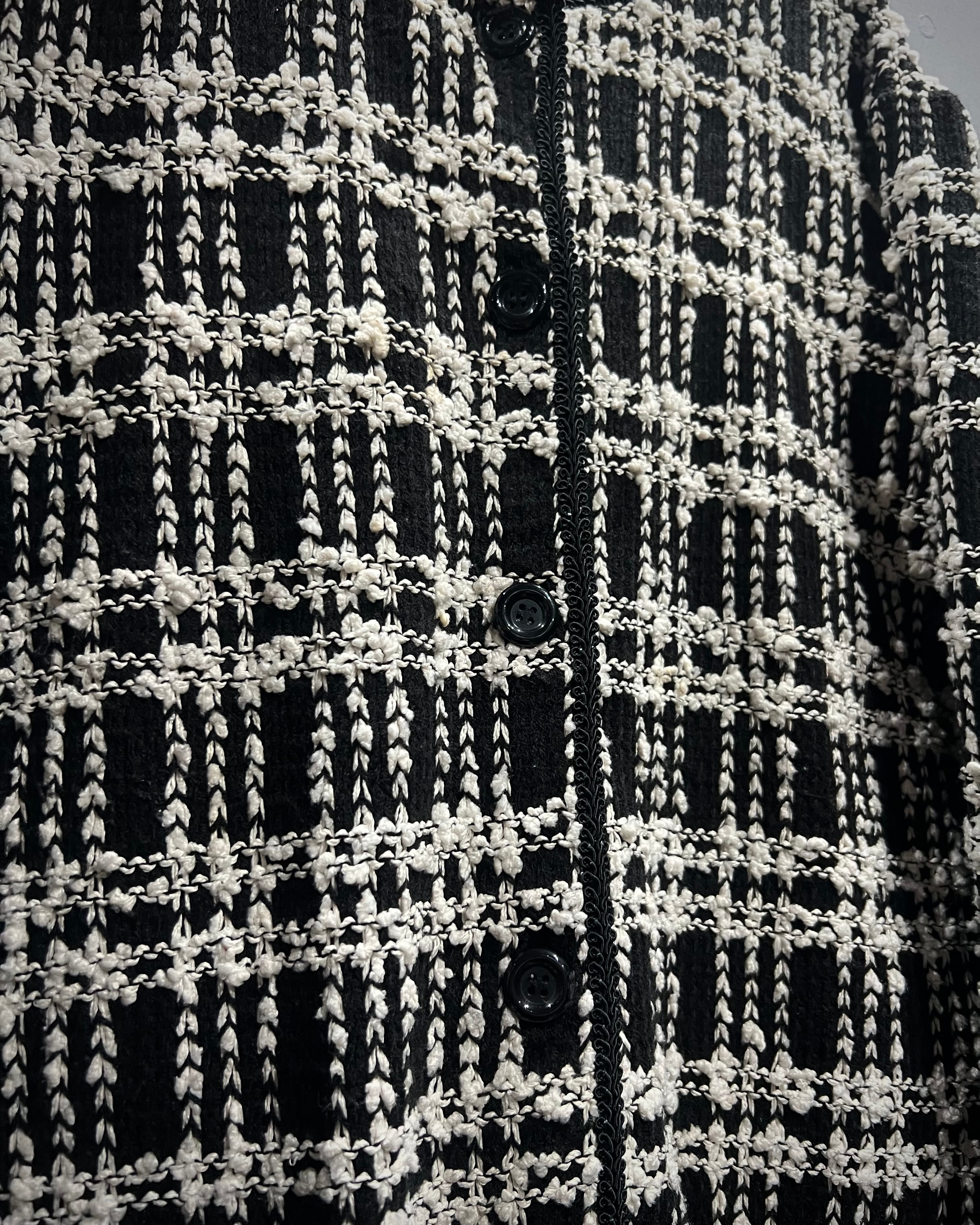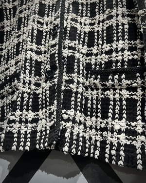 ブラックを基調にホワイトの糸を織り交ぜたチェックパターンは、立体感のある編地で奥行きを表現。生地そのものに表情があり、遠目からも存在感を放ちながら、近くで見ると繊細な編み込みの凹凸に圧倒されるクオリティです。