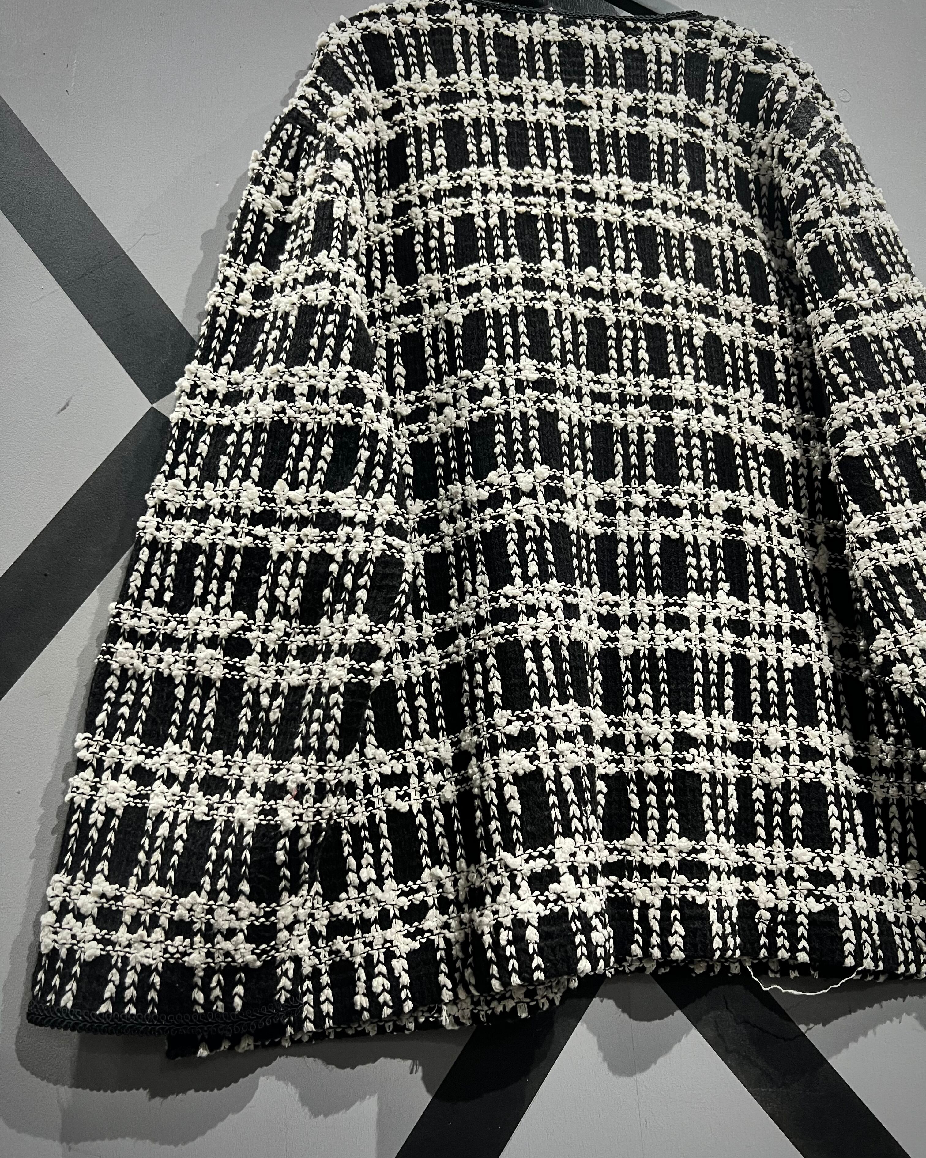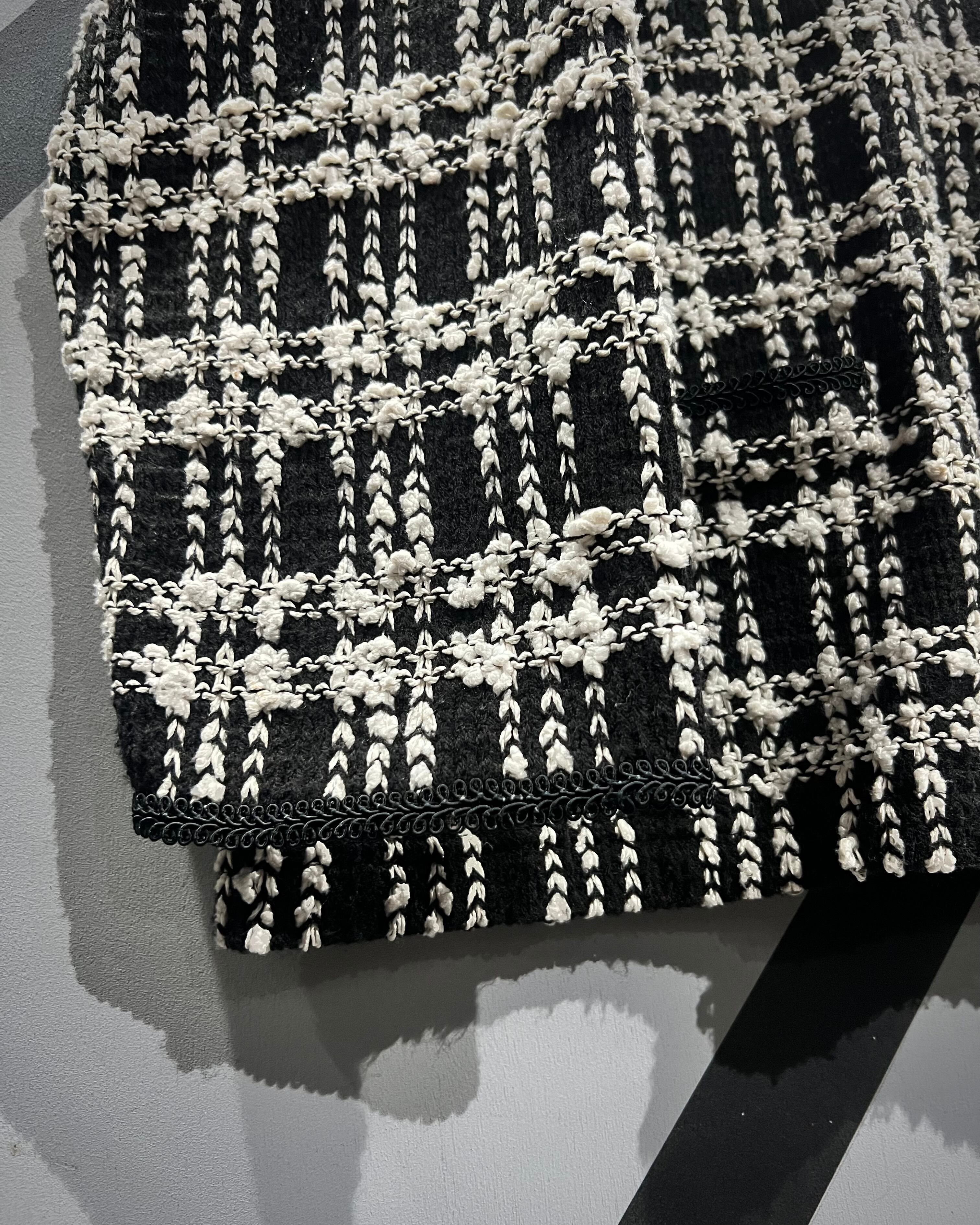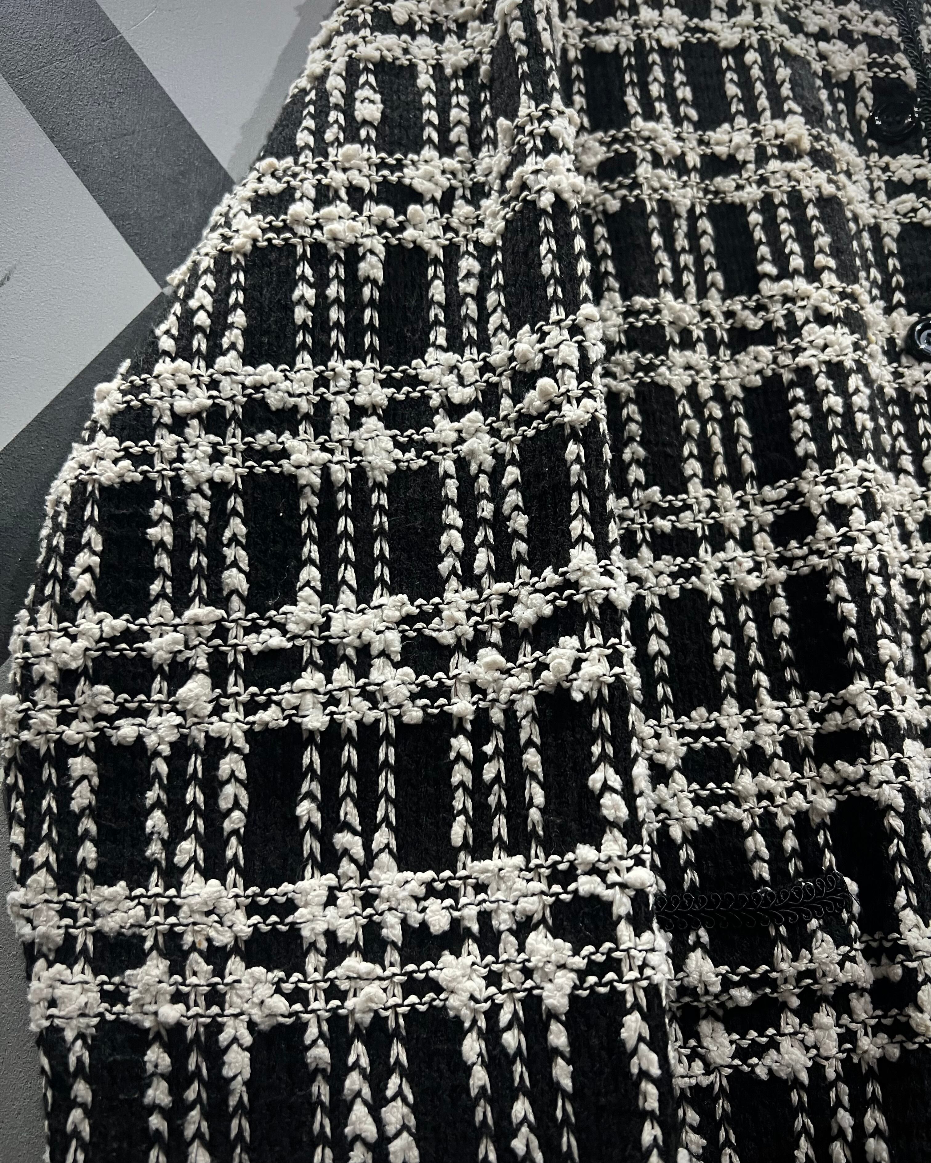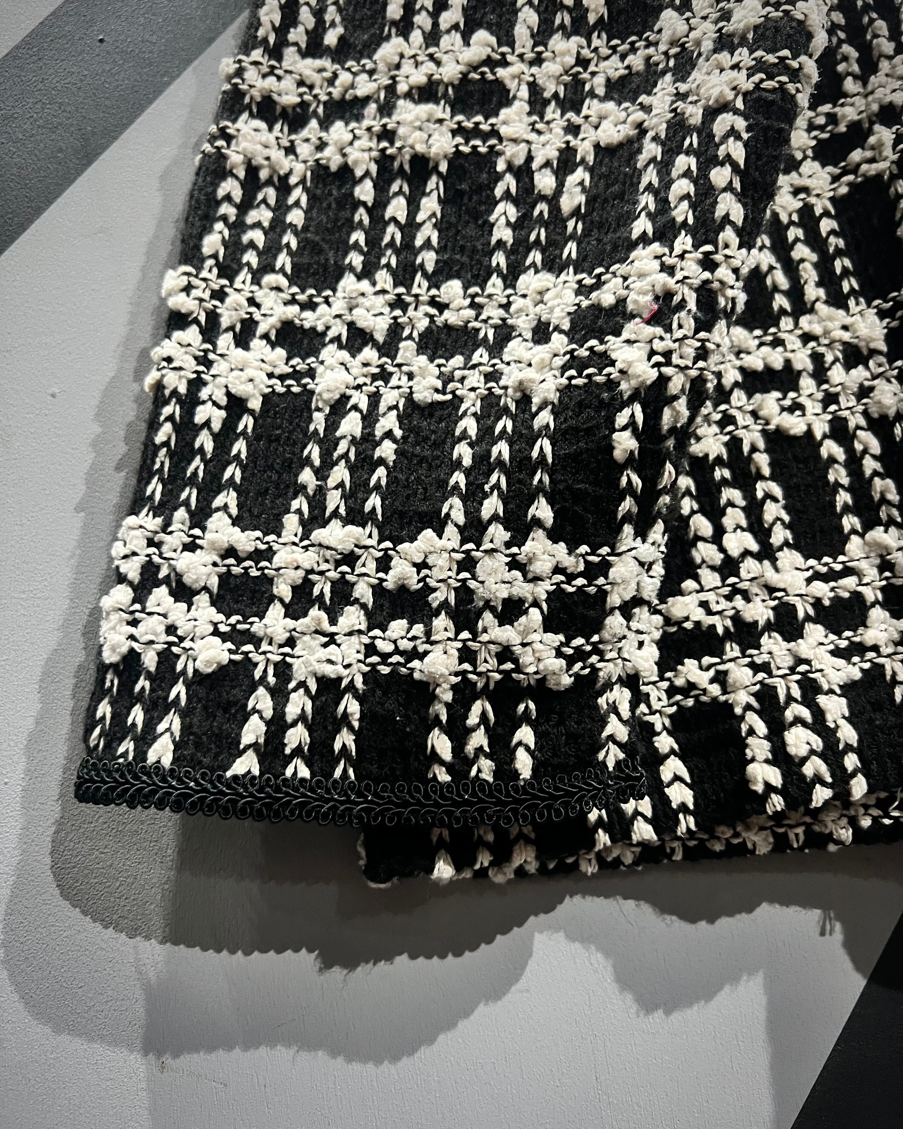 ブラックを基調にホワイトの糸を織り交ぜたチェックパターンは、立体感のある編地で奥行きを表現。生地そのものに表情があり、遠目からも存在感を放ちながら、近くで見ると繊細な編み込みの凹凸に圧倒されるクオリティです。