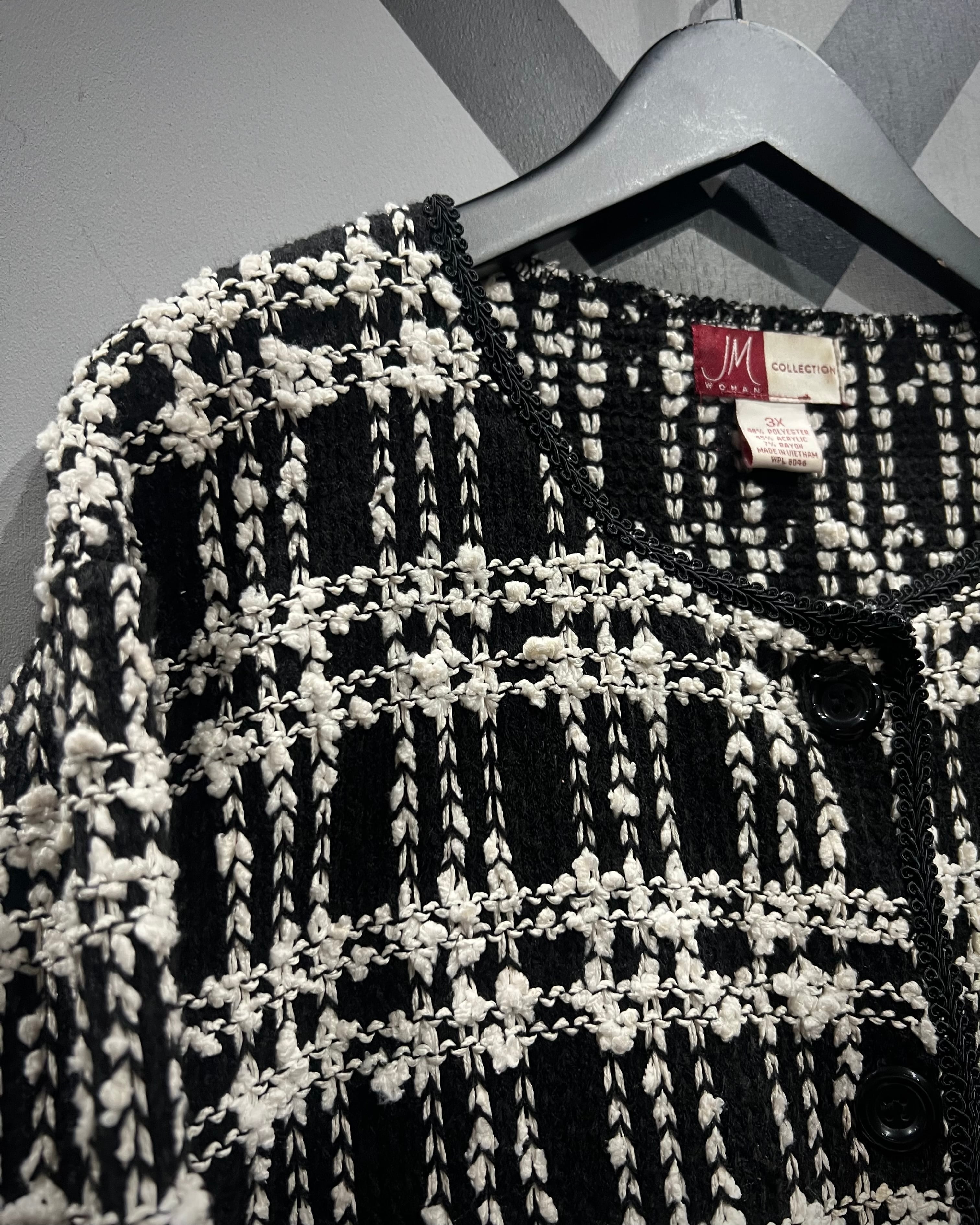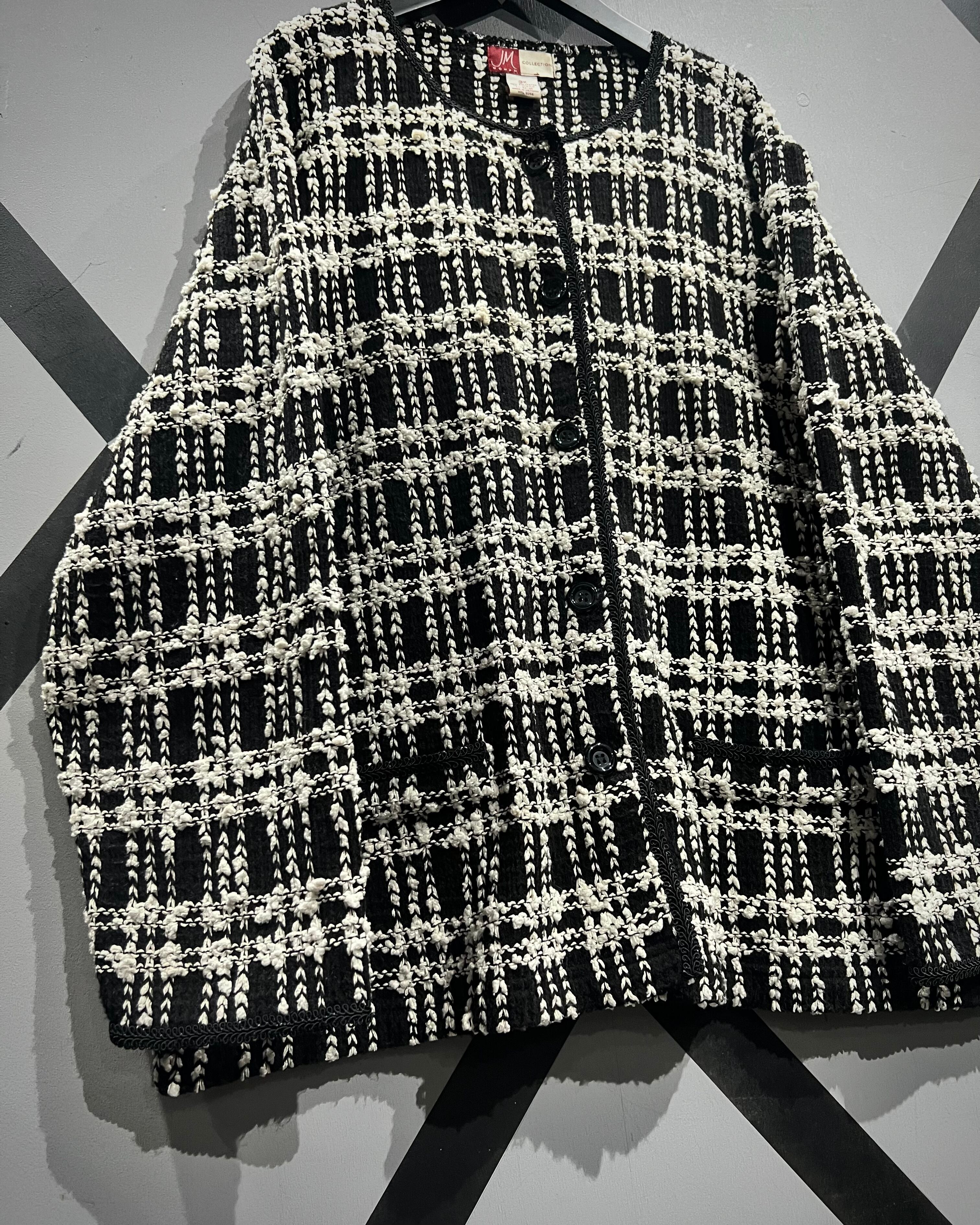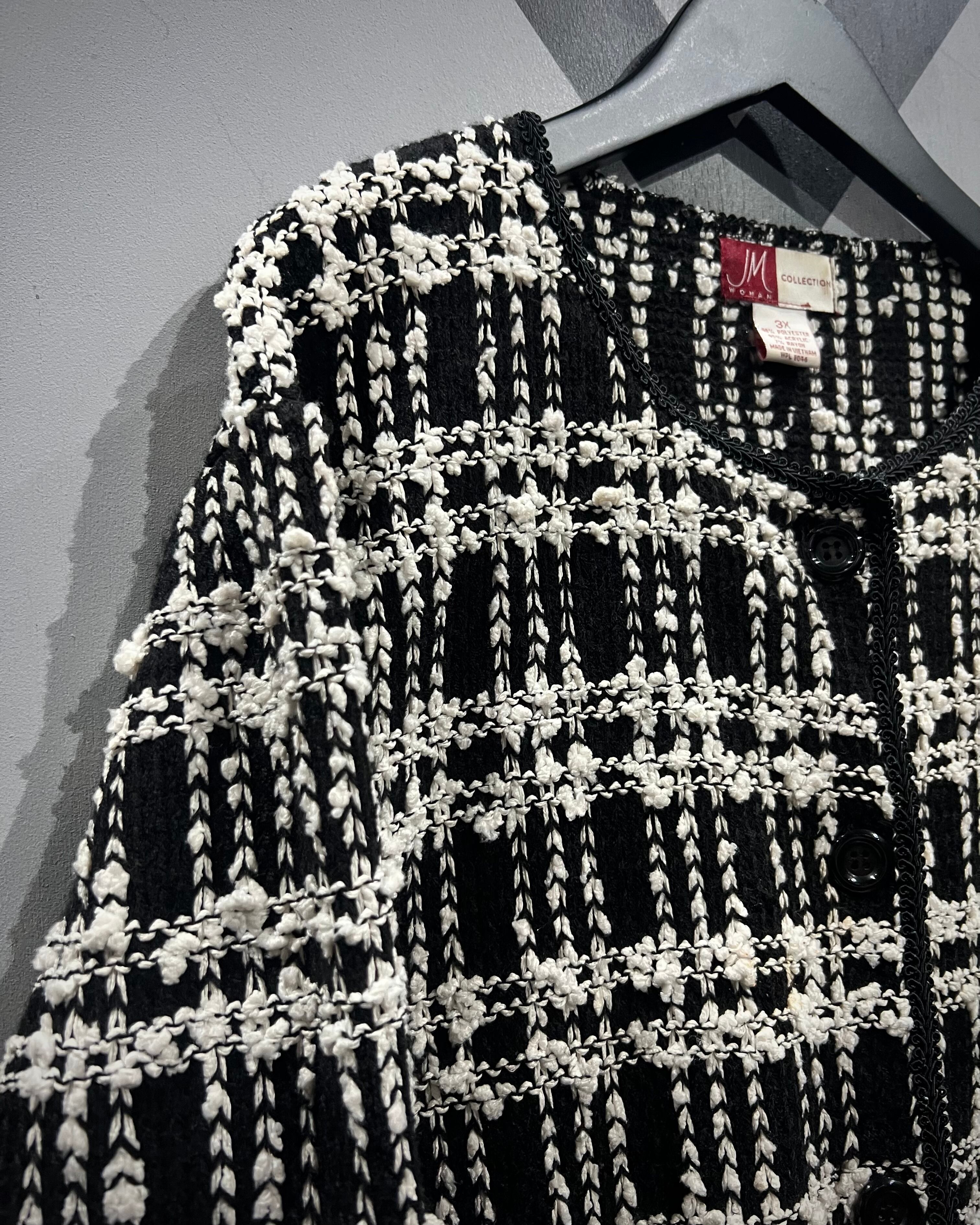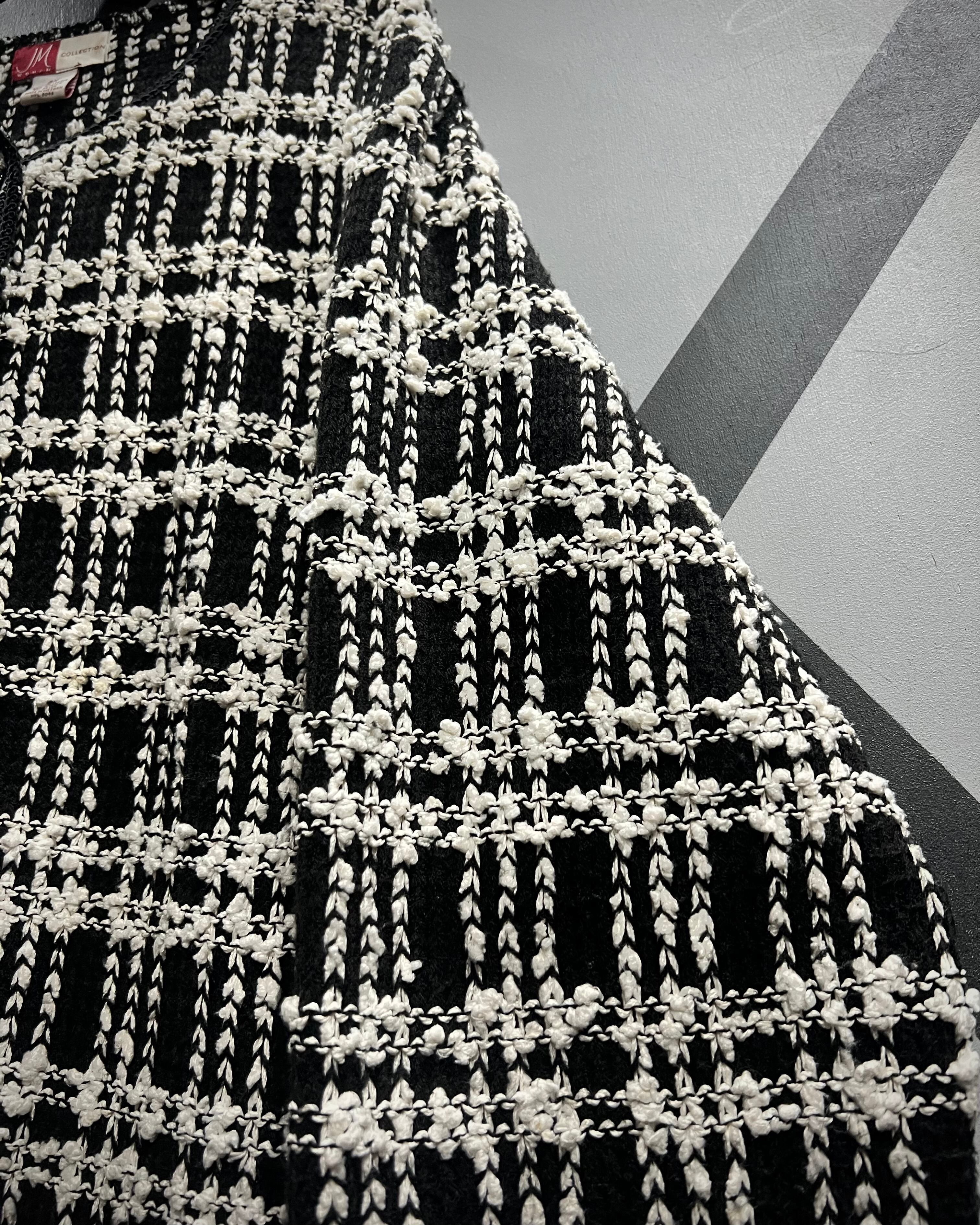 ラグジュアリーな雰囲気を纏った、モノトーンツイード調のニットジャケット。
