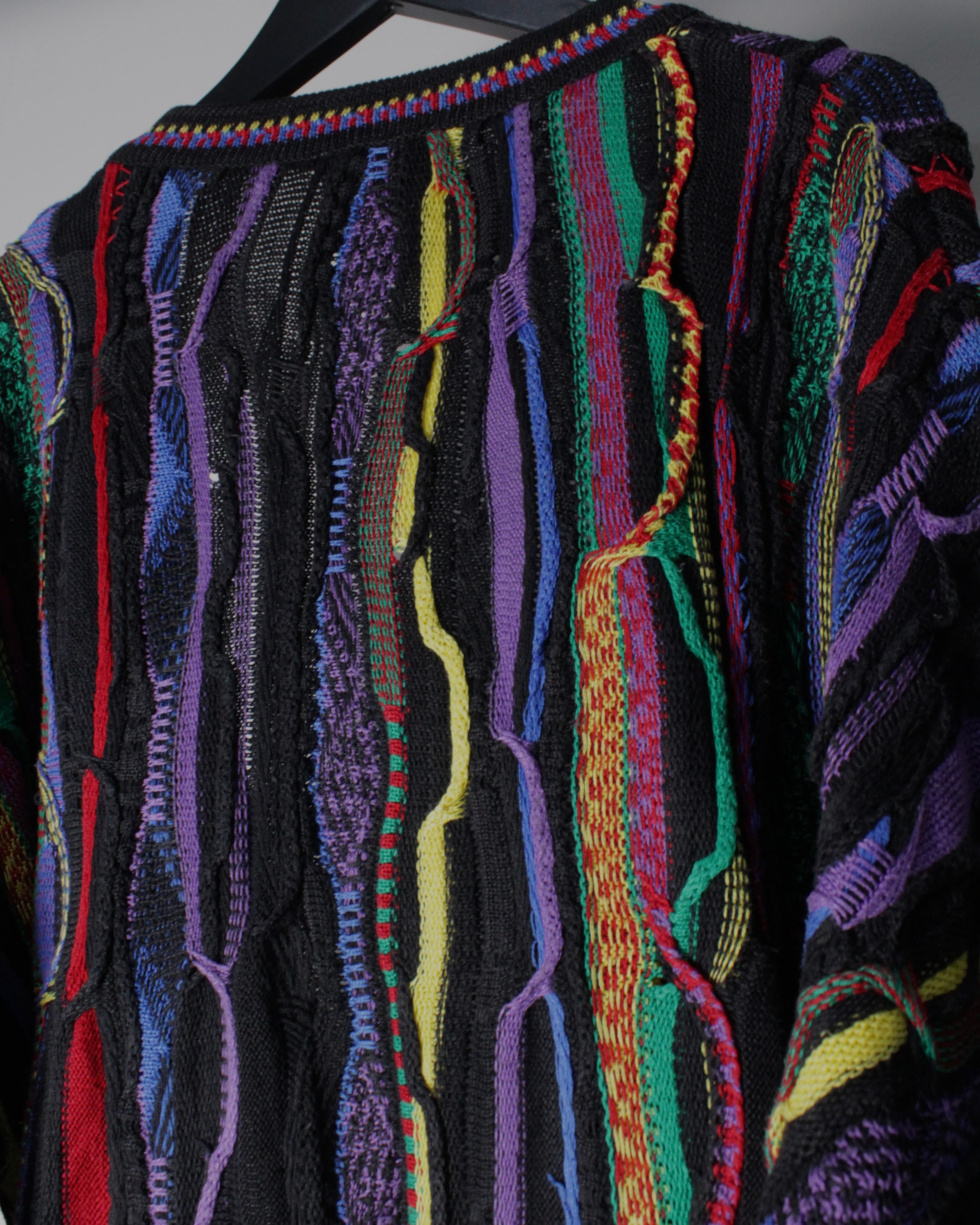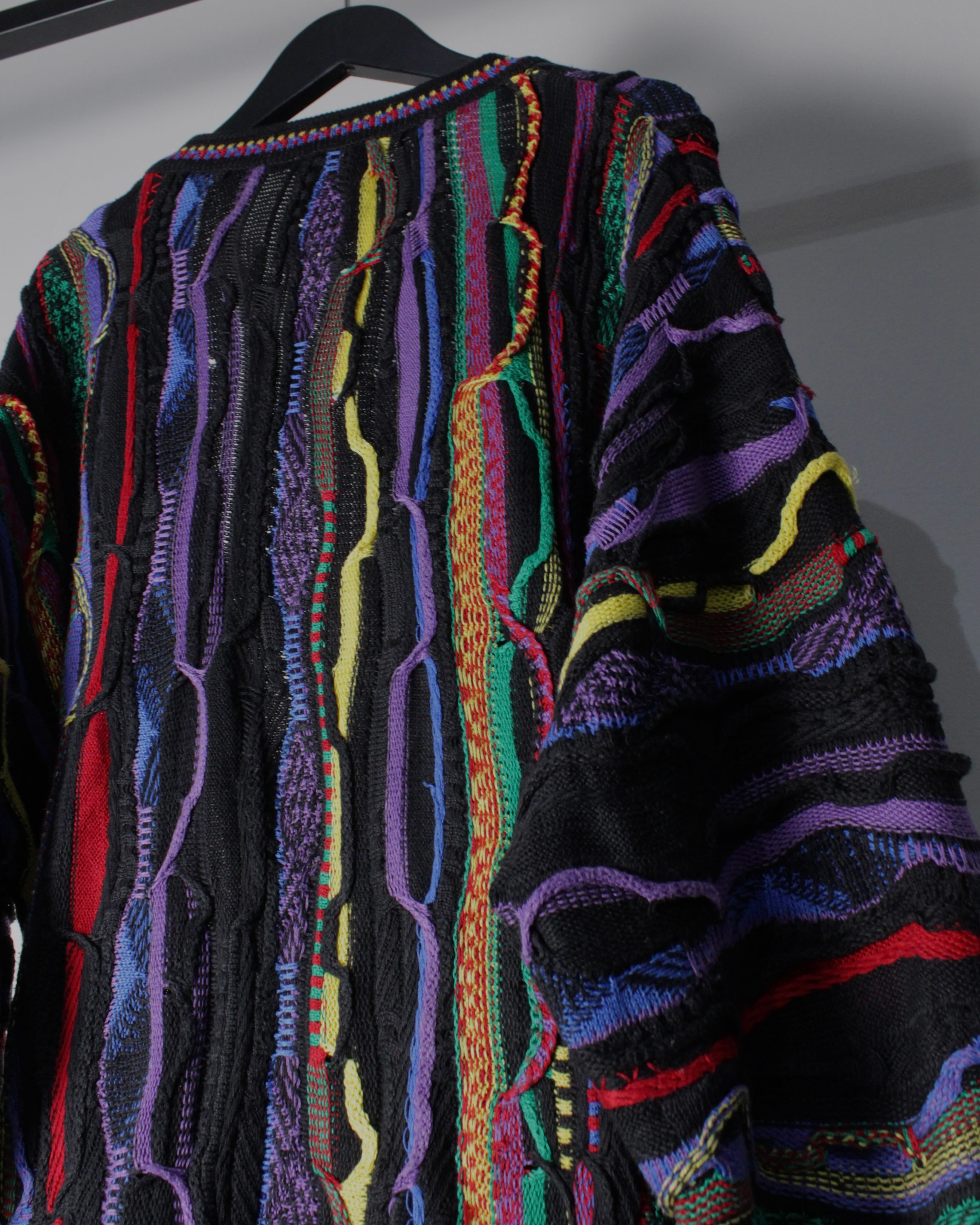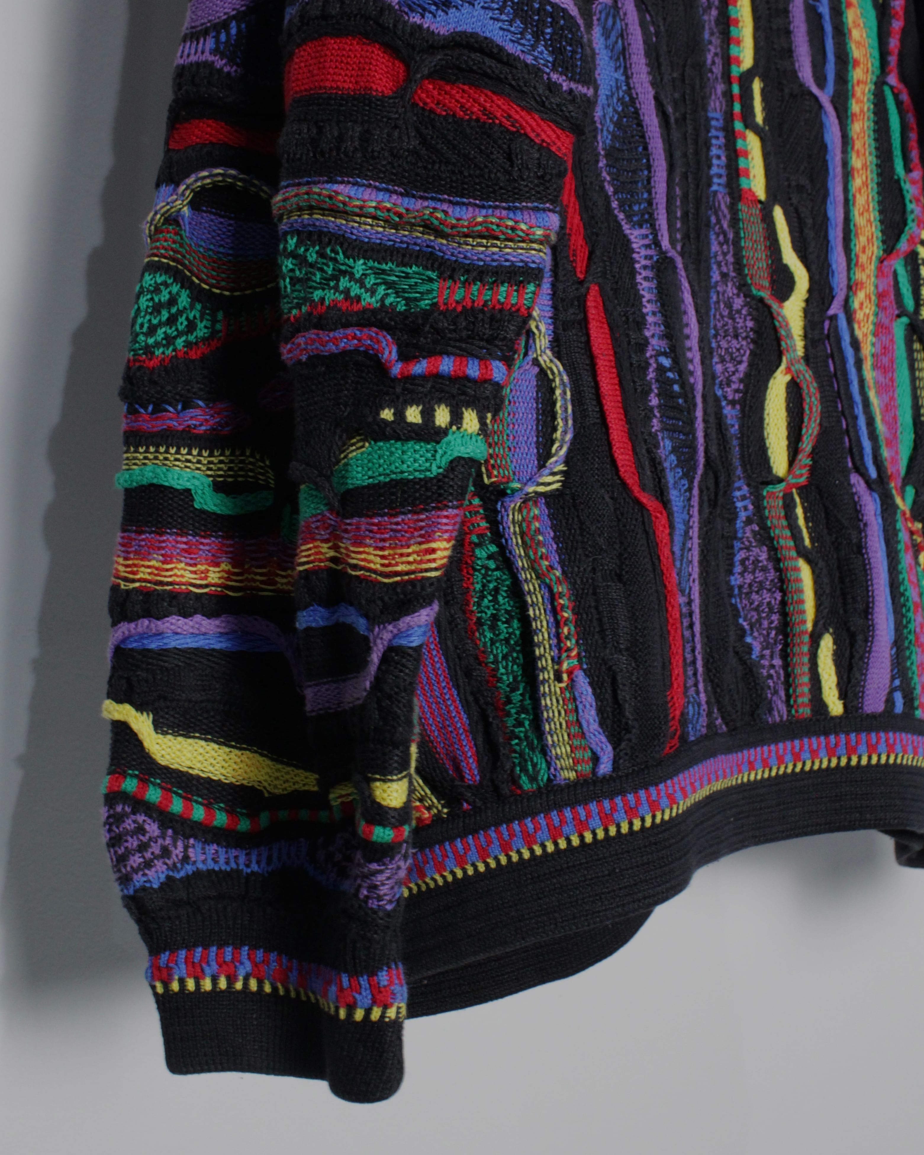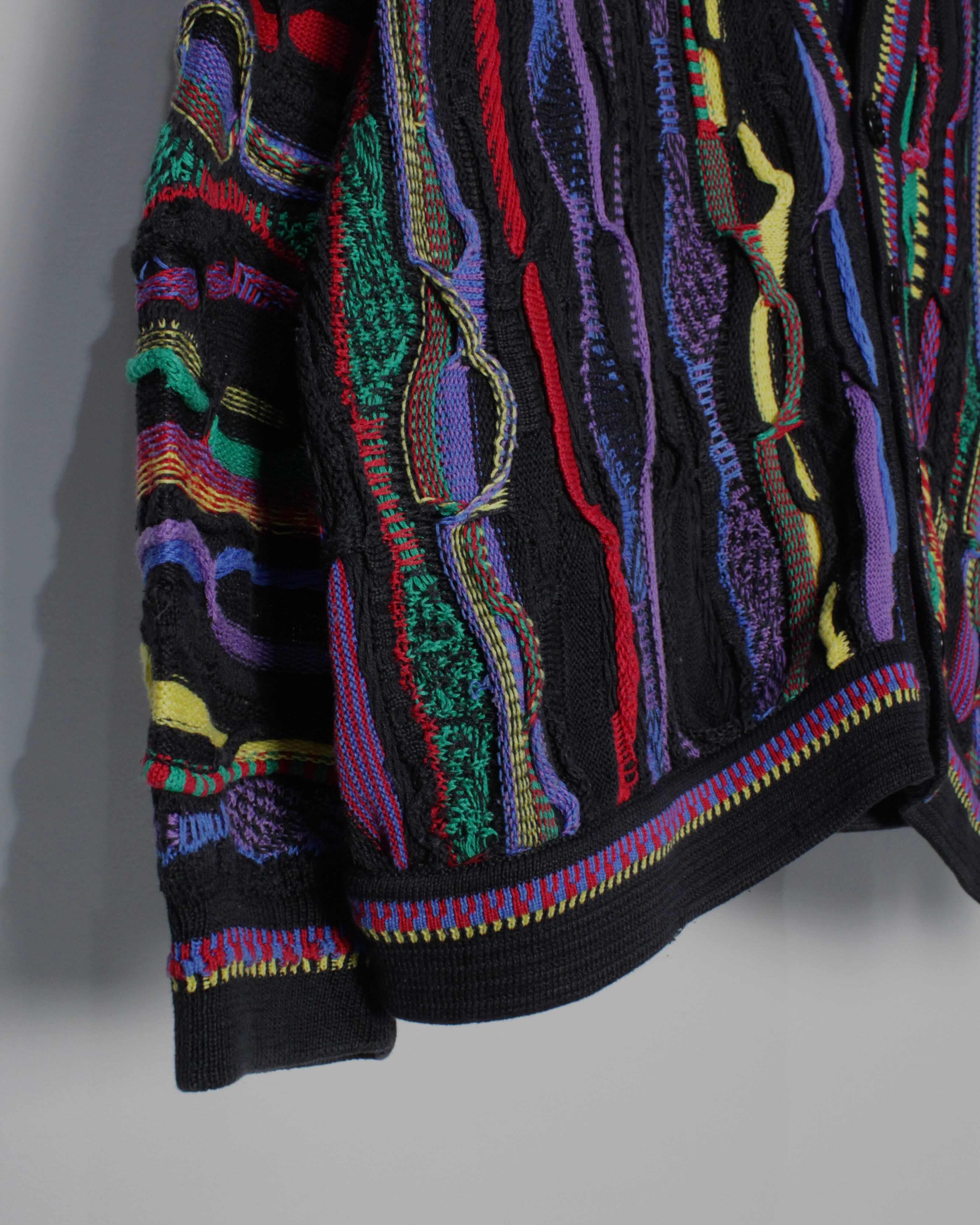 ブラックを基調としたボディに、立体的な編み地で描かれたマルチカラーのパターンが全面に走る圧巻のデザイン。レッド、イエロー、パープル、グリーンなど多彩な色糸を巧みに組み合わせることで、平面的なプリントでは決して表現できない奥行きと陰影を持った唯一無二の表情を生み出しています。