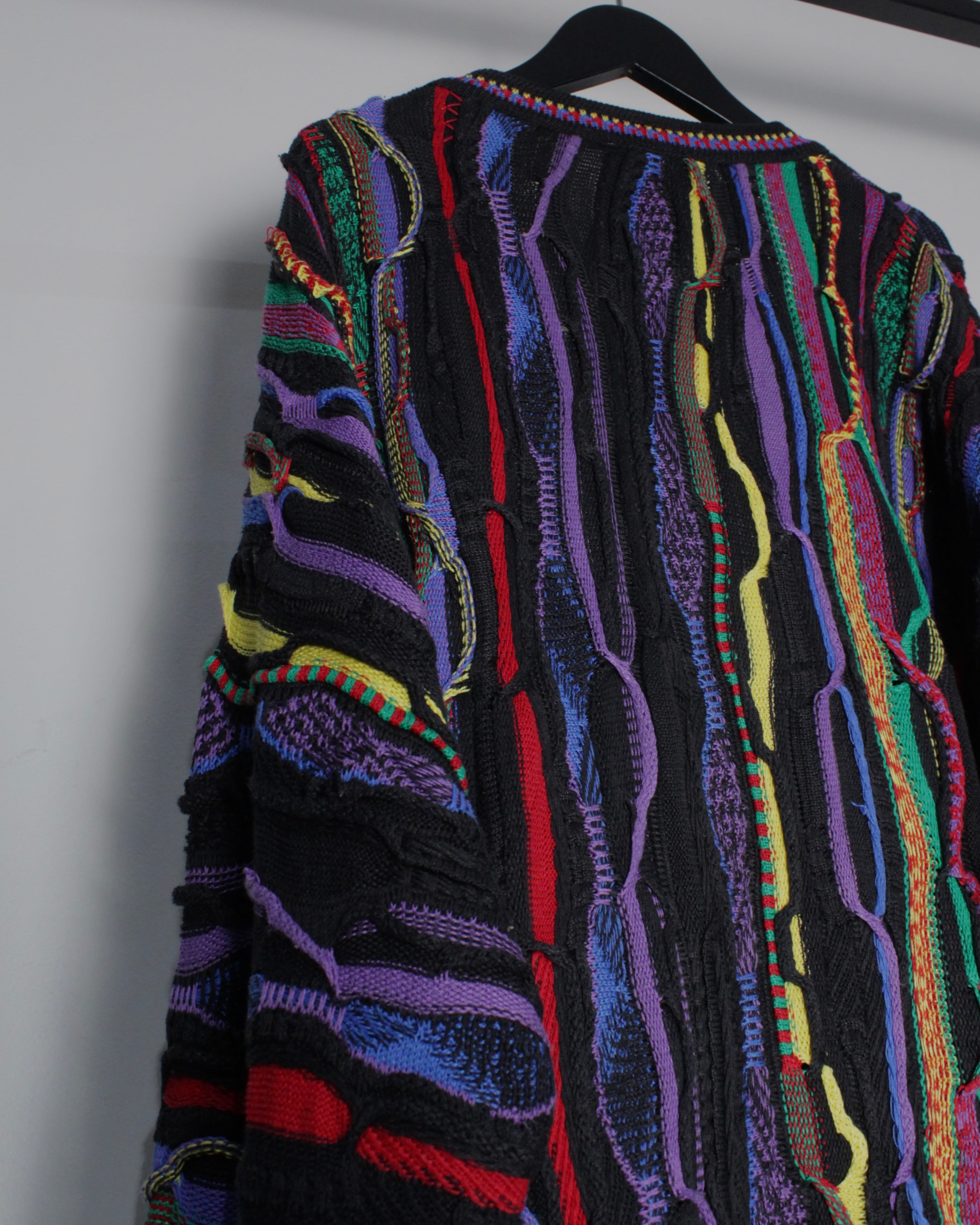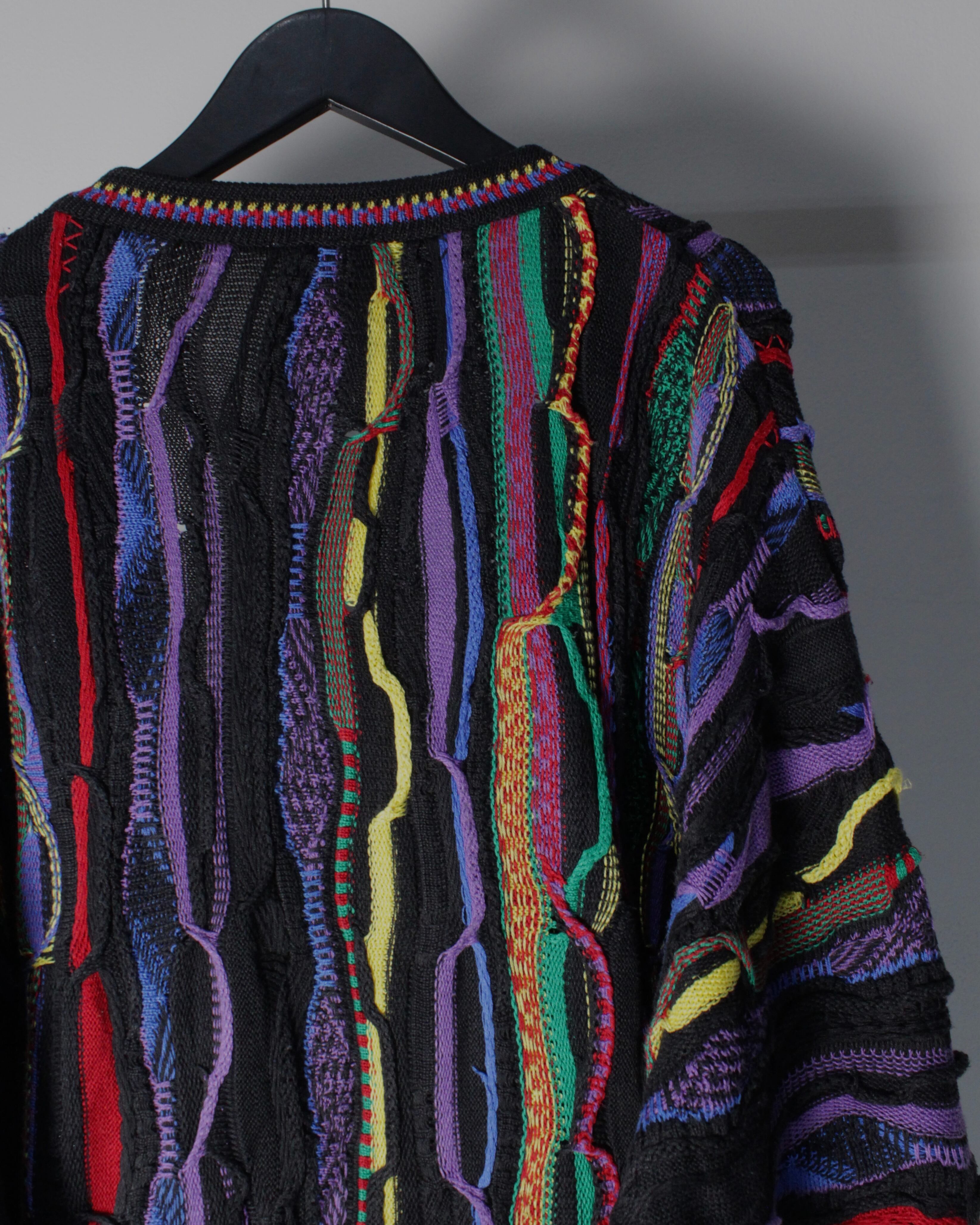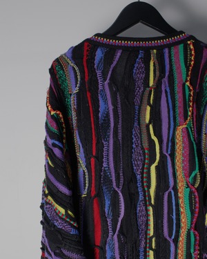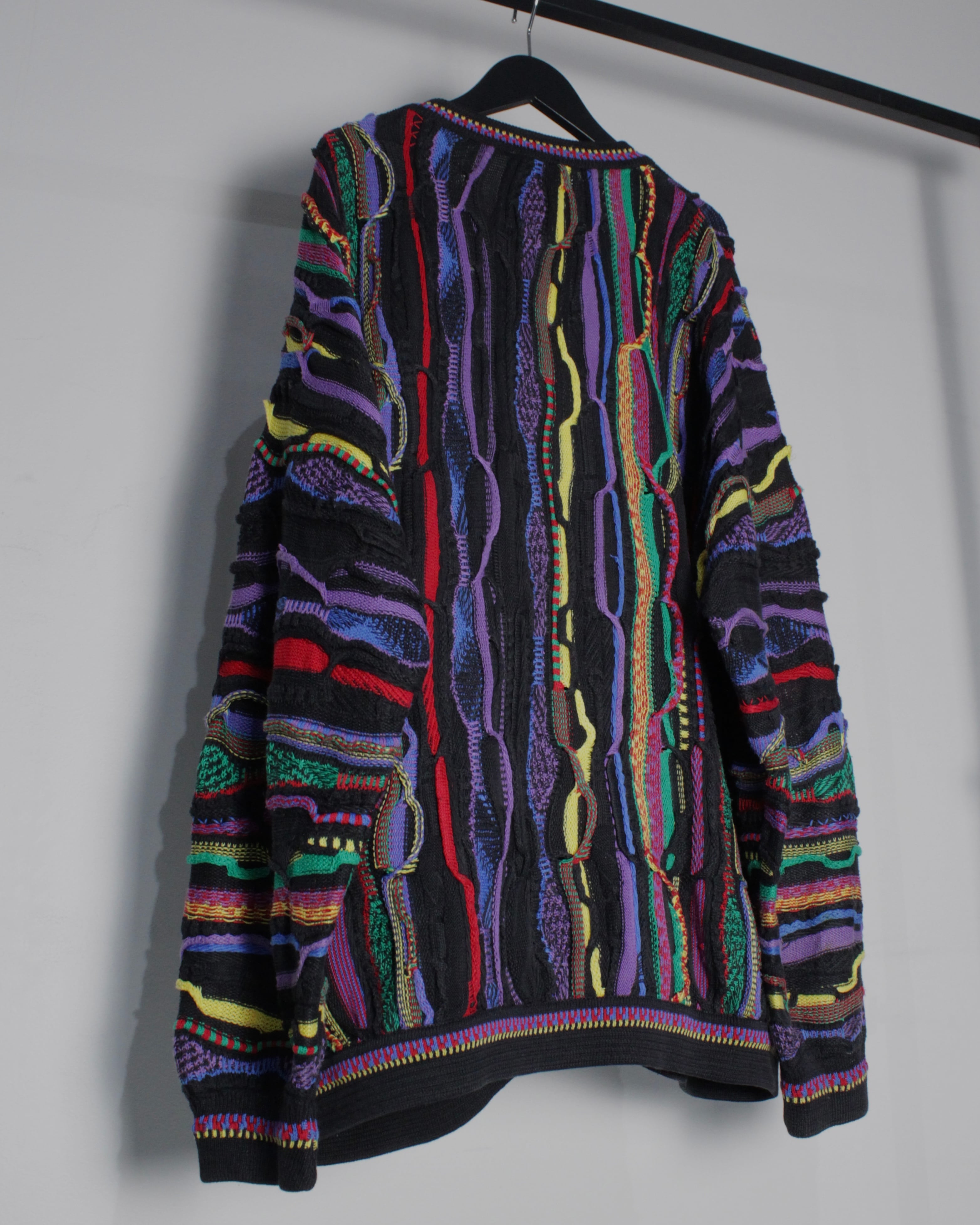 ブラックを基調としたボディに、立体的な編み地で描かれたマルチカラーのパターンが全面に走る圧巻のデザイン。レッド、イエロー、パープル、グリーンなど多彩な色糸を巧みに組み合わせることで、平面的なプリントでは決して表現できない奥行きと陰影を持った唯一無二の表情を生み出しています。