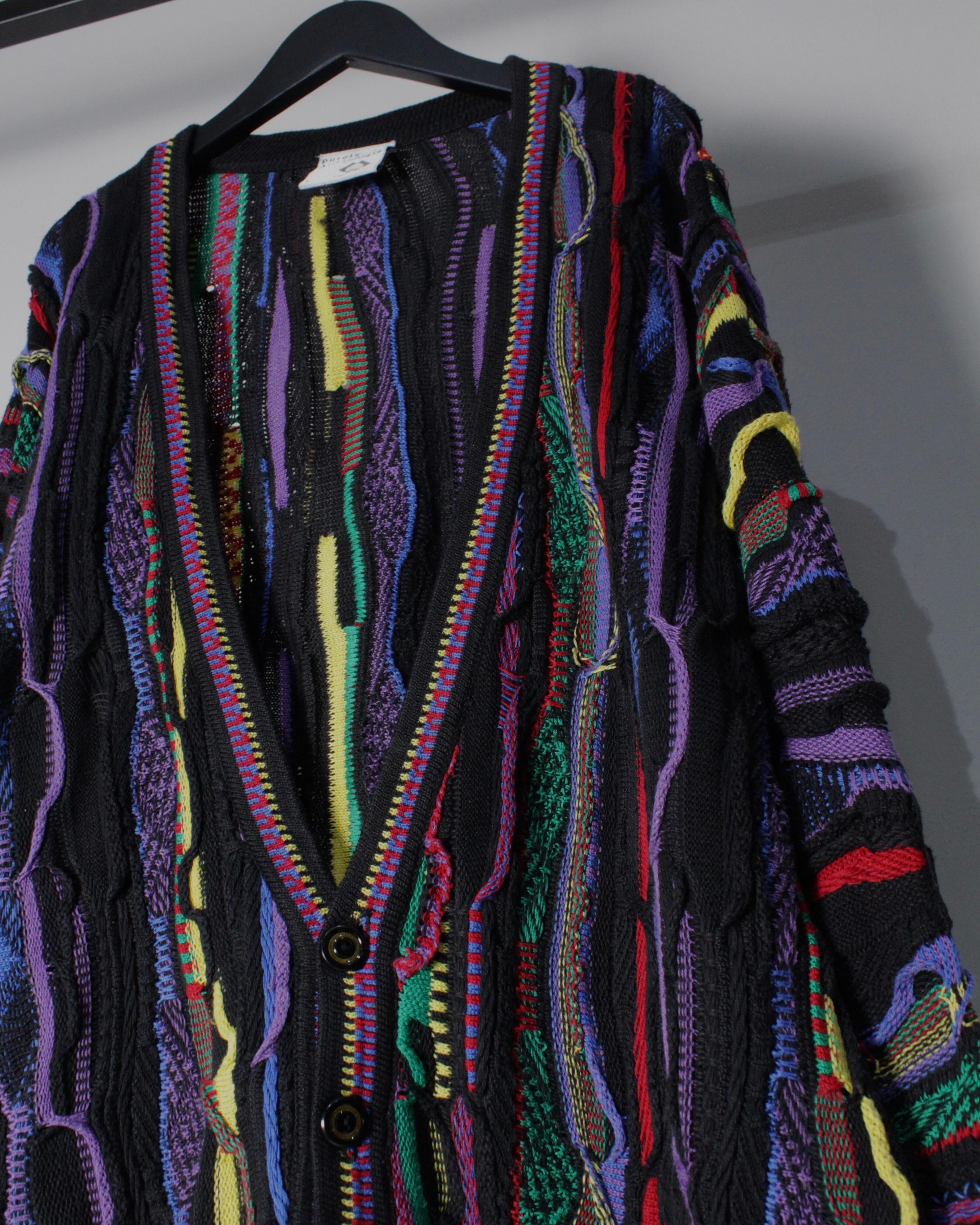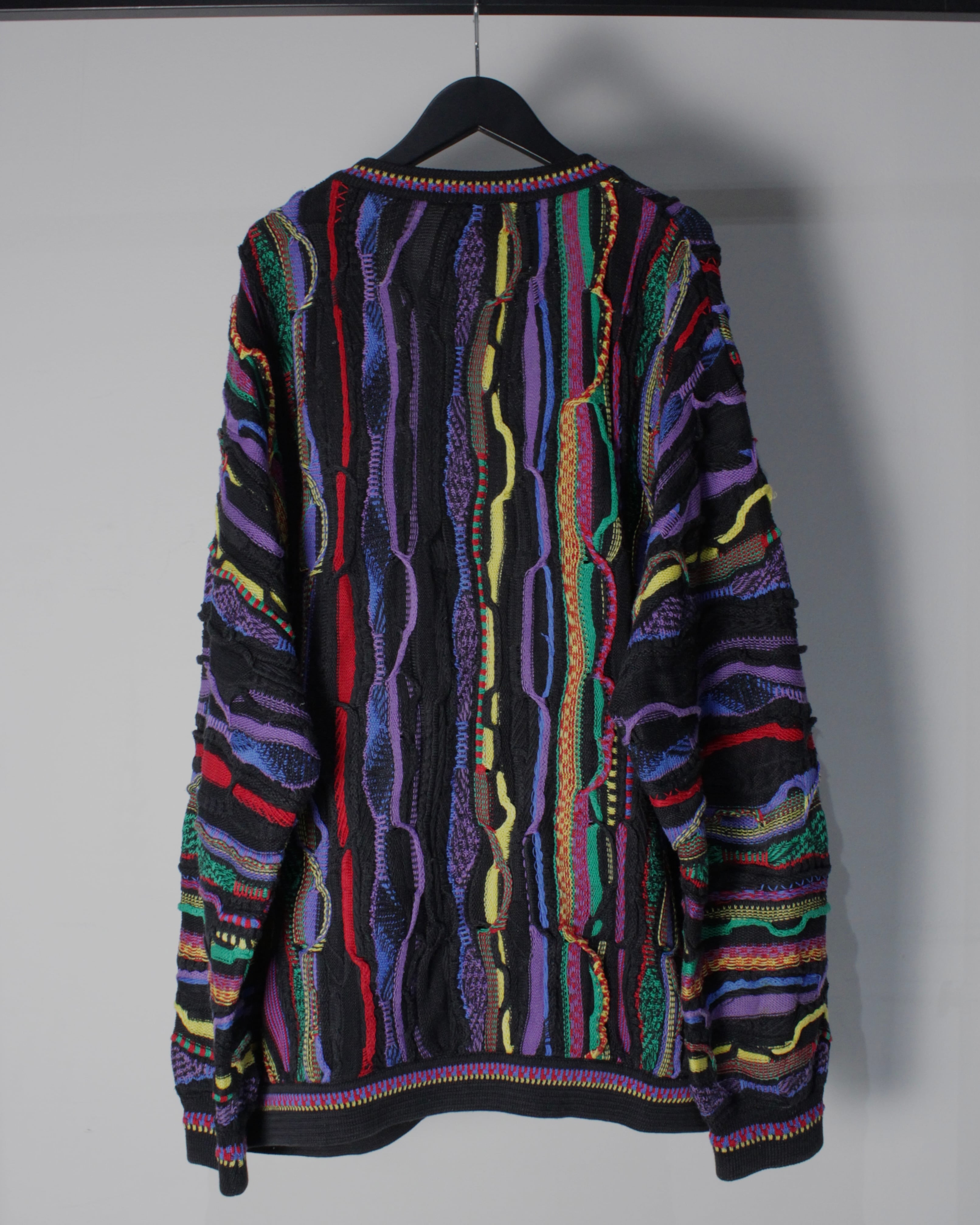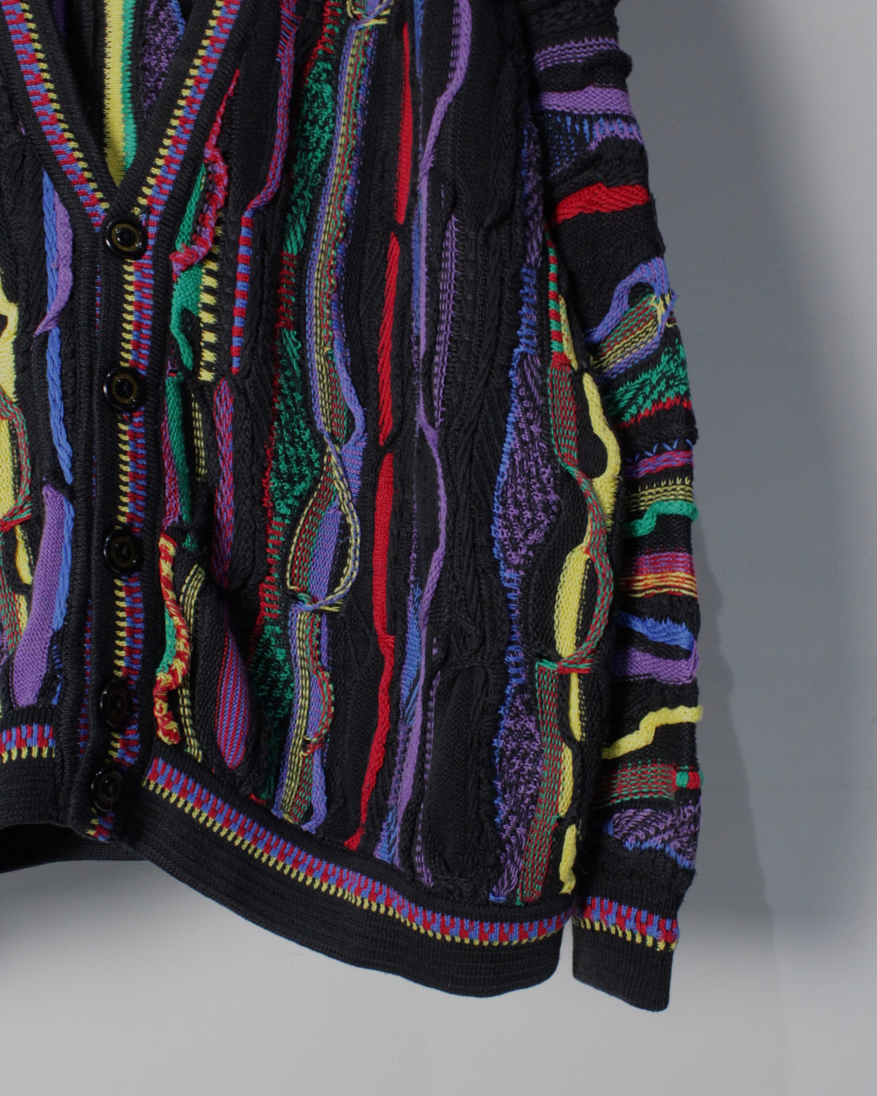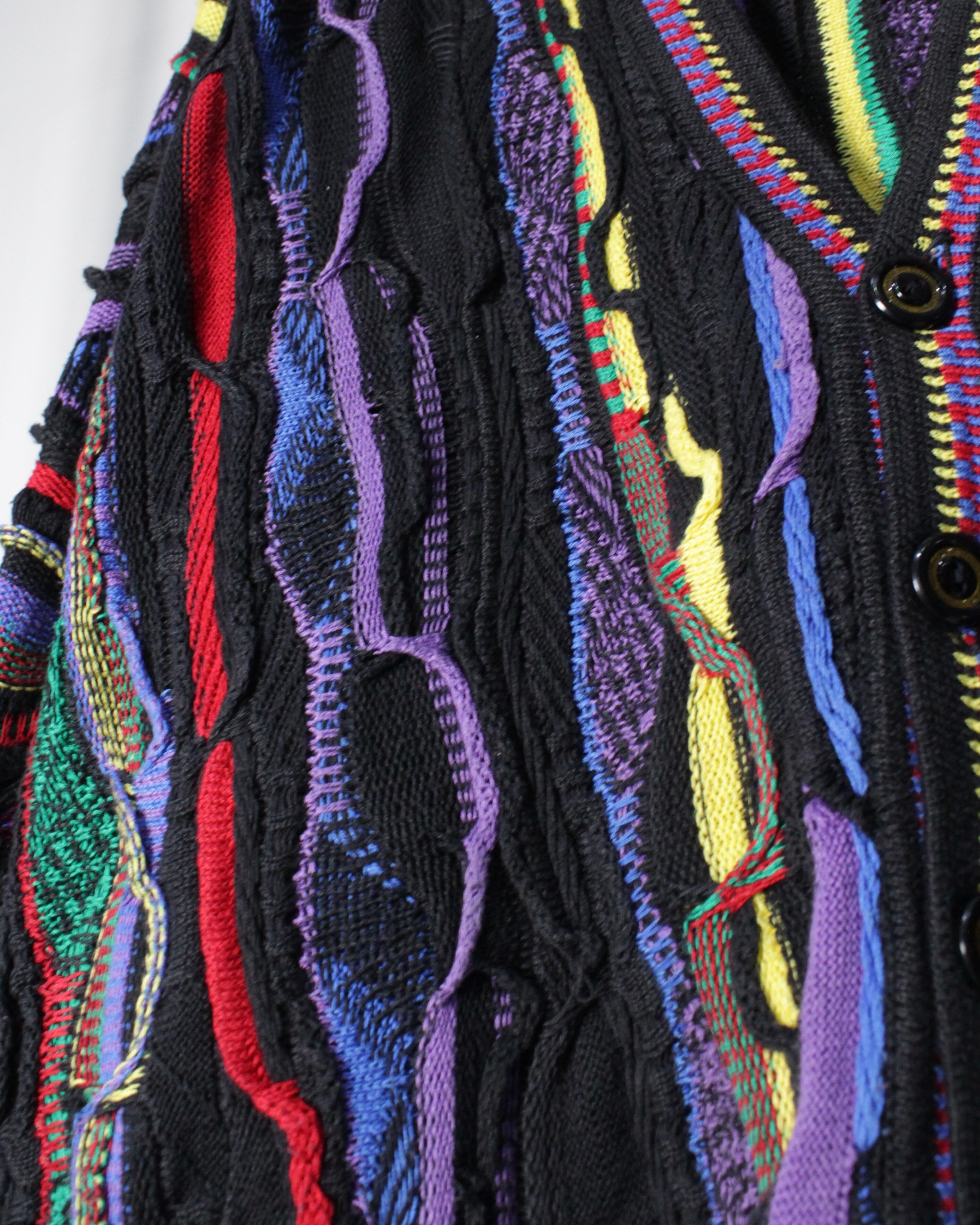 ブラックを基調としたボディに、立体的な編み地で描かれたマルチカラーのパターンが全面に走る圧巻のデザイン。レッド、イエロー、パープル、グリーンなど多彩な色糸を巧みに組み合わせることで、平面的なプリントでは決して表現できない奥行きと陰影を持った唯一無二の表情を生み出しています。