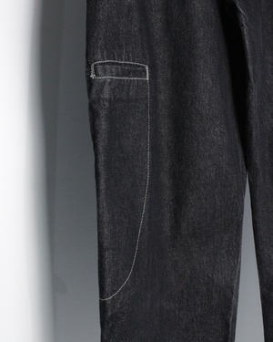 ボディには深みのあるブラックデニムを採用し、ホワイトのステッチワークが際立つモードな雰囲気を演出。経年変化によってフェードしていく過程も存分に楽しめ、穿き込むほどに唯一無二の表情へと進化していきます。背面にはブランドロゴのタグや刺繍を配置し、細部まで抜かりないデザイン。