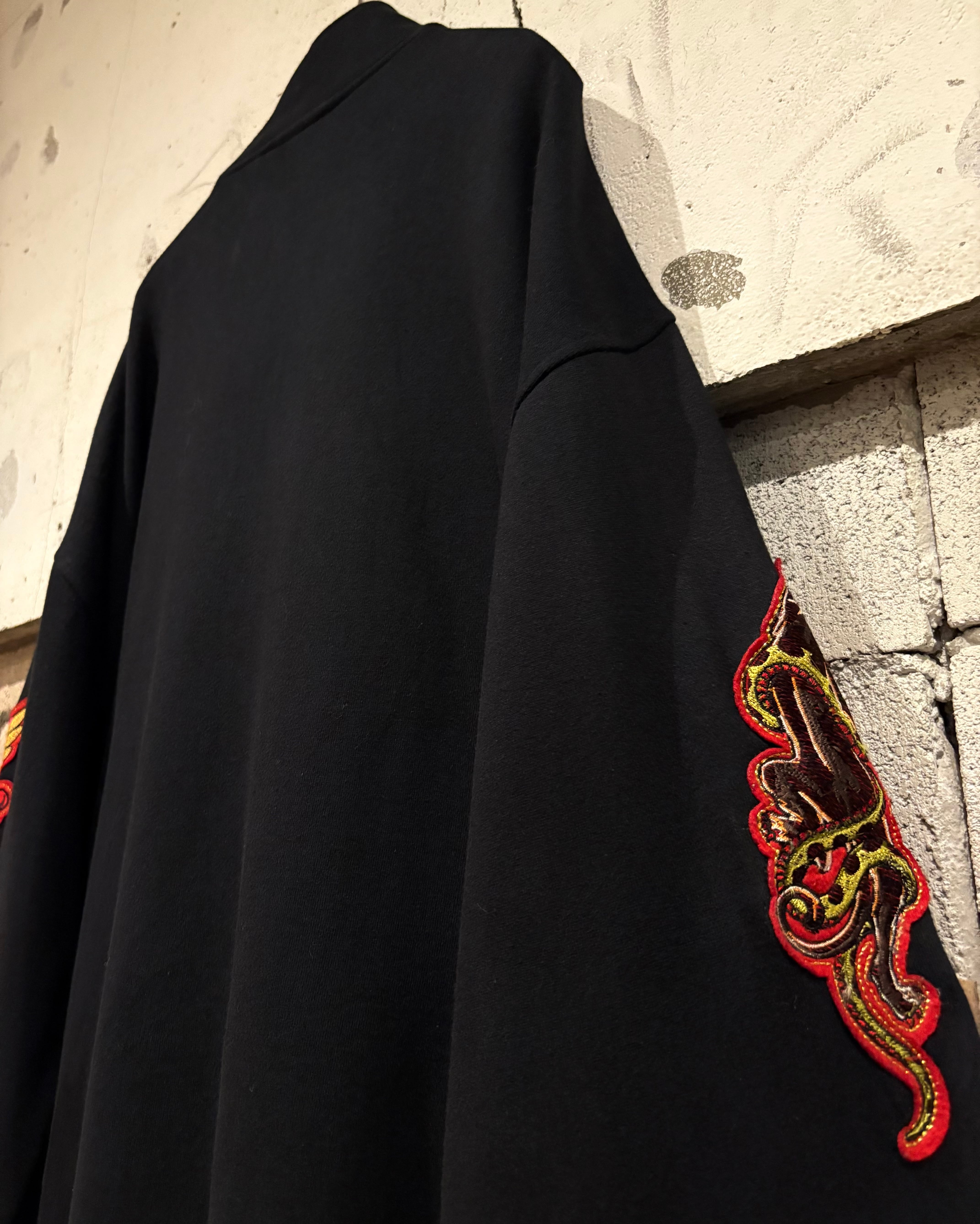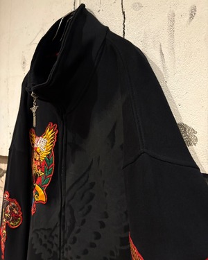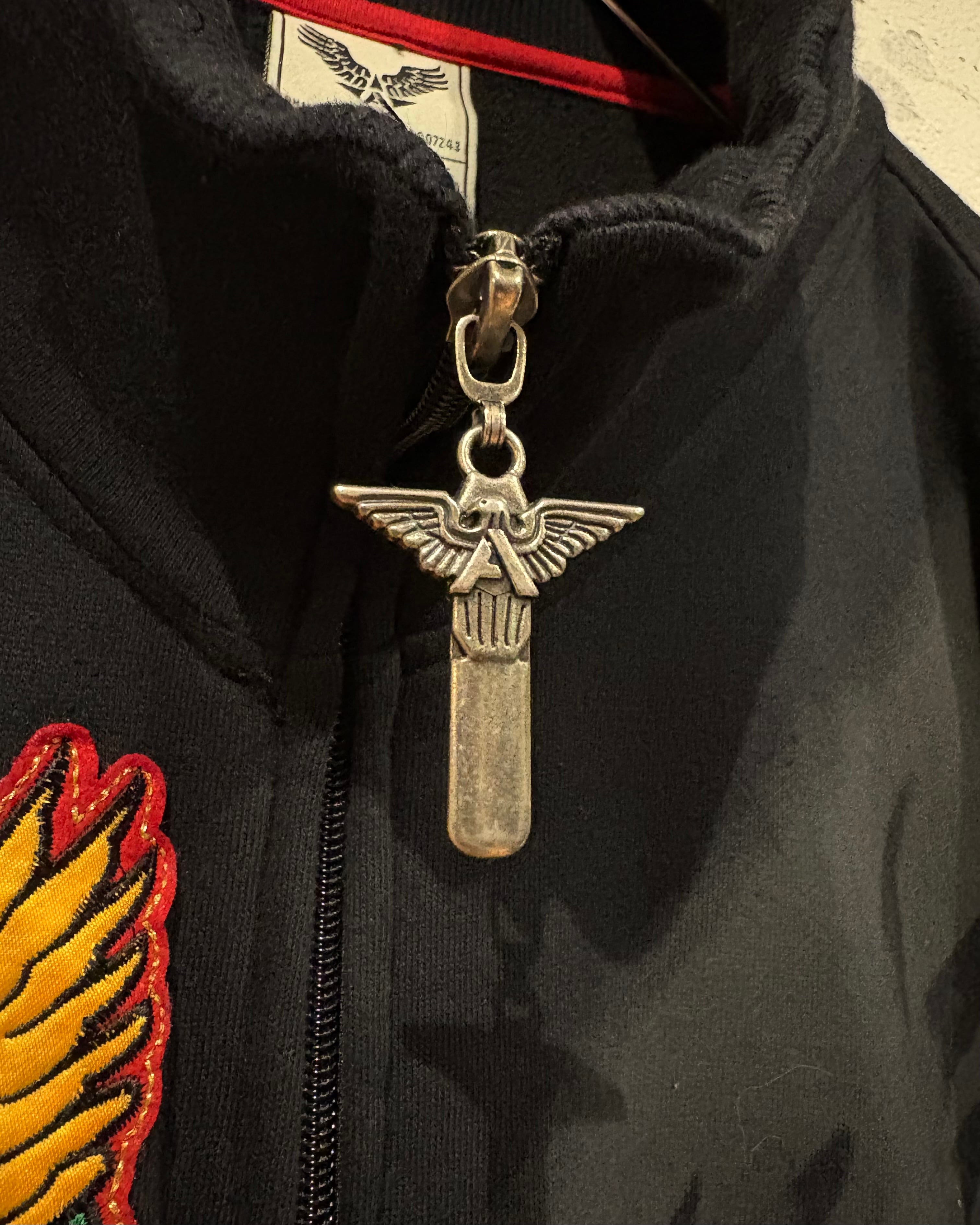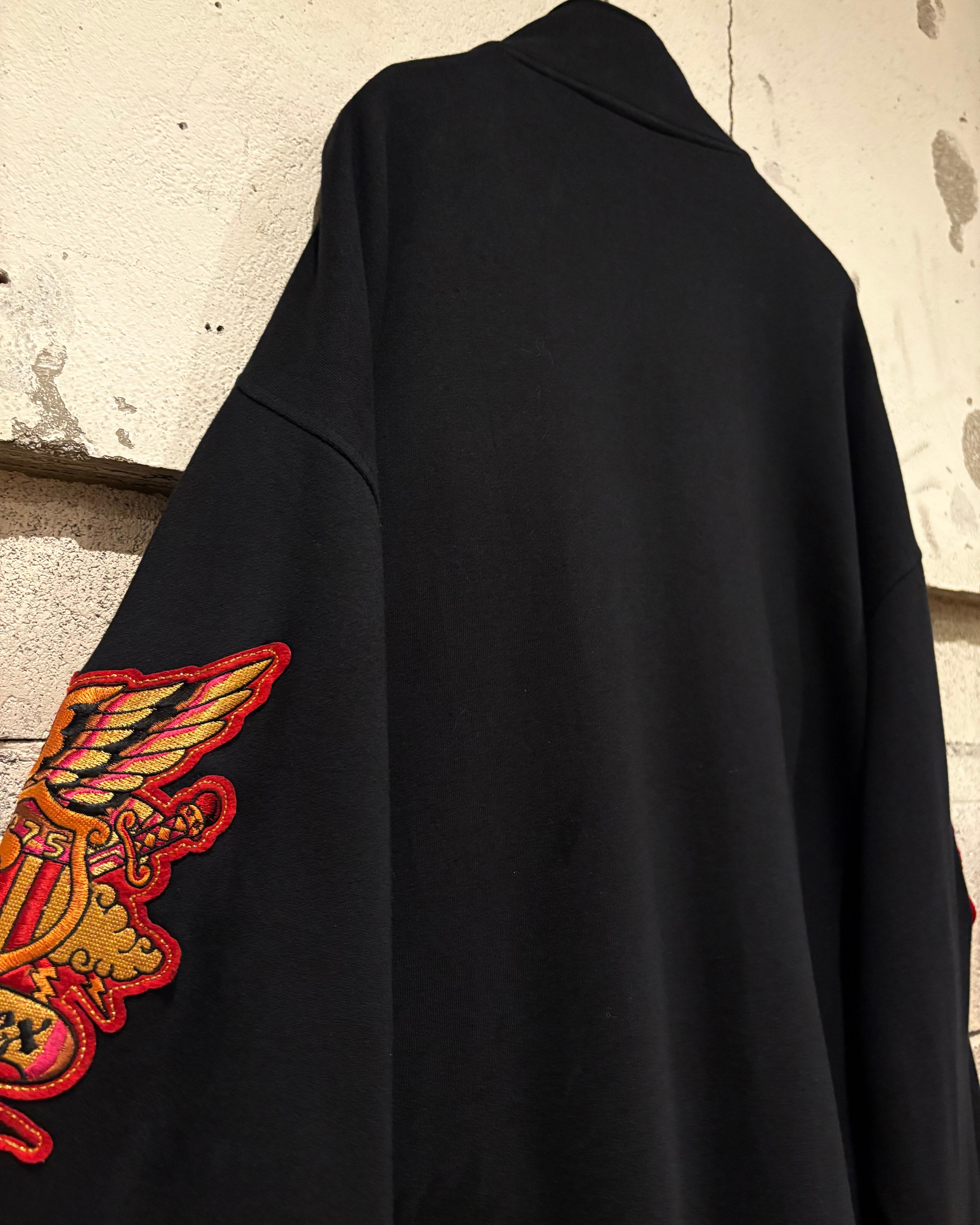 ブラックボディを基調に、フロント全体に大判で描かれた鷹のプリント、さらに胸元・袖・背面にまで重厚な刺繍ワッペンを散りばめた、圧倒的な存在感を放つ1着。