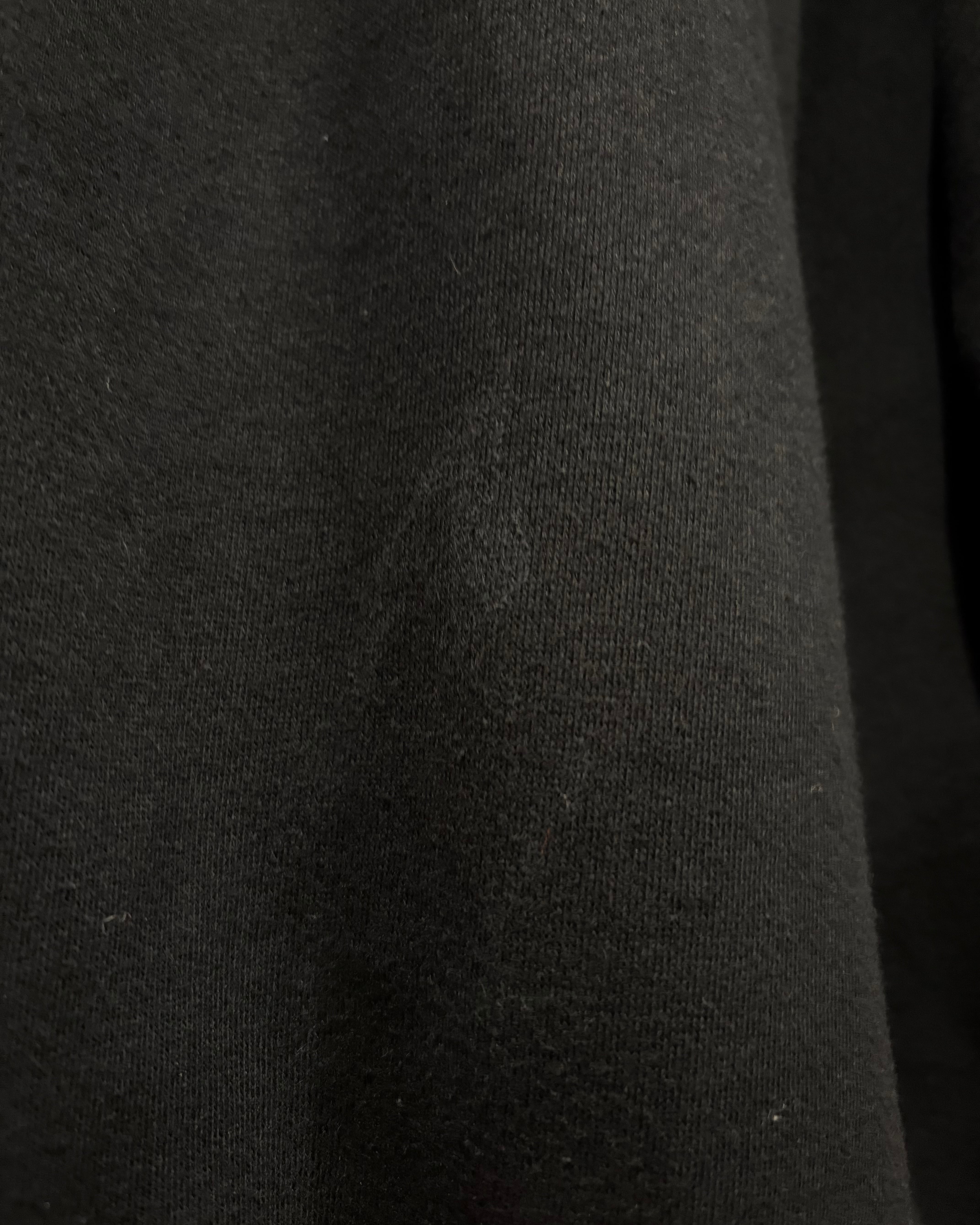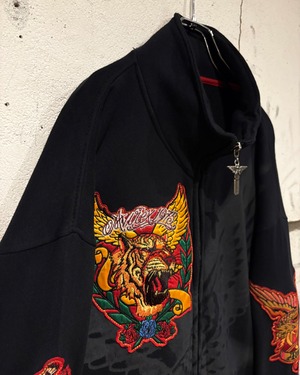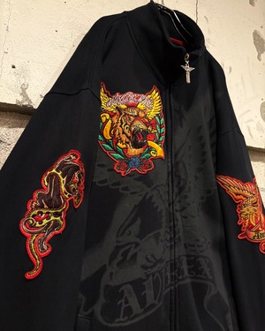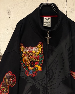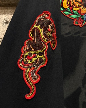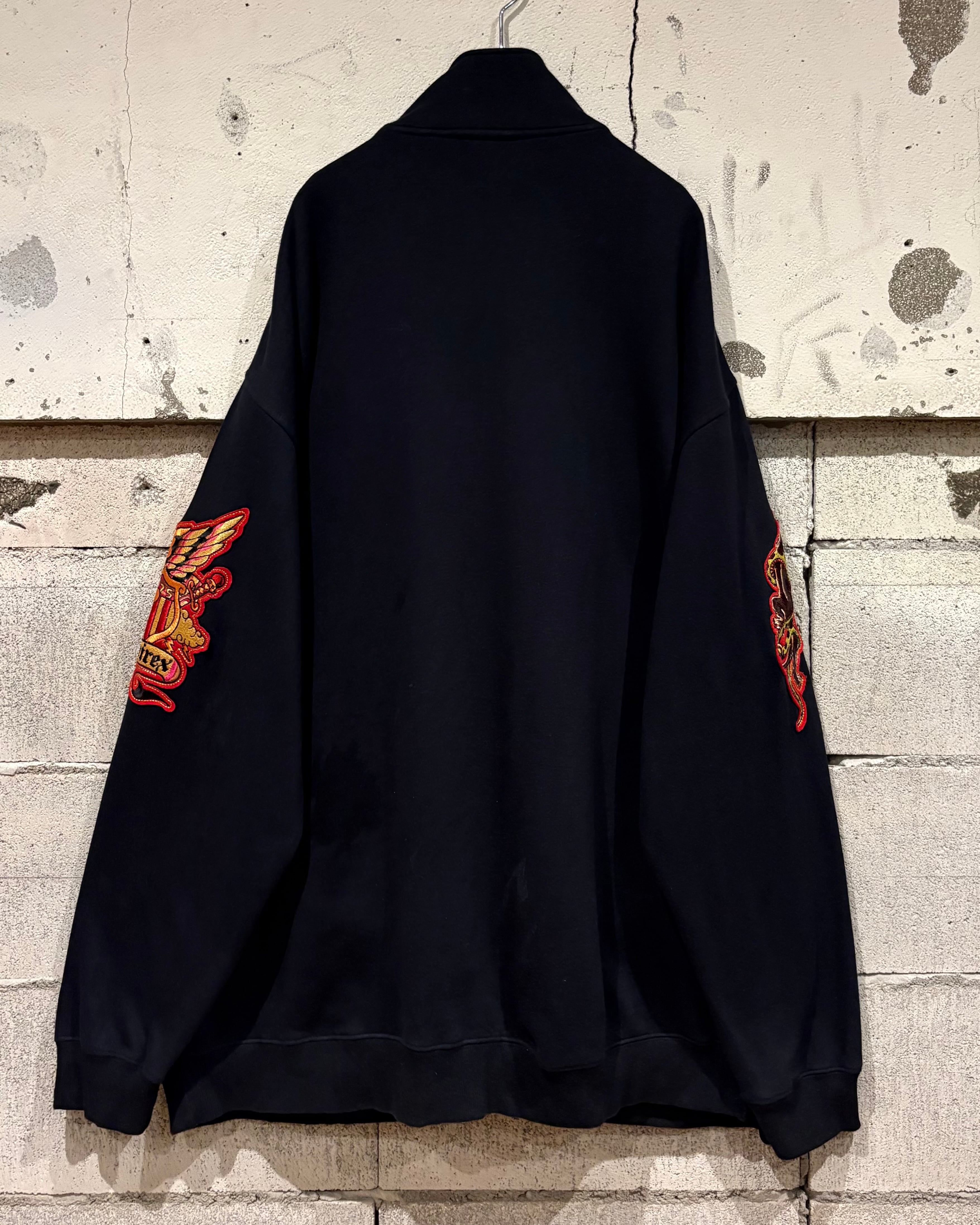 ブラックボディを基調に、フロント全体に大判で描かれた鷹のプリント、さらに胸元・袖・背面にまで重厚な刺繍ワッペンを散りばめた、圧倒的な存在感を放つ1着。