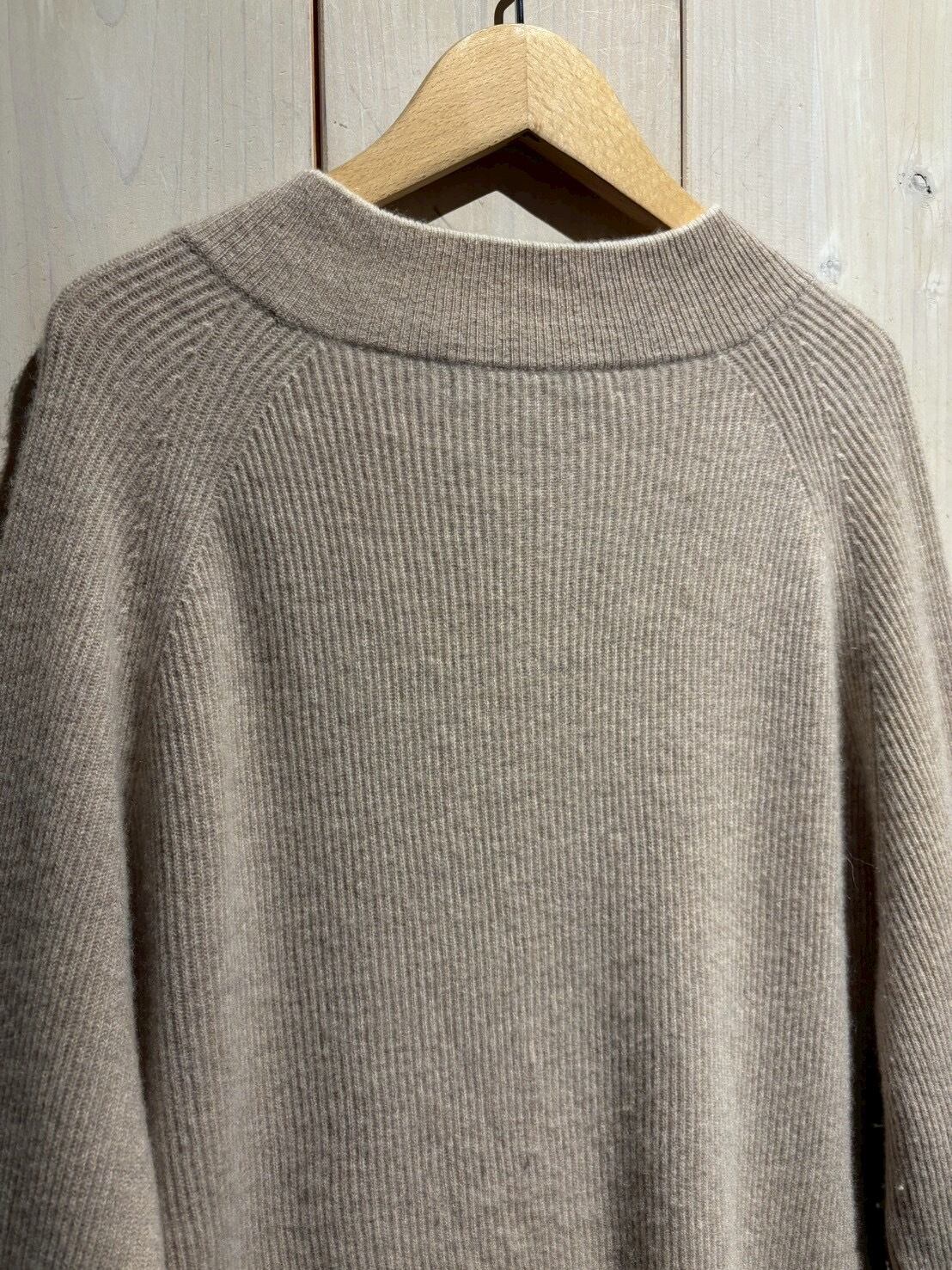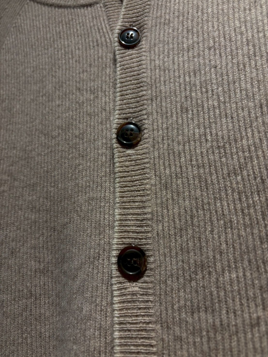 カラーは上品なライトベージュトーン。光を柔らかく反射するナチュラルな発色は、シンプルながらもラグジュアリーな印象を与え、落ち着きを漂わせます。フロントにはボタンが並び、品のあるアクセントを添えながらもミニマルなデザイン。リブ仕様のネックラインや袖口、裾はシルエットをすっきりと整え、リラックス感と高級感を両立させています。