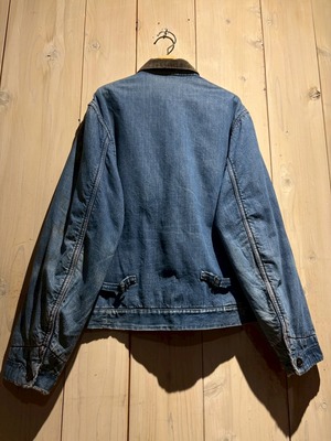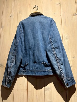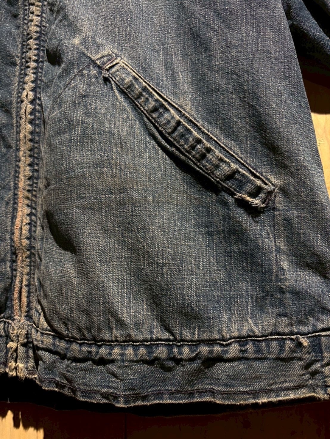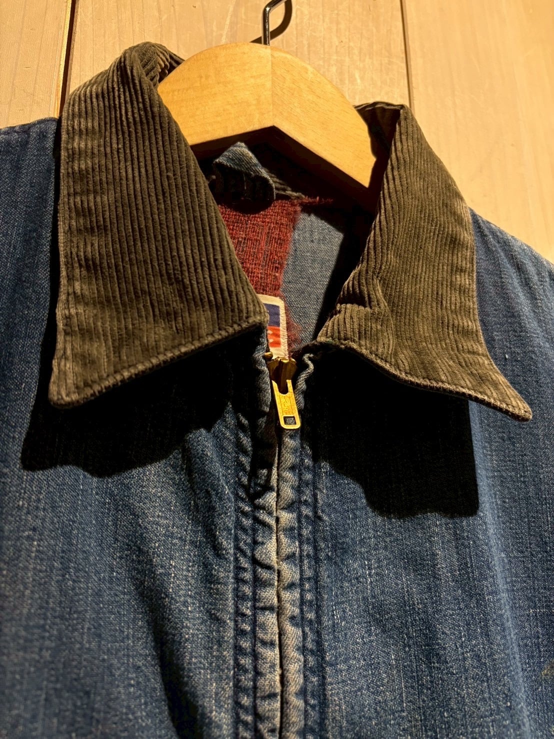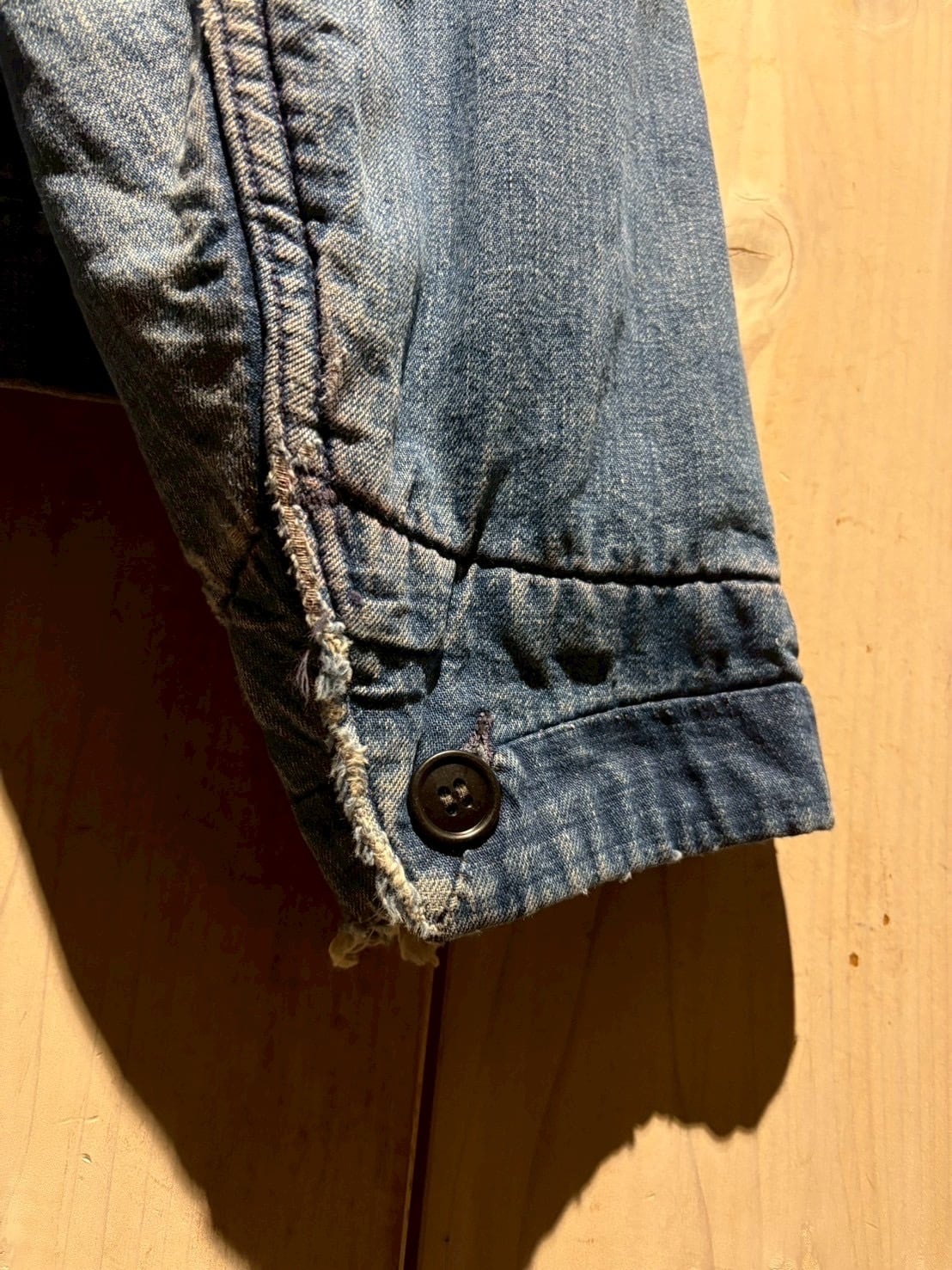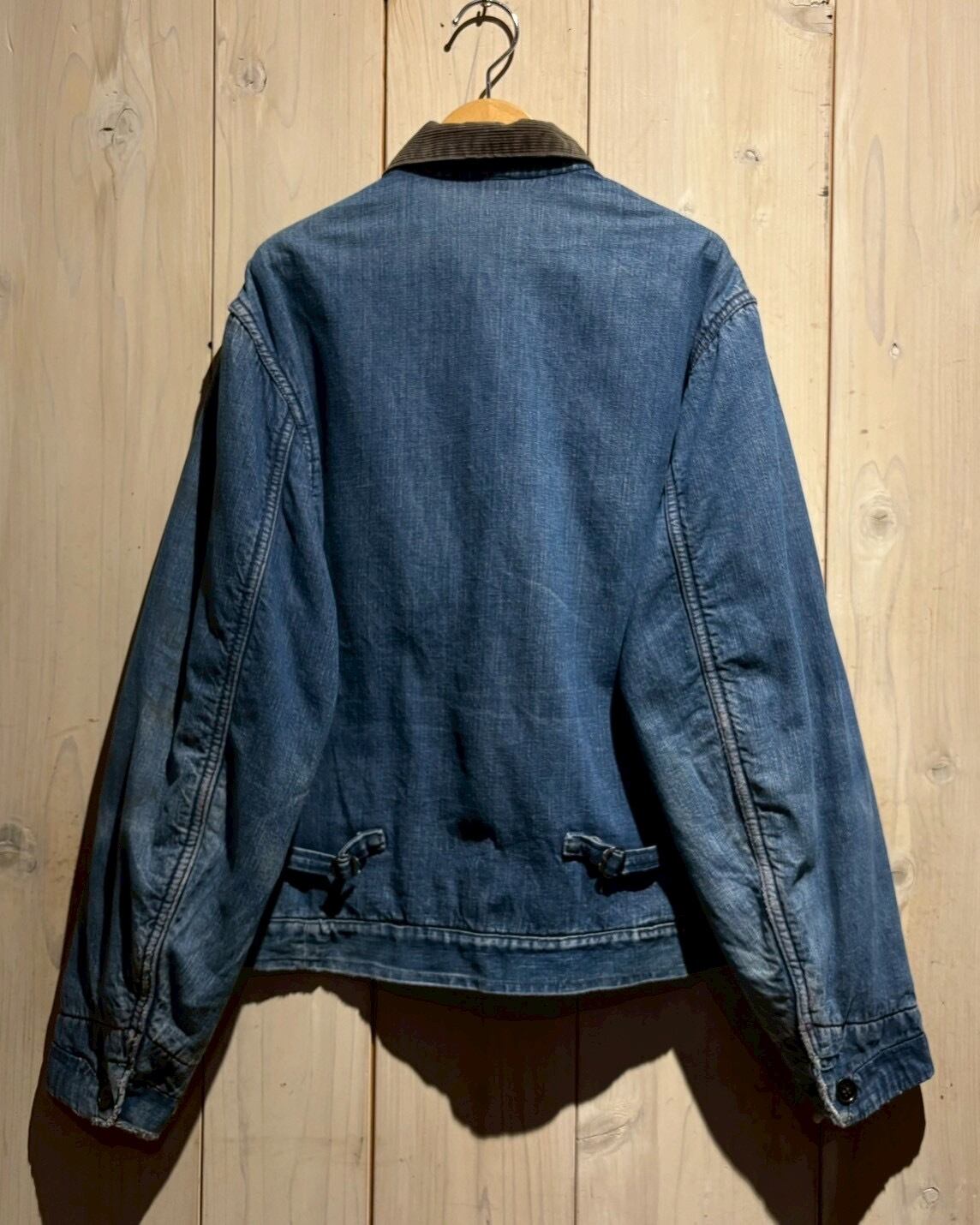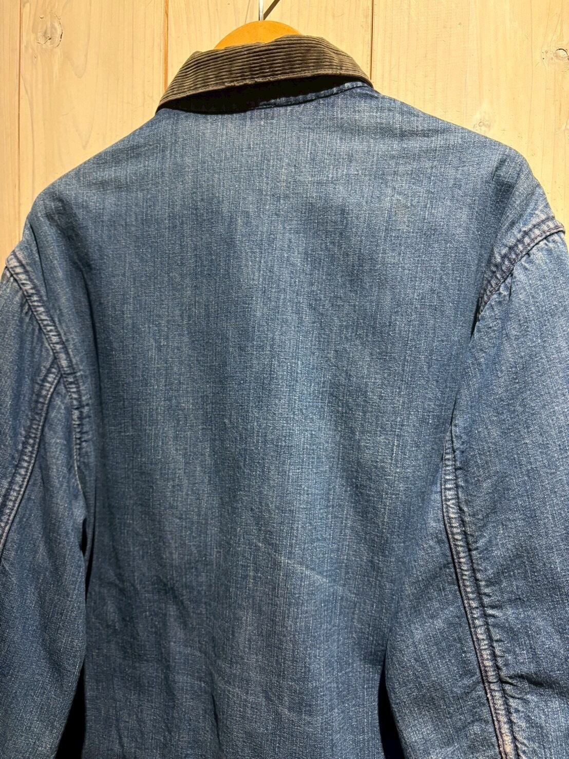 ボディにはタフなデニムを使用し、着込まれたことで生まれる自然なフェードやアタリが一点物ならではの表情を形成。無骨ながらも深みある経年変化は、まさにヴィンテージデニムの真骨頂。さらに襟にはブラウンのコーデュロイを切り替えており、デザイン面でのアクセントはもちろん、耐久性を高める役割も果たしています。