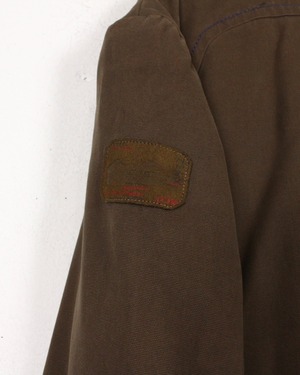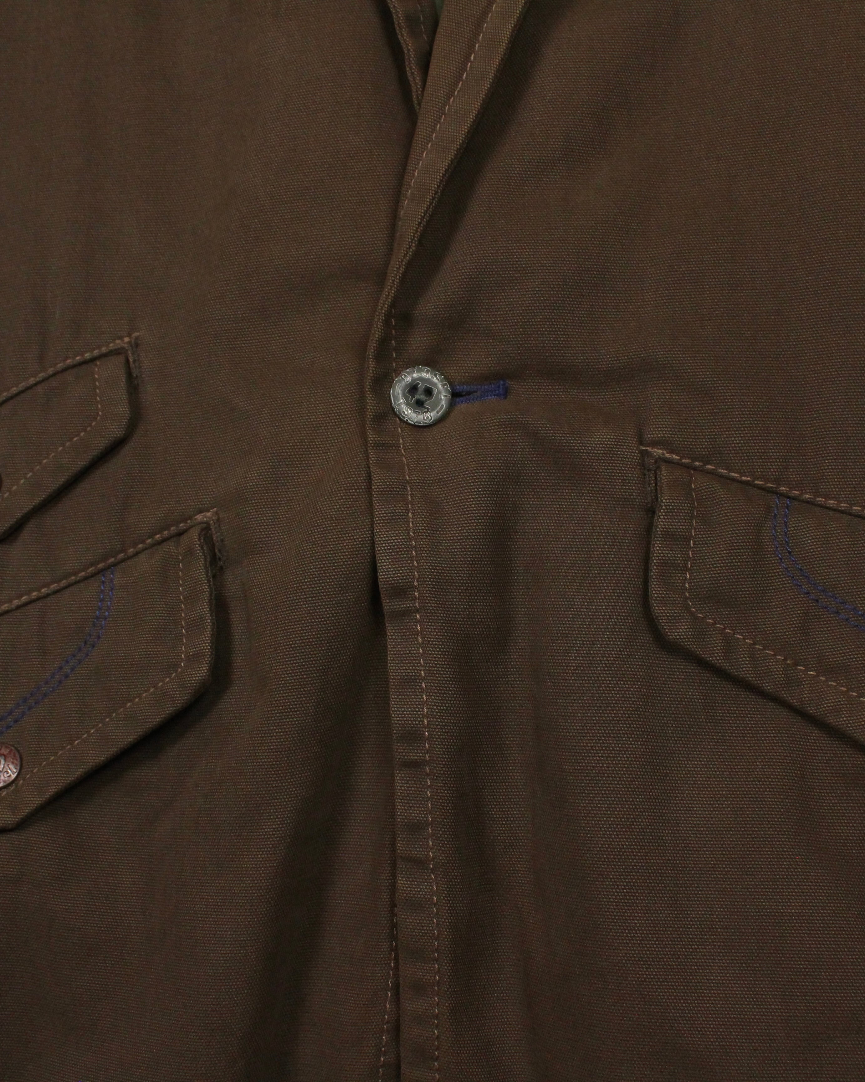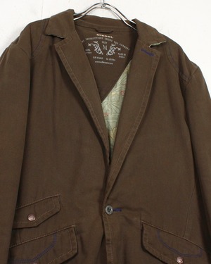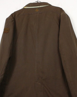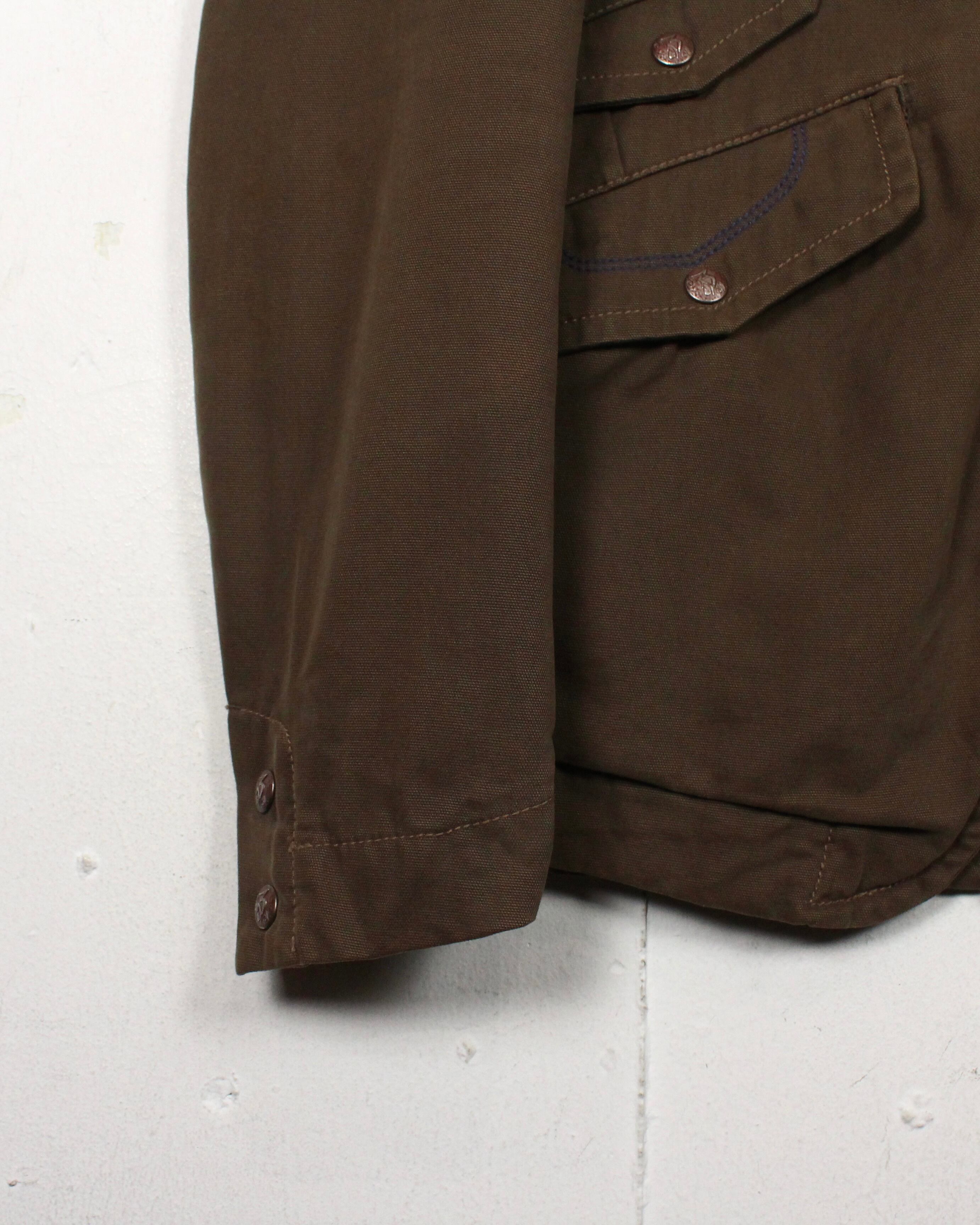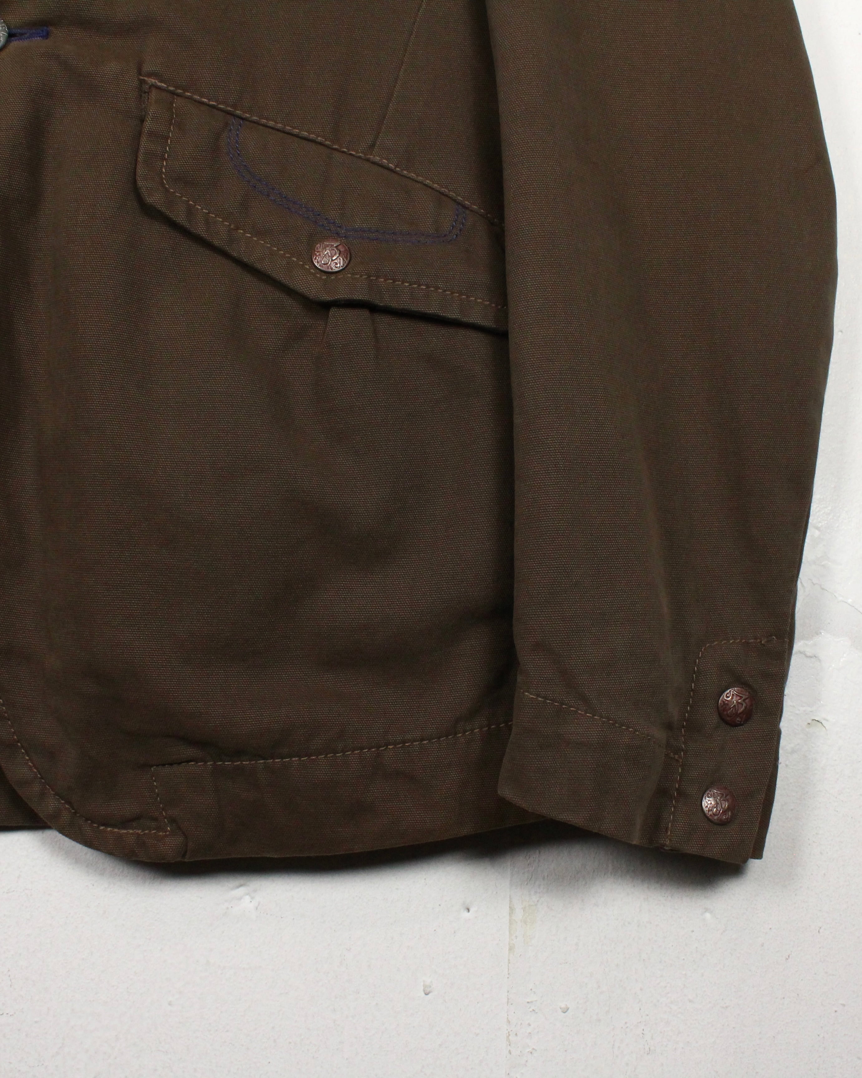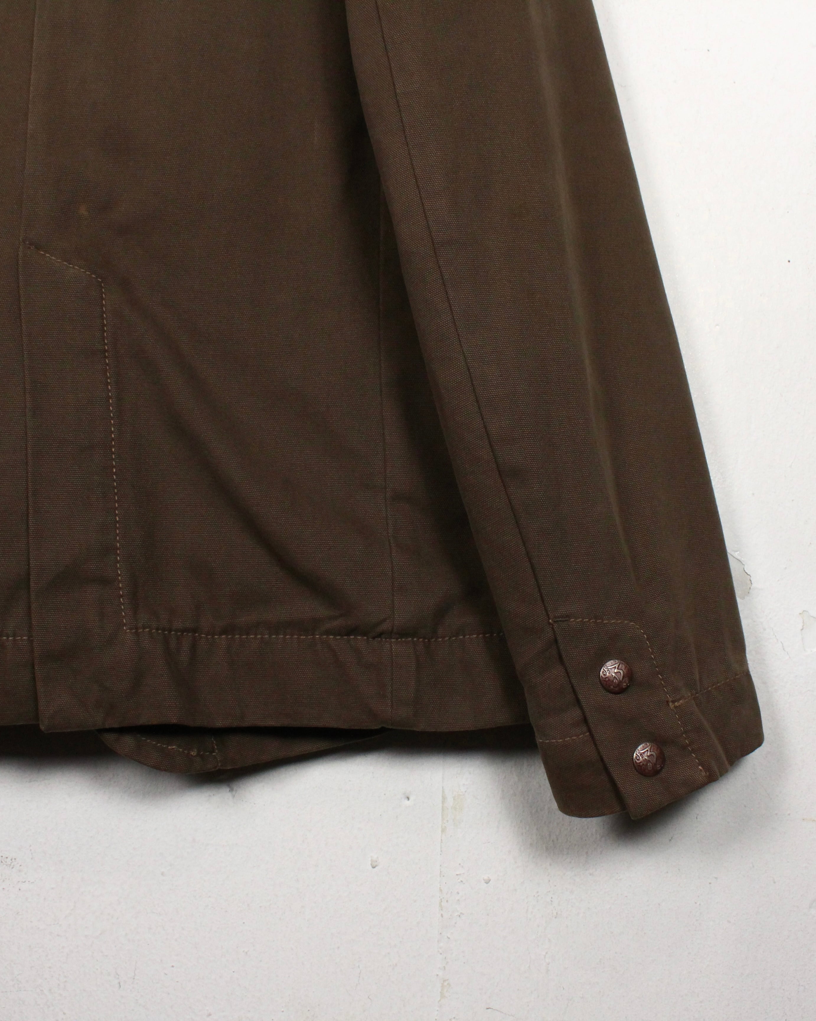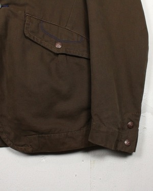 ボディにはタフなダック地を使用し、程良いハリと経年による味わいを楽しめる素材感。深みあるブラウンの色味が、ワークジャケットとしての無骨さを際立たせつつ、テーラード型のディテールが洗練された印象を与えています。