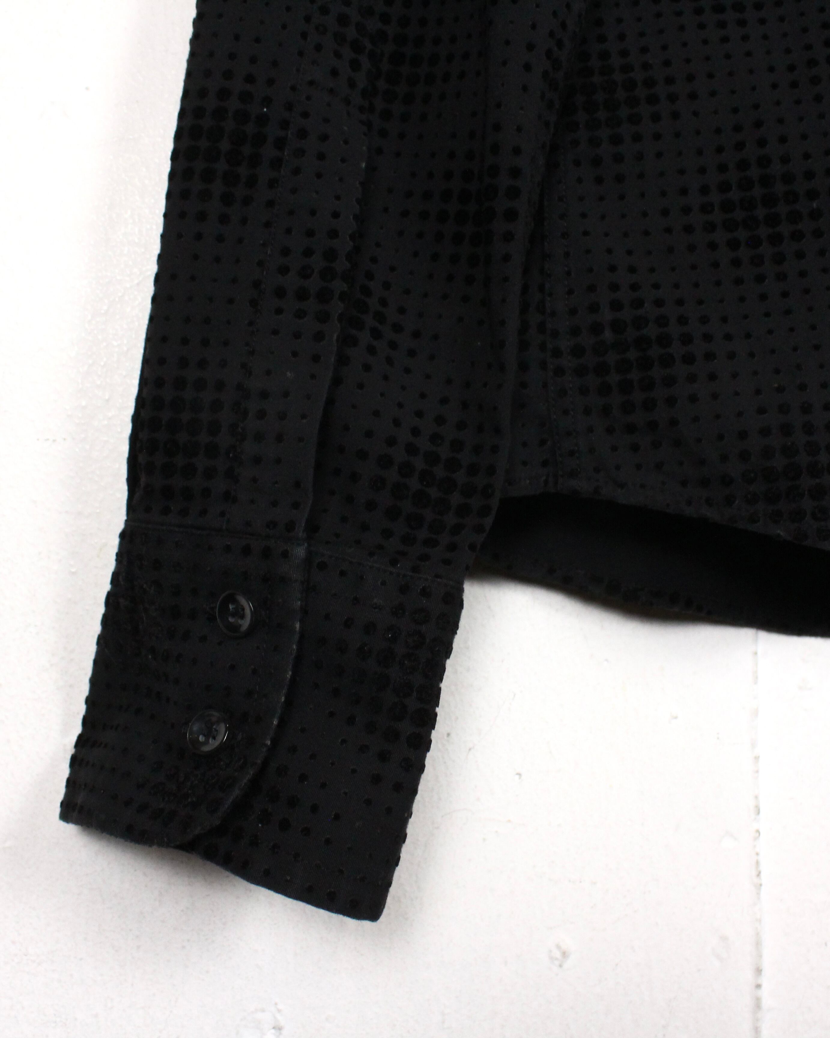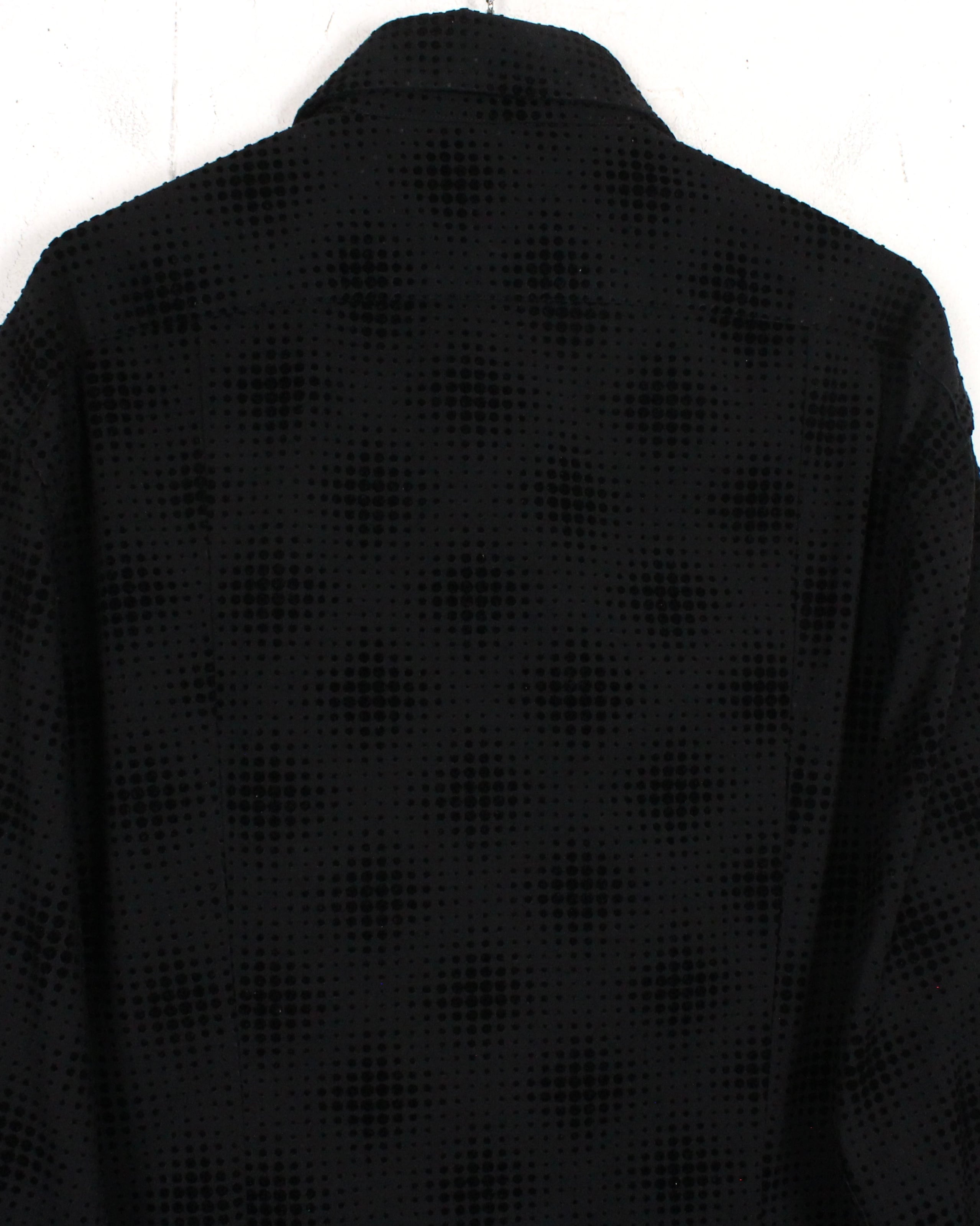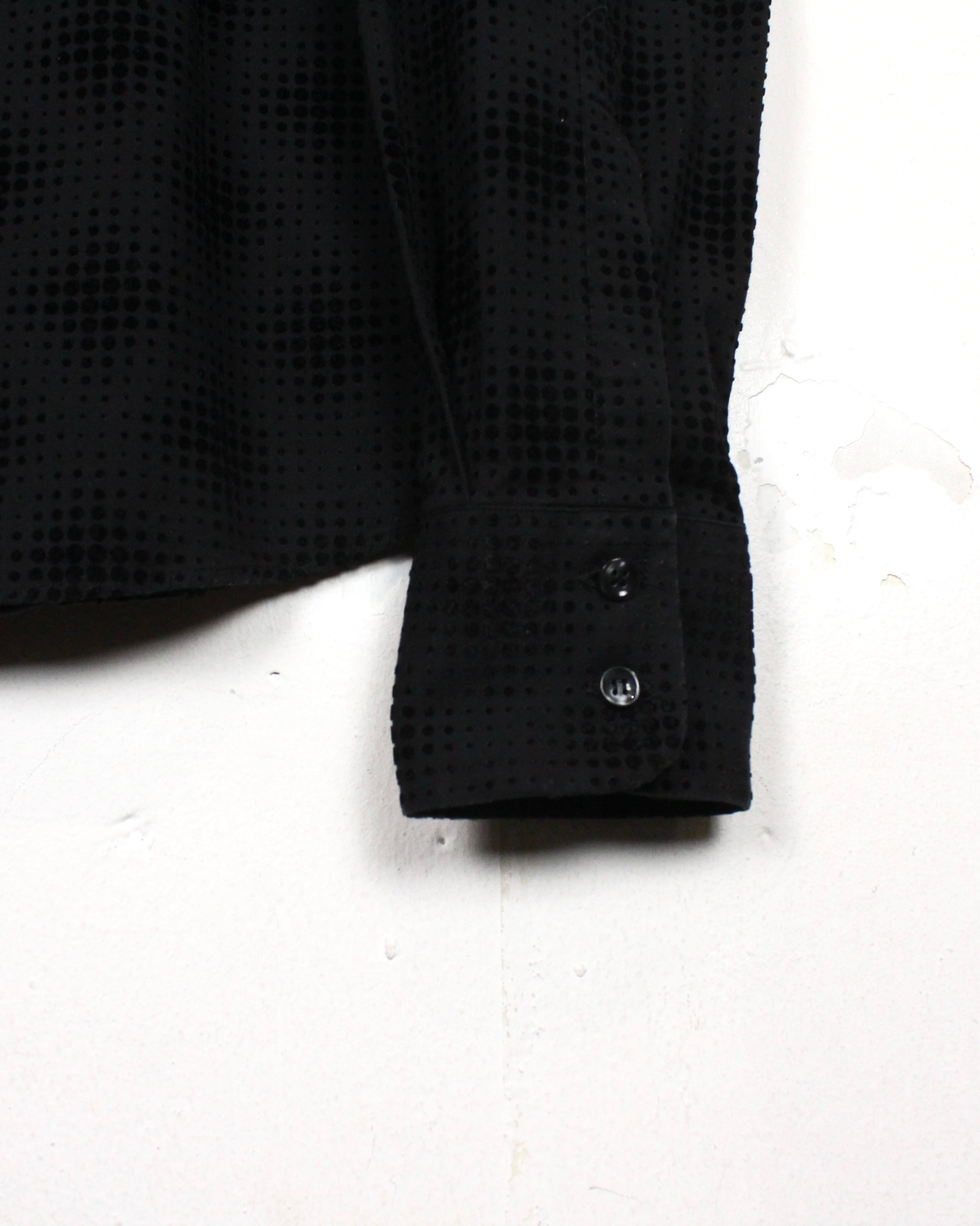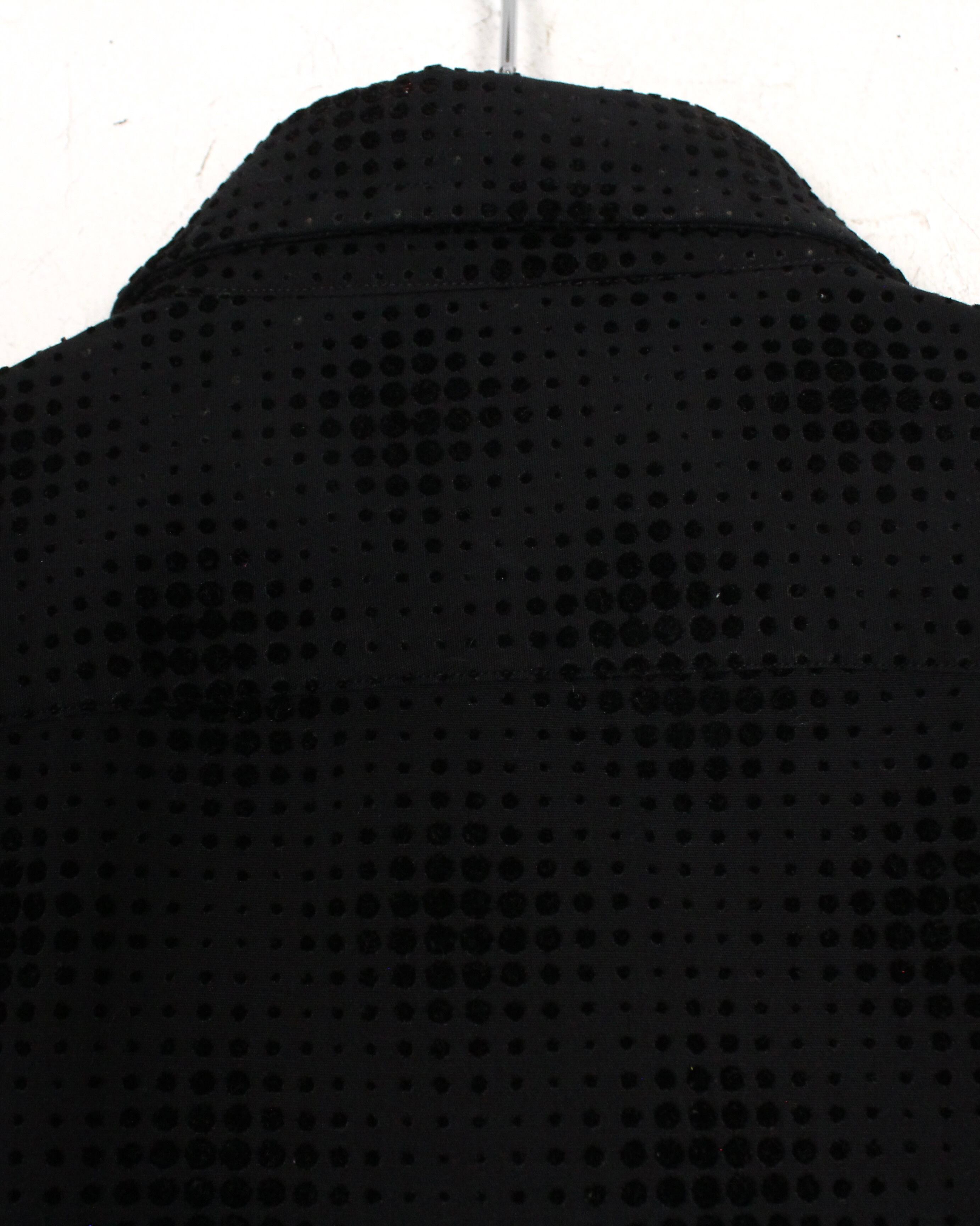 ブラックをベースにしたボディ全体に、フロッキープリントで立体感のあるドット模様をあしらった1着。