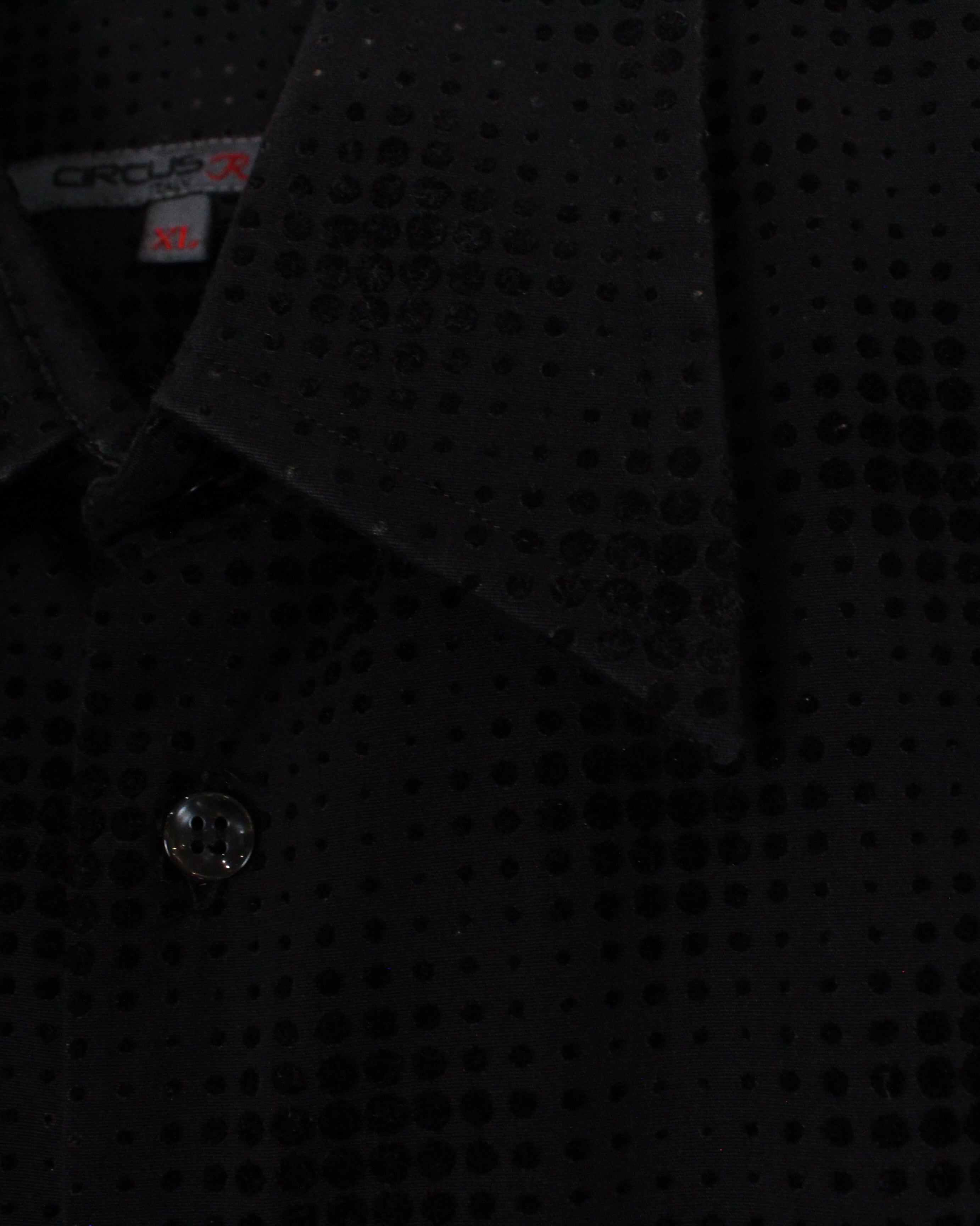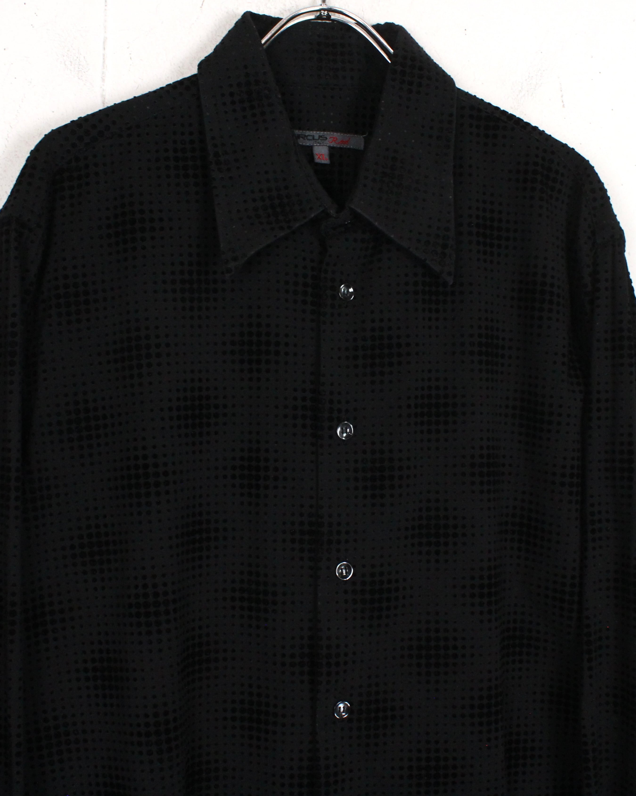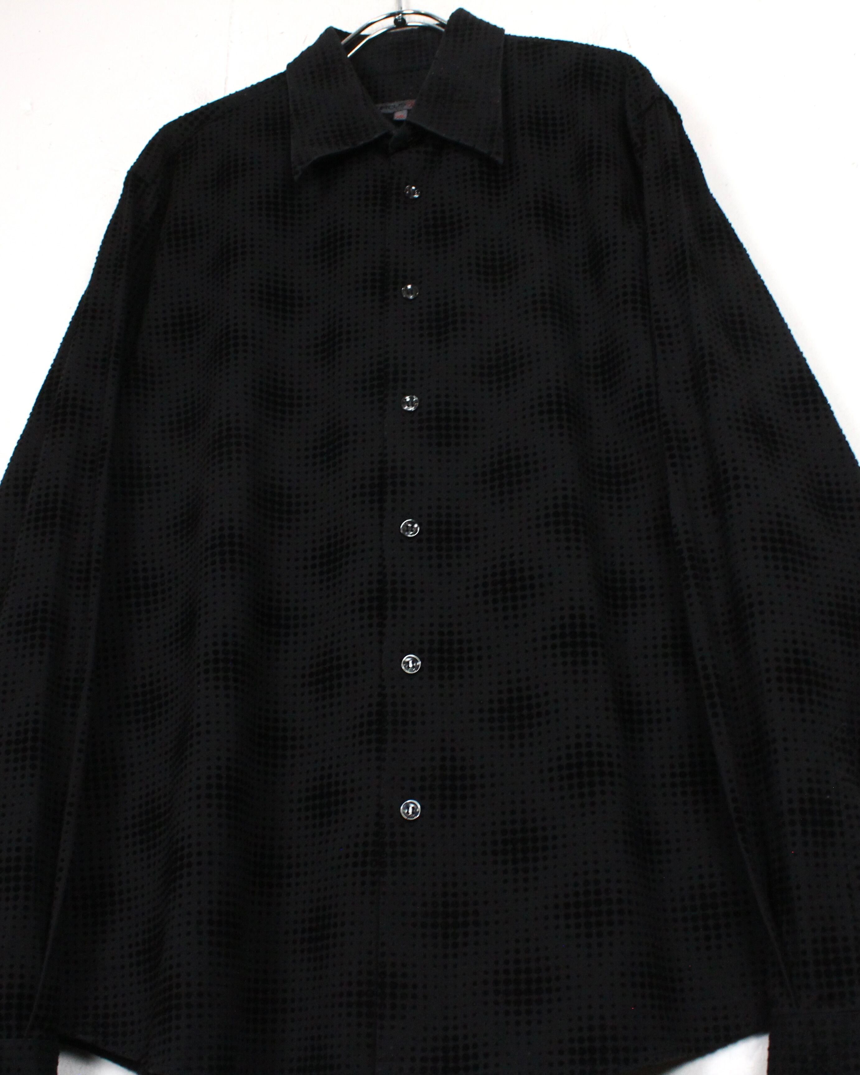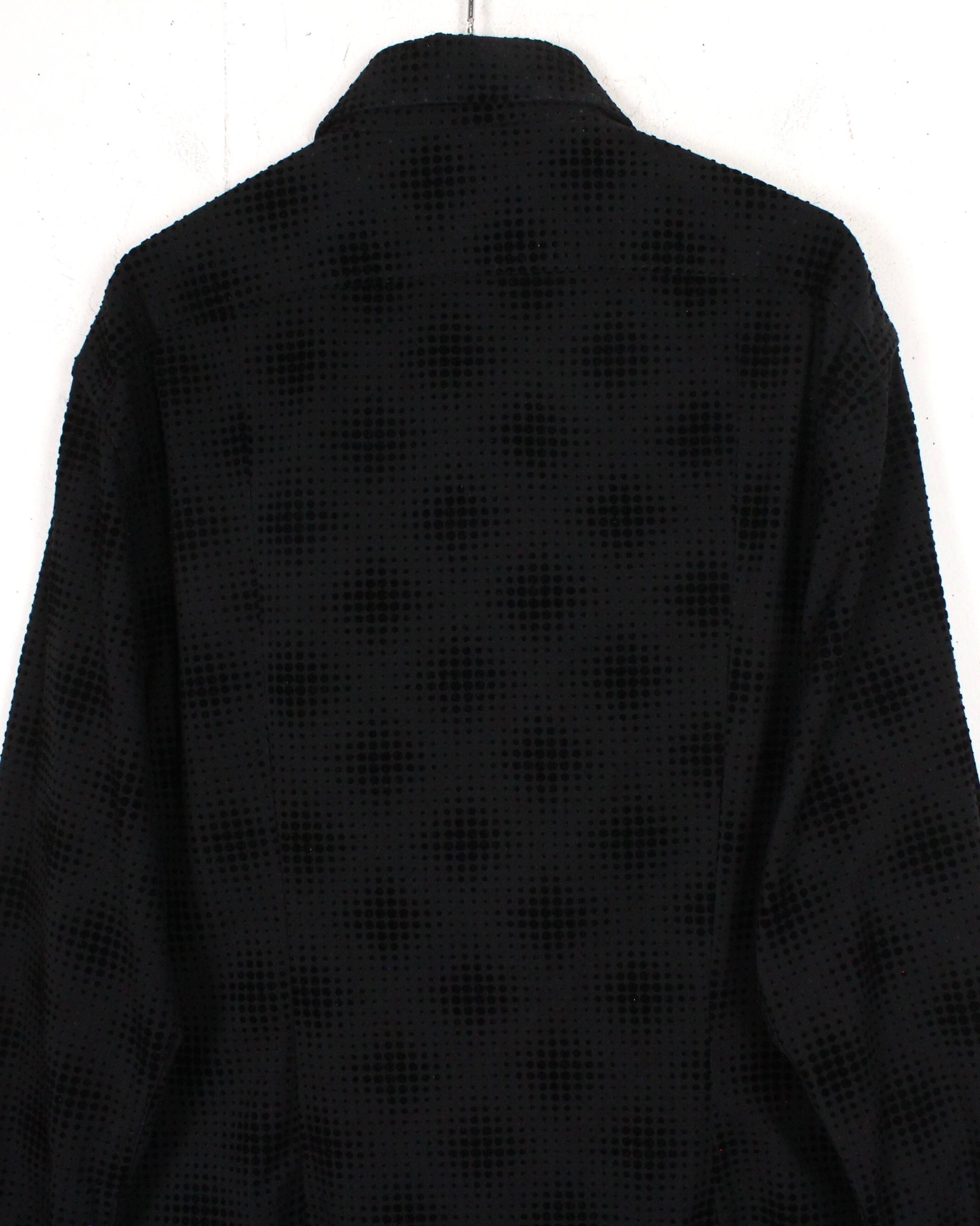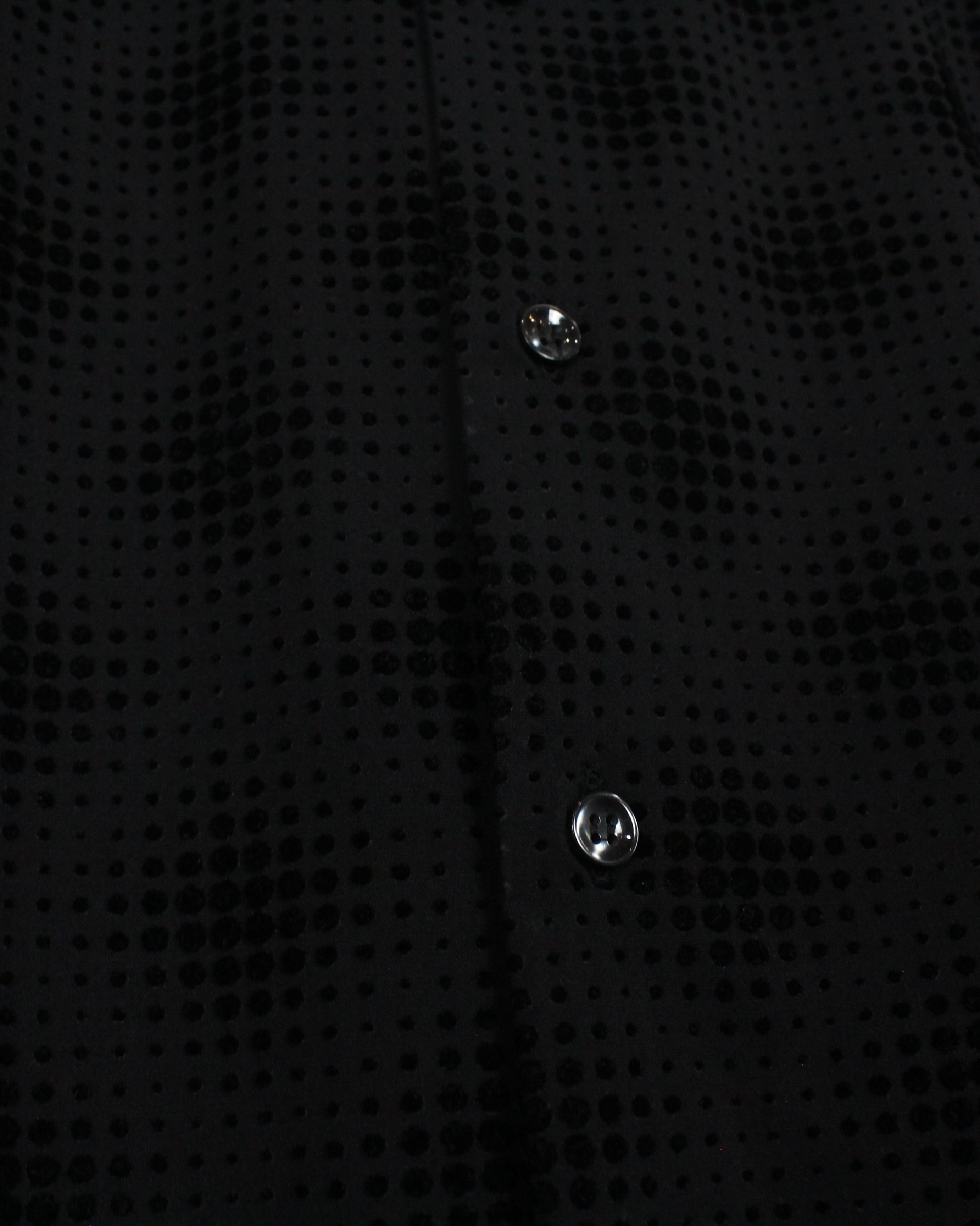 ブラックをベースにしたボディ全体に、フロッキープリントで立体感のあるドット模様をあしらった1着。