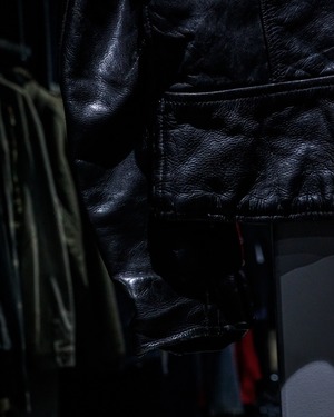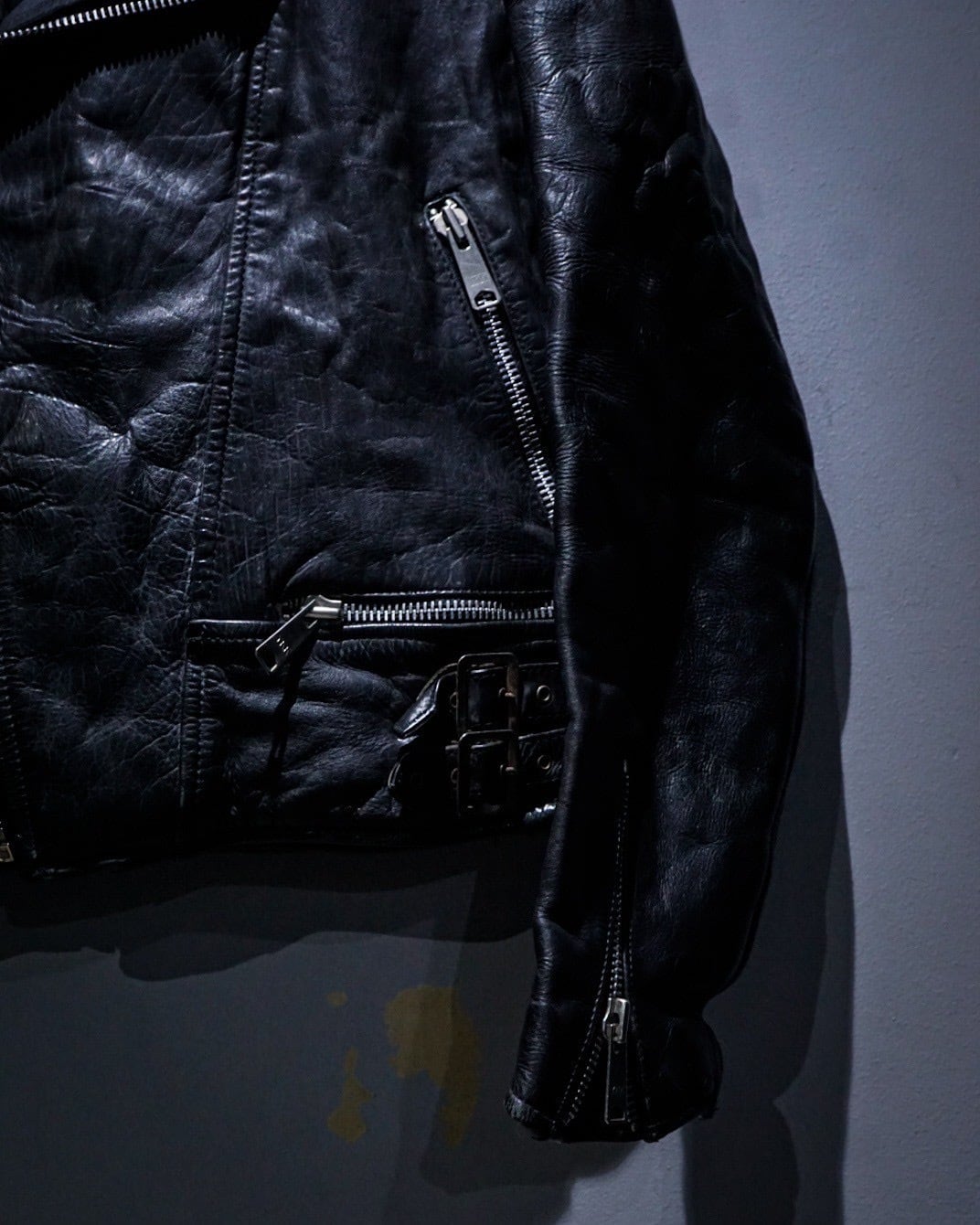 しっとりとした艶と力強いシワ感を刻んだブラックレザーは、長年の着用によってしか生まれない深みを帯び、唯一無二の存在感を放っています。