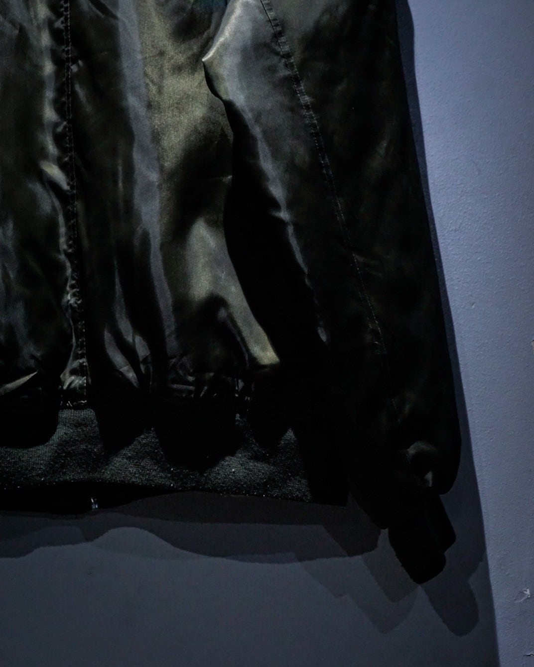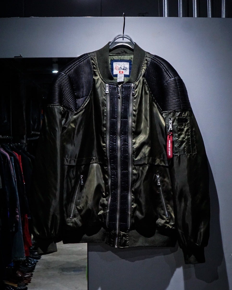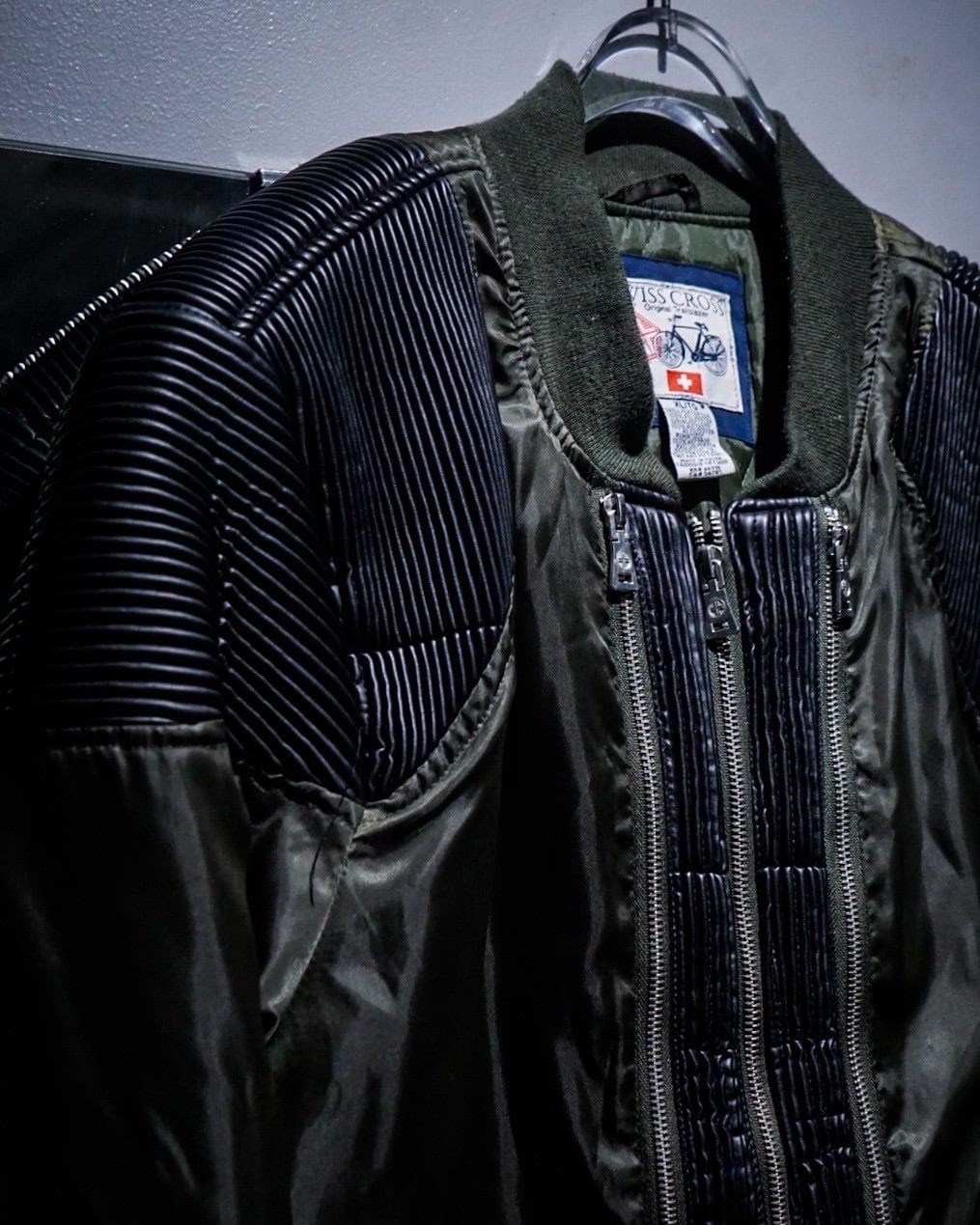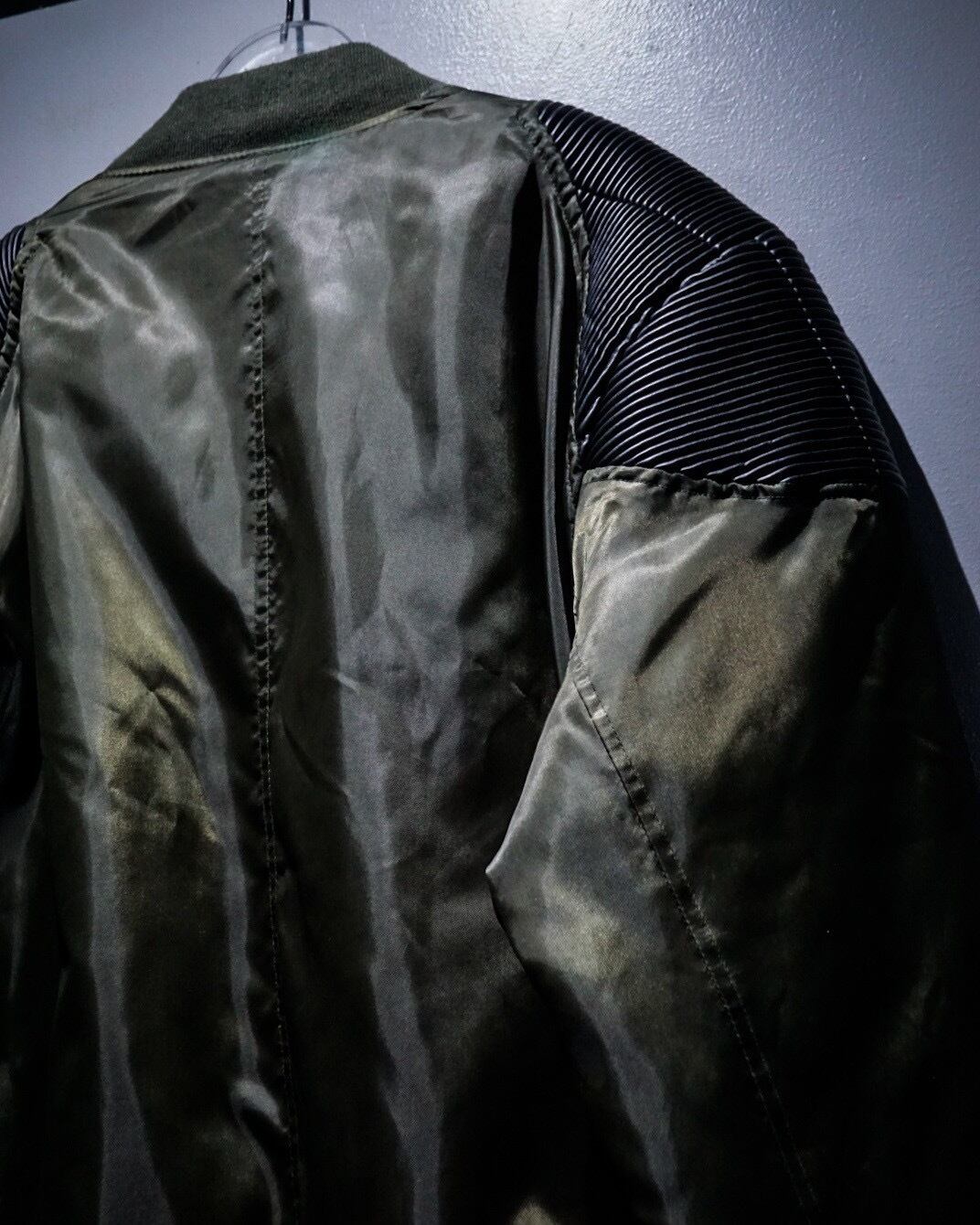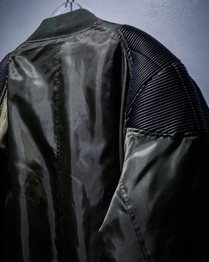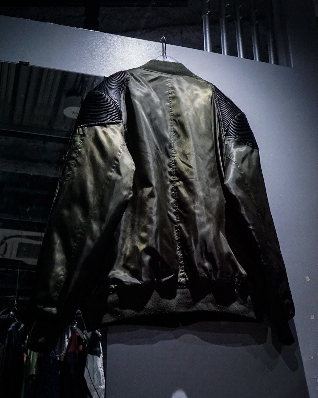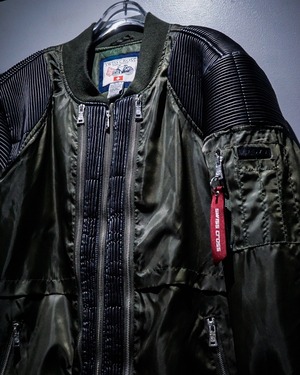 オリーブの光沢感あるシェルをベースに、フロントにはダブルジップを縦に2本走らせ、その両脇をブラックのフェイクレザーで切り替えた独創的なボンバージャケット。