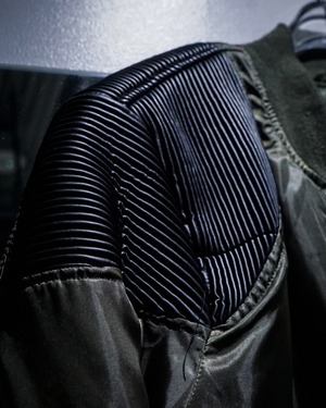 ショルダー部分にもフェイクレザーを用い、立体的なパッドライクの表情を加えることで、まるでプロテクターを備えたかのような無骨で迫力のあるルックスに仕上げています。