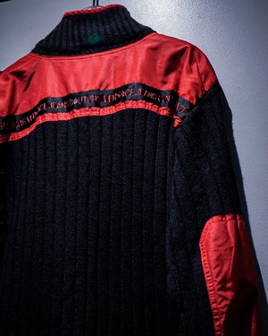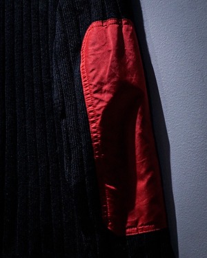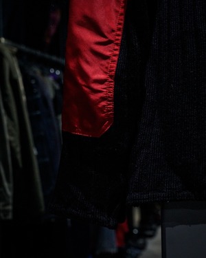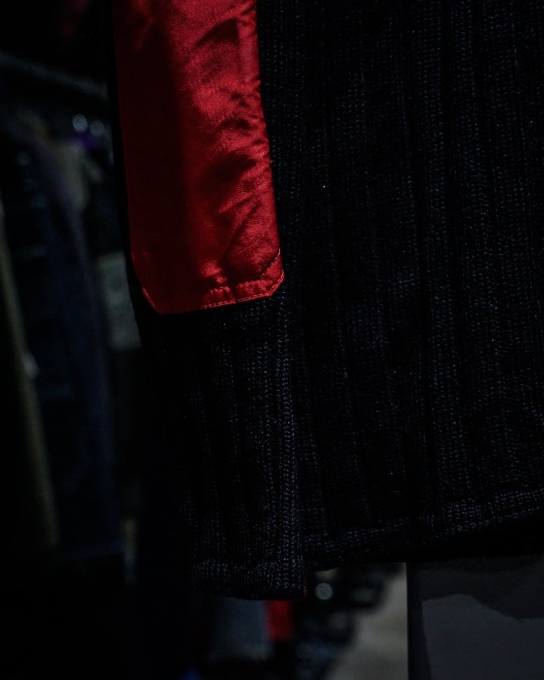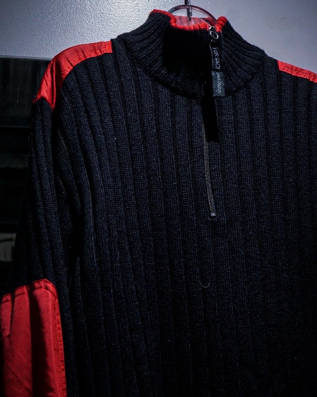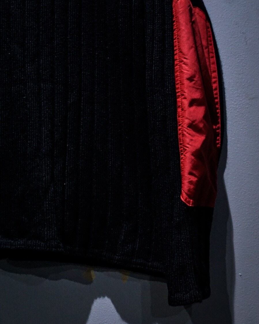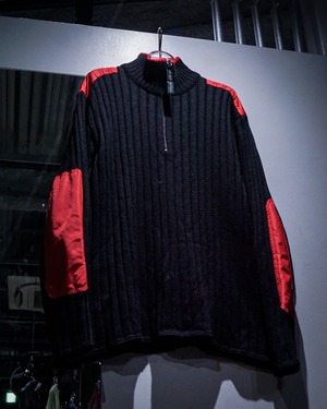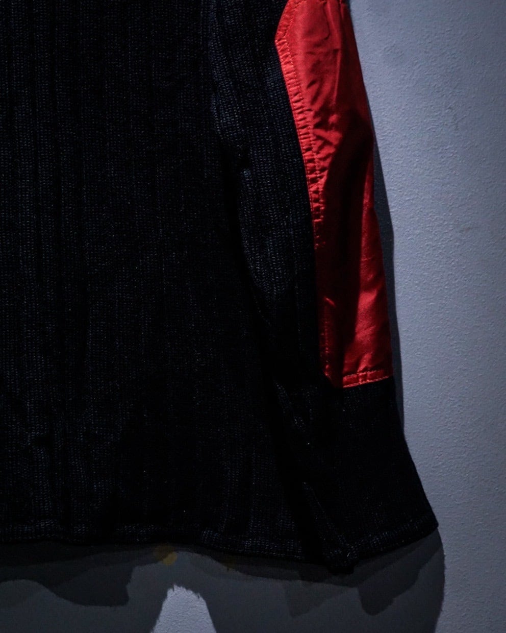 肉厚なリブ編みのボディをベースに、肩からエルボーへと鮮烈なレッドナイロンの切り替えを大胆に配置したハーフジップニット。