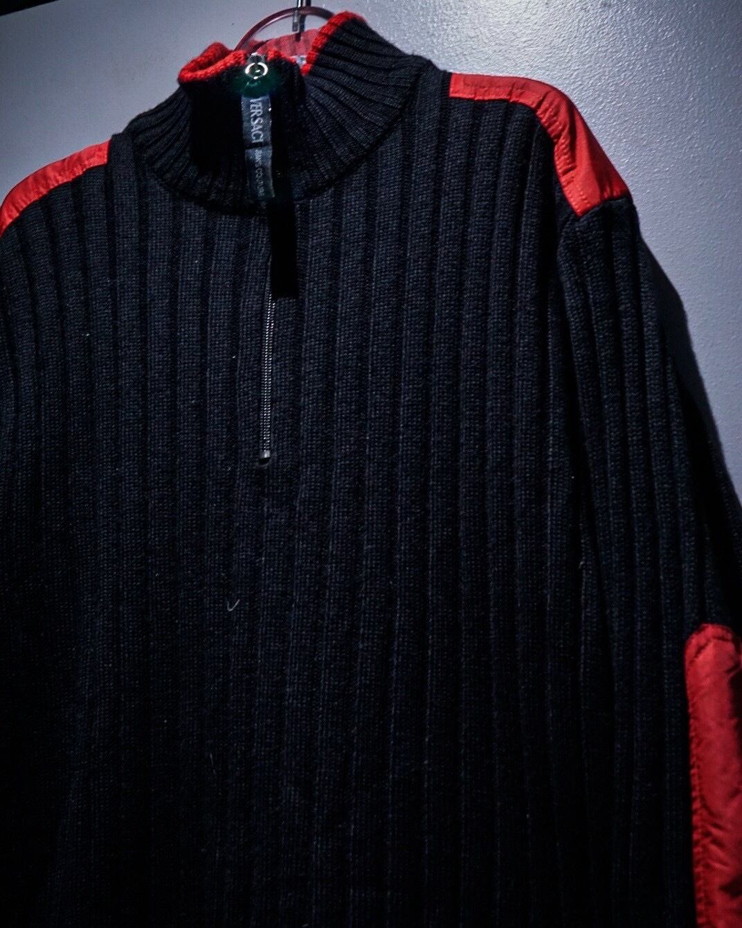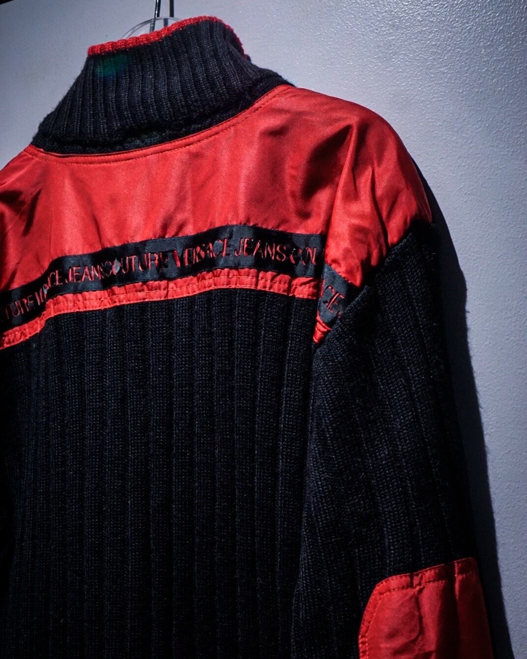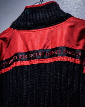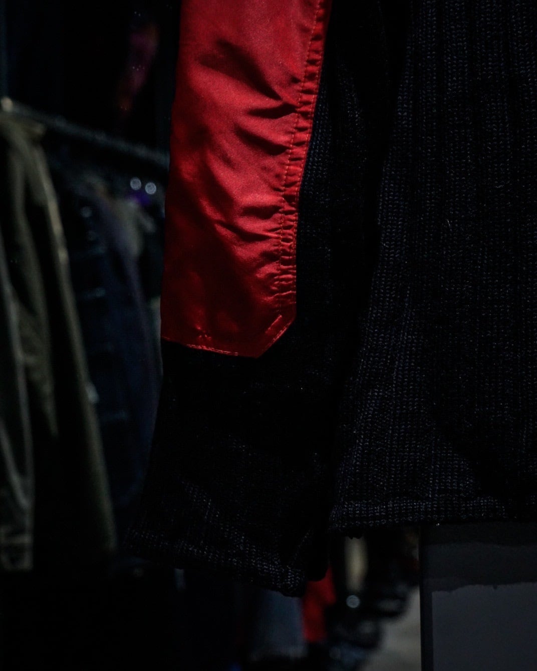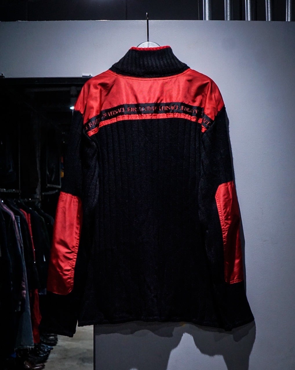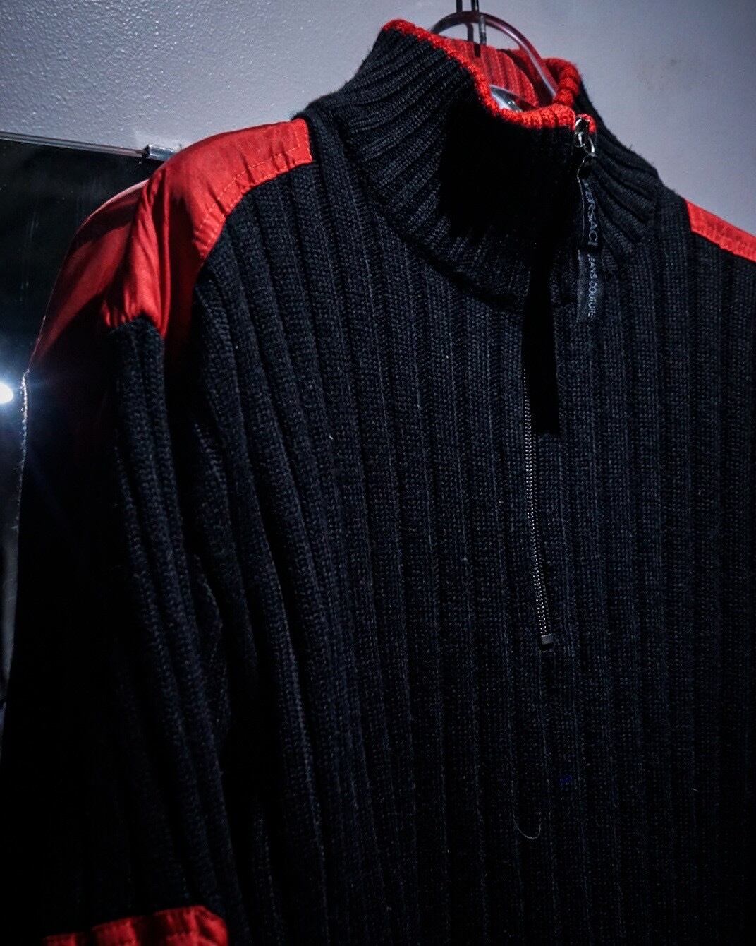 肉厚なリブ編みのボディをベースに、肩からエルボーへと鮮烈なレッドナイロンの切り替えを大胆に配置したハーフジップニット。