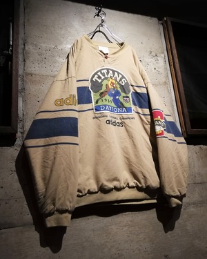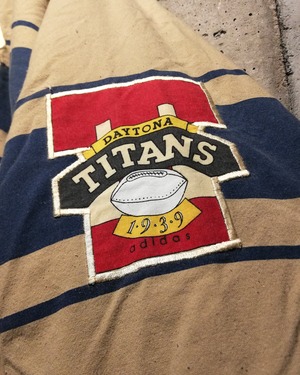 ベージュ×ネイビーの2色をベースとし、アメリカンフットボールをモチーフとした、この年代ならではのレトロなデザインで仕上げられたプルオーバータイプのジャケット。