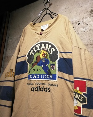 前見頃、左袖にはそれぞれアメフトのイラストを載せたデザイン、エンブレム調のパッチをON。そして右腕には"adidas"の文字に、背面はチームロゴに加えトレフォイルロゴのプリントを施した、四方八方どこから見ても抜かりのない仕上がりとなっております。