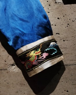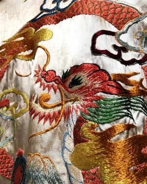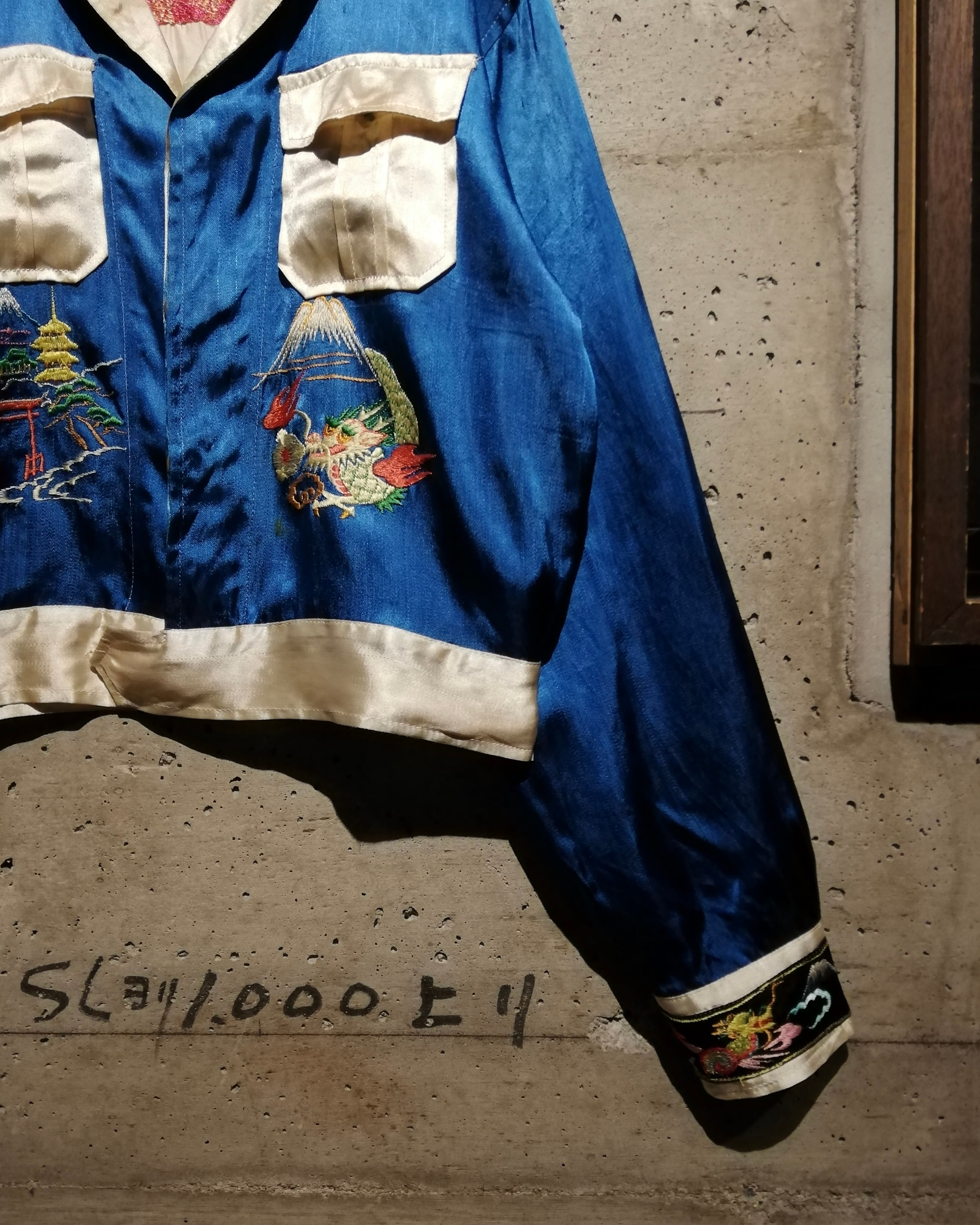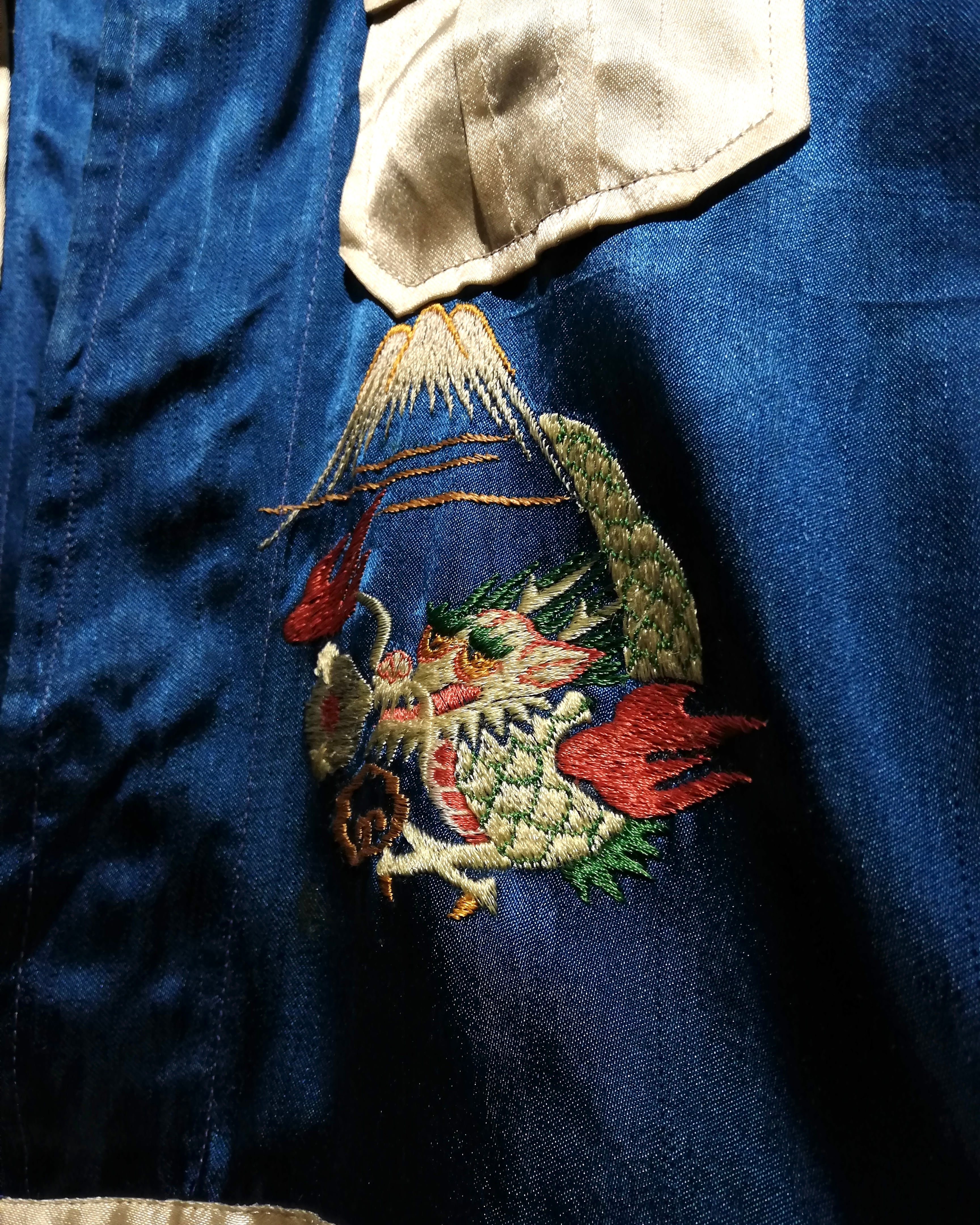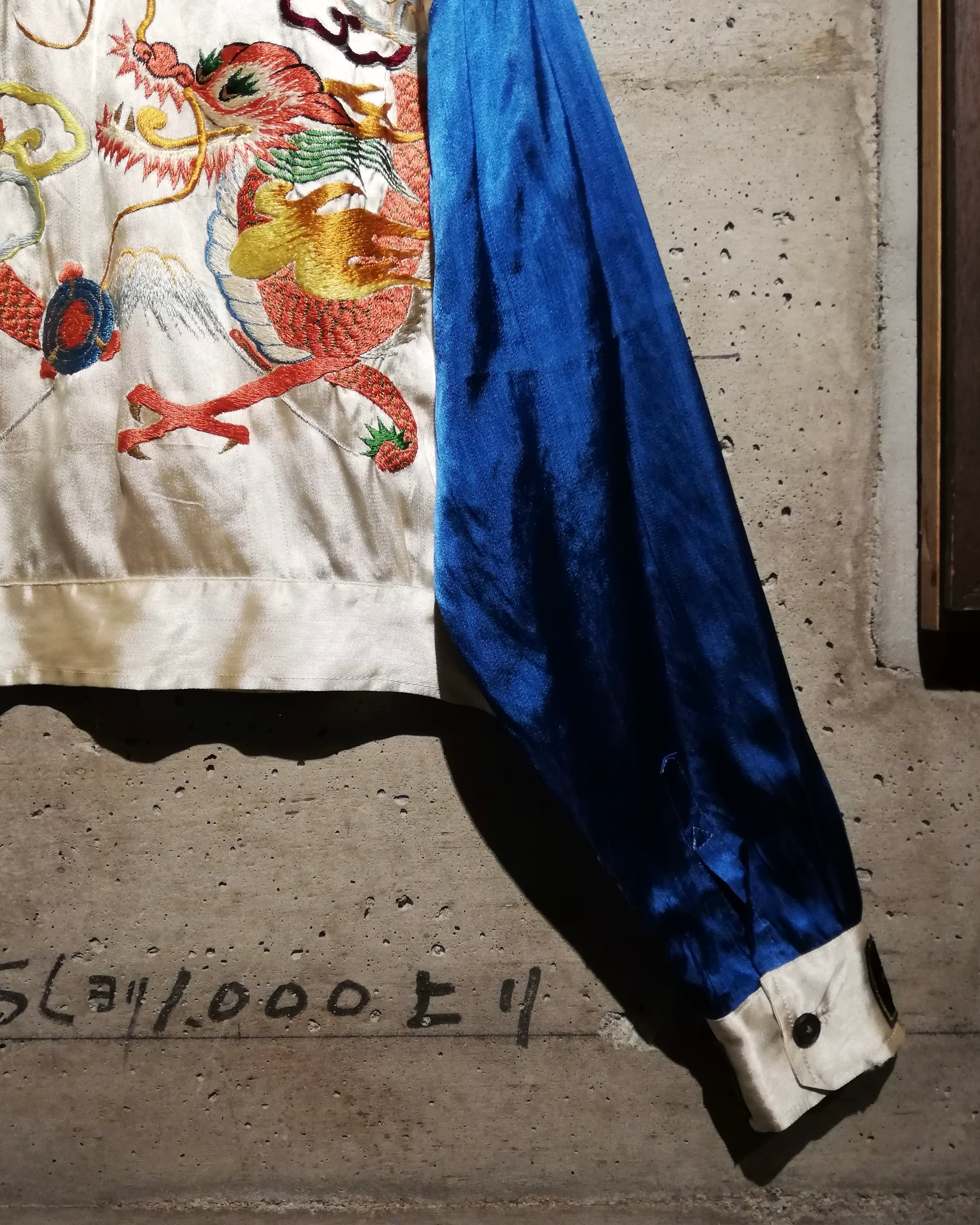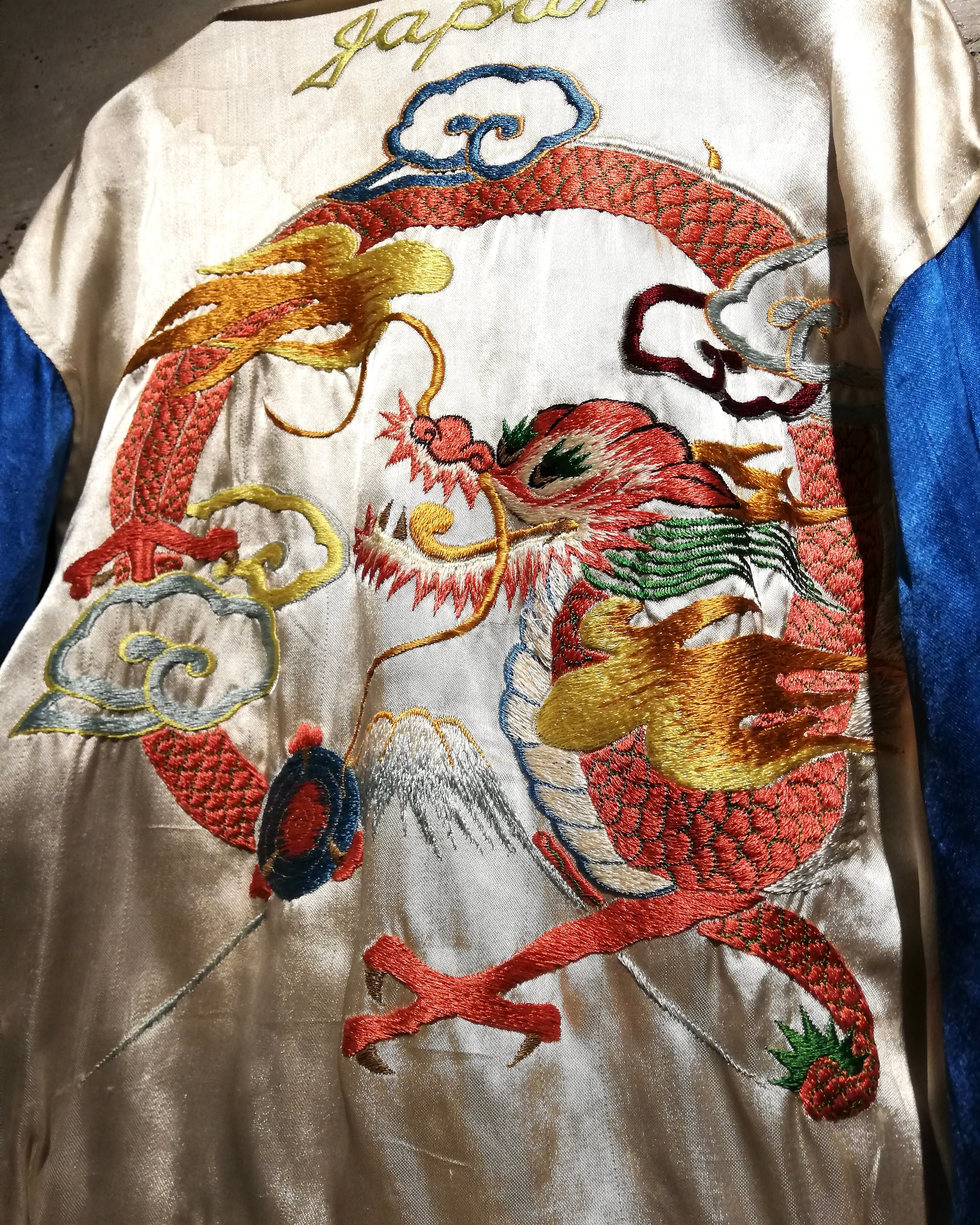 随所に施された刺繍は圧巻で、フロントには富士山や五重塔、鳥居といった日本的モチーフに加え、龍が刻み込まれた見事なオリエンタルデザイン。袖口にまで龍の刺繍が走るなど、細部に至るまで抜かりない仕上がりです。