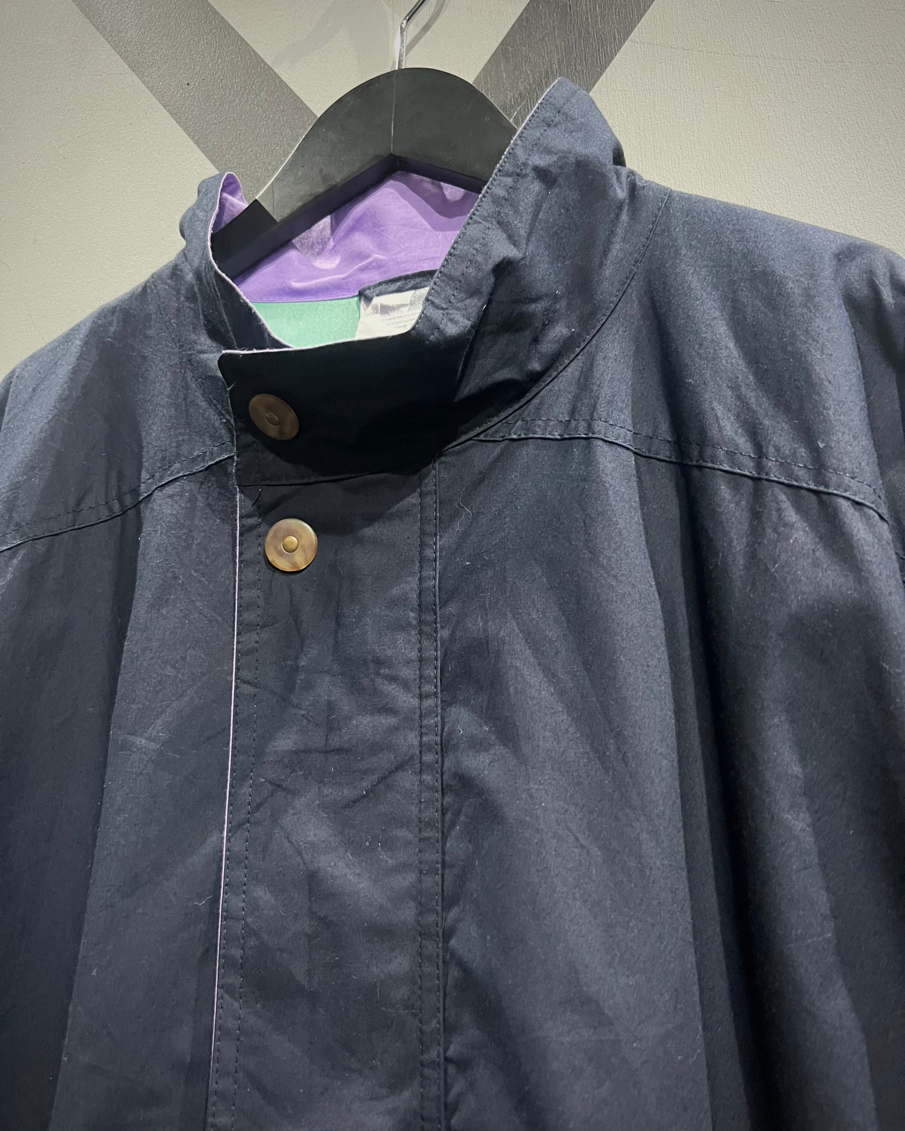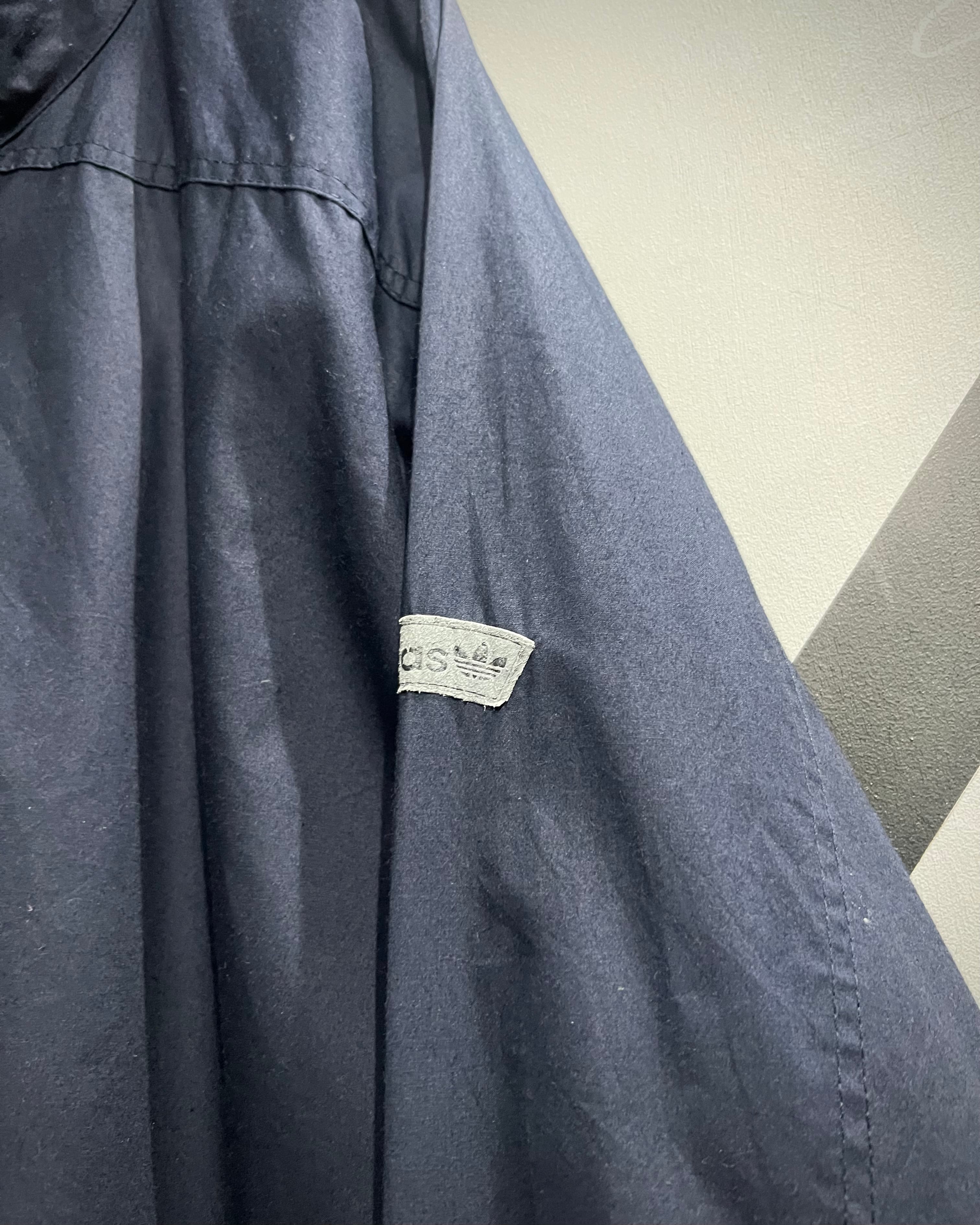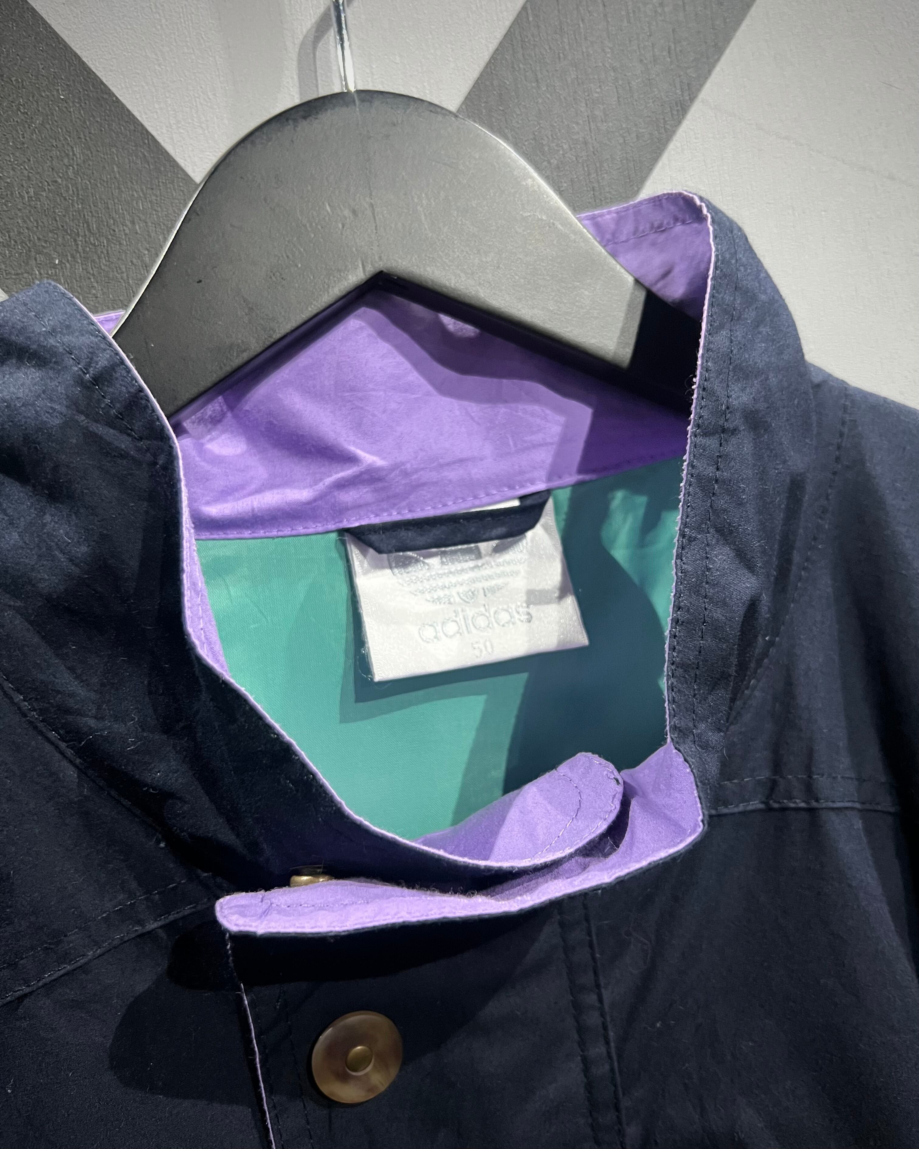 外観はシックなネイビーカラーで統一しながら、裏地にはパープルやエメラルドグリーンといった鮮やかな配色を施し、80’sらしい遊び心を存分に表現しています。このギャップの効いたデザインバランスは当時のadidasだからこそ成し得た仕上がり。
