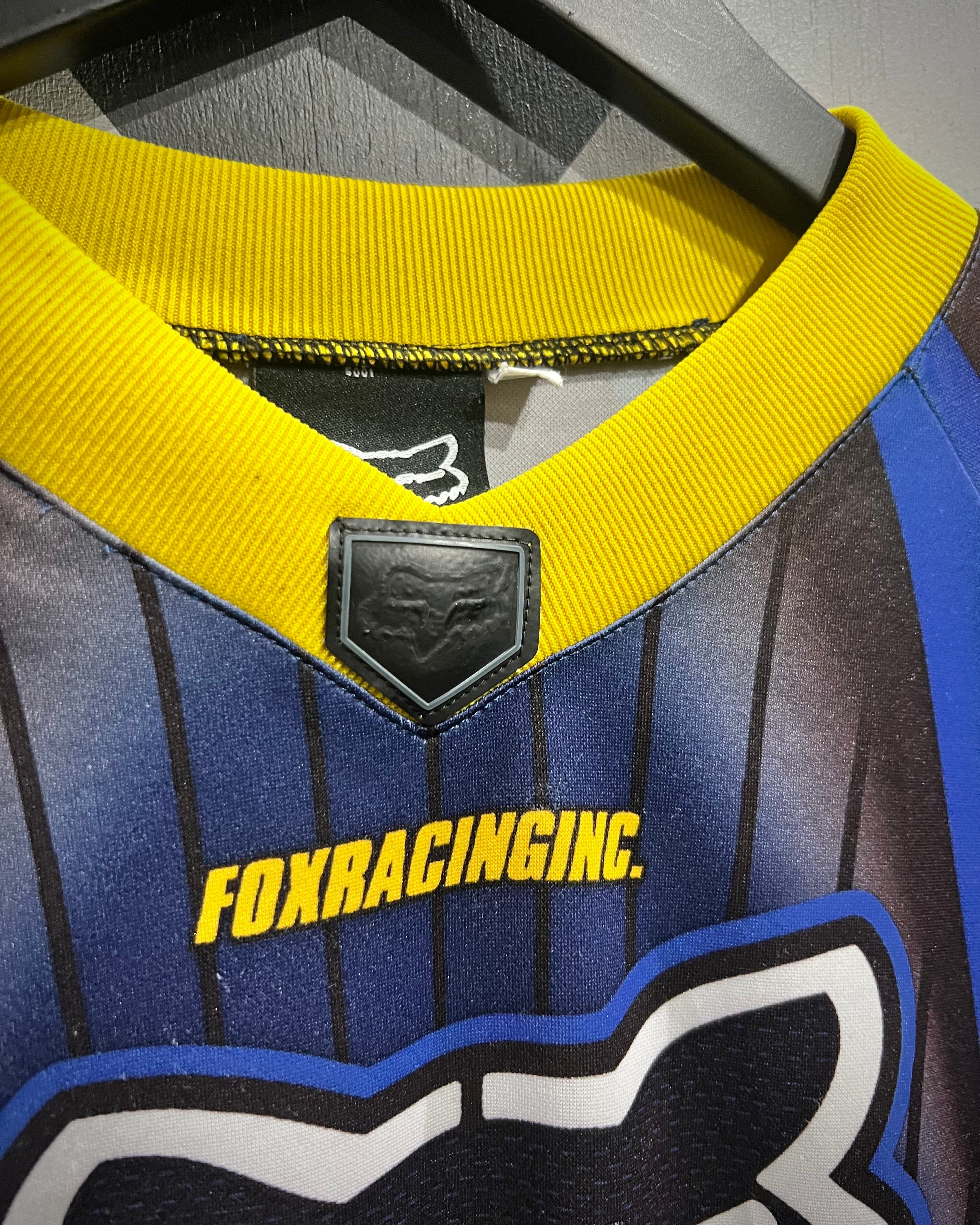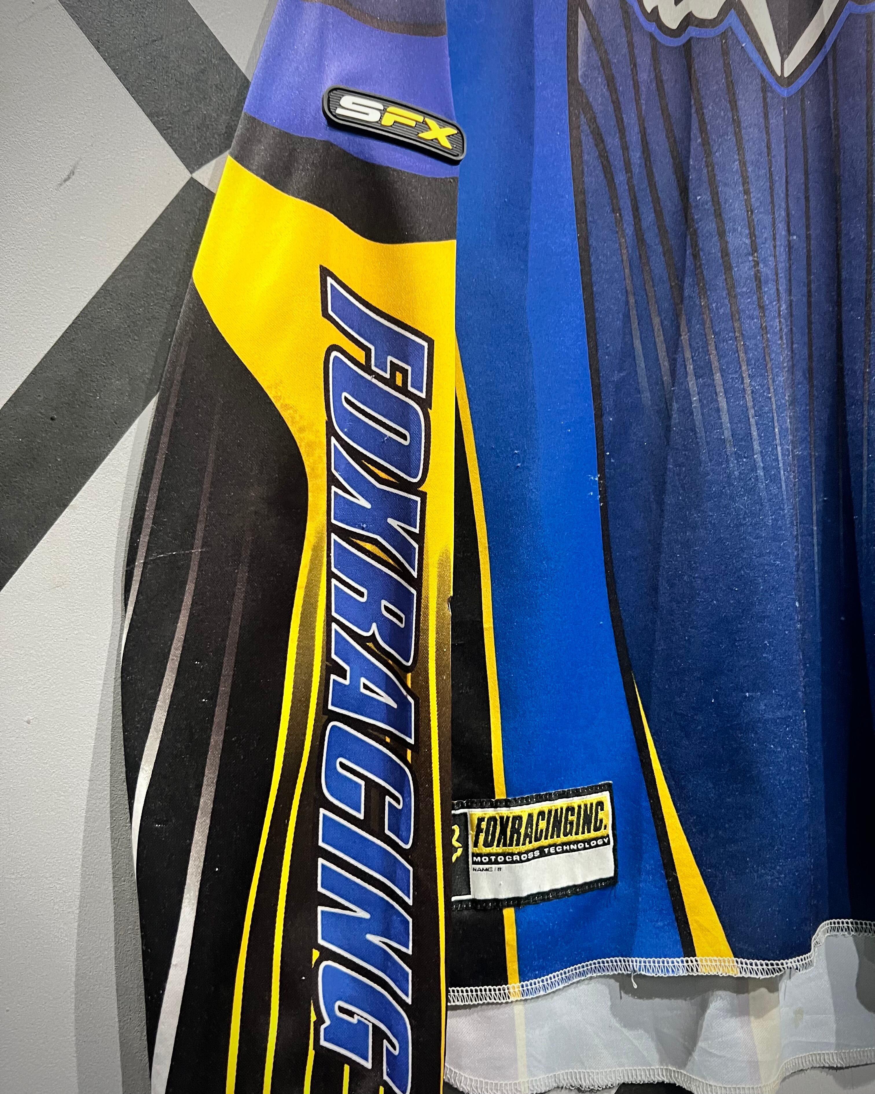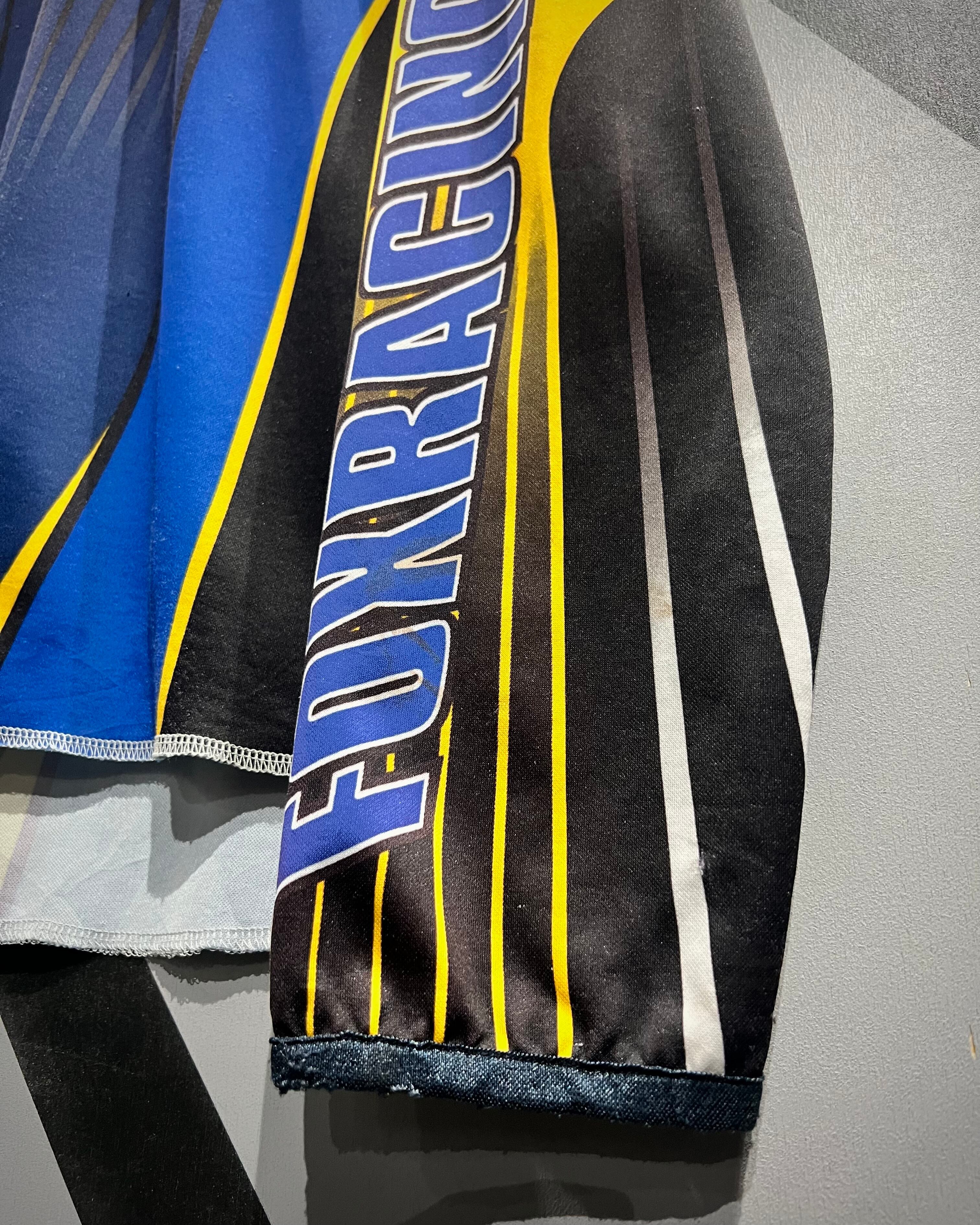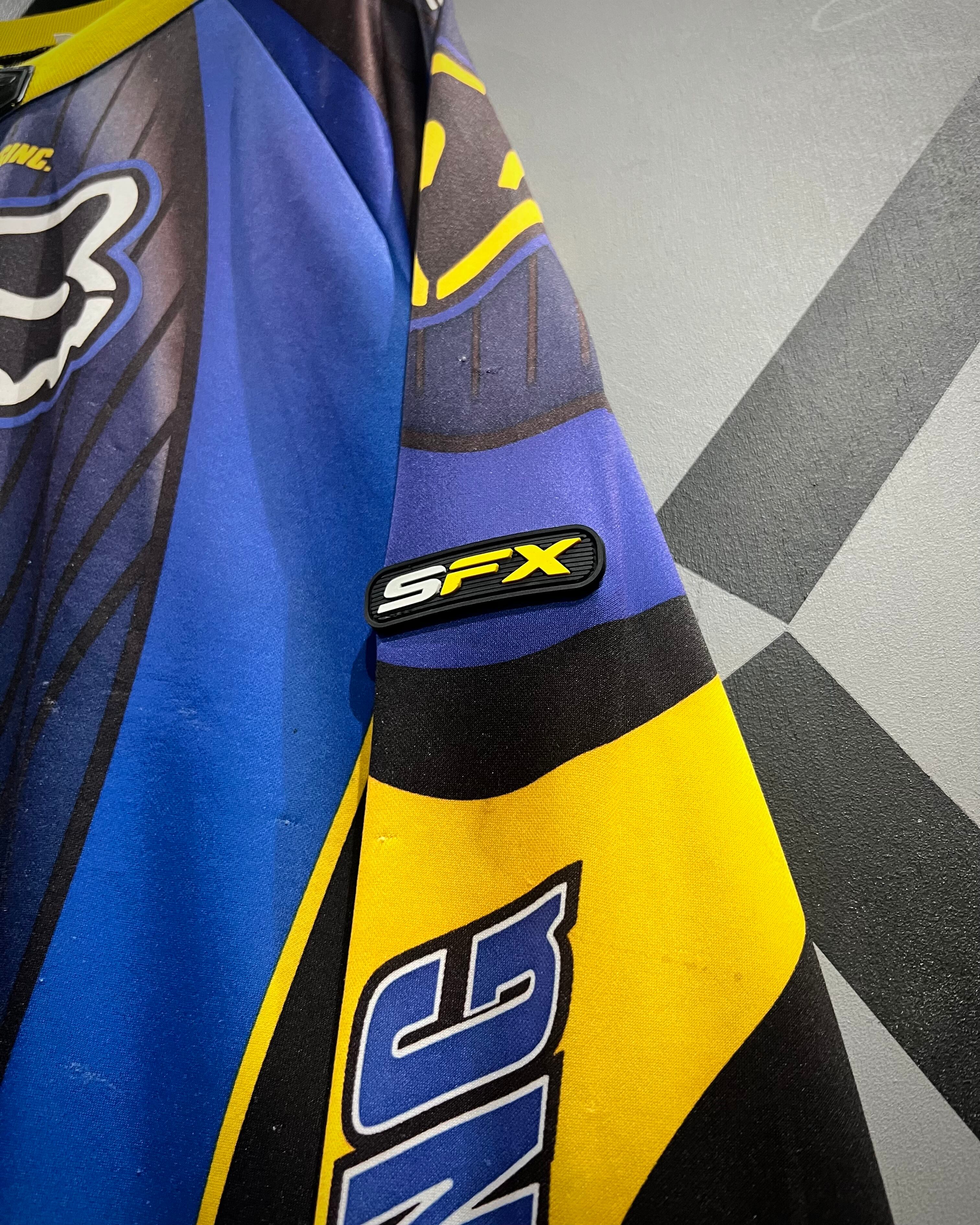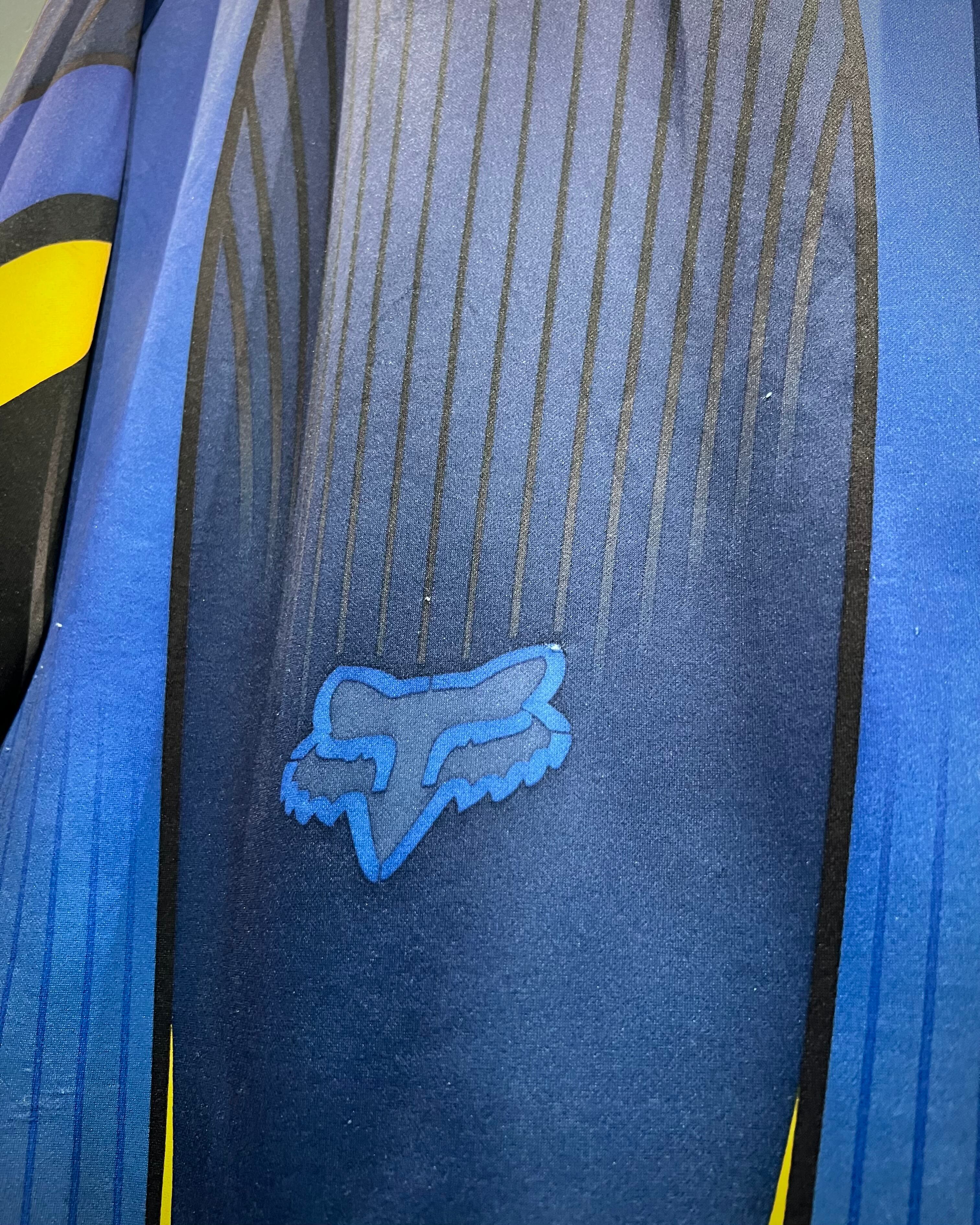 鮮やかなブルーをベースに、イエローとブラックで切り替えられたボディに、ブランドを象徴するフォックスヘッドロゴをフロント中央に大きく配置。両袖には “FOX RACING” のロゴを刻み込み、さらに立体的な SFXパッチ をオンした、全方位死角なしのデザインとなっております。