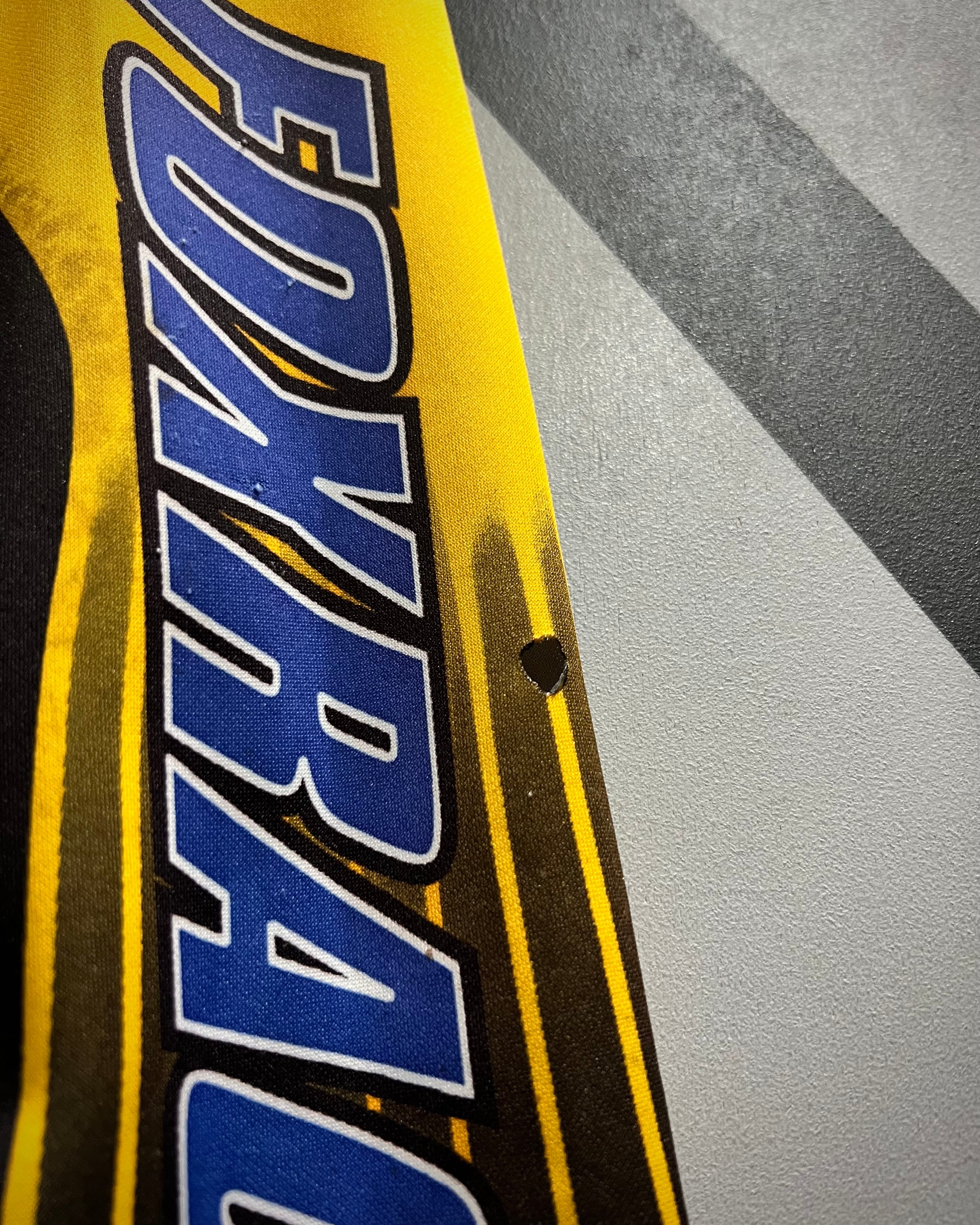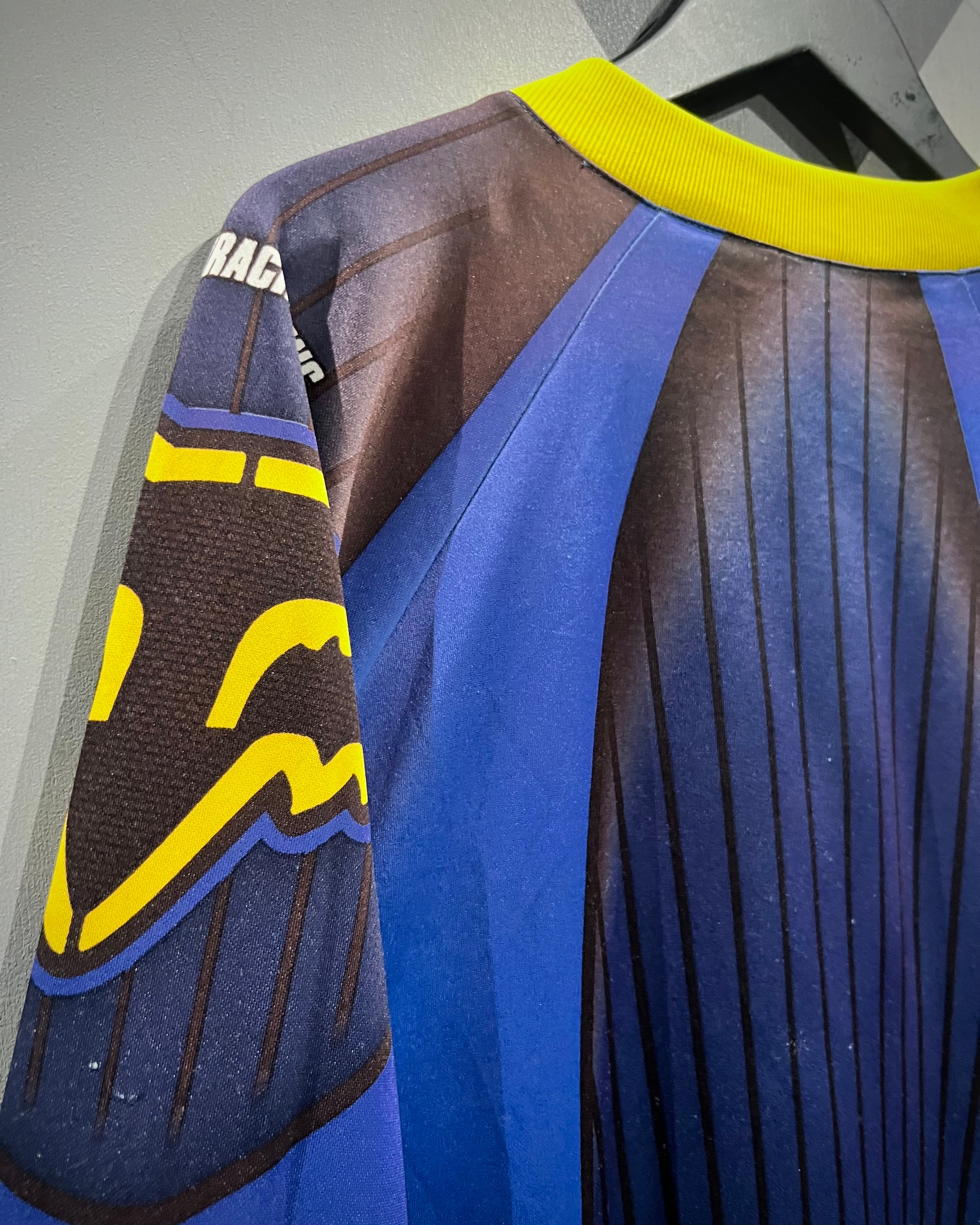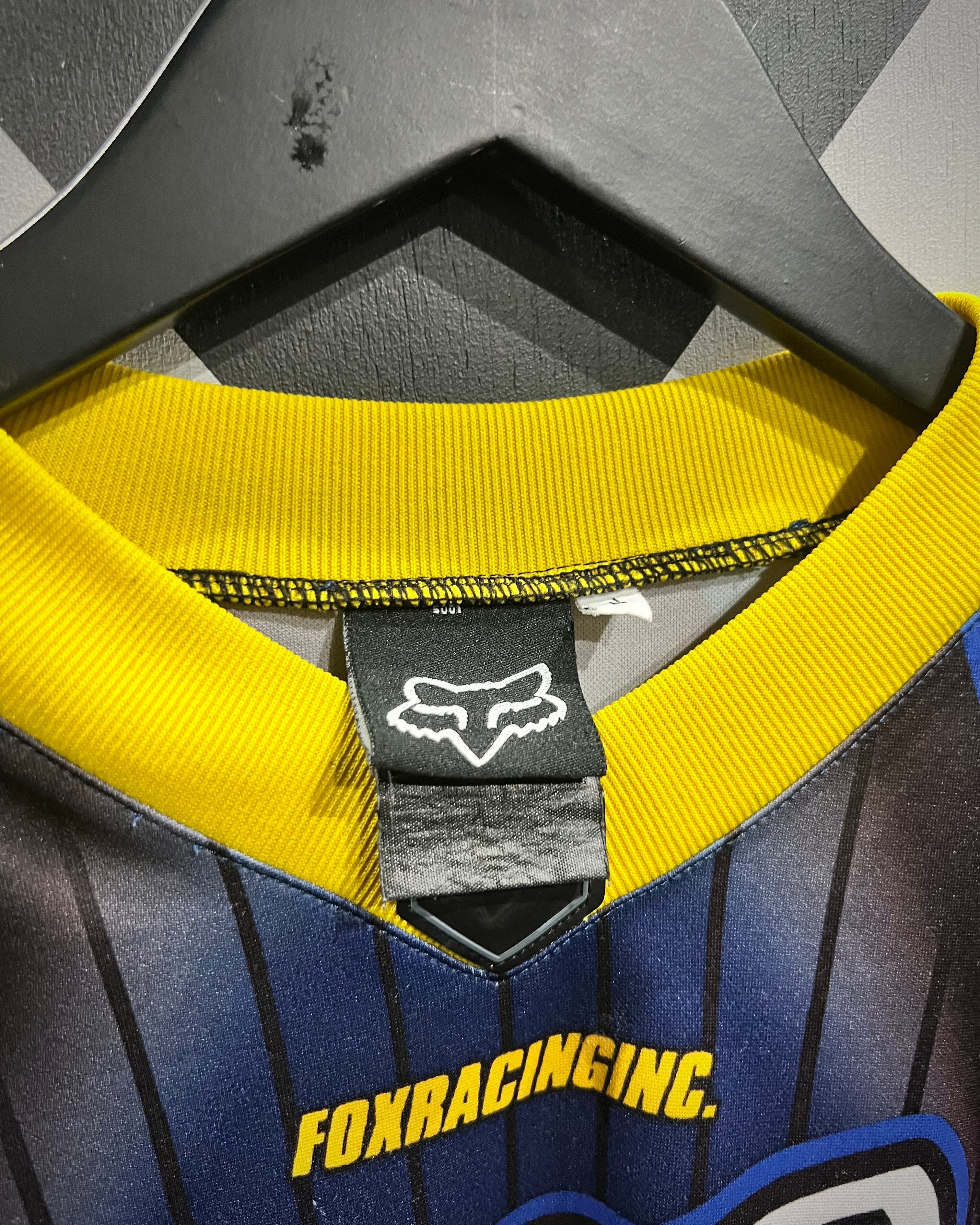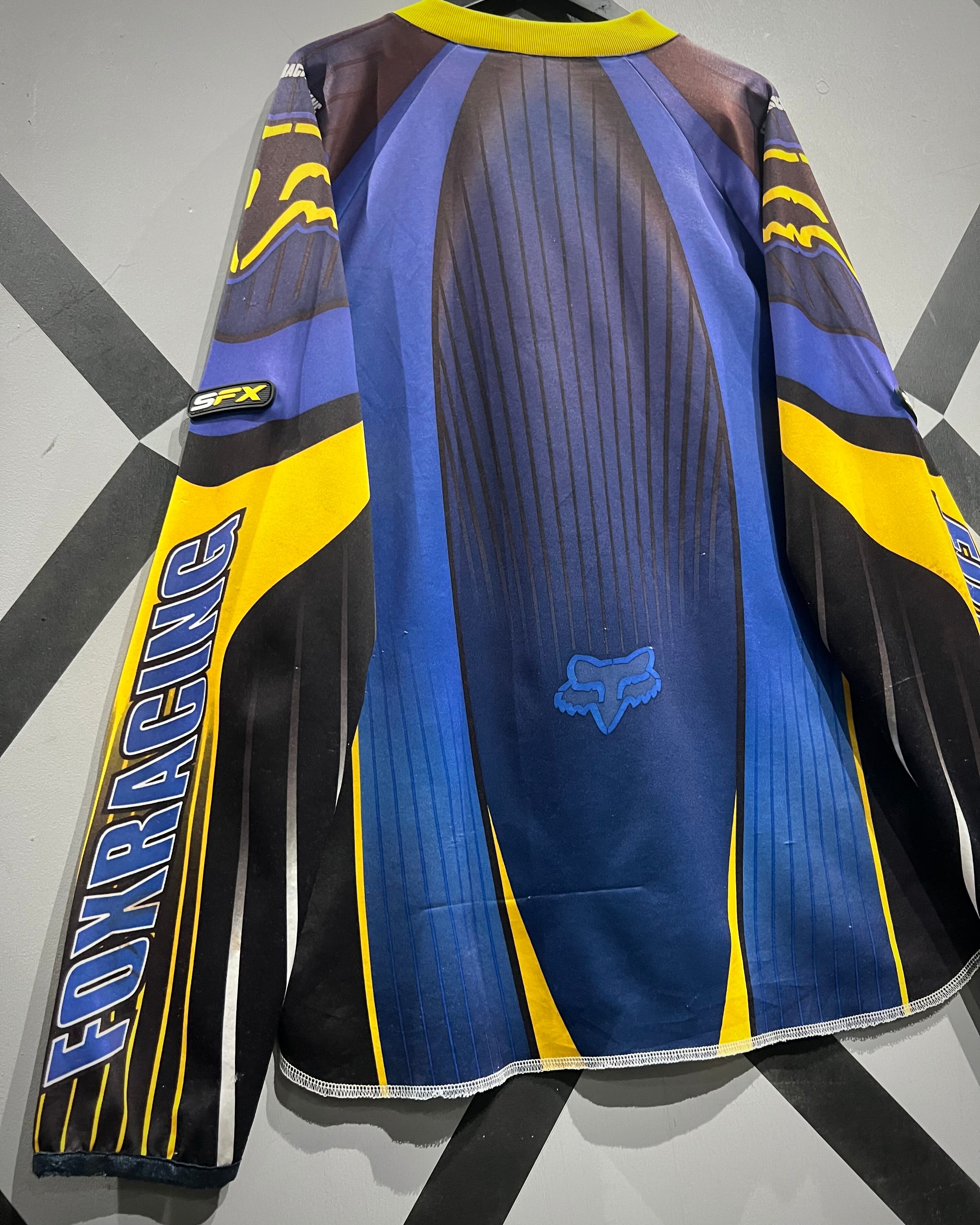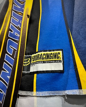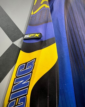 鮮やかなブルーをベースに、イエローとブラックで切り替えられたボディに、ブランドを象徴するフォックスヘッドロゴをフロント中央に大きく配置。両袖には “FOX RACING” のロゴを刻み込み、さらに立体的な SFXパッチ をオンした、全方位死角なしのデザインとなっております。