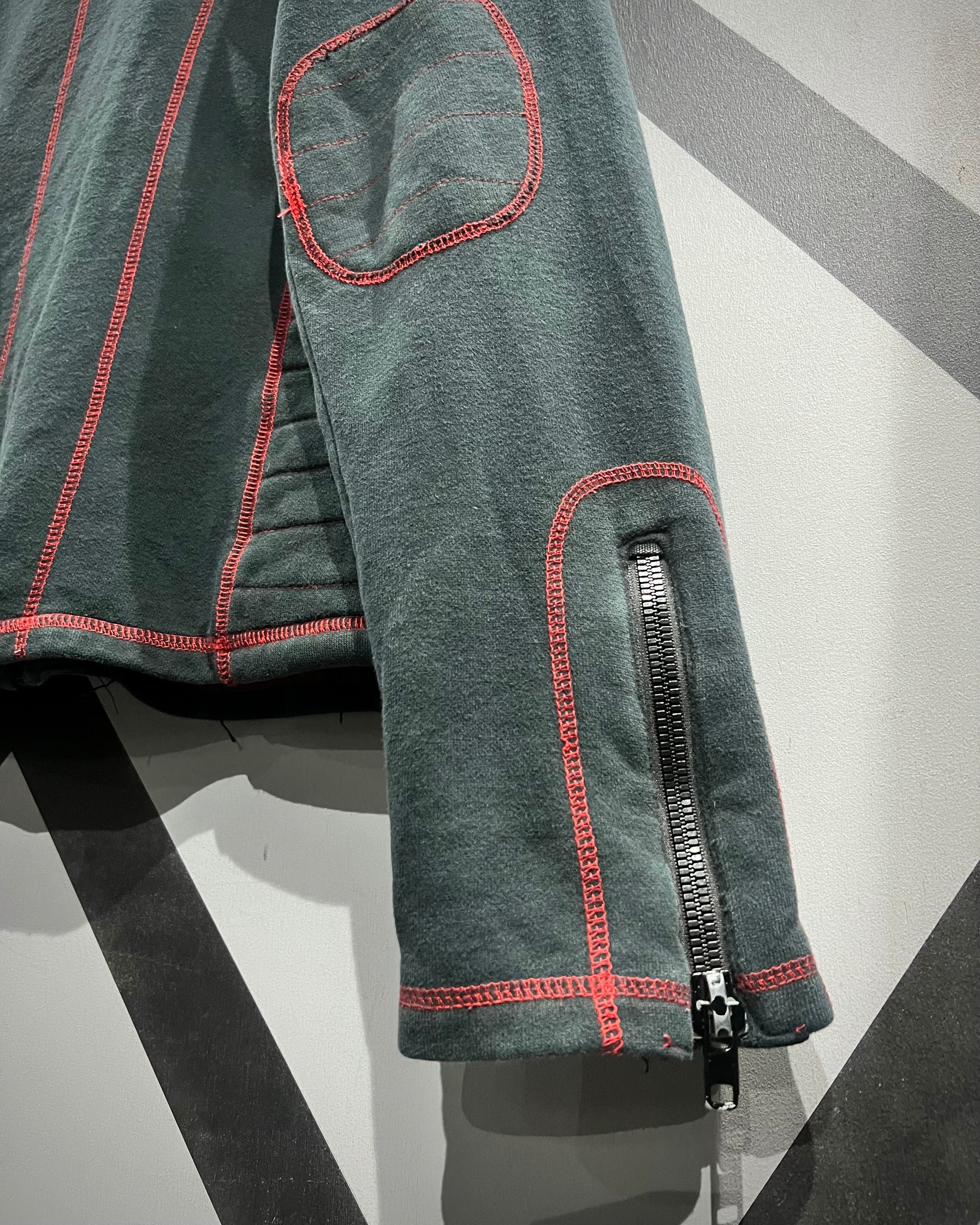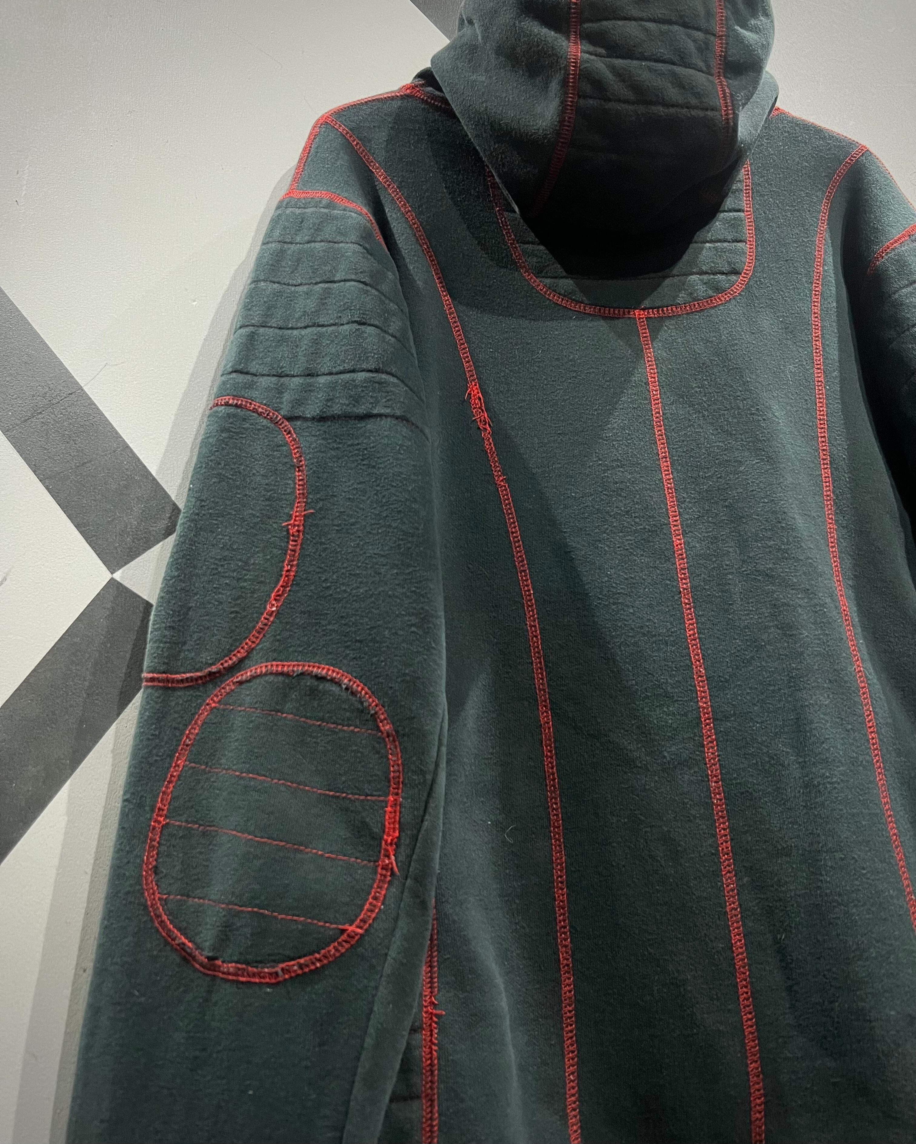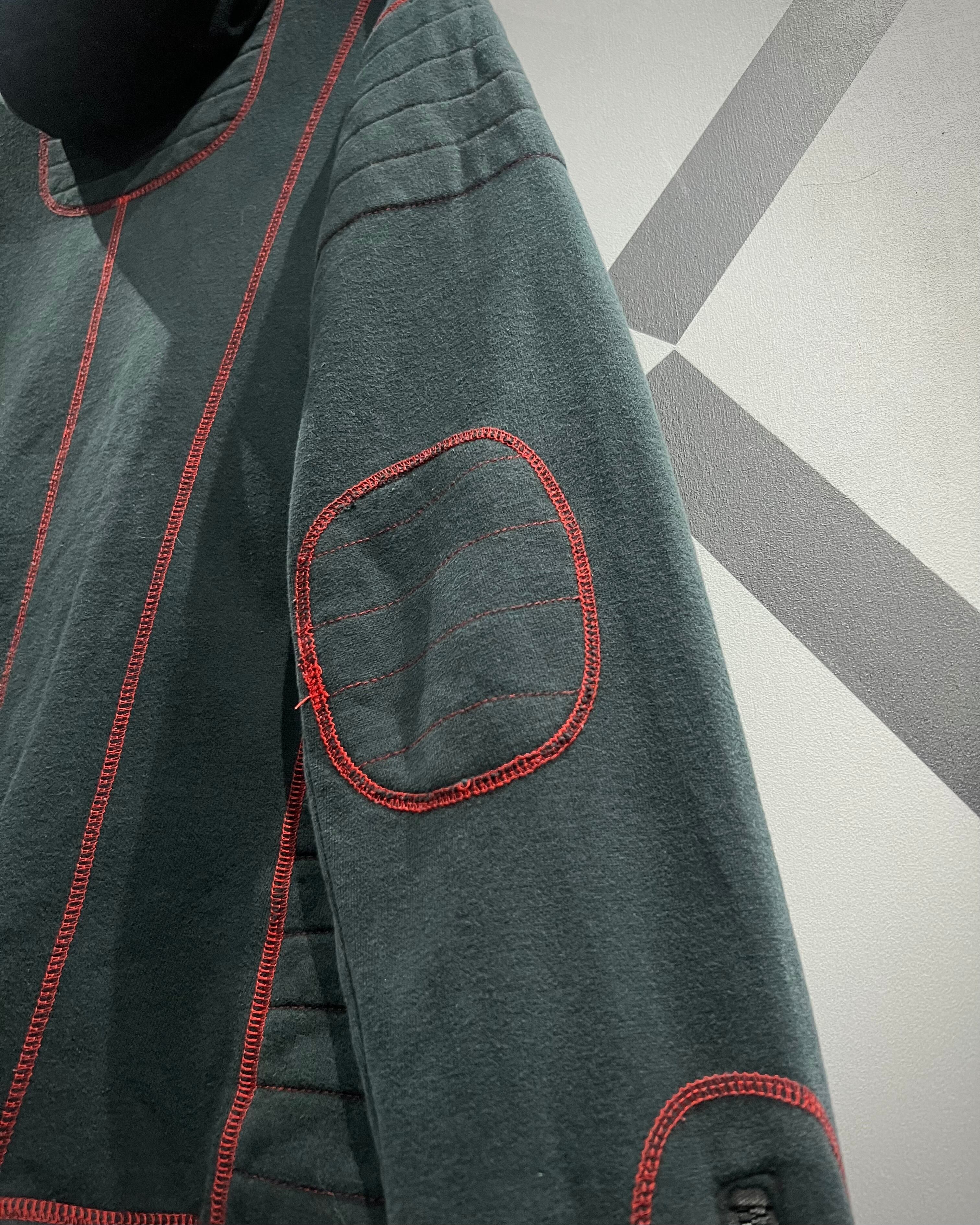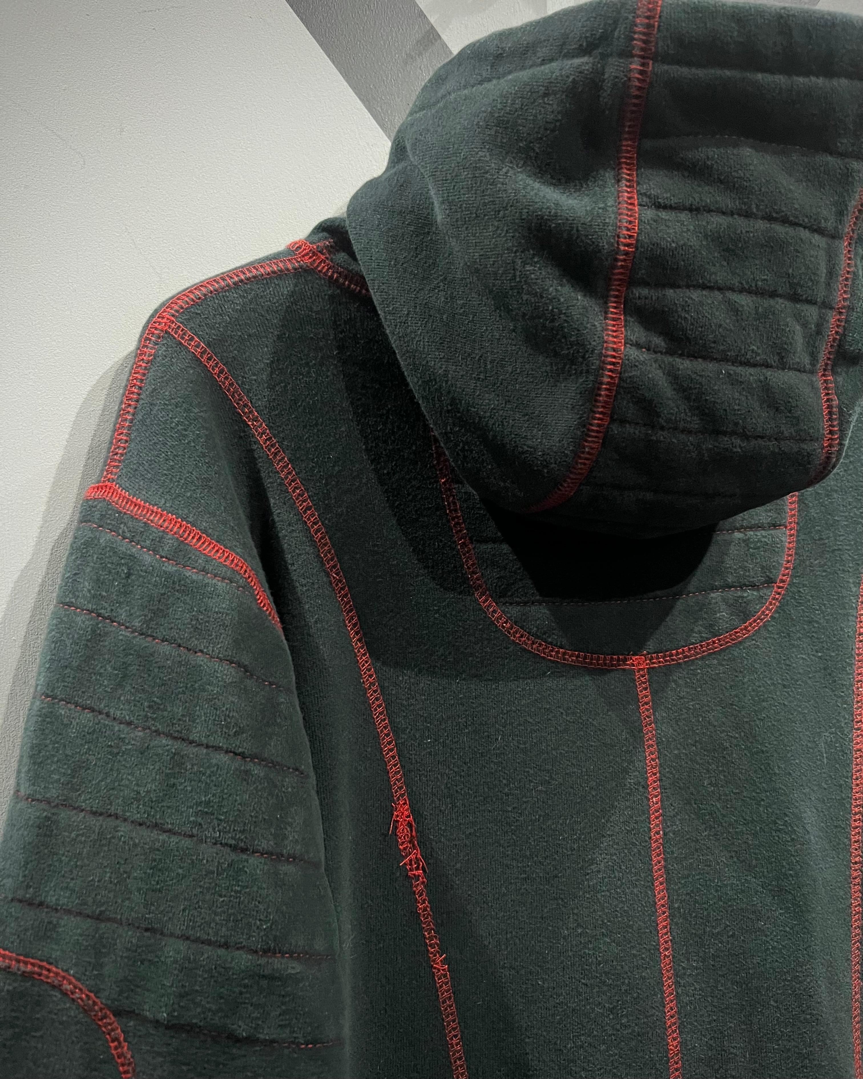 アームやフード、背面に施されたキルティング状のステッチワークがアクセントとなり、スポーティーさと武骨さ掛け合わせた独創的な仕上がり。スウェット生地ならではの柔らかくリラックスした着心地ながら、ライダースを想起させるタフなデザインというギャップも非常に面白いポイントです。