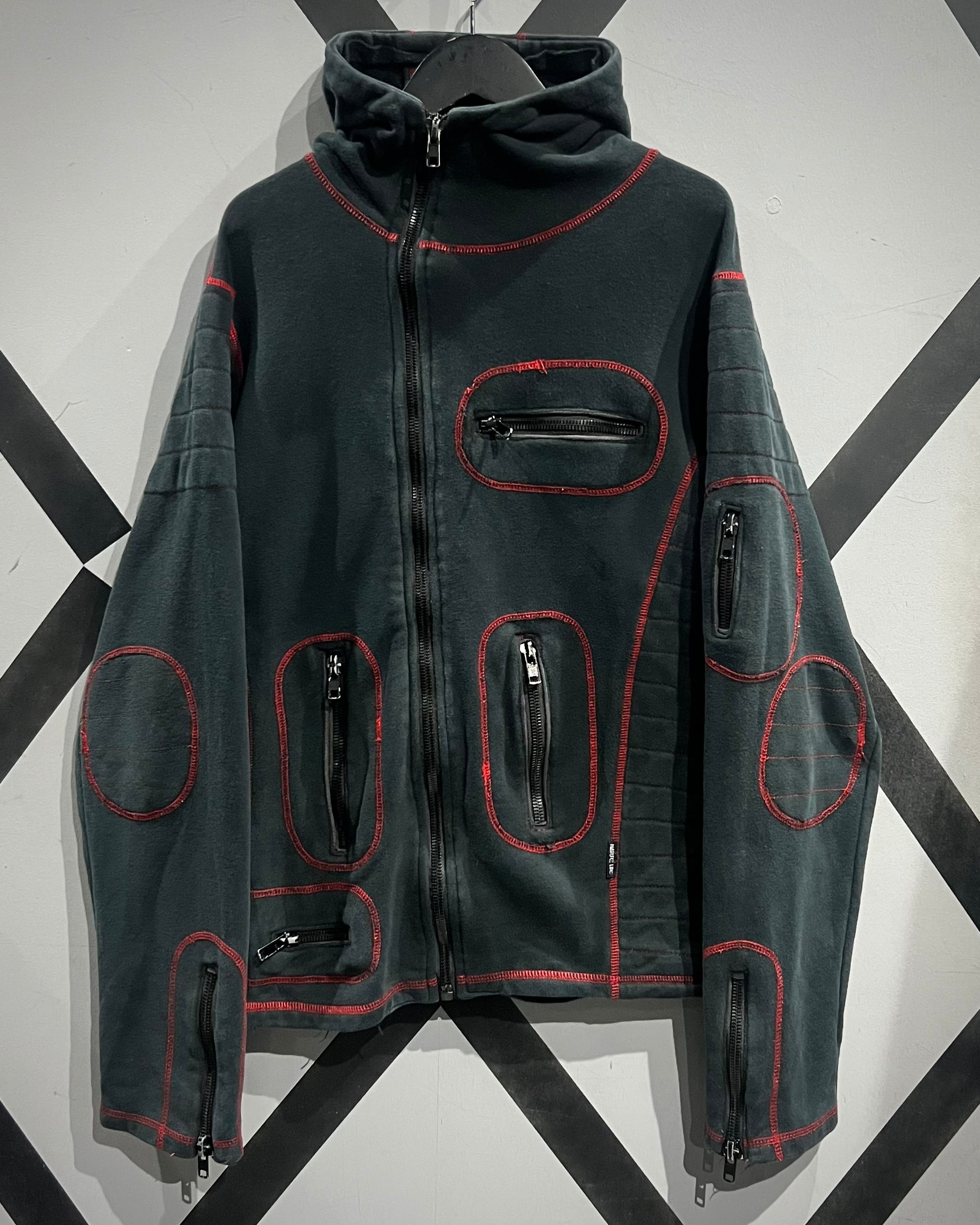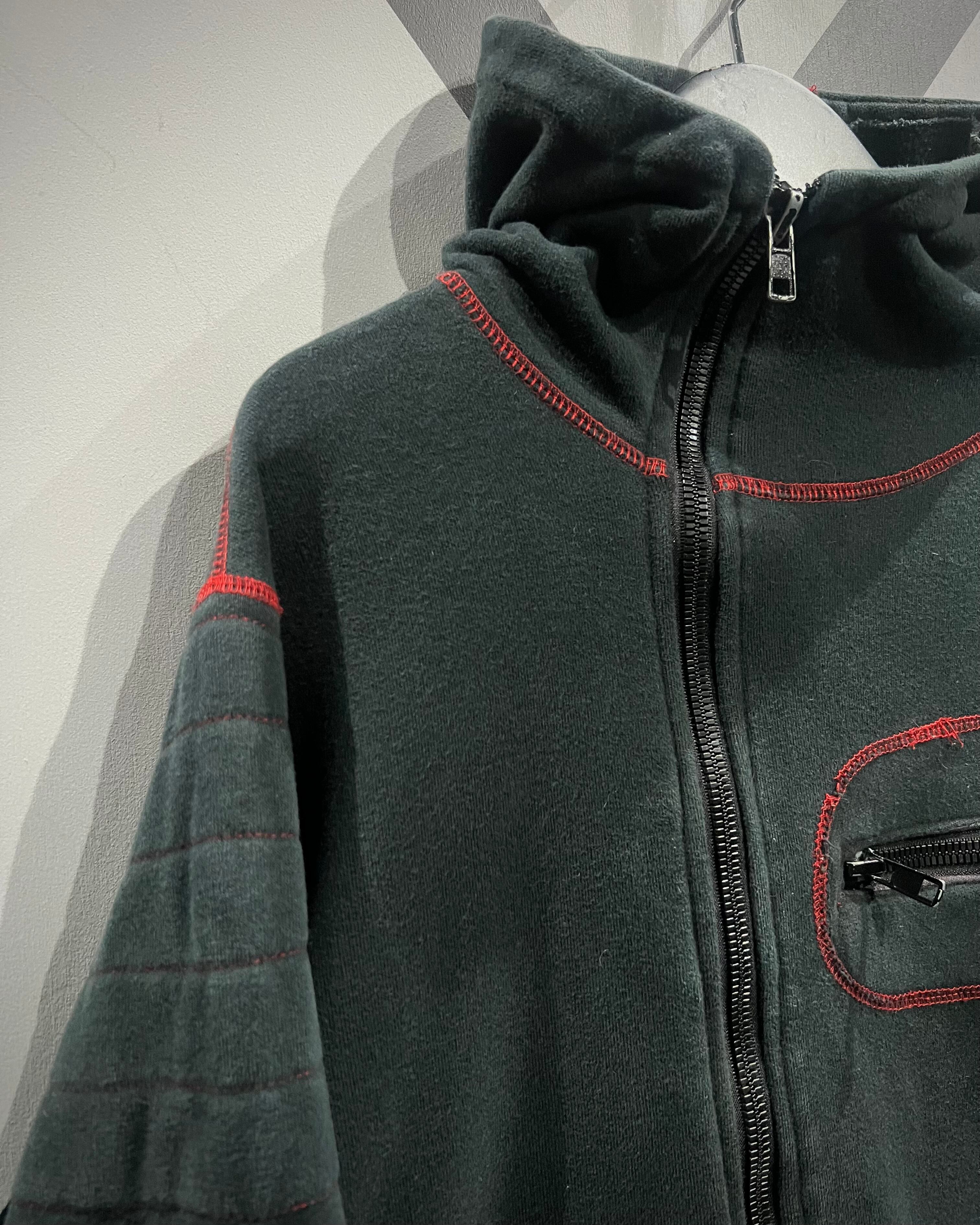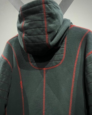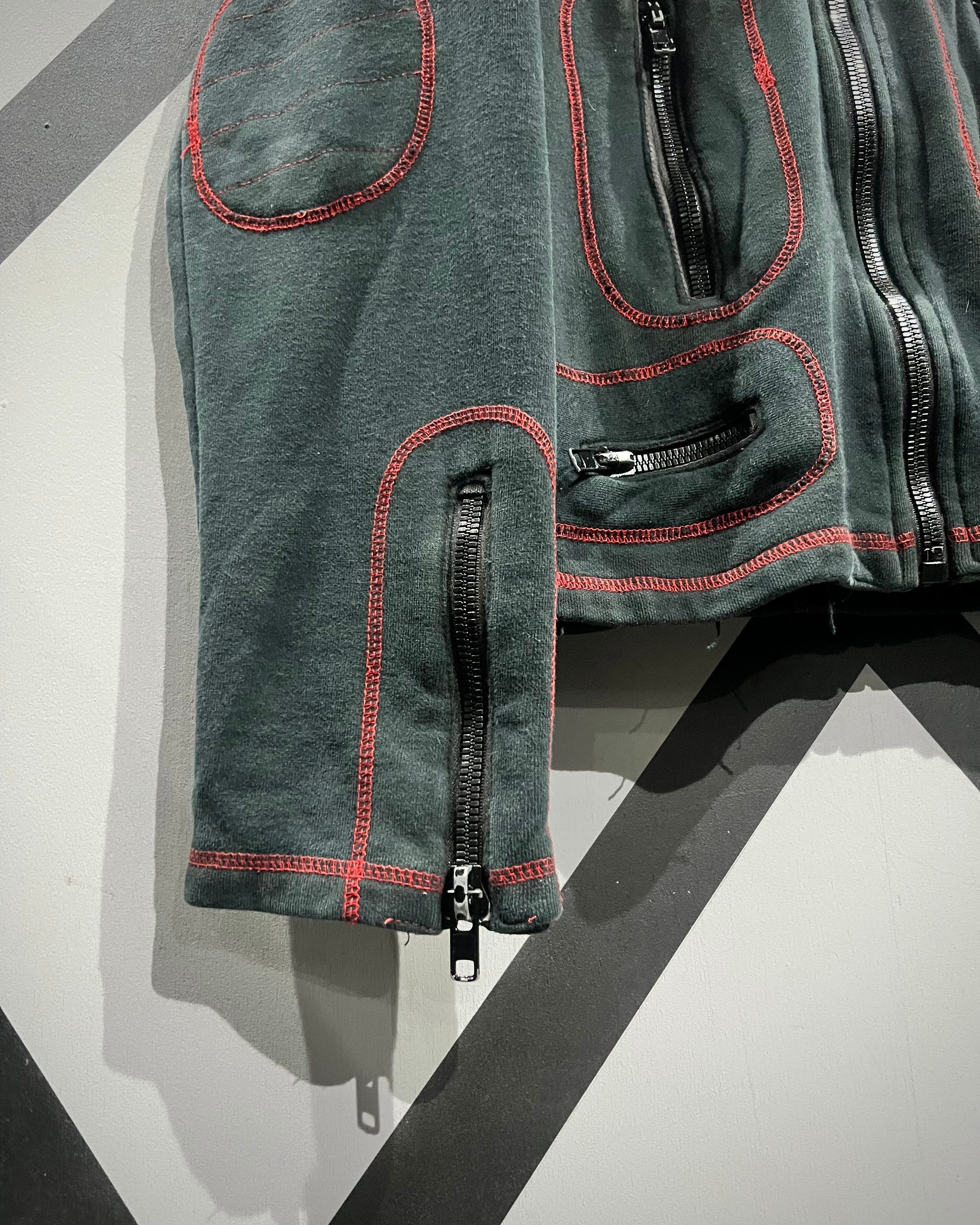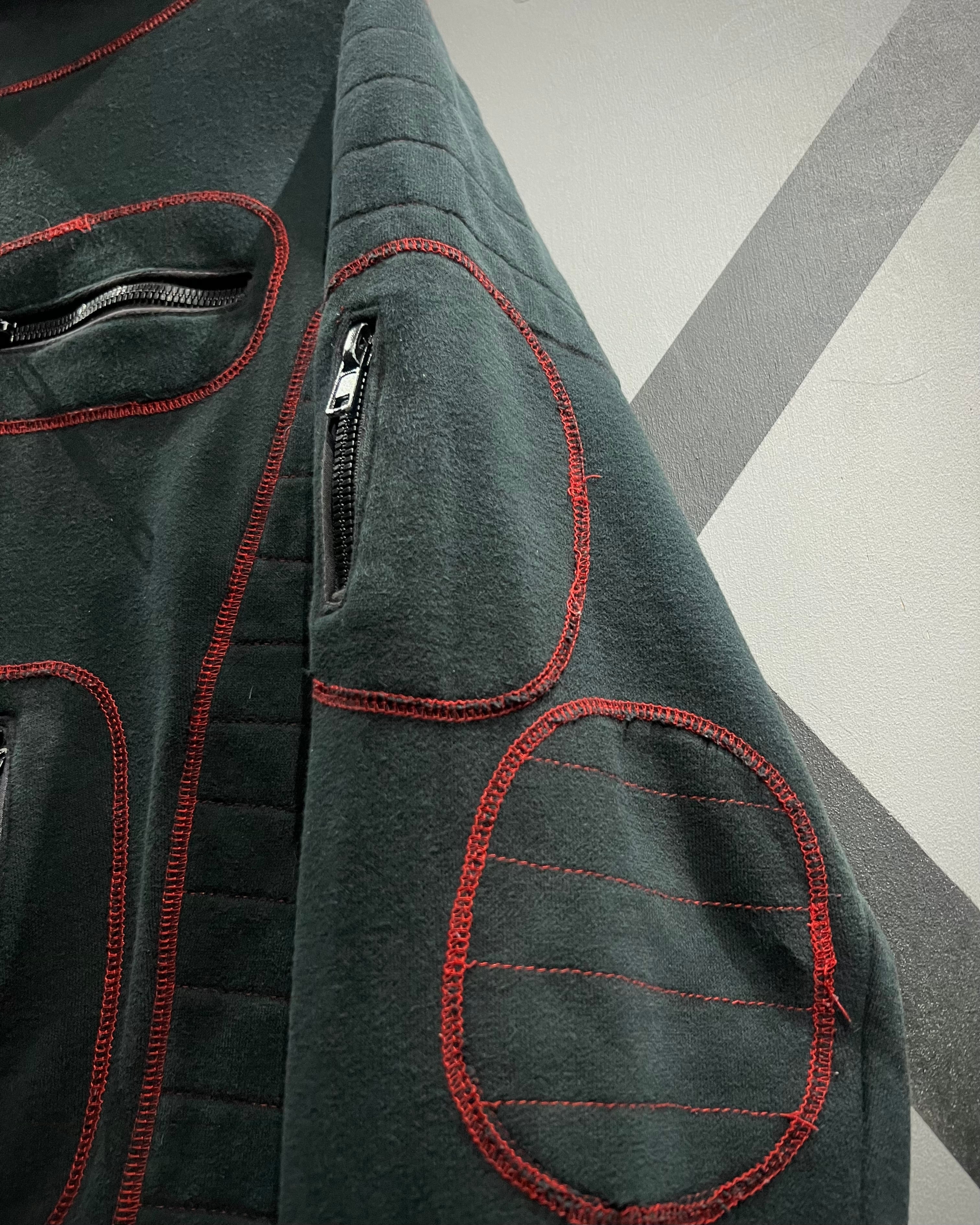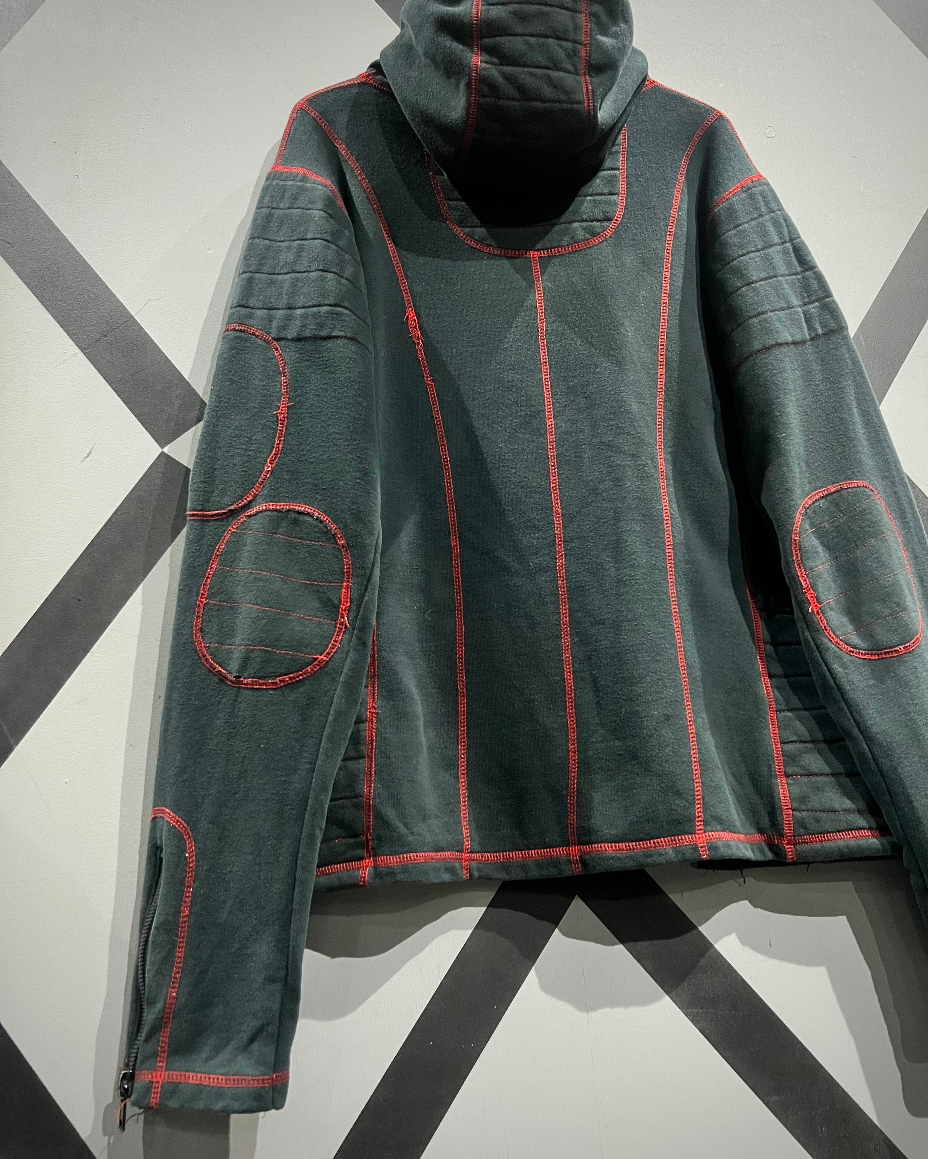 アームやフード、背面に施されたキルティング状のステッチワークがアクセントとなり、スポーティーさと武骨さ掛け合わせた独創的な仕上がり。スウェット生地ならではの柔らかくリラックスした着心地ながら、ライダースを想起させるタフなデザインというギャップも非常に面白いポイントです。