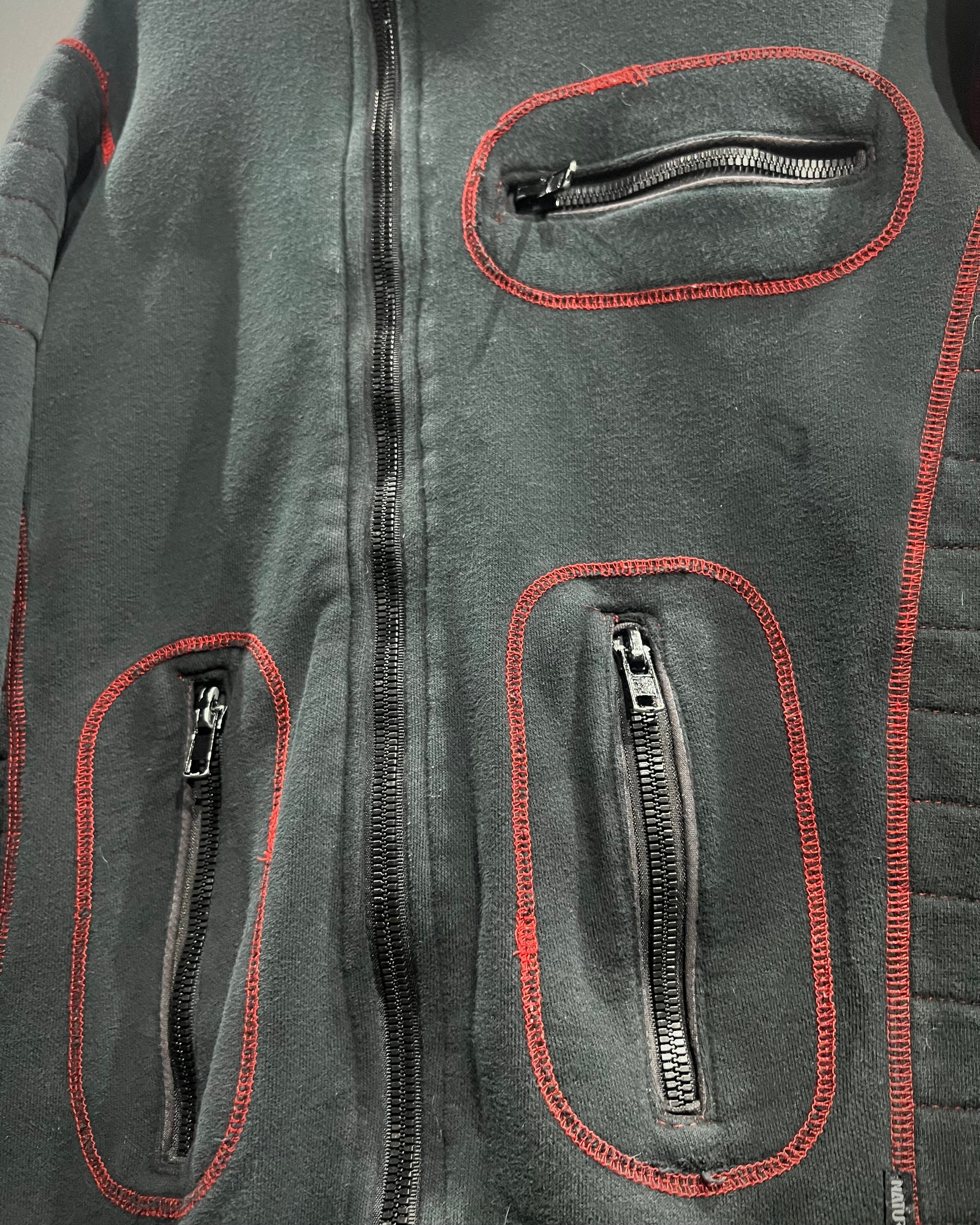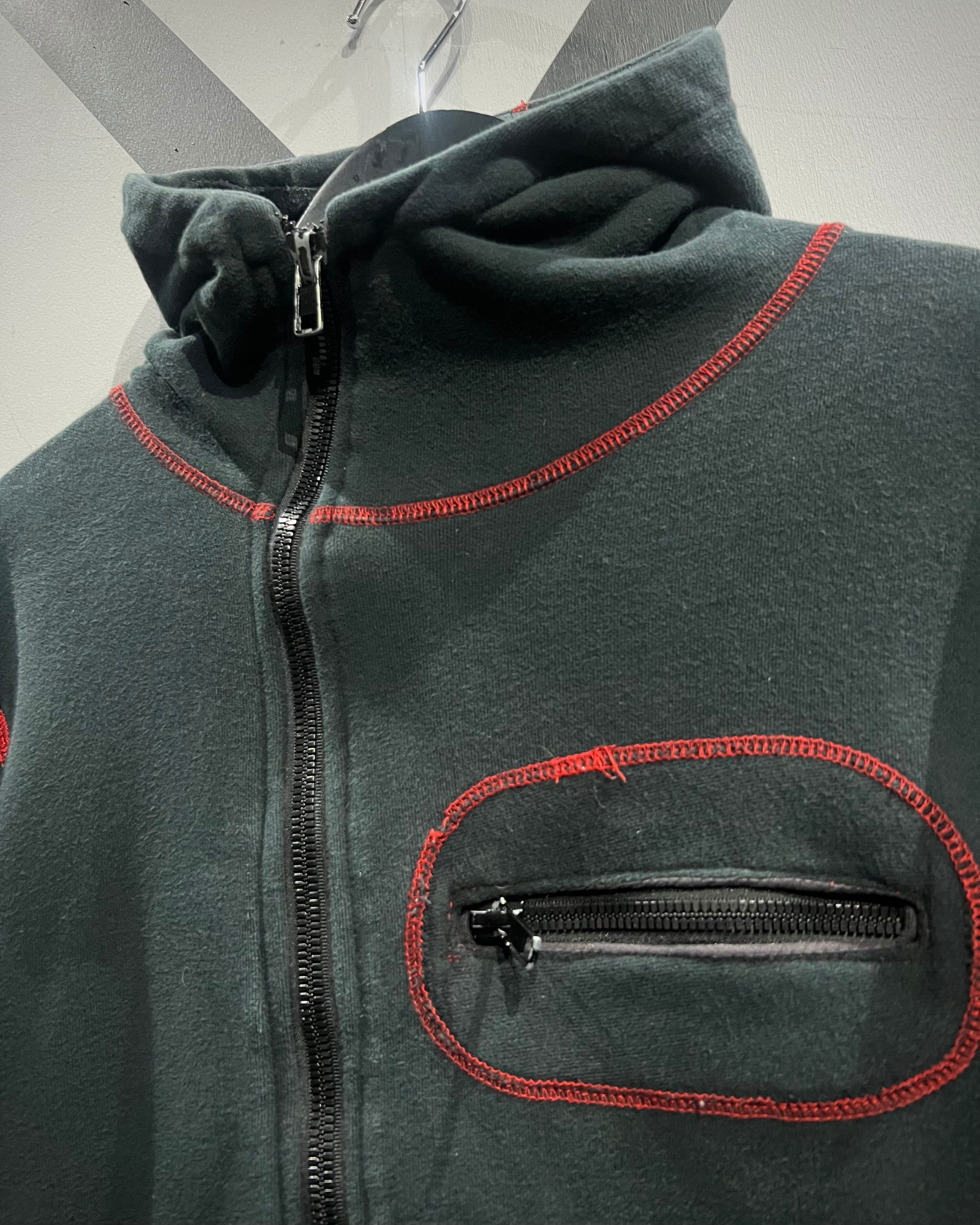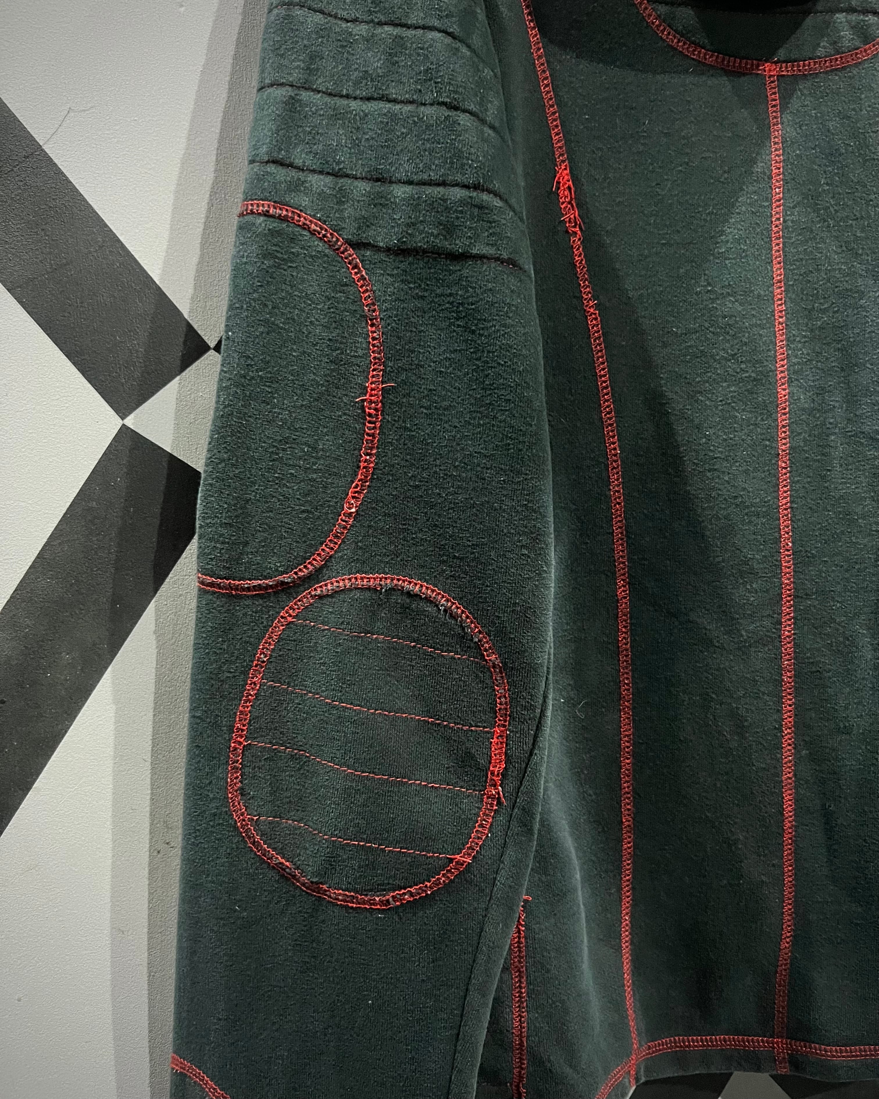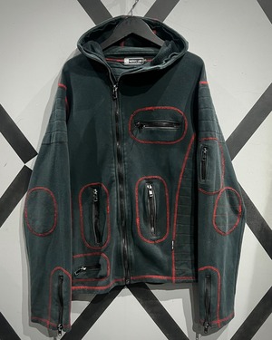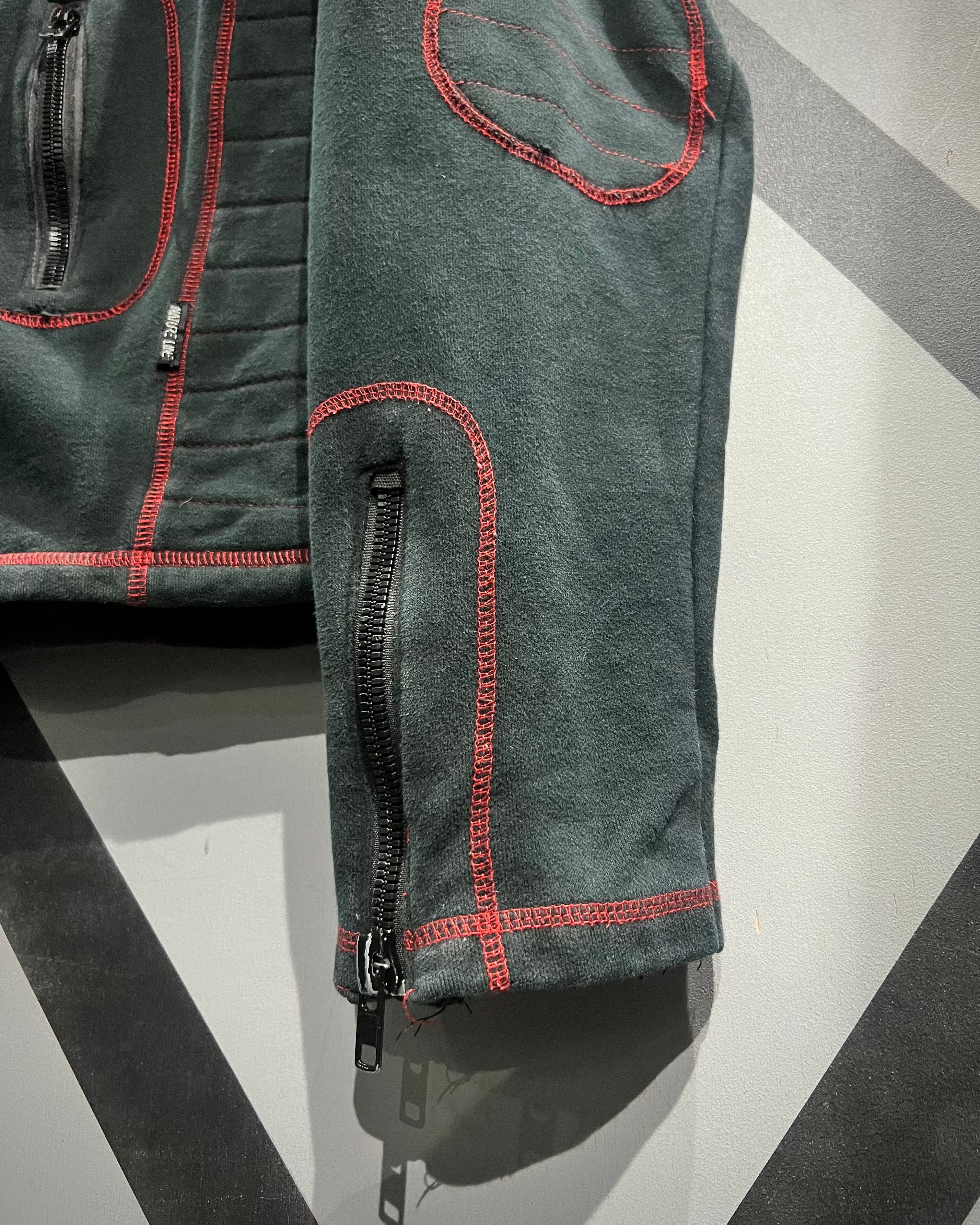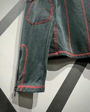 アームやフード、背面に施されたキルティング状のステッチワークがアクセントとなり、スポーティーさと武骨さ掛け合わせた独創的な仕上がり。スウェット生地ならではの柔らかくリラックスした着心地ながら、ライダースを想起させるタフなデザインというギャップも非常に面白いポイントです。