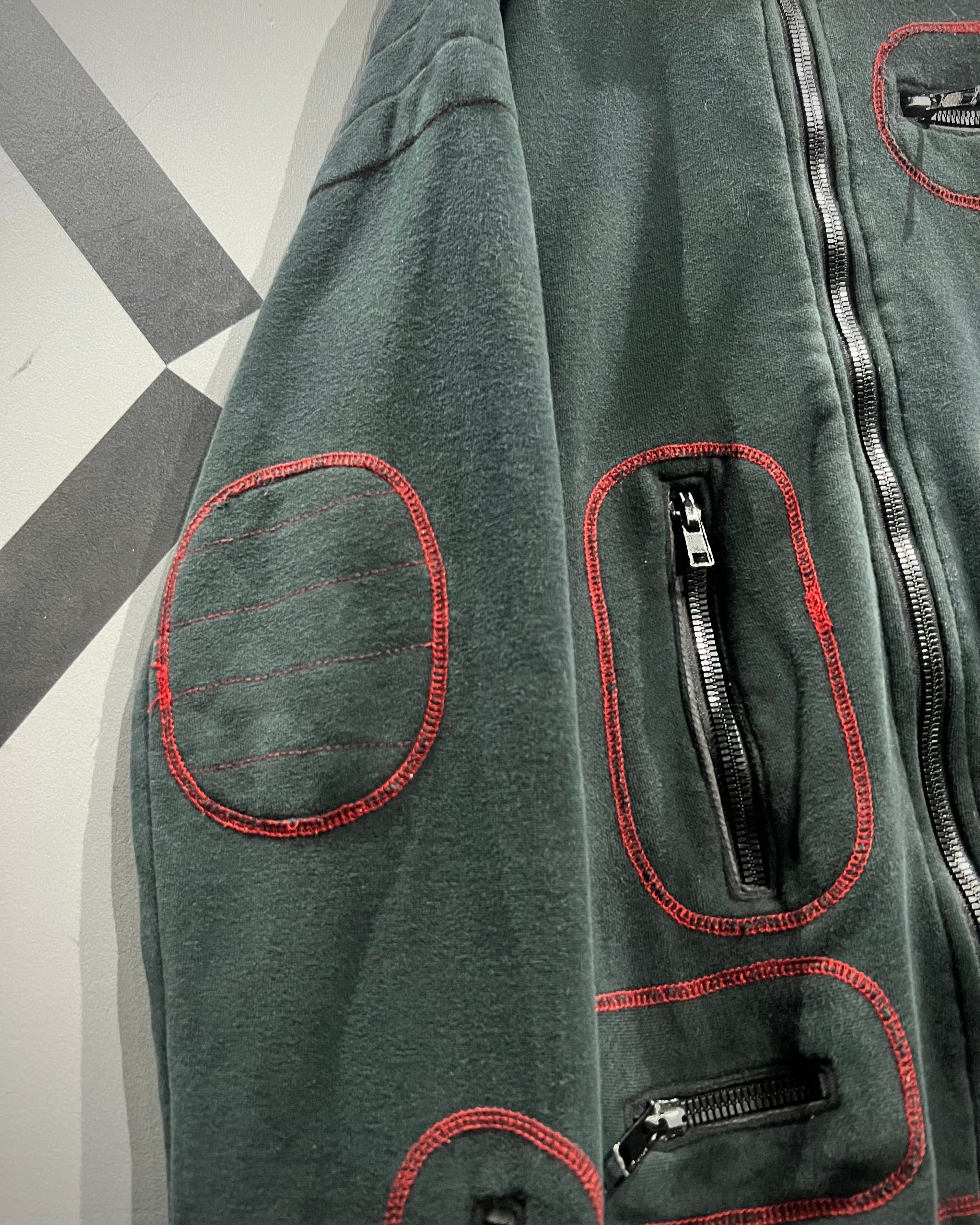 フロントやアーム、裾周りに大小様々なジップポケットを散りばめることで、視覚的なギミックとしてのインパクトと実用性を両立。袖口にもジップを備え、開閉によるシルエットの調整も可能です。