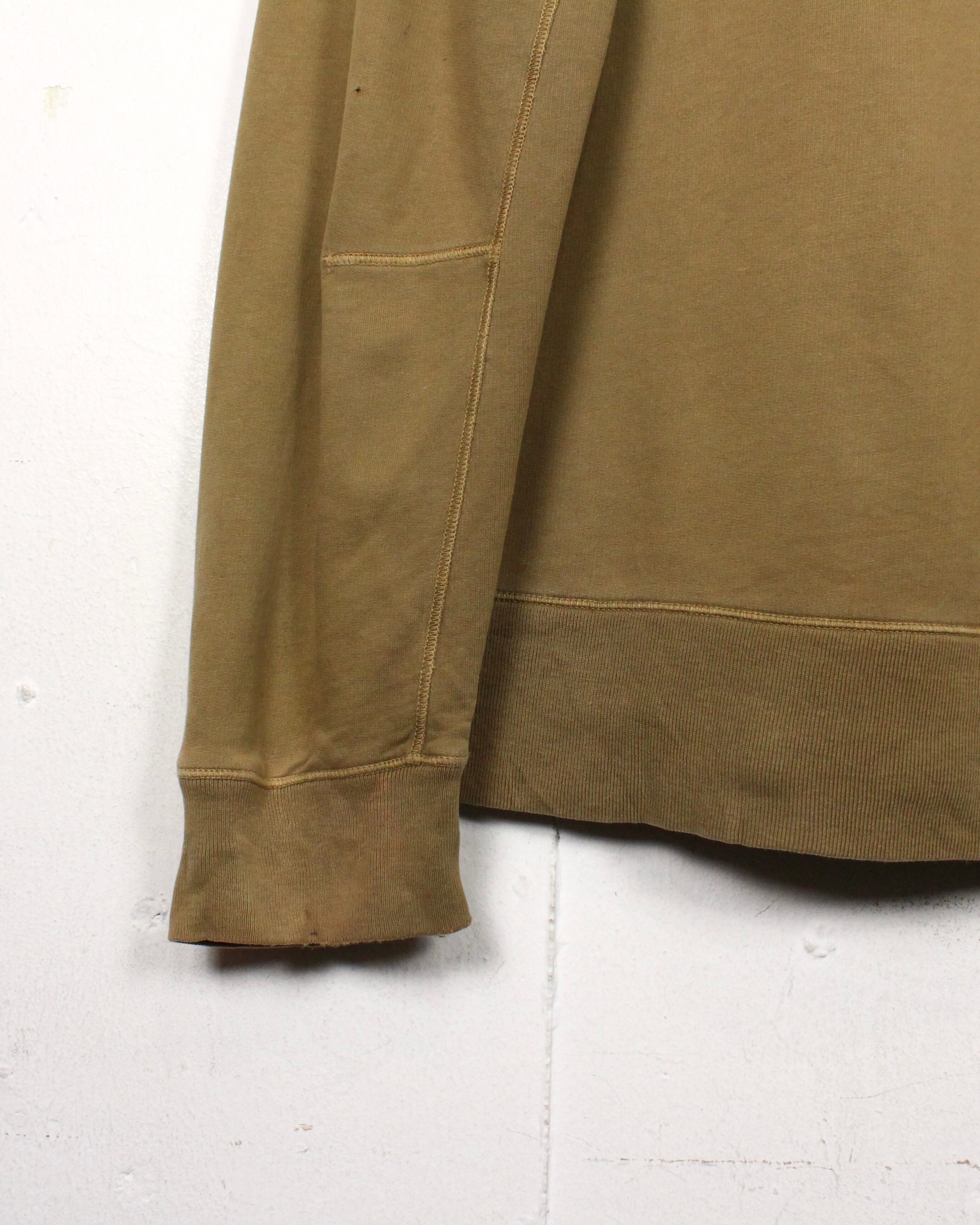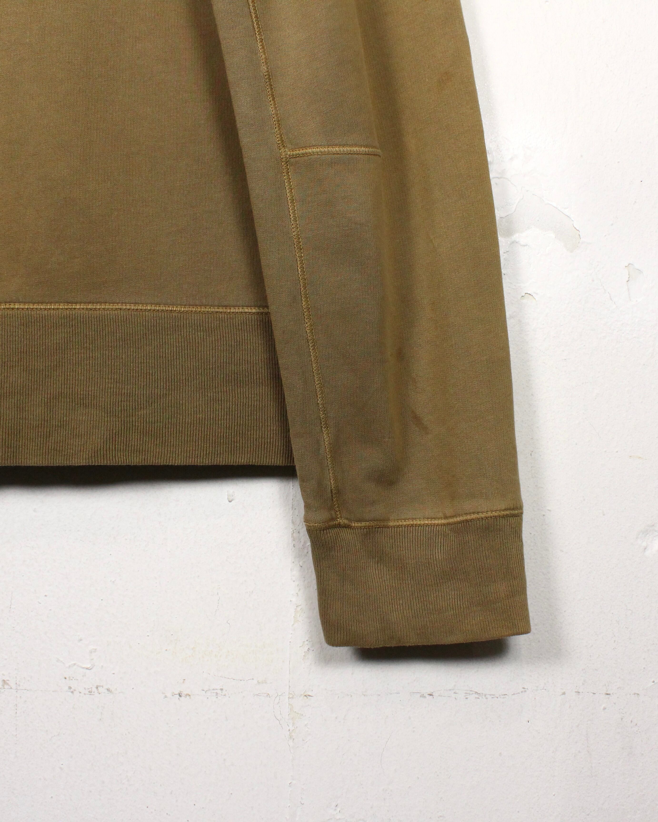 シルエットはルーズフィット。肩が自然に落ちるドロップショルダー仕様で、身幅やアームホールにも十分なゆとりを確保しています。そのためスウェットや厚手のニットの上からでも余裕を持って羽織ることができ、レイヤードスタイルにも最適。裾リブのテンションも程よく、シルエットを引き締める役割を担っています。